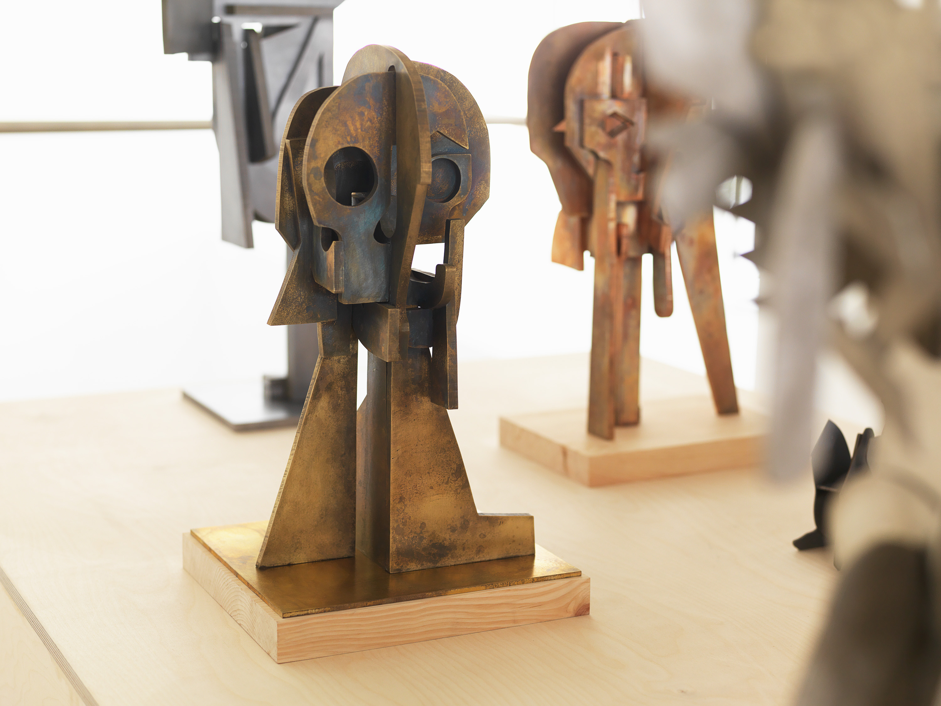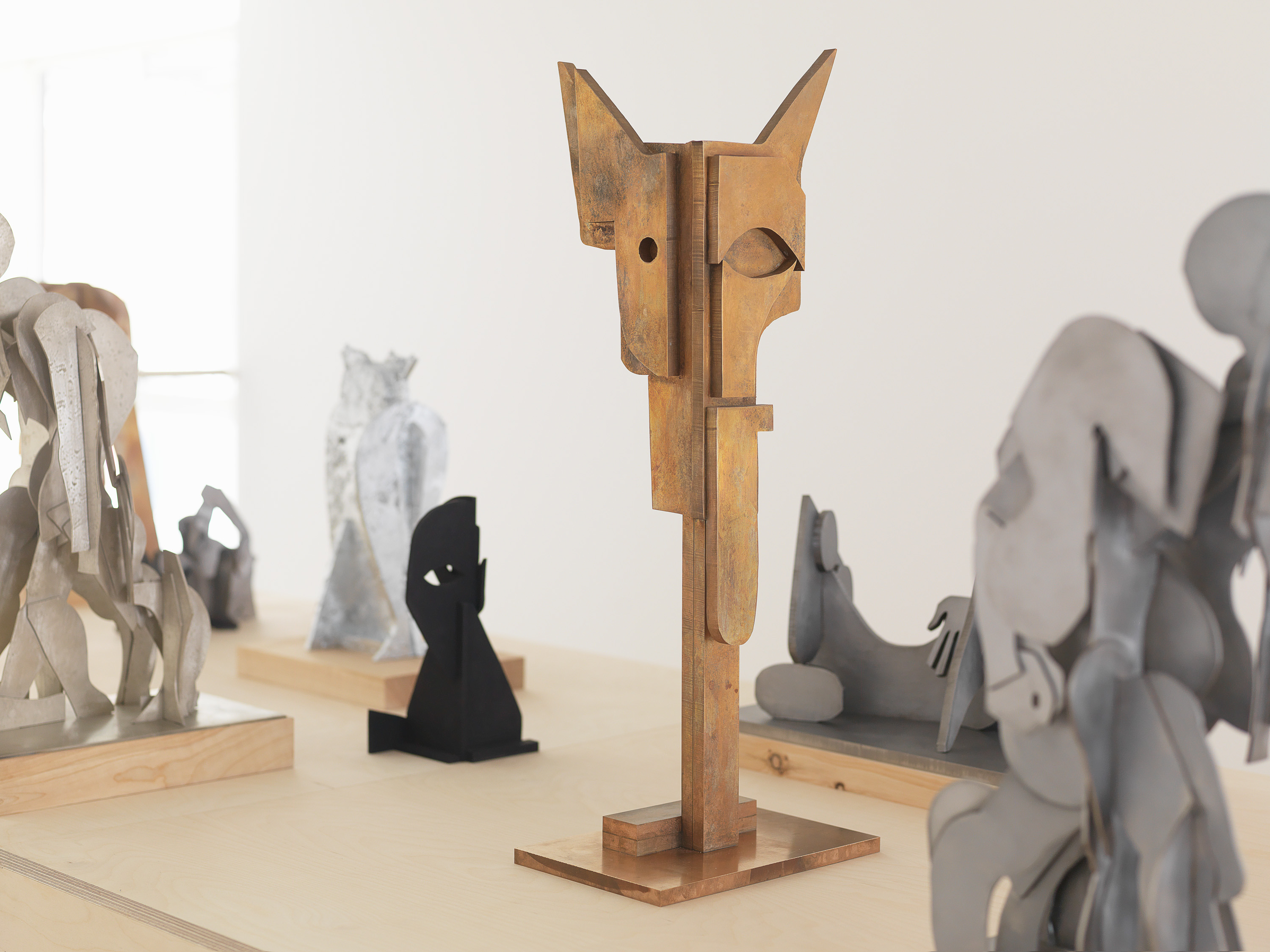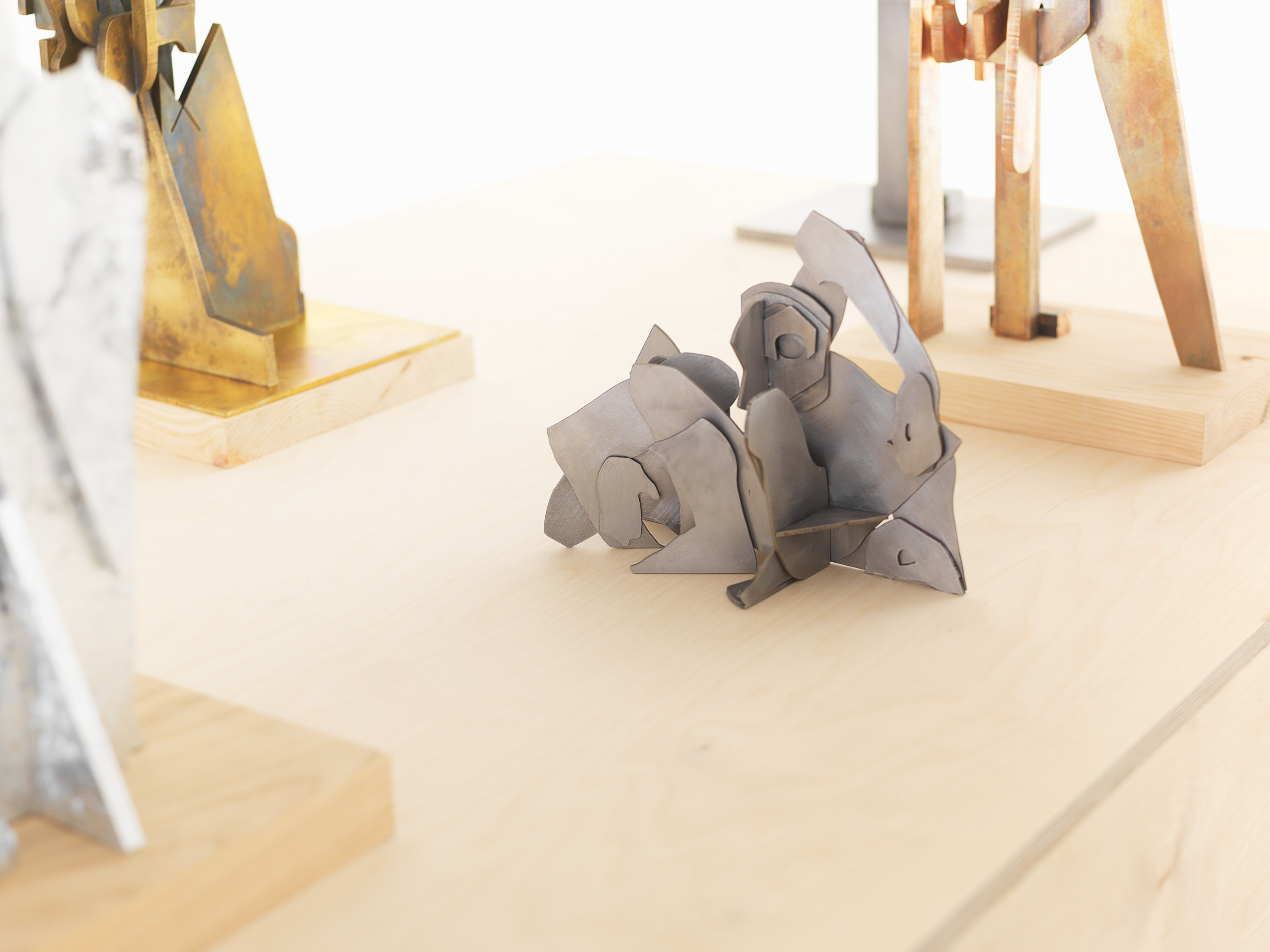Artists such as Giacometti, Rodin, Brancusi and Calder have long fascinated Houseago with their ability to project intentions of monumentality onto their sculptural models. In Constructions the artist presents new assemblage sculptures, originally fabricated in plywood and questions the conditions of monumentality by taking “a very meditative and almost performative stance” to his relationship with scale. The basis for these works are sketches. Their movement from drawing to wood cuts and from wood to metal traces their making and establishes solid form through actions and transitions. The sculptures combine topics the artist has long been captivated by: the walking figure, the head and face, the reclining figure, the owl.