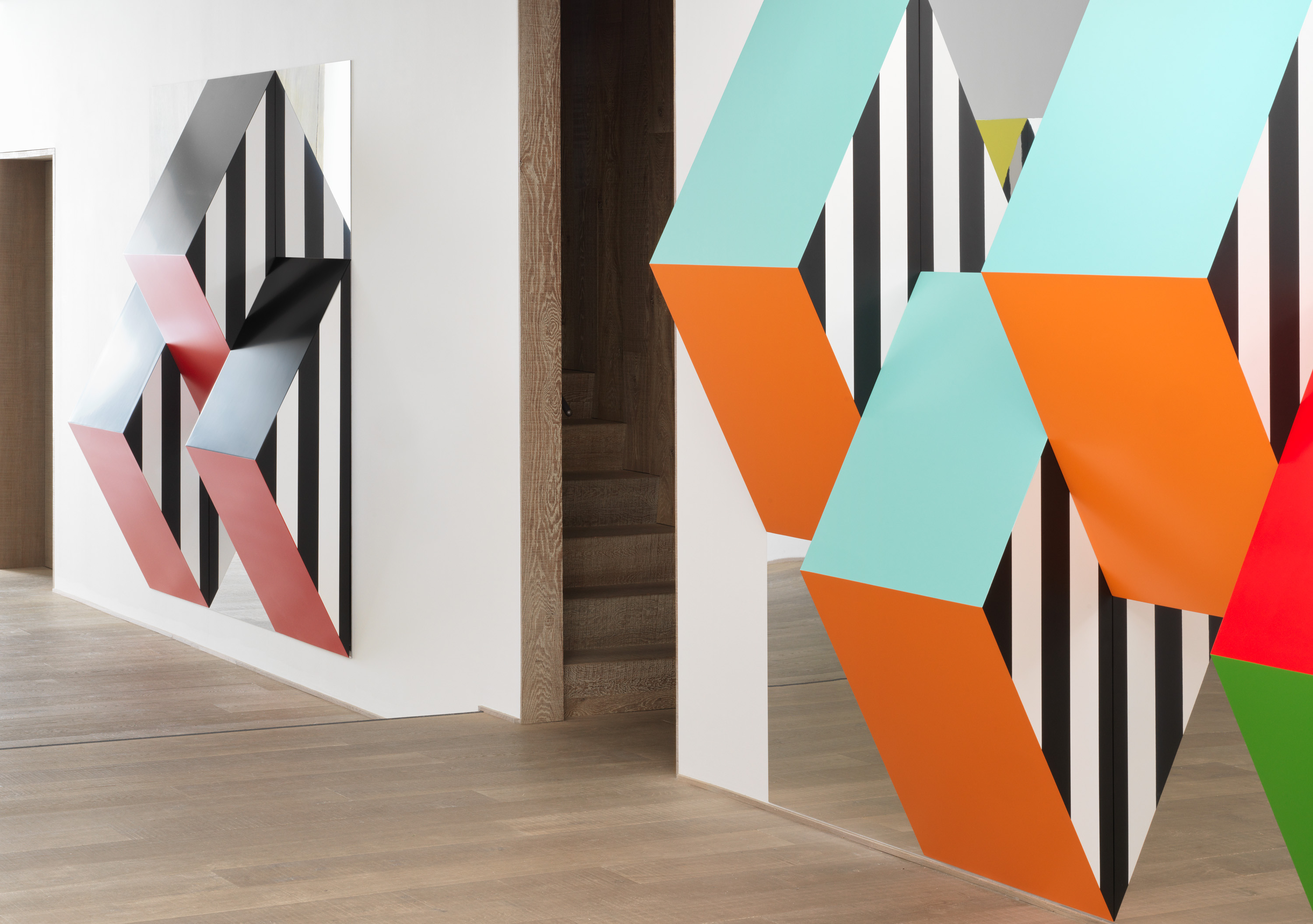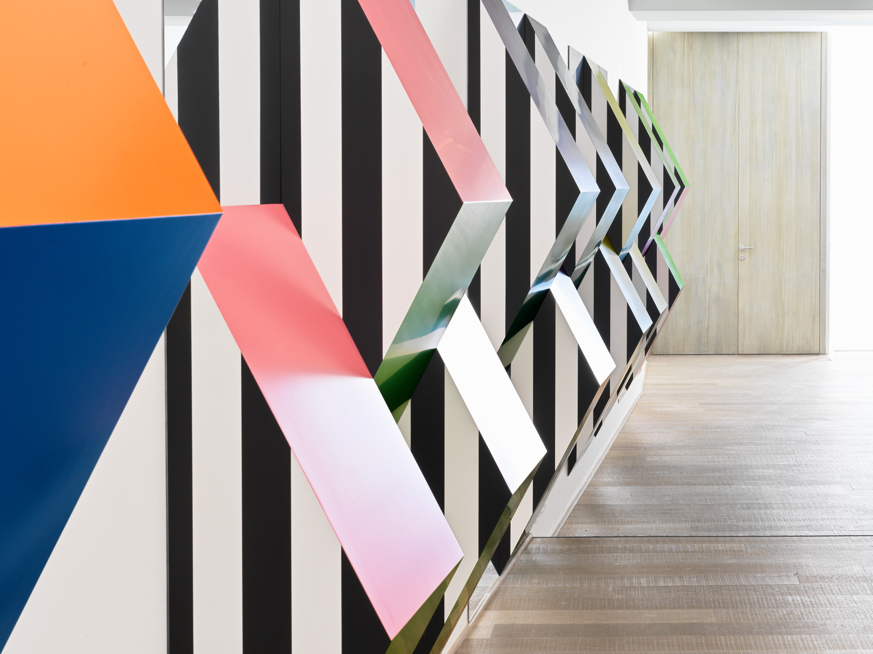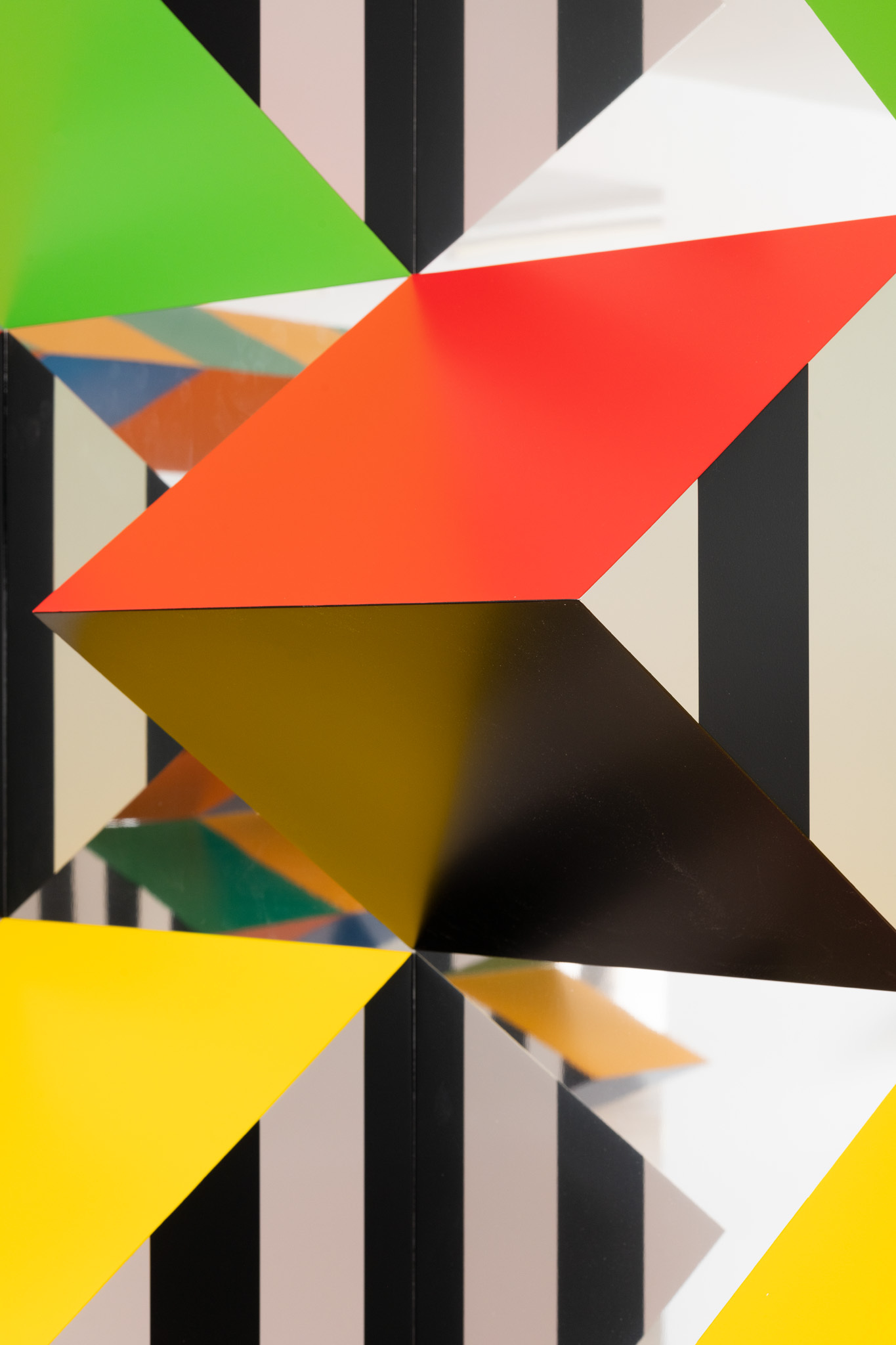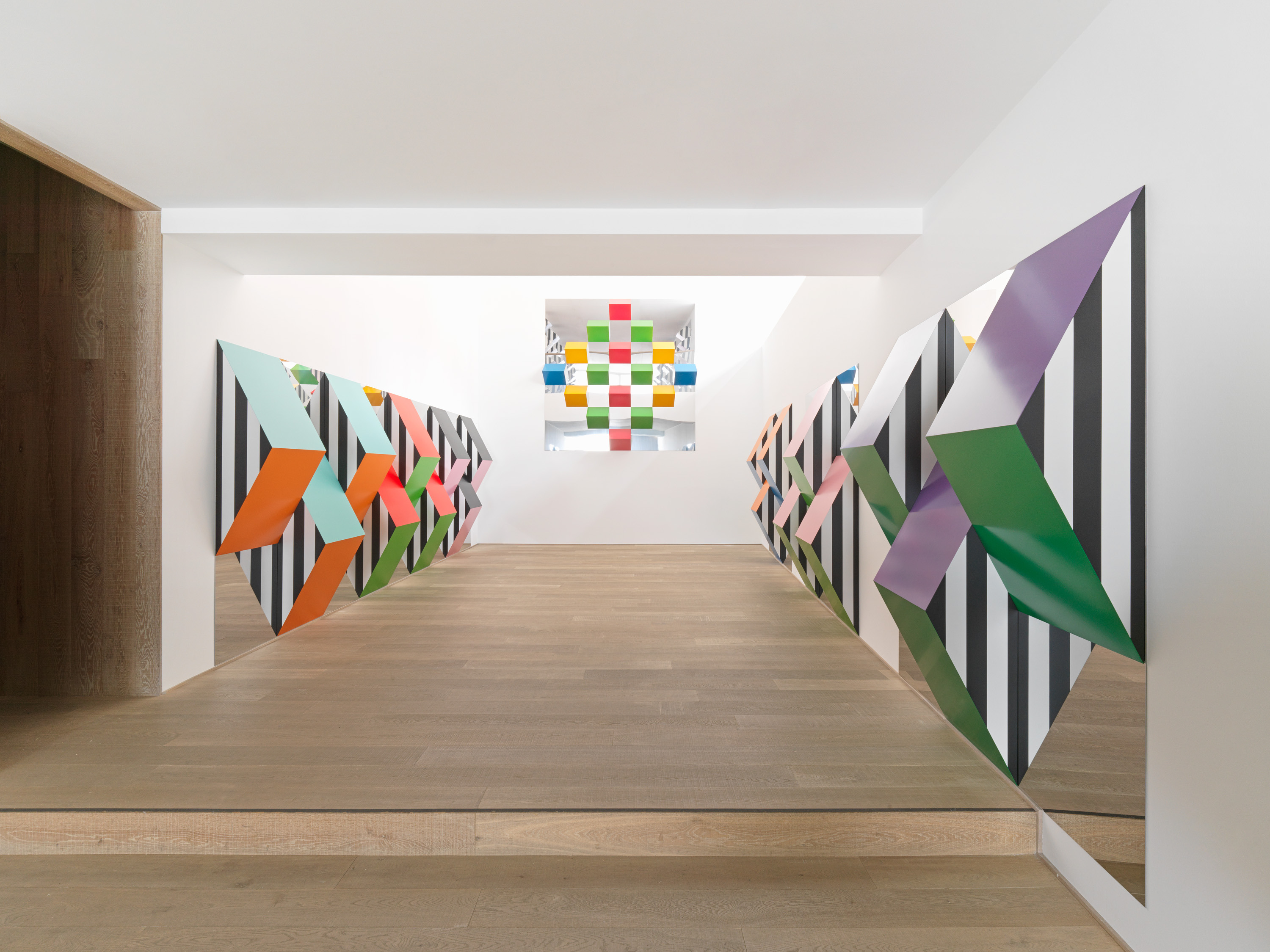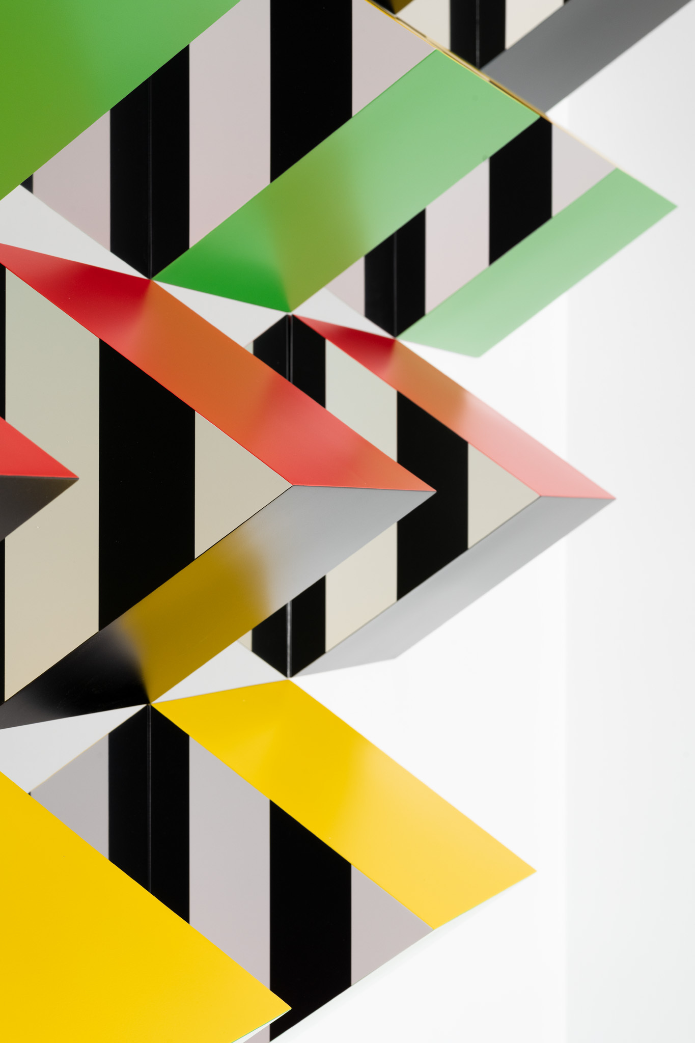 Géométries colorées is the first exhibition that Buren has conceived for the Rivoli space. This is important to note as it is not the artworks per se that are the subject of the exhibition but their relation with the space in which they are situated. And for the artist, this is both a physical reality i.e. the architecture (in this instance, the double-height void, clean contemporary lines and tight volumetrics) and a set of ever-changing conditions (light, atmosphere, people, even principles and ideologies). Buren’s high reliefs – dazzling three-dimensional assemblages of powder coated coloured aluminium, mirrors and the artist’s trademark stripes – can be seen as devices that both challenge and reveal the physical and intangible qualities of the site. The mirrored surfaces not only capture the surrounding space, which then becomes part of the artwork, but also reflect it back and forth from work to work, thus creating a doubling and redoubling effect, ad infinitum. For all their rigid geometry, systematic construction and use of ‘hard’ industrial materials, the reliefs are far from static: they are responsive, mutable and constantly changing according to the circumstances presented.