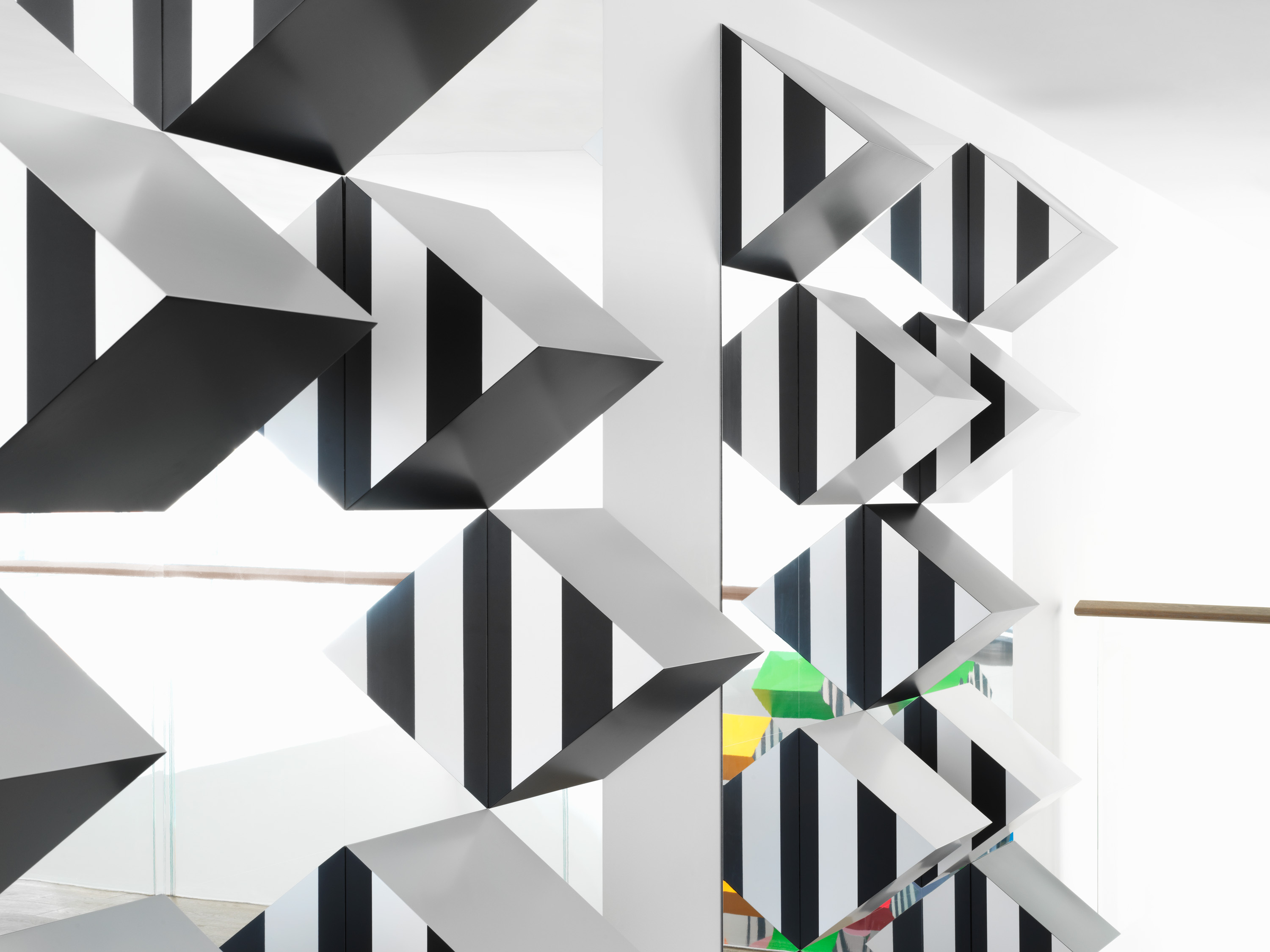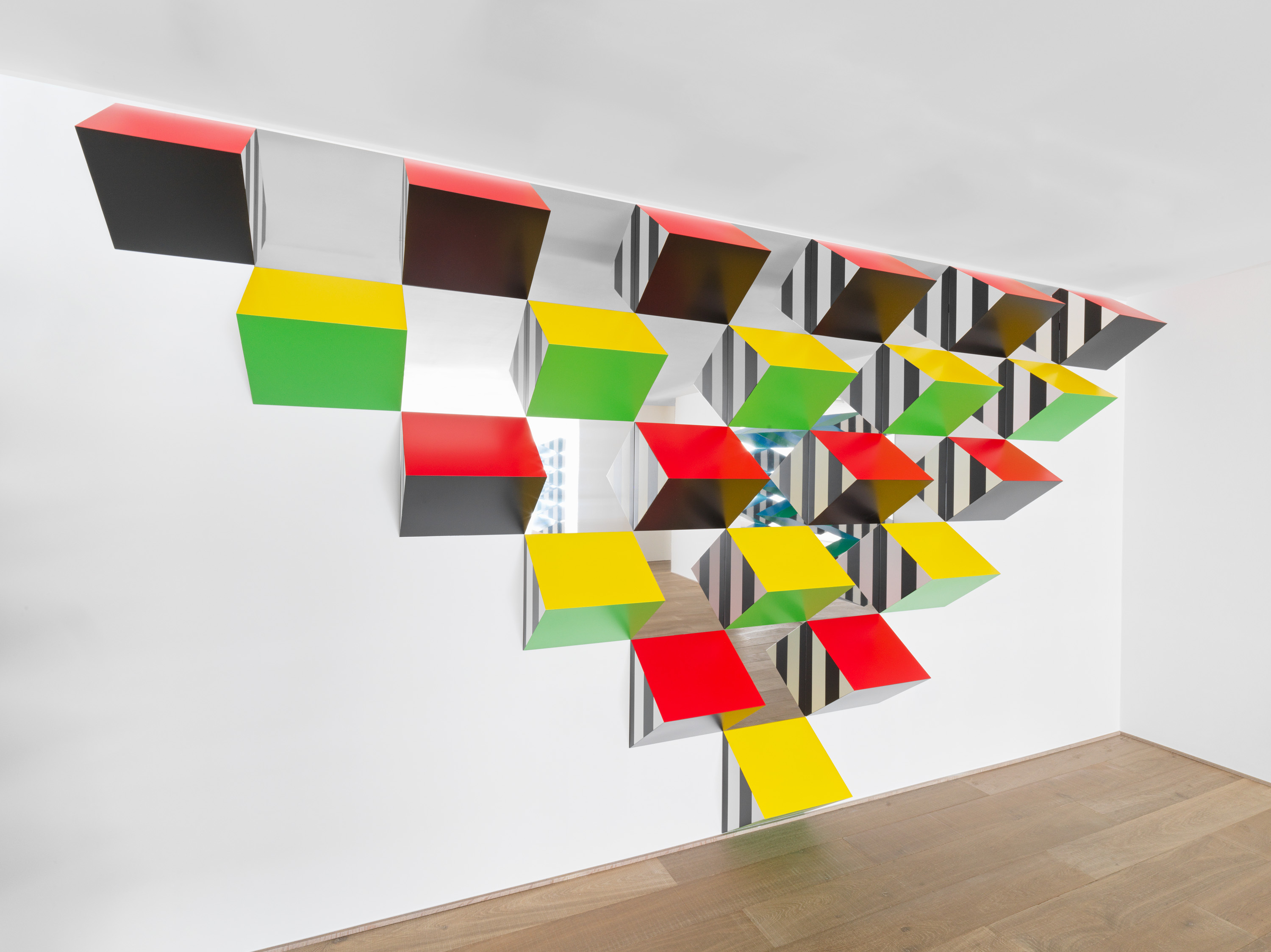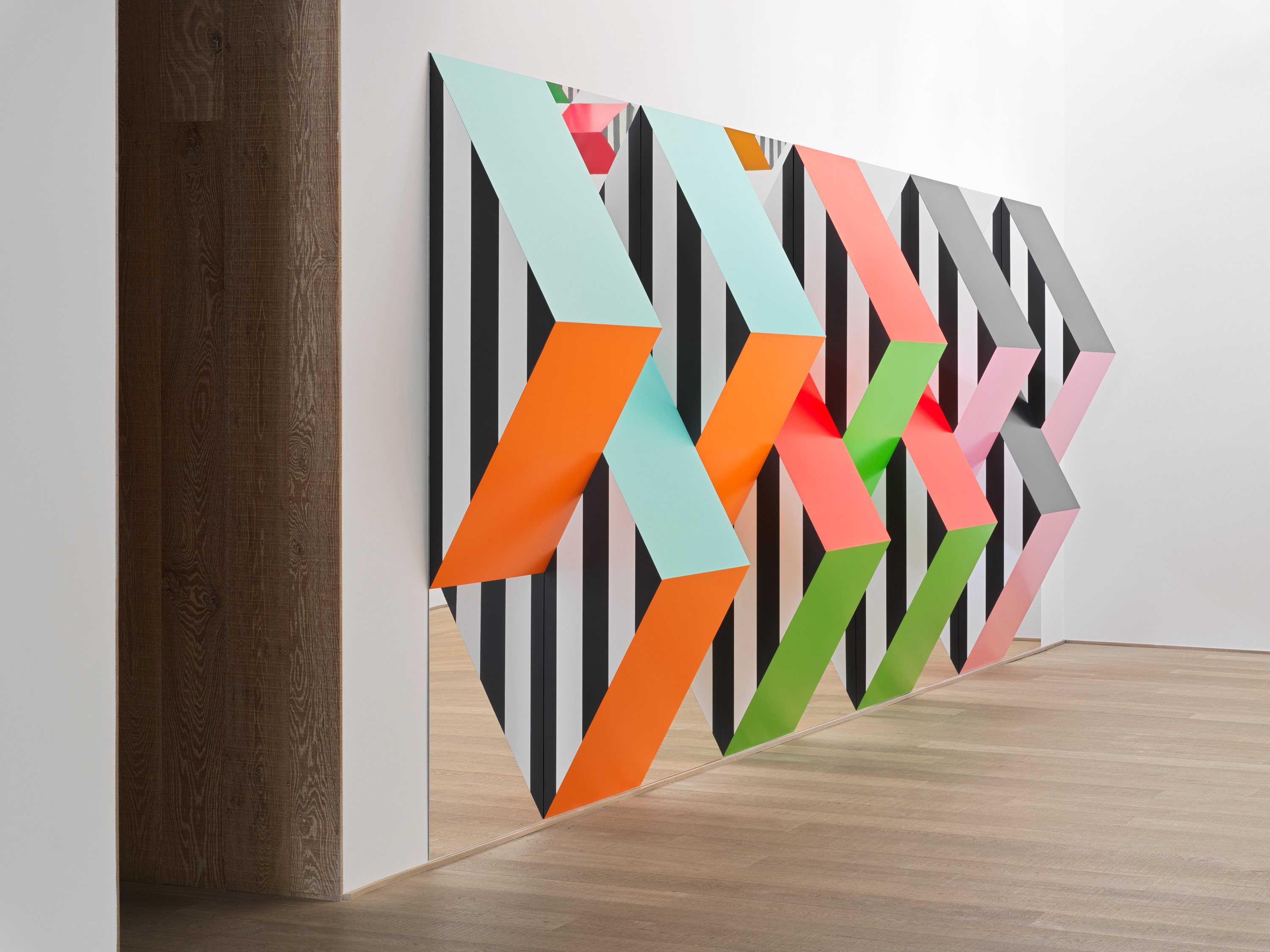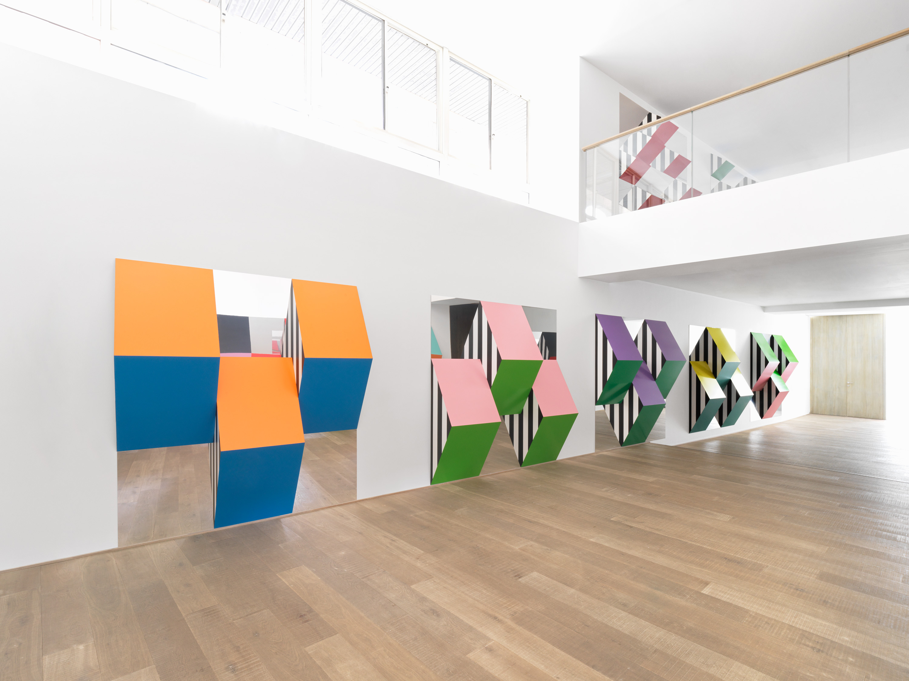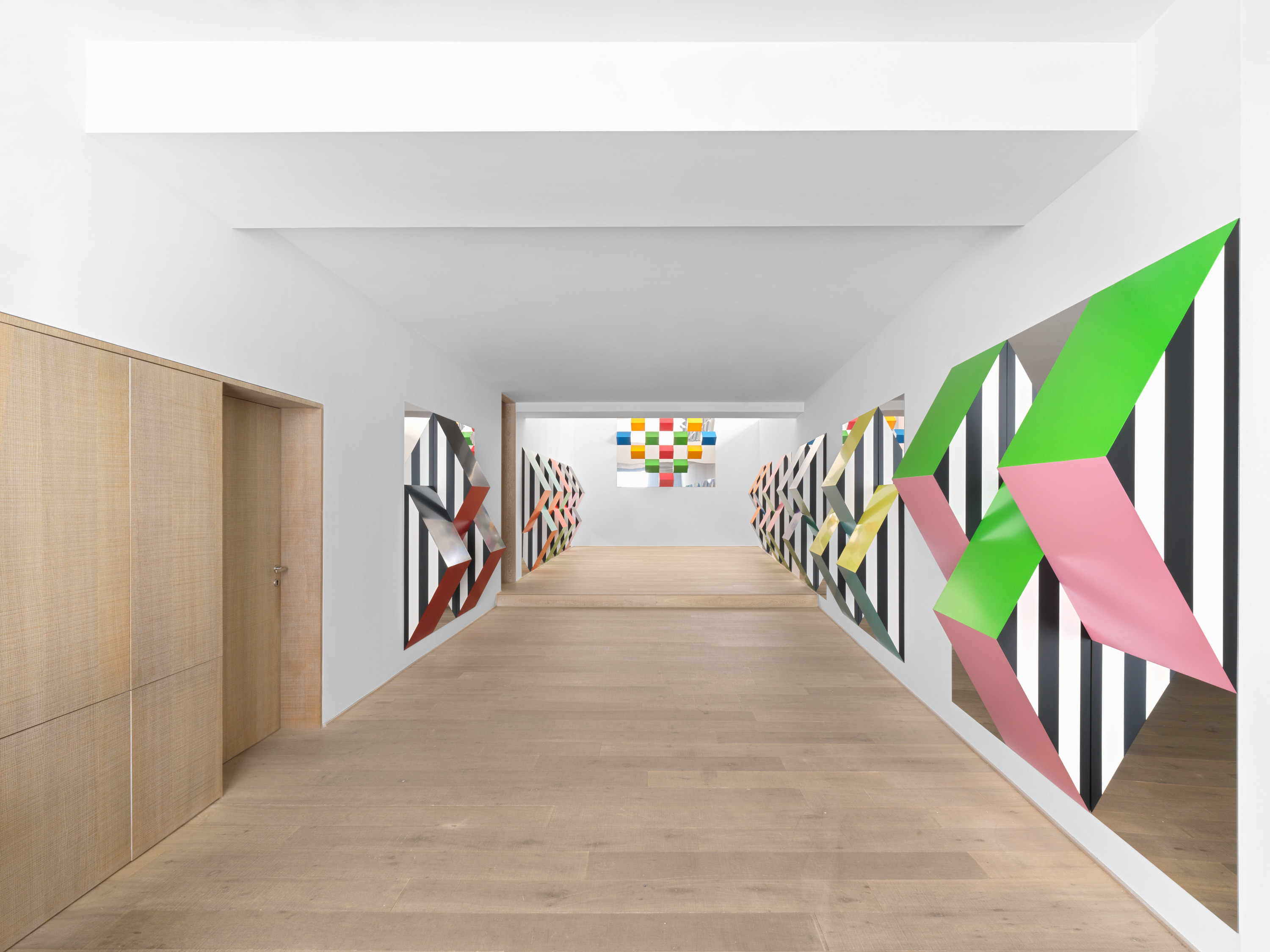 Géométries colorées is the first exhibition that Buren has conceived for the Rivoli space. This is important to note as it is not the artworks per se that are the subject of the exhibition but their relation with the space in which they are situated. And for the artist, this is both a physical reality i.e. the architecture (in this instance, the double-height void, clean contemporary lines and tight volumetrics) and a set of ever-changing conditions (light, atmosphere, people, even principles and ideologies). Buren’s high reliefs – dazzling three-dimensional assemblages of powder coated coloured aluminium, mirrors and the artist’s trademark stripes – can be seen as devices that both challenge and reveal the physical and intangible qualities of the site. The mirrored surfaces not only capture the surrounding space, which then becomes part of the artwork, but also reflect it back and forth from work to work, thus creating a doubling and redoubling effect, ad infinitum. For all their rigid geometry, systematic construction and use of ‘hard’ industrial materials, the reliefs are far from static: they are responsive, mutable and constantly changing according to the circumstances presented.