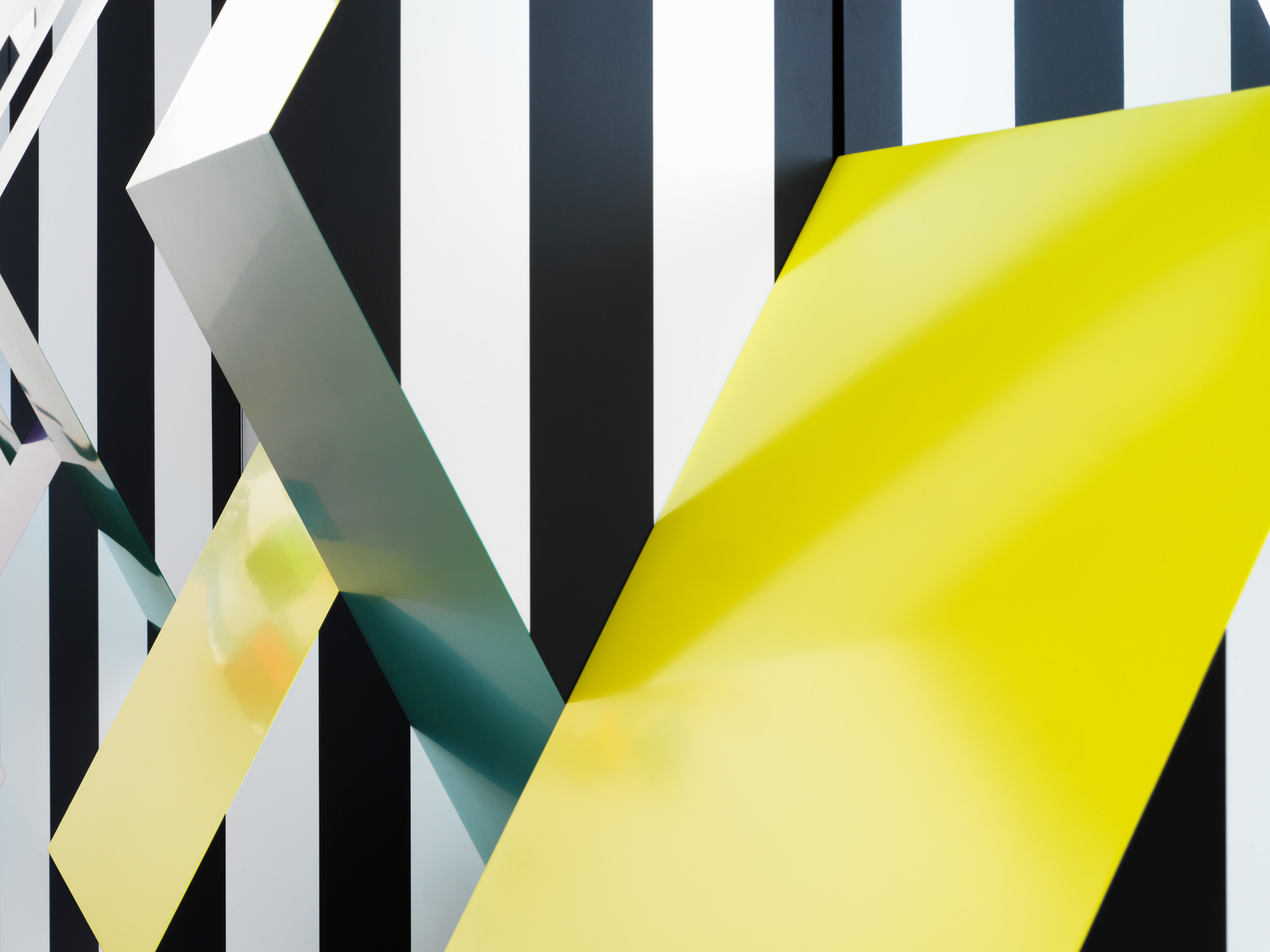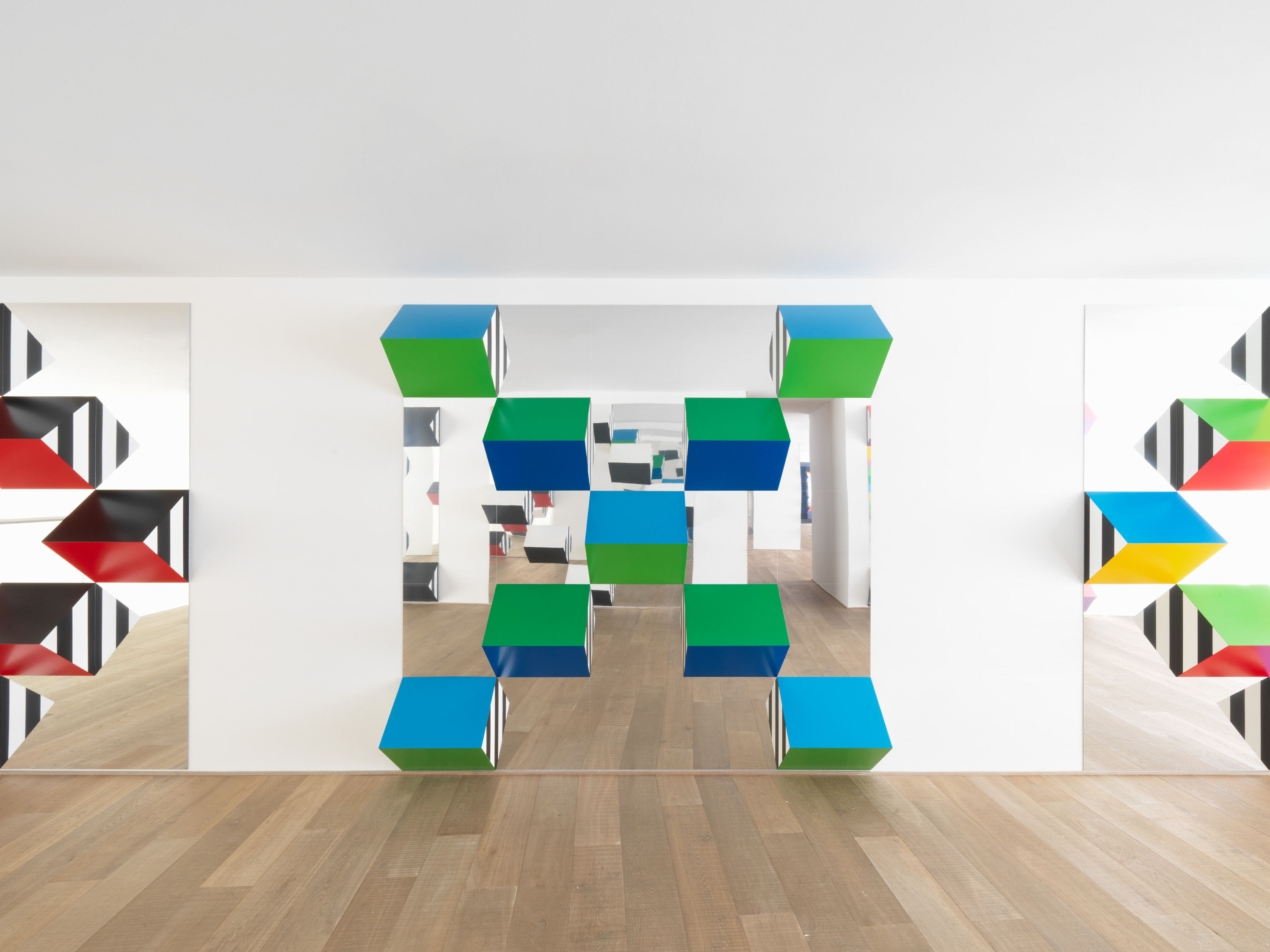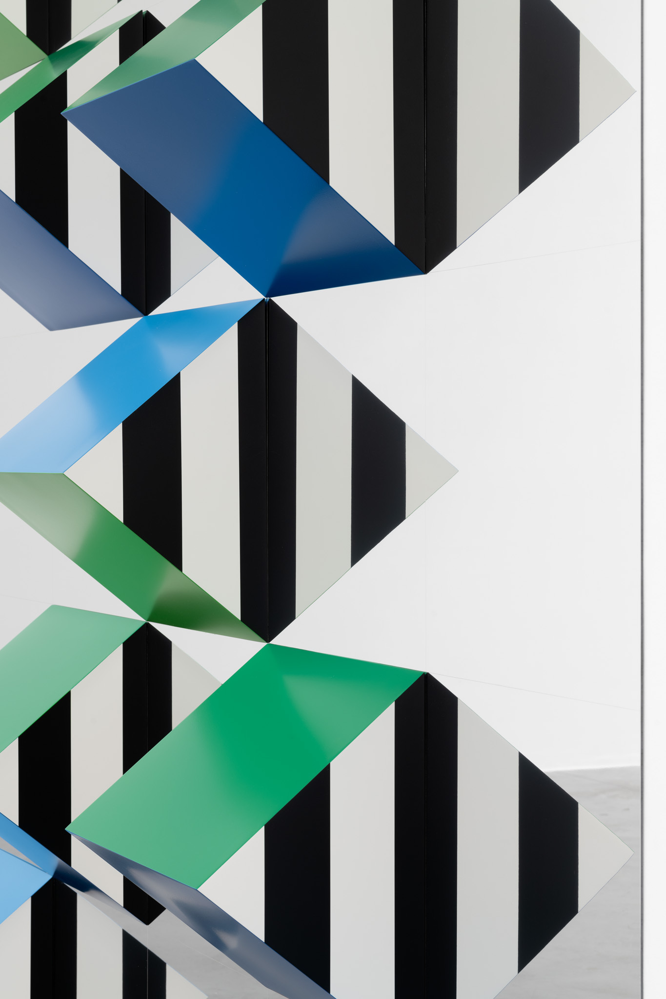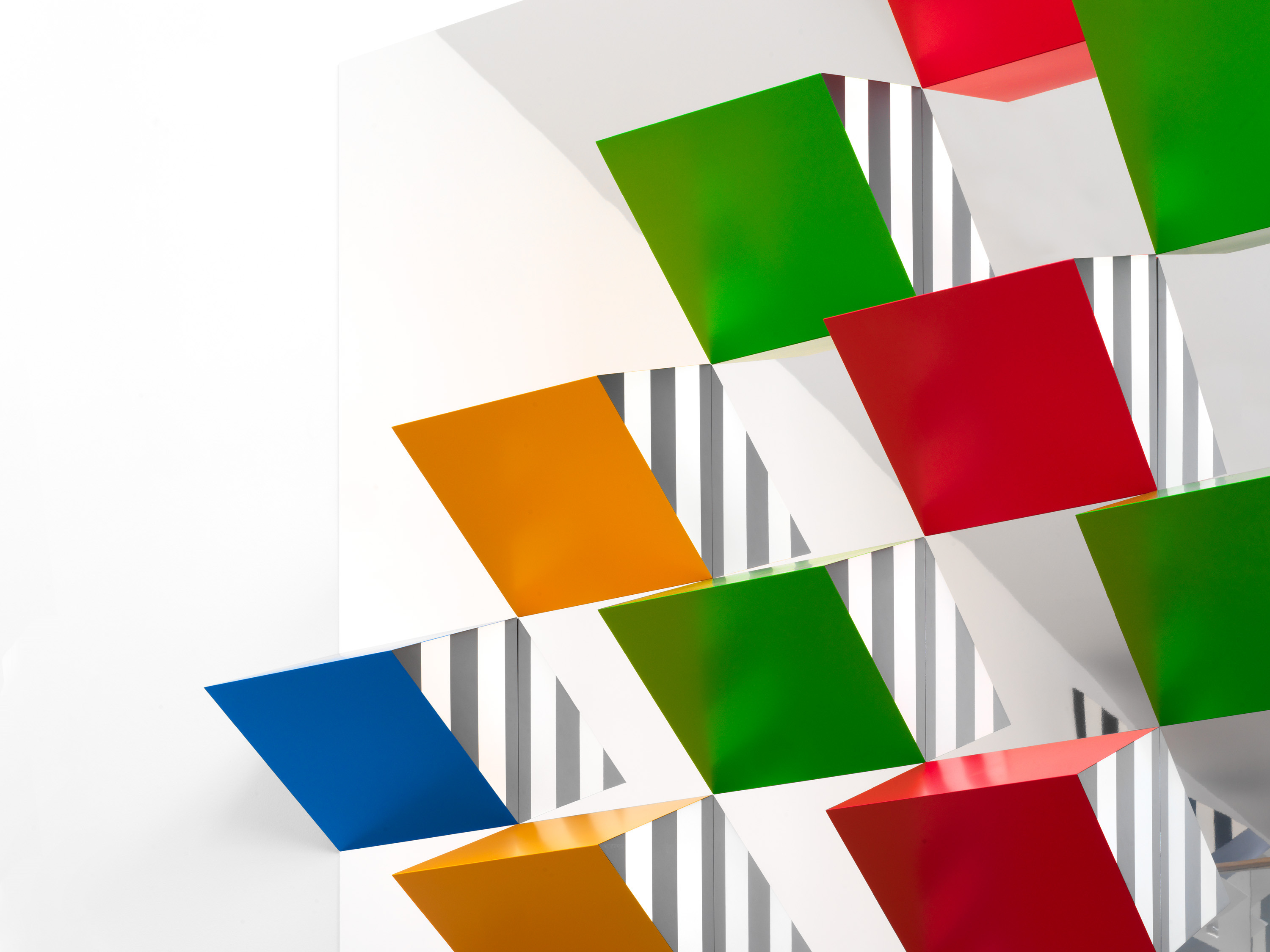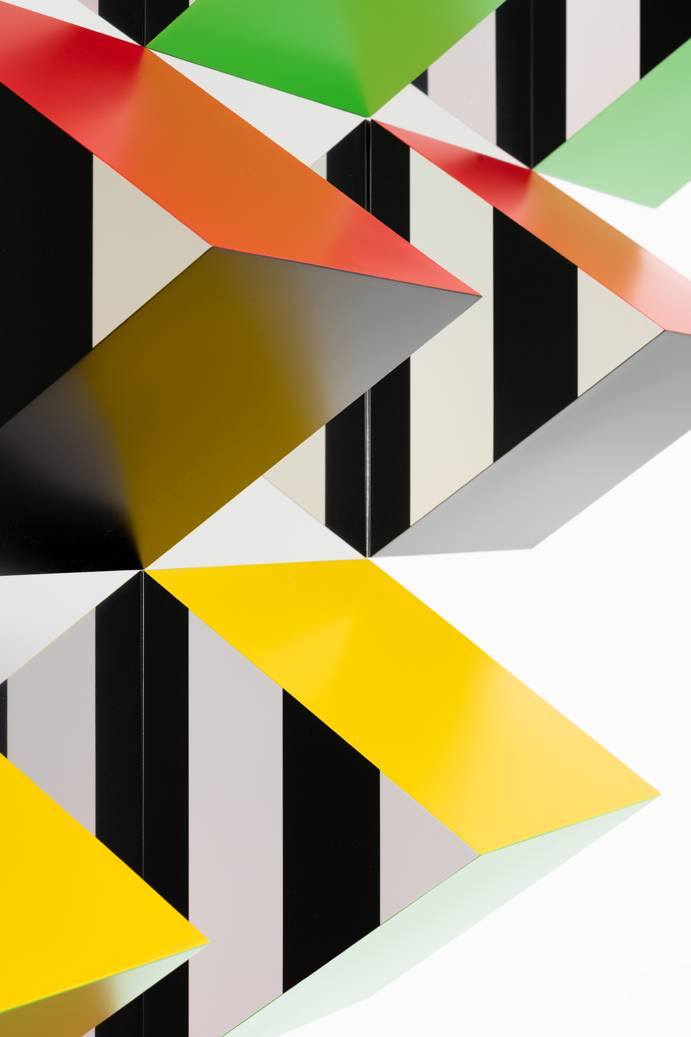 Géométries colorées is the first exhibition that Buren has conceived for the Rivoli space. This is important to note as it is not the artworks per se that are the subject of the exhibition but their relation with the space in which they are situated. And for the artist, this is both a physical reality i.e. the architecture (in this instance, the double-height void, clean contemporary lines and tight volumetrics) and a set of ever-changing conditions (light, atmosphere, people, even principles and ideologies). Buren’s high reliefs – dazzling three-dimensional assemblages of powder coated coloured aluminium, mirrors and the artist’s trademark stripes – can be seen as devices that both challenge and reveal the physical and intangible qualities of the site. The mirrored surfaces not only capture the surrounding space, which then becomes part of the artwork, but also reflect it back and forth from work to work, thus creating a doubling and redoubling effect, ad infinitum. For all their rigid geometry, systematic construction and use of ‘hard’ industrial materials, the reliefs are far from static: they are responsive, mutable and constantly changing according to the circumstances presented.