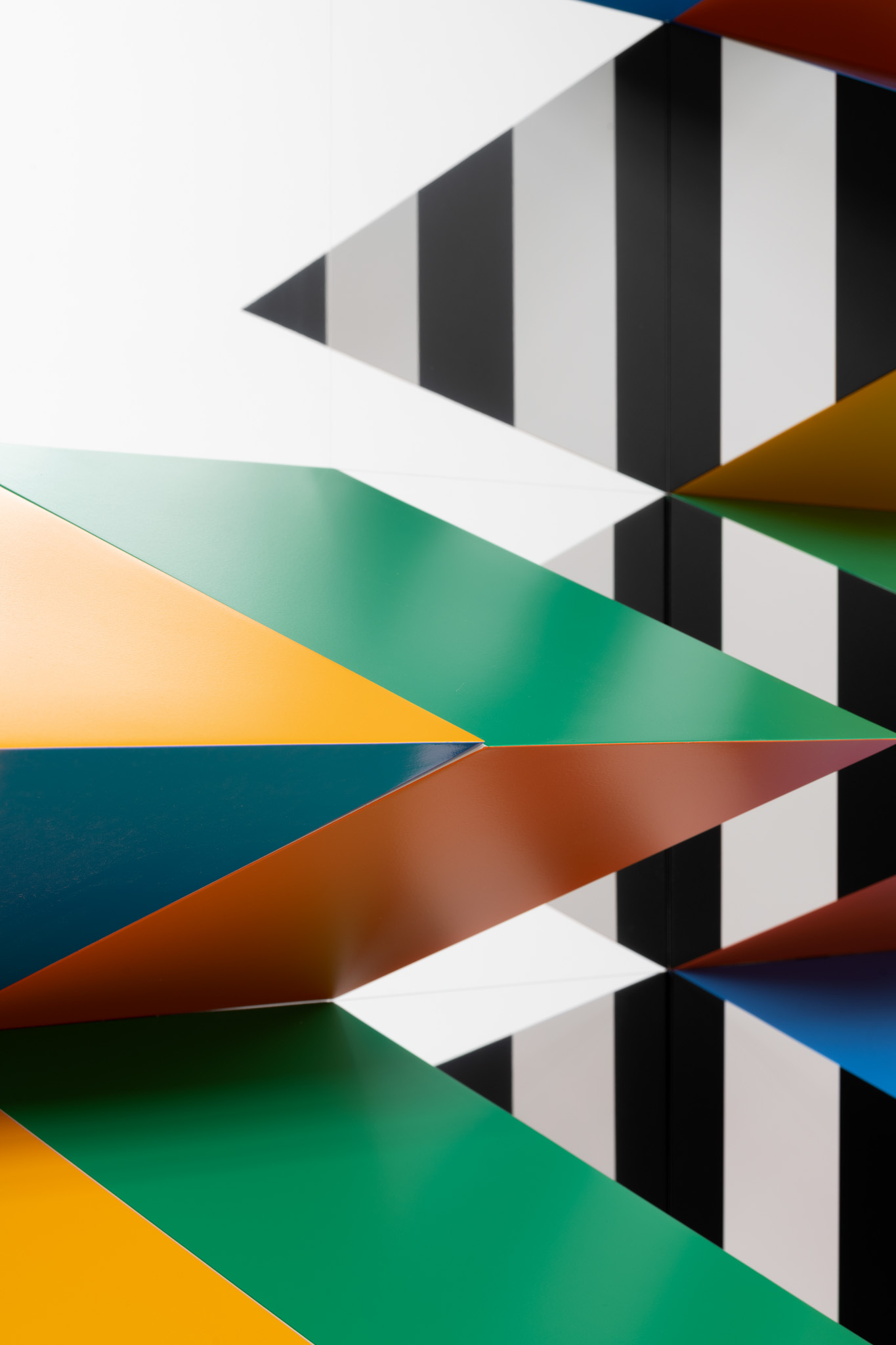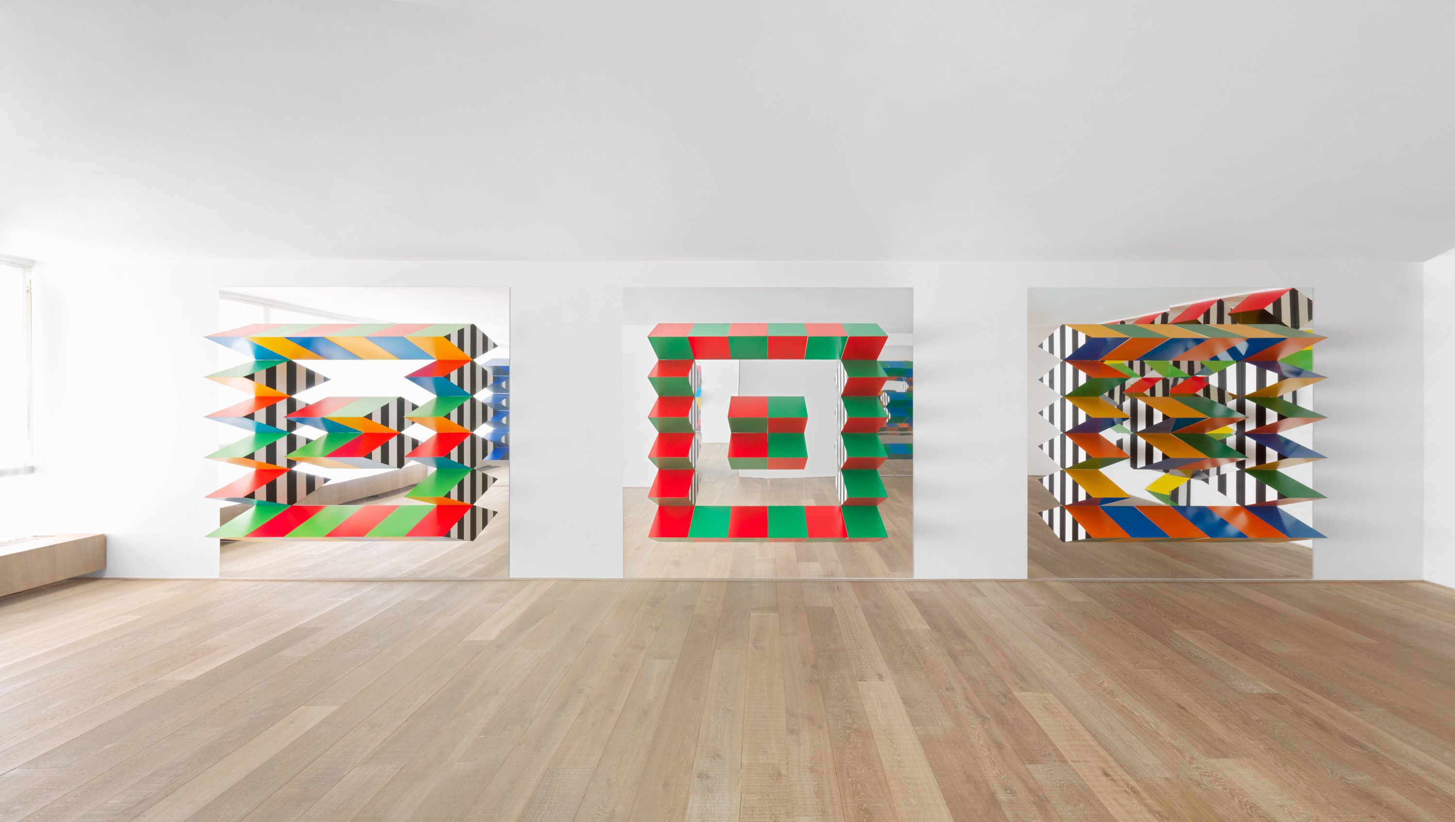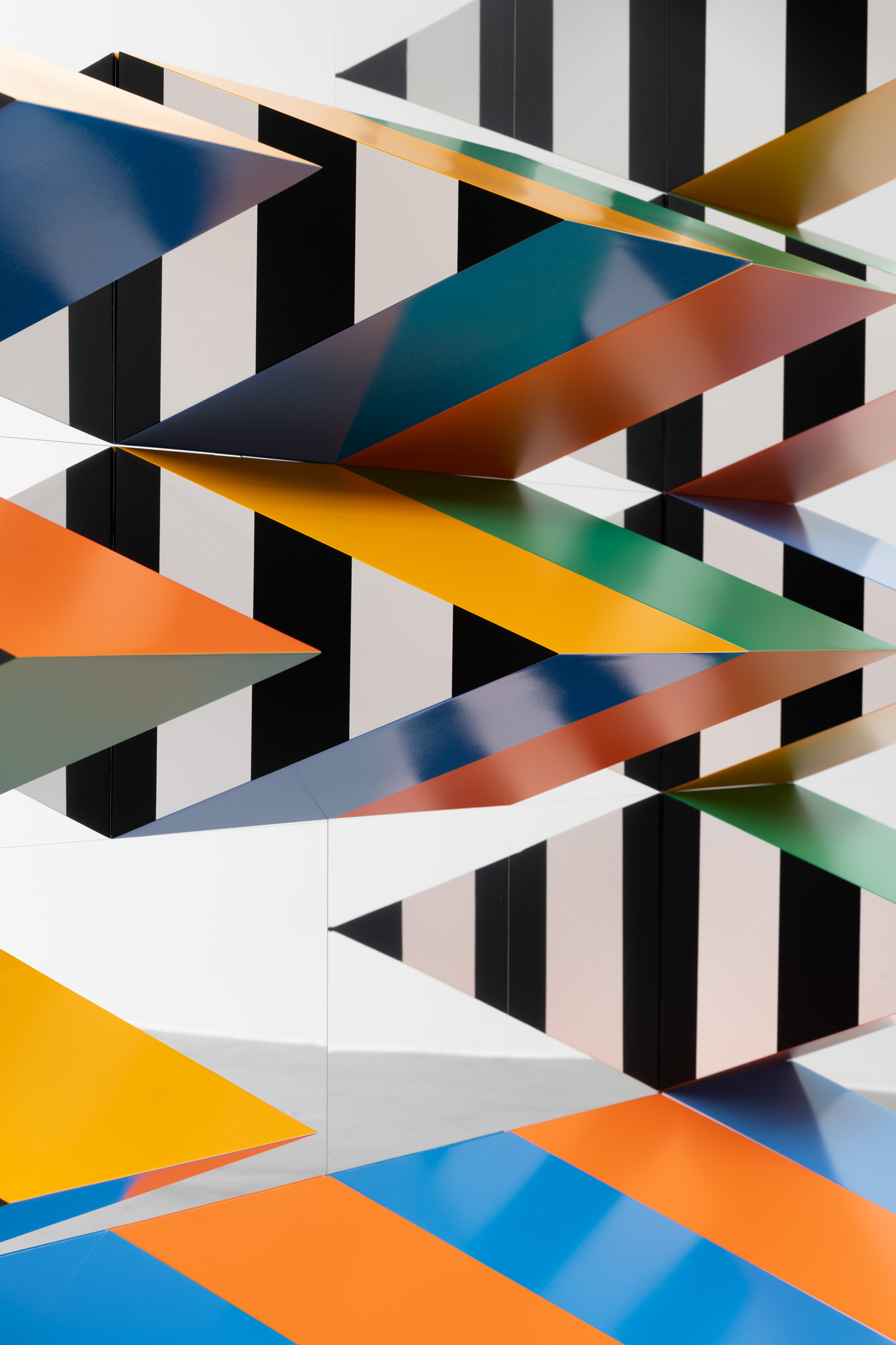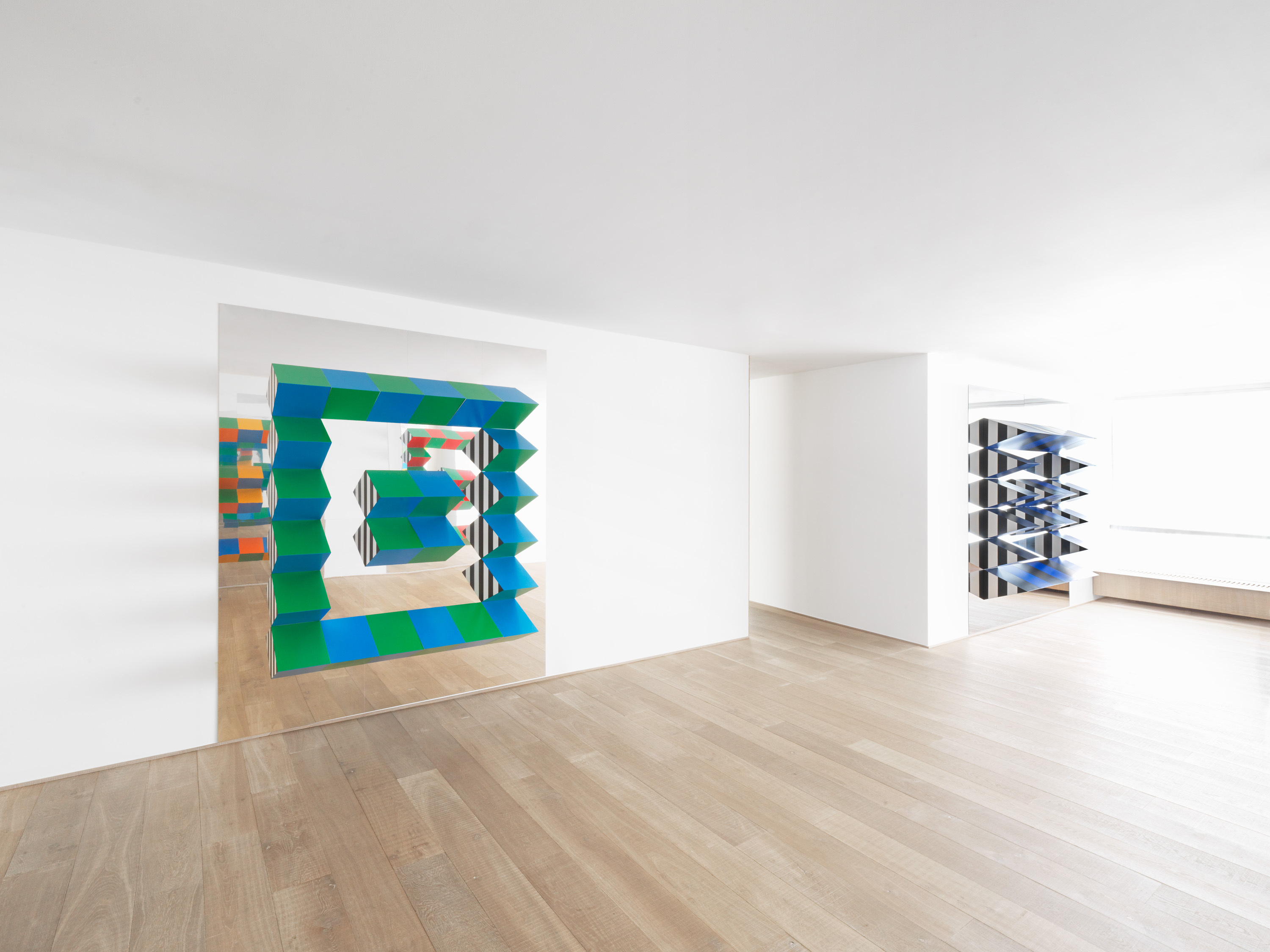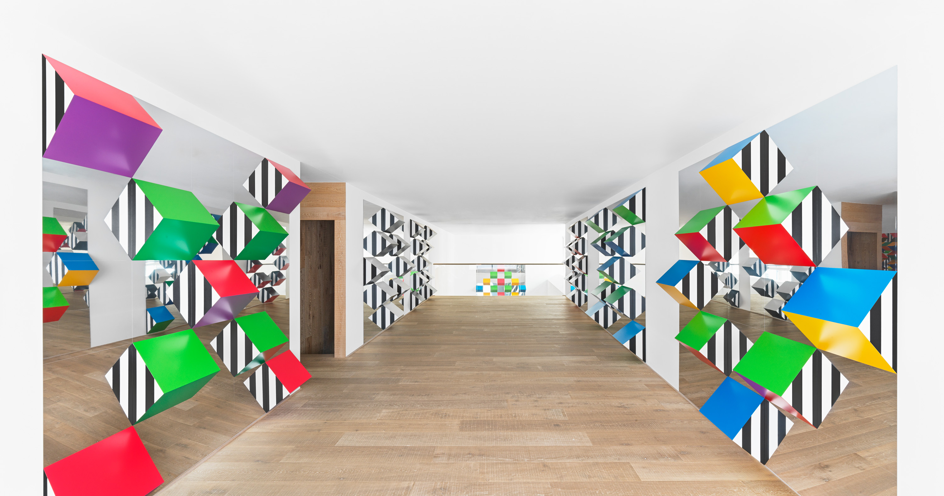 Géométries colorées is the first exhibition that Buren has conceived for the Rivoli space. This is important to note as it is not the artworks per se that are the subject of the exhibition but their relation with the space in which they are situated. And for the artist, this is both a physical reality i.e. the architecture (in this instance, the double-height void, clean contemporary lines and tight volumetrics) and a set of ever-changing conditions (light, atmosphere, people, even principles and ideologies). Buren’s high reliefs – dazzling three-dimensional assemblages of powder coated coloured aluminium, mirrors and the artist’s trademark stripes – can be seen as devices that both challenge and reveal the physical and intangible qualities of the site. The mirrored surfaces not only capture the surrounding space, which then becomes part of the artwork, but also reflect it back and forth from work to work, thus creating a doubling and redoubling effect, ad infinitum. For all their rigid geometry, systematic construction and use of ‘hard’ industrial materials, the reliefs are far from static: they are responsive, mutable and constantly changing according to the circumstances presented.