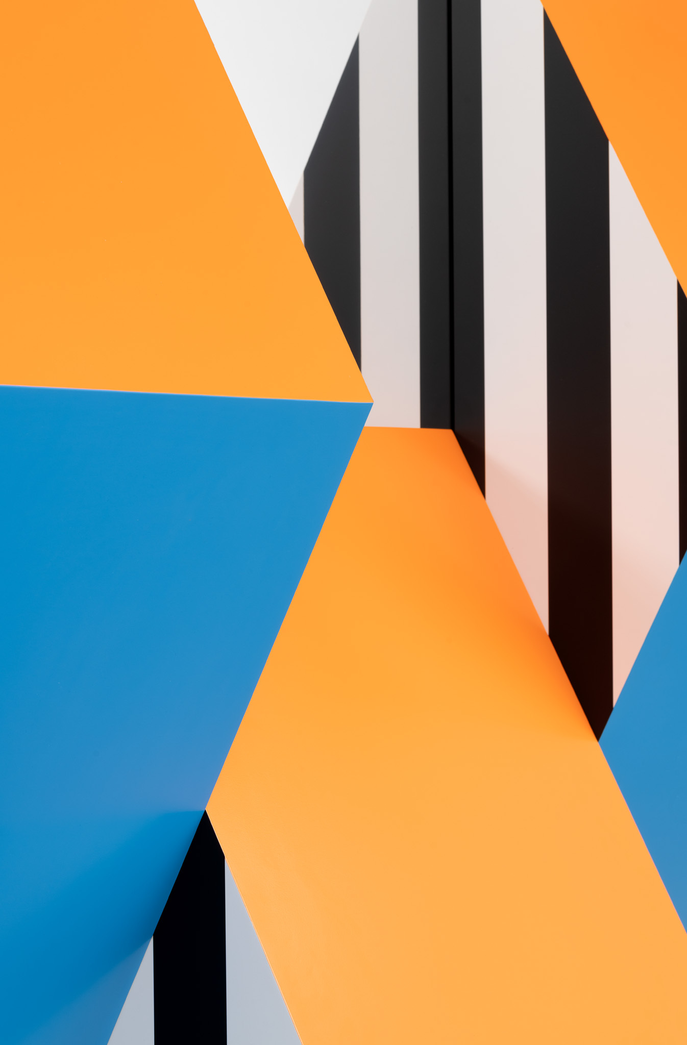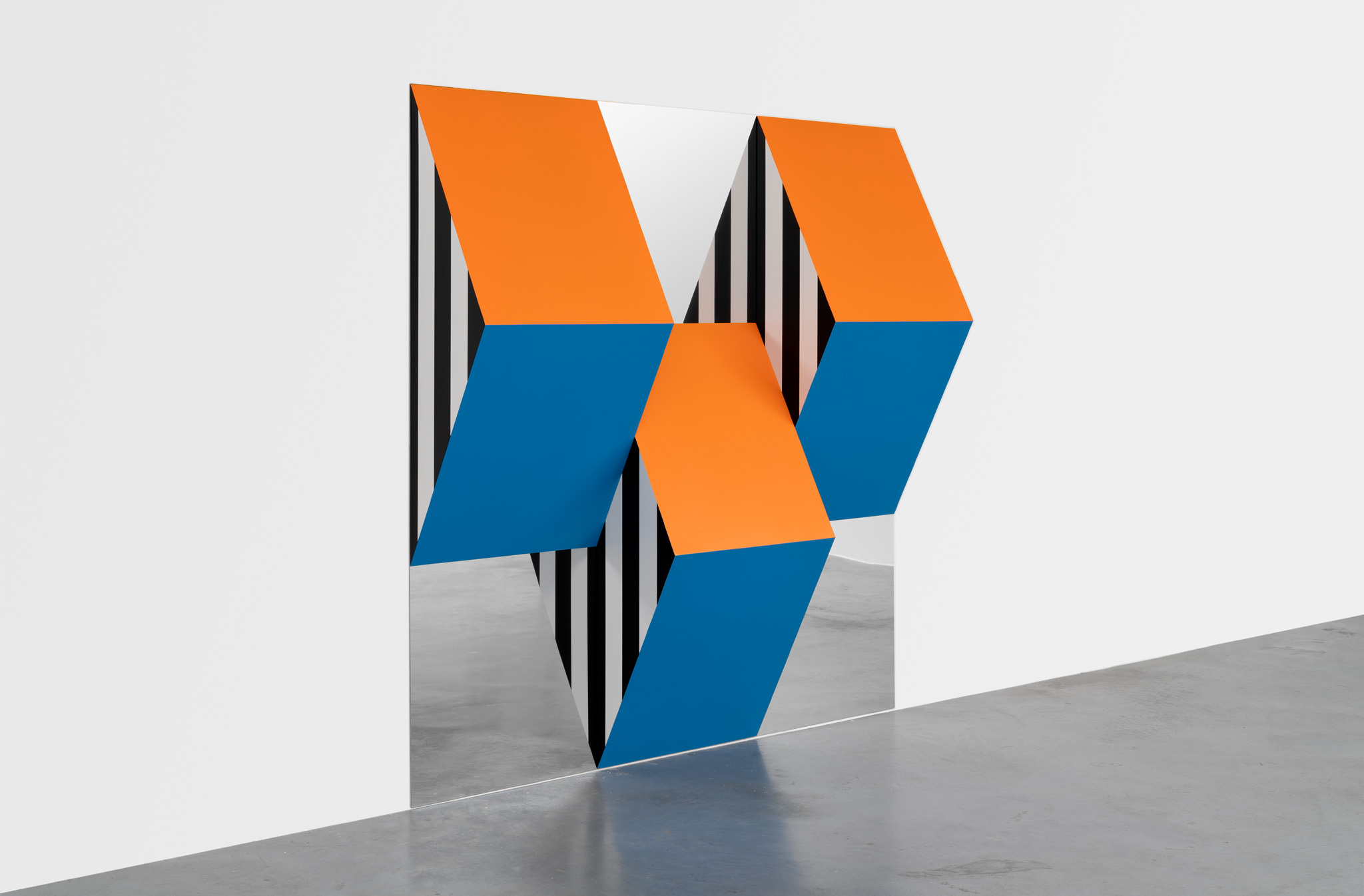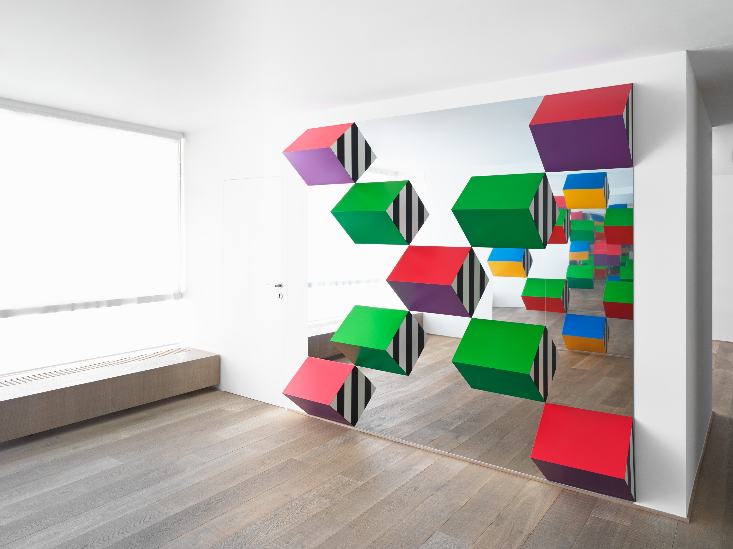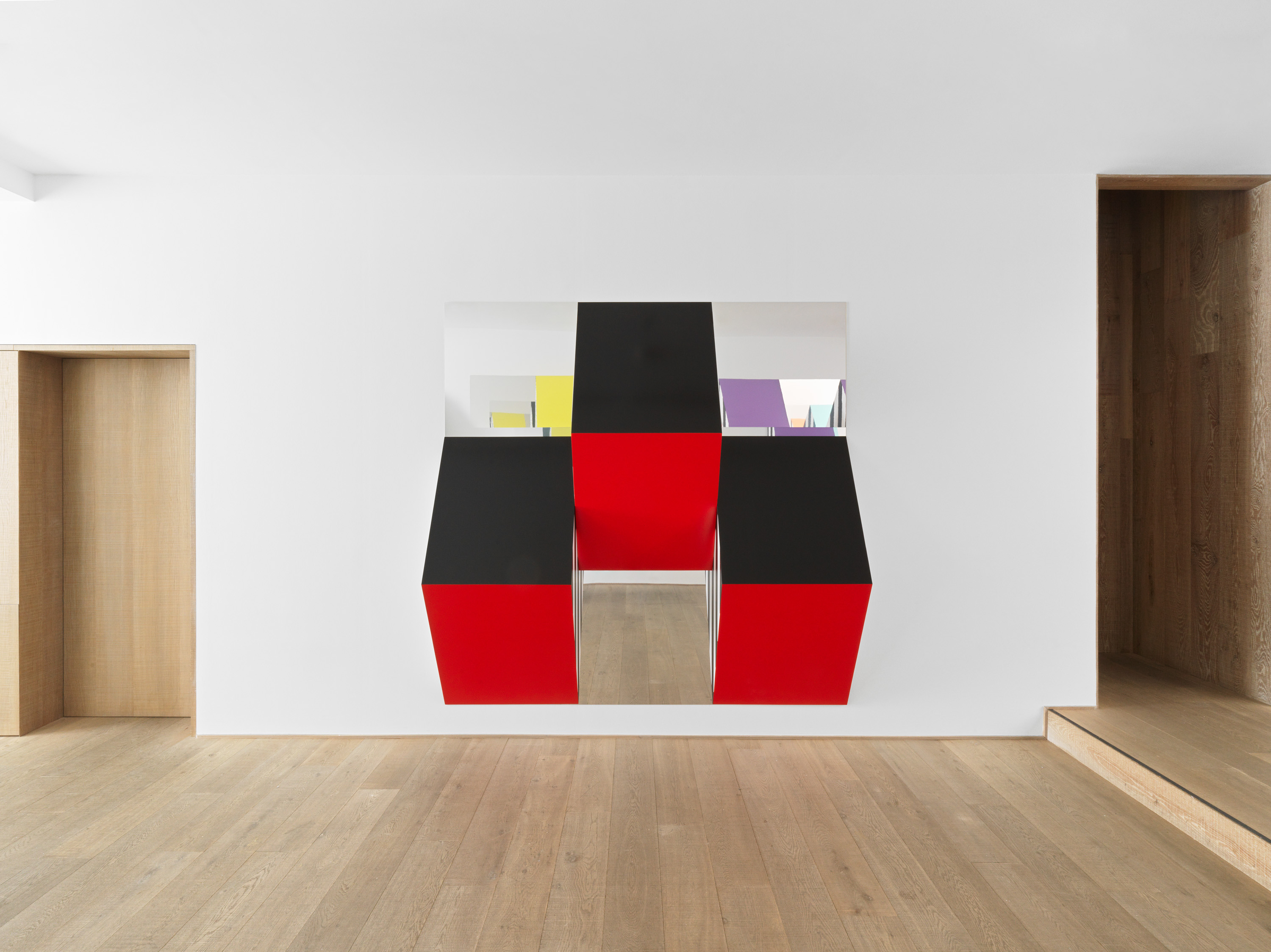Géométries colorées is the first exhibition that Buren has conceived for the Rivoli space. This is important to note as it is not the artworks per se that are the subject of the exhibition but their relation with the space in which they are situated. And for the artist, this is both a physical reality i.e. the architecture (in this instance, the double-height void, clean contemporary lines and tight volumetrics) and a set of ever-changing conditions (light, atmosphere, people, even principles and ideologies). Buren’s high reliefs – dazzling three-dimensional assemblages of powder coated coloured aluminium, mirrors and the artist’s trademark stripes – can be seen as devices that both challenge and reveal the physical and intangible qualities of the site. The mirrored surfaces not only capture the surrounding space, which then becomes part of the artwork, but also reflect it back and forth from work to work, thus creating a doubling and redoubling effect, ad infinitum. For all their rigid geometry, systematic construction and use of ‘hard’ industrial materials, the reliefs are far from static: they are responsive, mutable and constantly changing according to the circumstances presented.