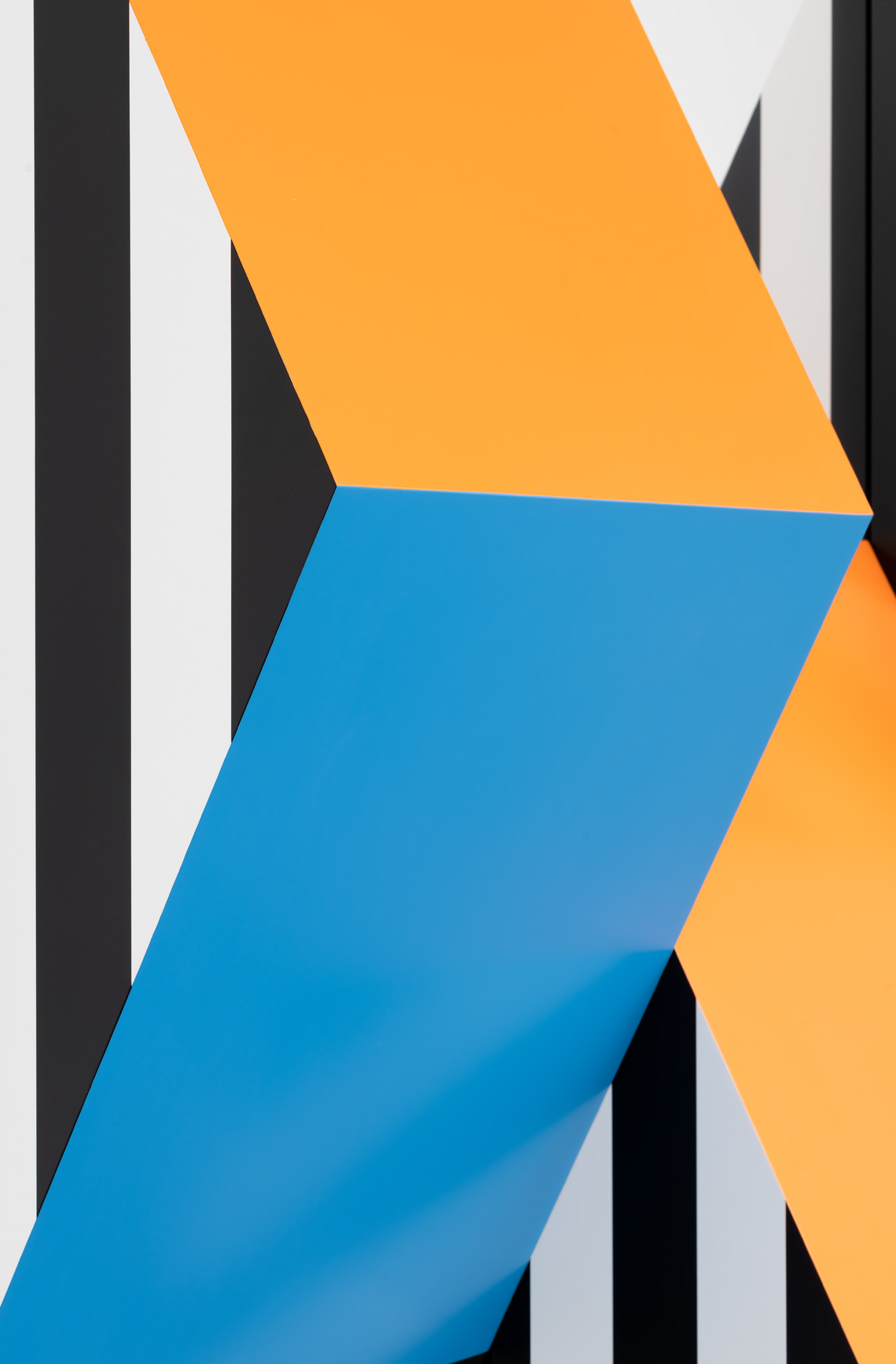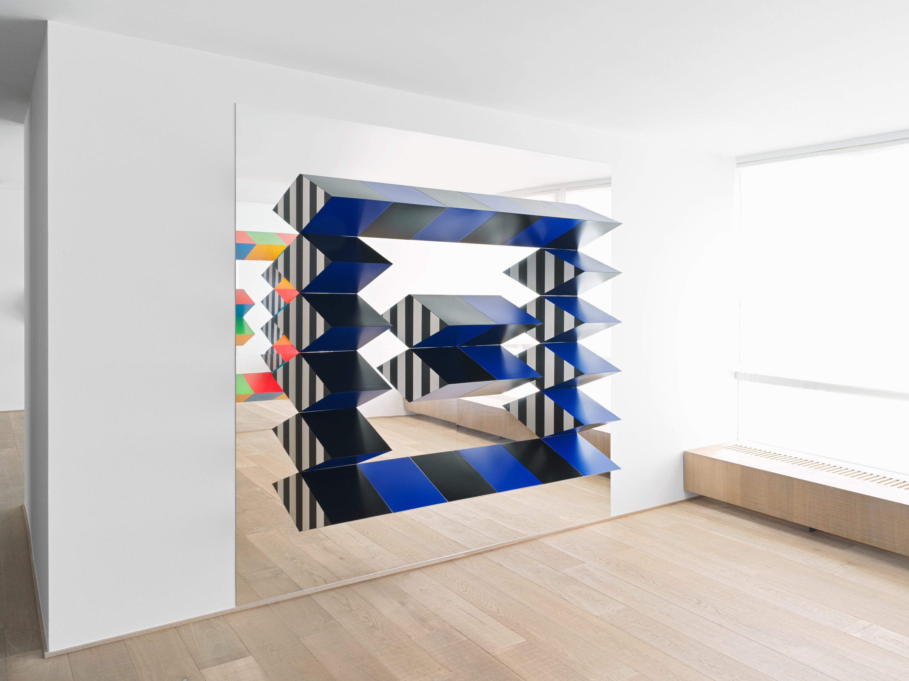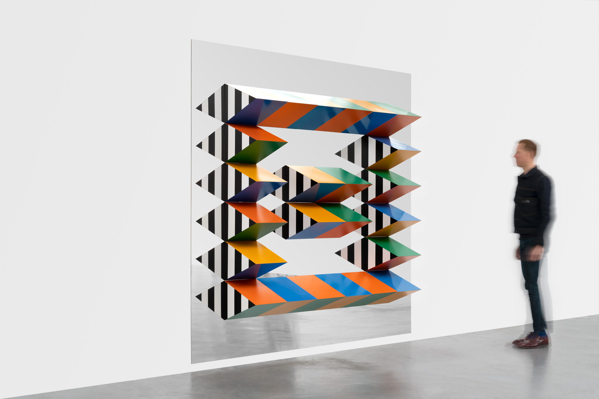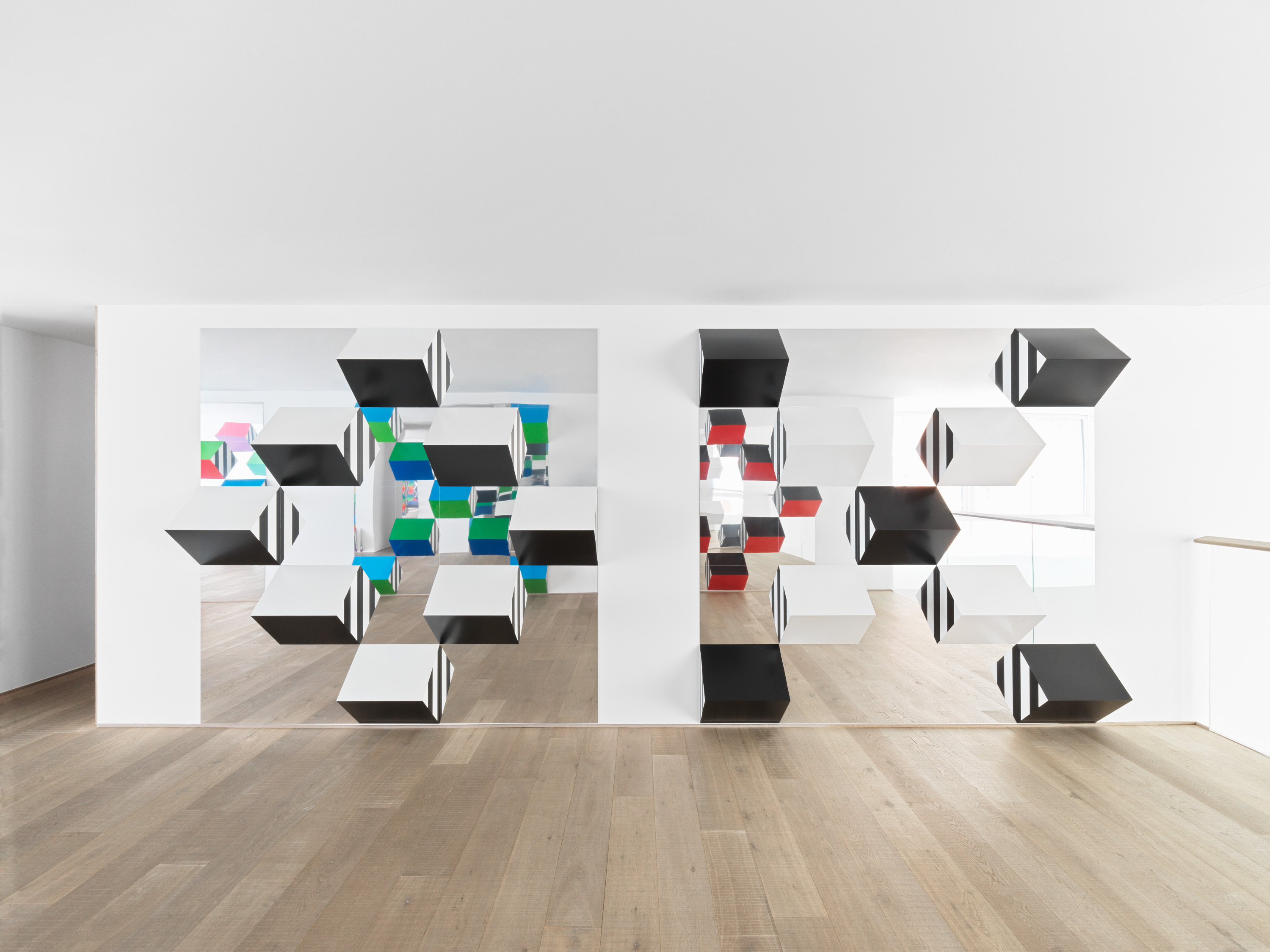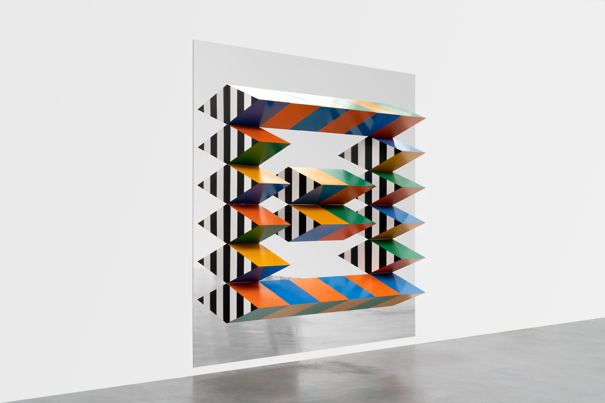 Géométries colorées is the first exhibition that Buren has conceived for the Rivoli space. This is important to note as it is not the artworks per se that are the subject of the exhibition but their relation with the space in which they are situated. And for the artist, this is both a physical reality i.e. the architecture (in this instance, the double-height void, clean contemporary lines and tight volumetrics) and a set of ever-changing conditions (light, atmosphere, people, even principles and ideologies). Buren’s high reliefs – dazzling three-dimensional assemblages of powder coated coloured aluminium, mirrors and the artist’s trademark stripes – can be seen as devices that both challenge and reveal the physical and intangible qualities of the site. The mirrored surfaces not only capture the surrounding space, which then becomes part of the artwork, but also reflect it back and forth from work to work, thus creating a doubling and redoubling effect, ad infinitum. For all their rigid geometry, systematic construction and use of ‘hard’ industrial materials, the reliefs are far from static: they are responsive, mutable and constantly changing according to the circumstances presented.