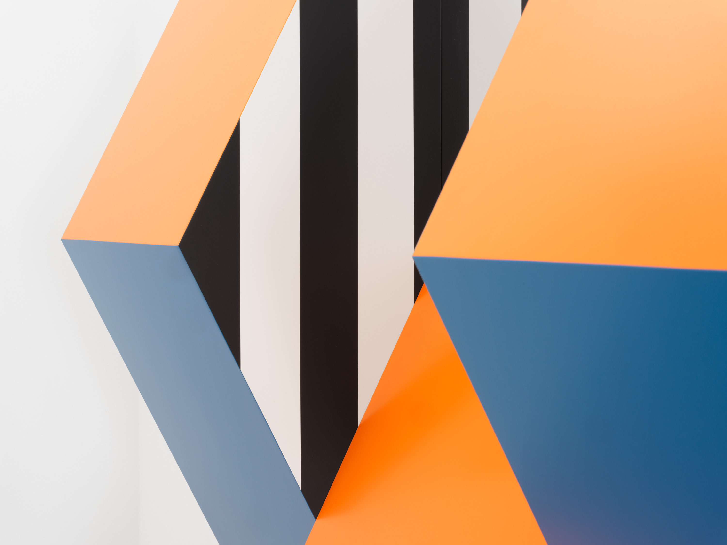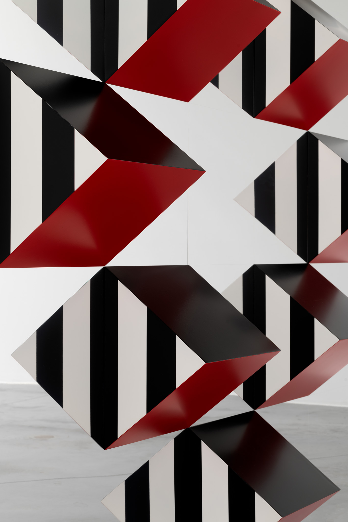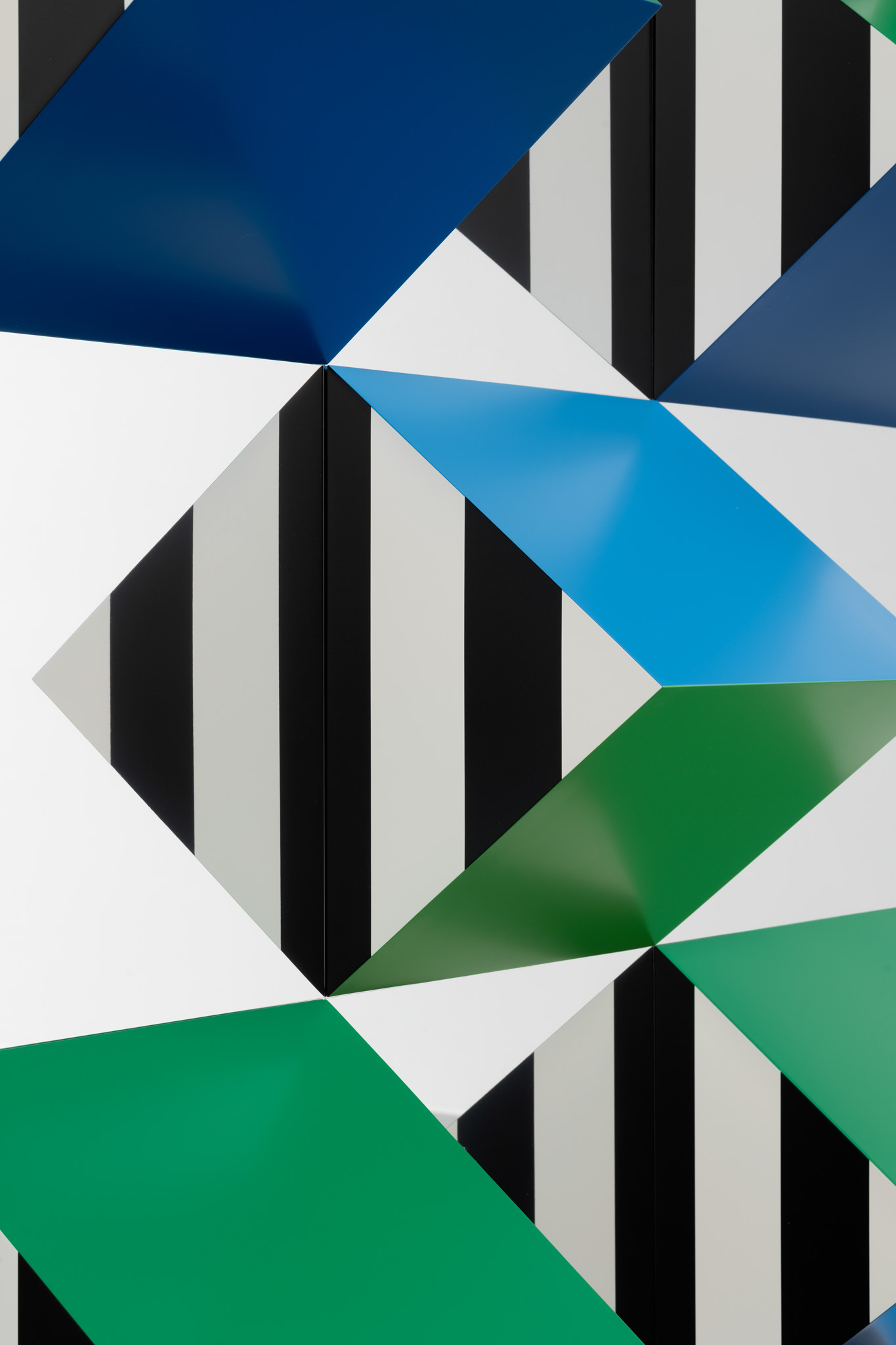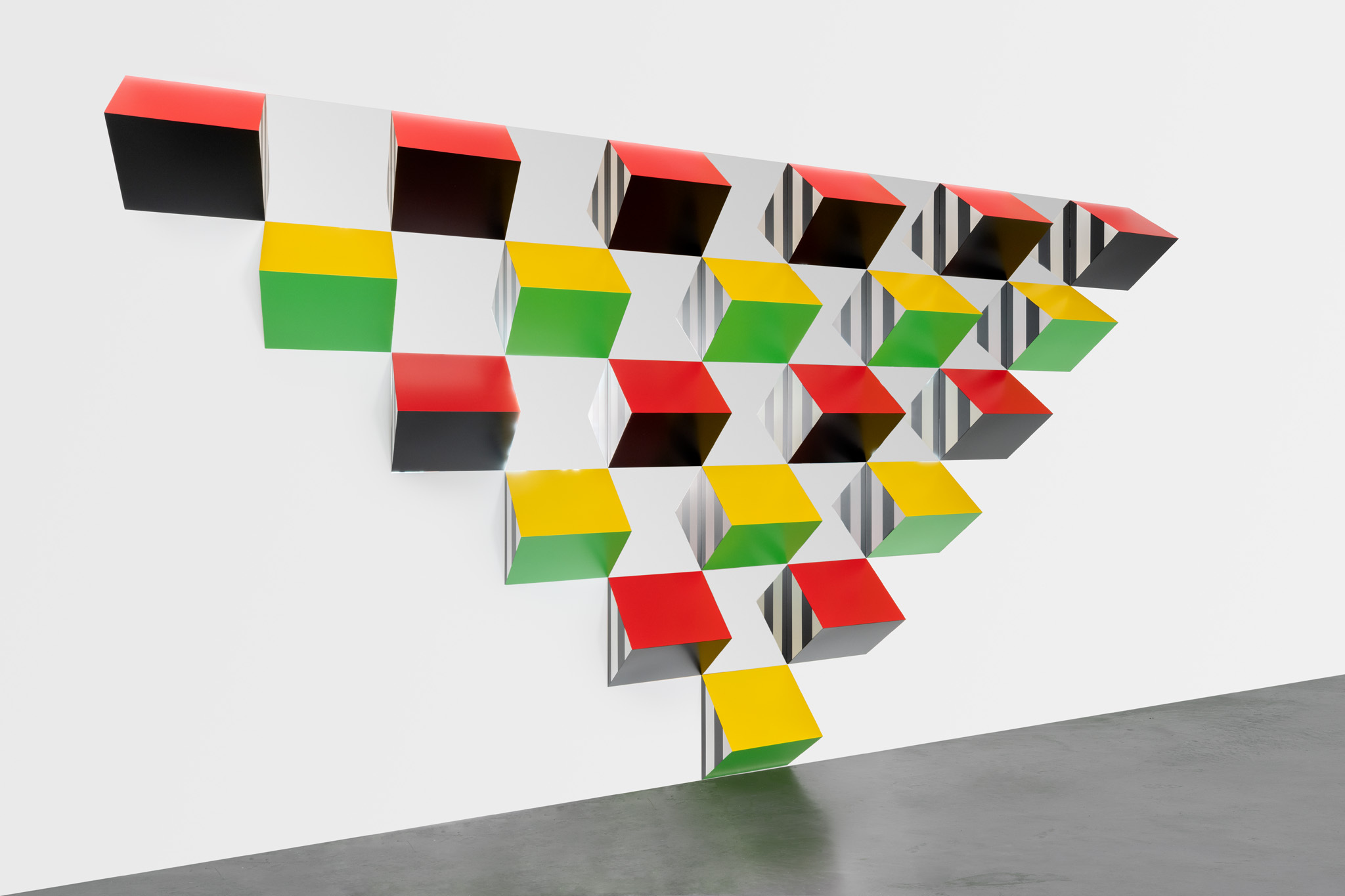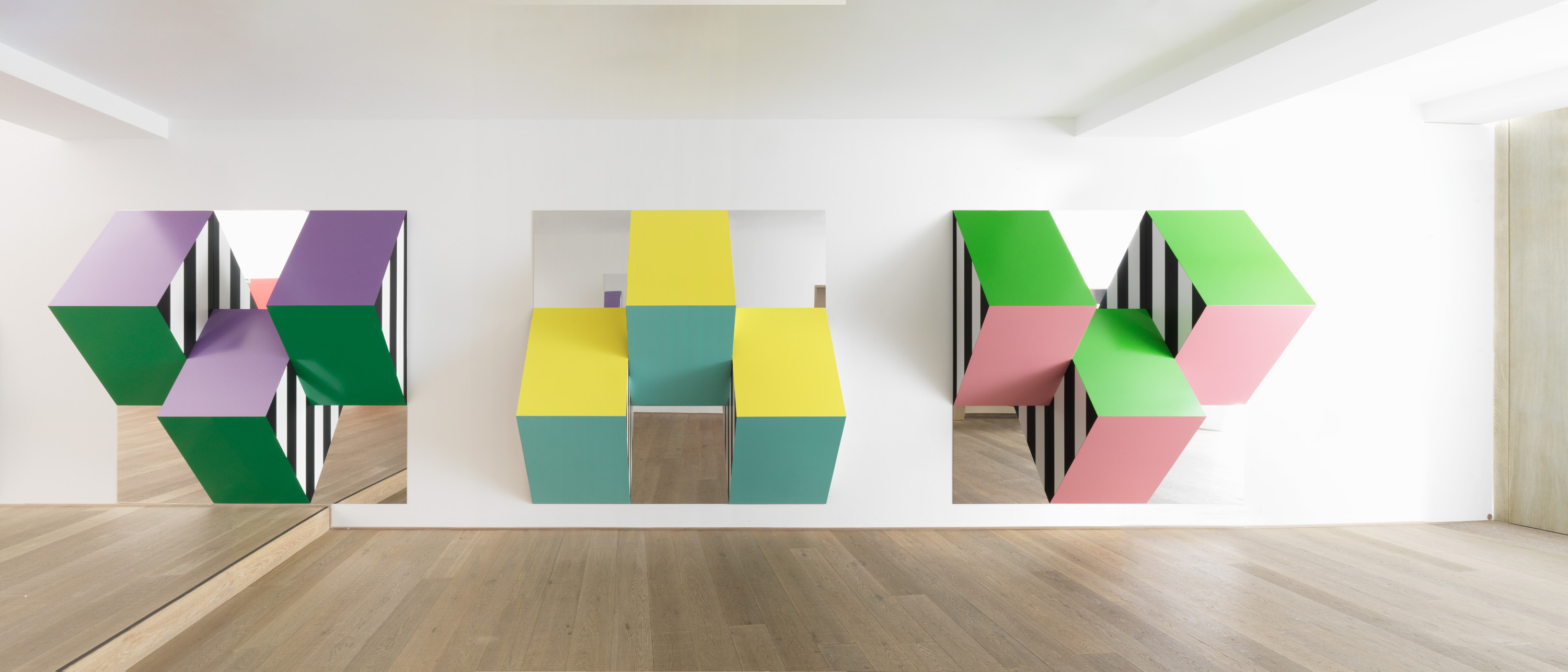 Géométries colorées is the first exhibition that Buren has conceived for the Rivoli space. This is important to note as it is not the artworks per se that are the subject of the exhibition but their relation with the space in which they are situated. And for the artist, this is both a physical reality i.e. the architecture (in this instance, the double-height void, clean contemporary lines and tight volumetrics) and a set of ever-changing conditions (light, atmosphere, people, even principles and ideologies). Buren’s high reliefs – dazzling three-dimensional assemblages of powder coated coloured aluminium, mirrors and the artist’s trademark stripes – can be seen as devices that both challenge and reveal the physical and intangible qualities of the site. The mirrored surfaces not only capture the surrounding space, which then becomes part of the artwork, but also reflect it back and forth from work to work, thus creating a doubling and redoubling effect, ad infinitum. For all their rigid geometry, systematic construction and use of ‘hard’ industrial materials, the reliefs are far from static: they are responsive, mutable and constantly changing according to the circumstances presented.