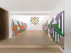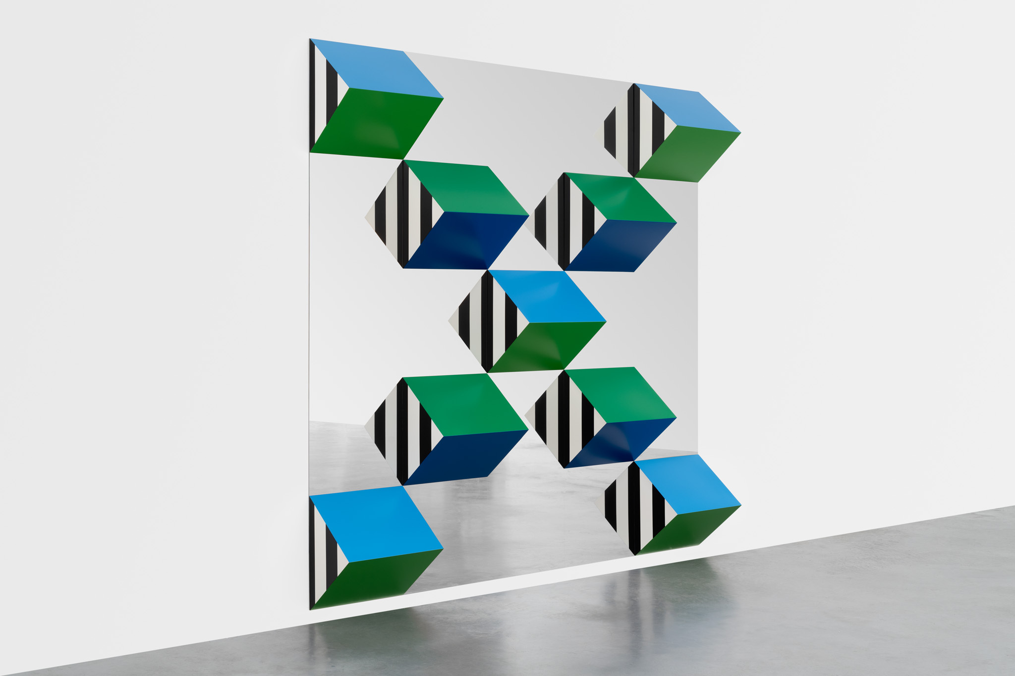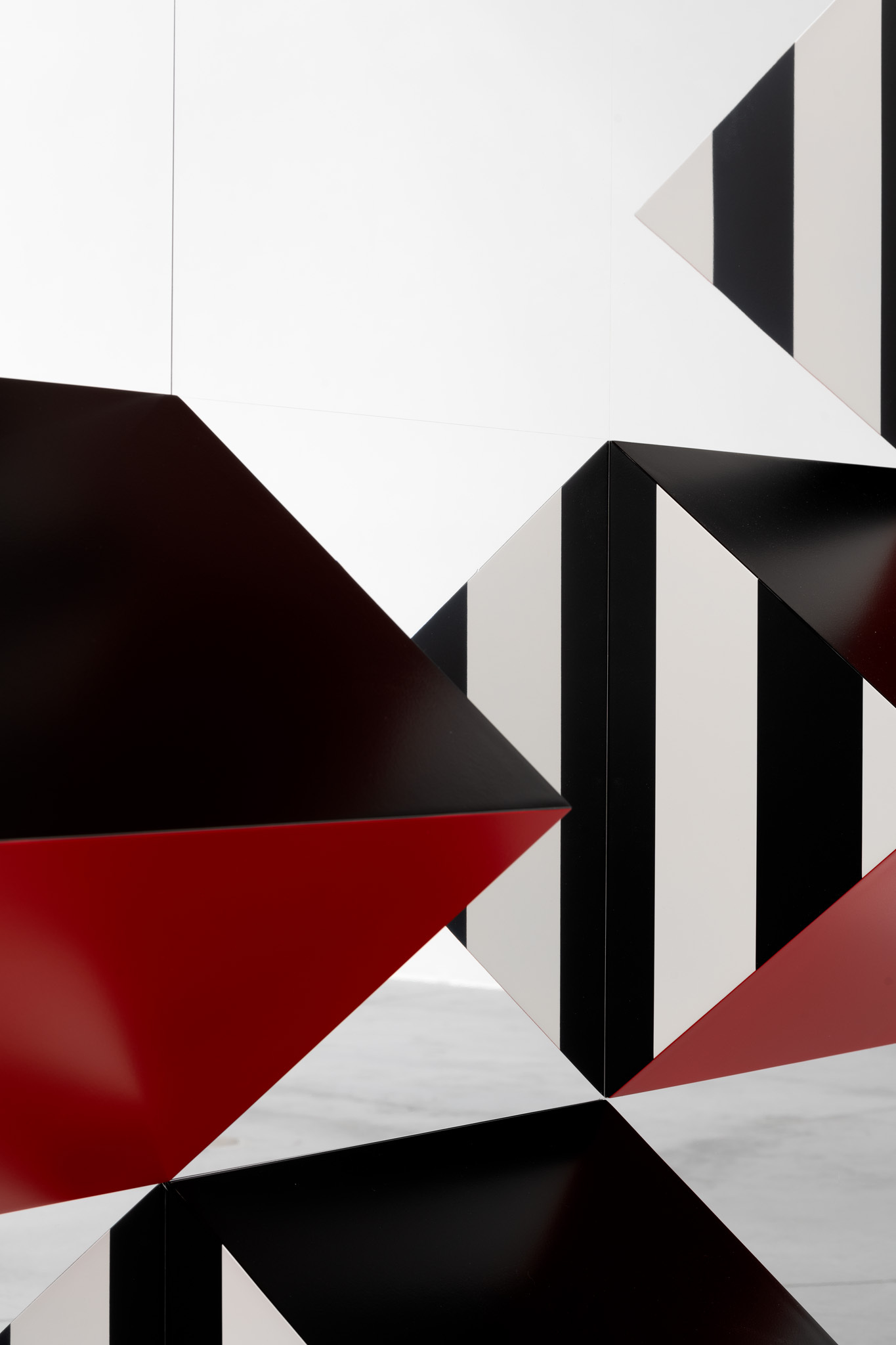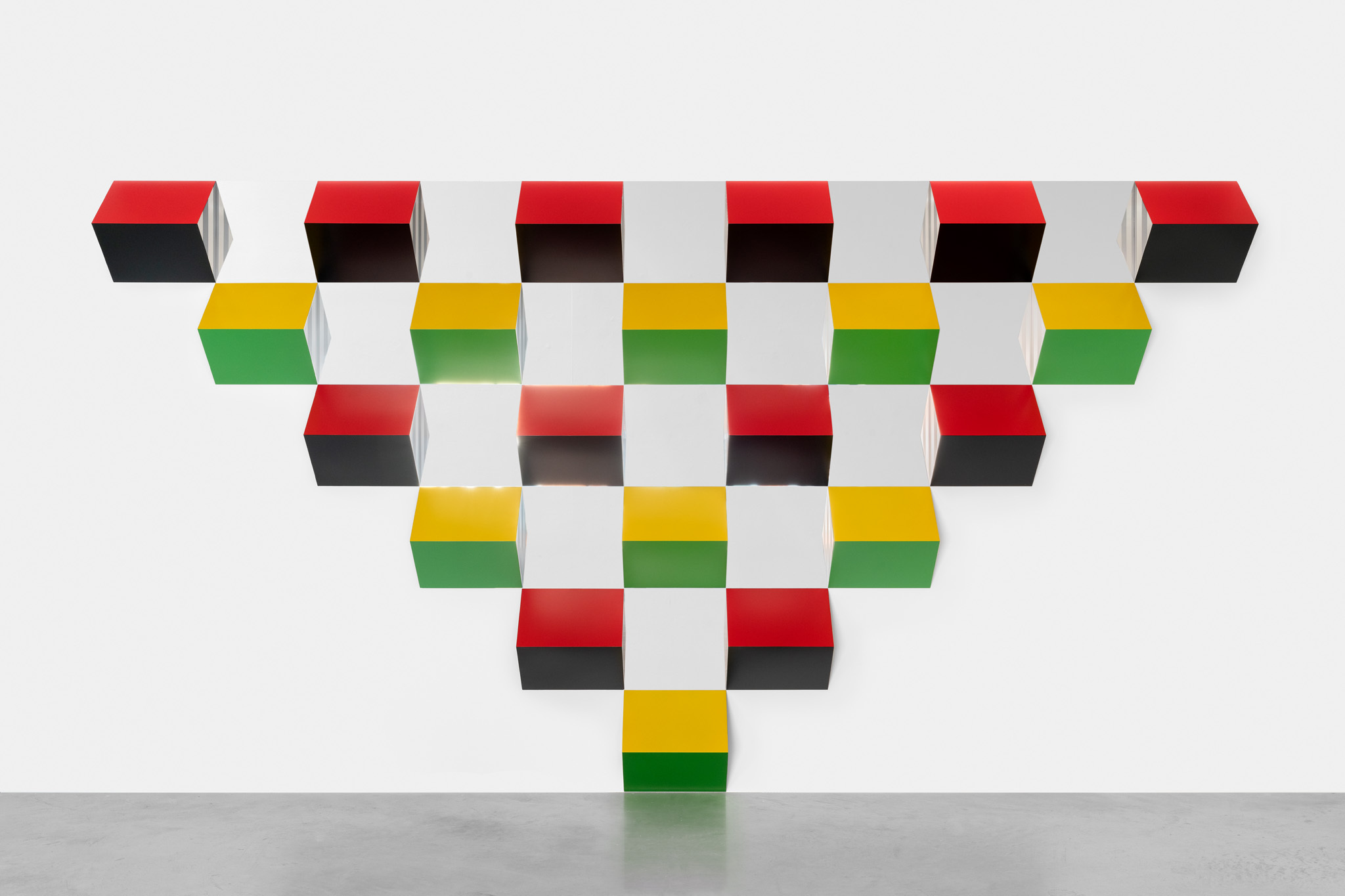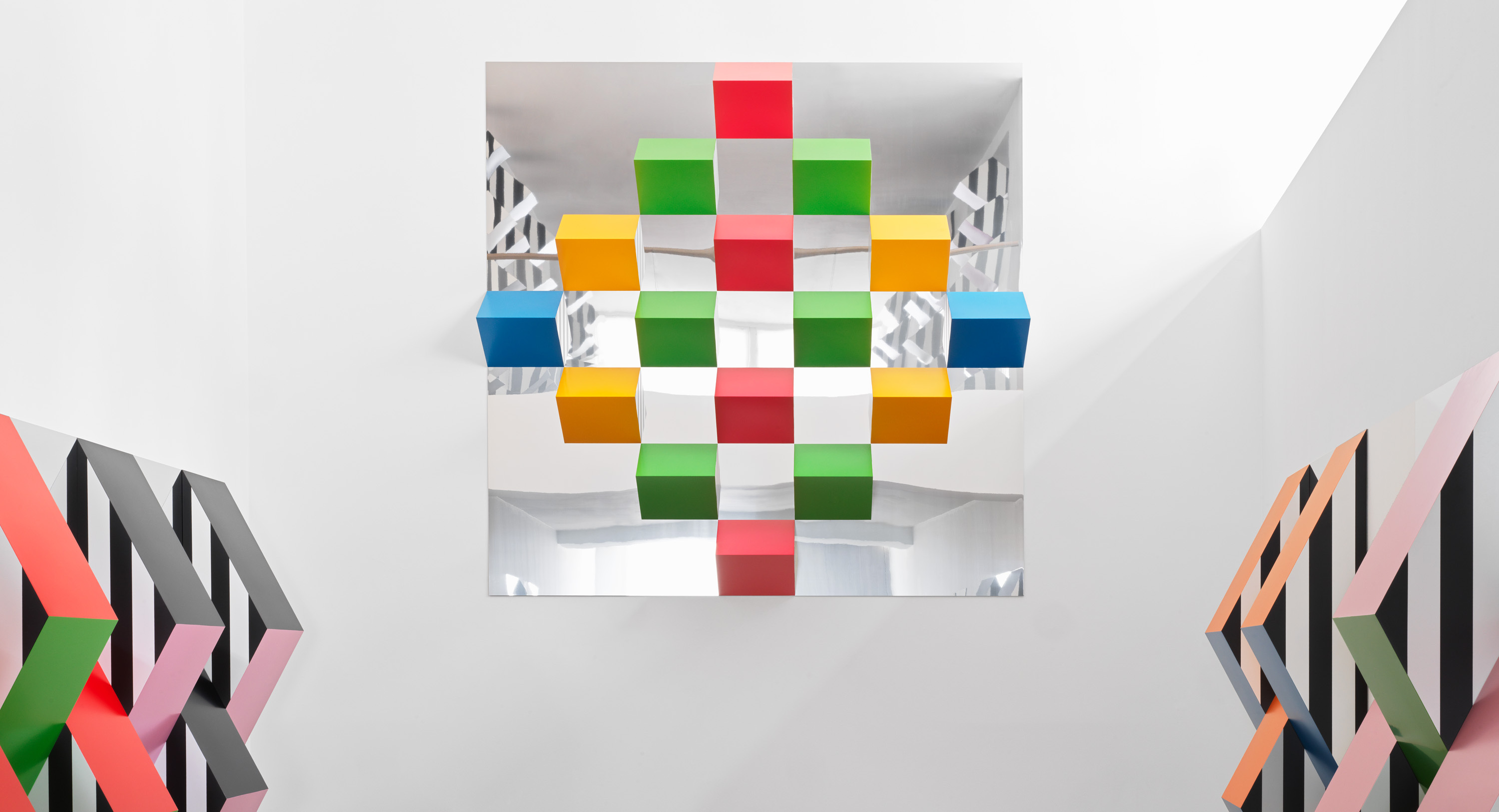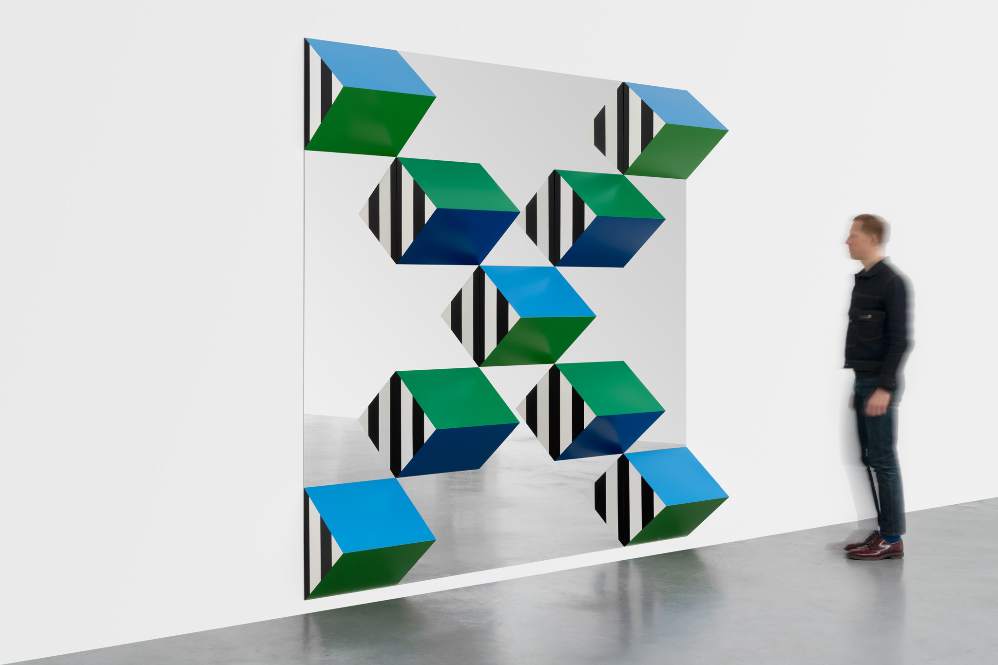 Géométries colorées is the first exhibition that Buren has conceived for the Rivoli space. This is important to note as it is not the artworks per se that are the subject of the exhibition but their relation with the space in which they are situated. And for the artist, this is both a physical reality i.e. the architecture (in this instance, the double-height void, clean contemporary lines and tight volumetrics) and a set of ever-changing conditions (light, atmosphere, people, even principles and ideologies). Buren’s high reliefs – dazzling three-dimensional assemblages of powder coated coloured aluminium, mirrors and the artist’s trademark stripes – can be seen as devices that both challenge and reveal the physical and intangible qualities of the site. The mirrored surfaces not only capture the surrounding space, which then becomes part of the artwork, but also reflect it back and forth from work to work, thus creating a doubling and redoubling effect, ad infinitum. For all their rigid geometry, systematic construction and use of ‘hard’ industrial materials, the reliefs are far from static: they are responsive, mutable and constantly changing according to the circumstances presented.