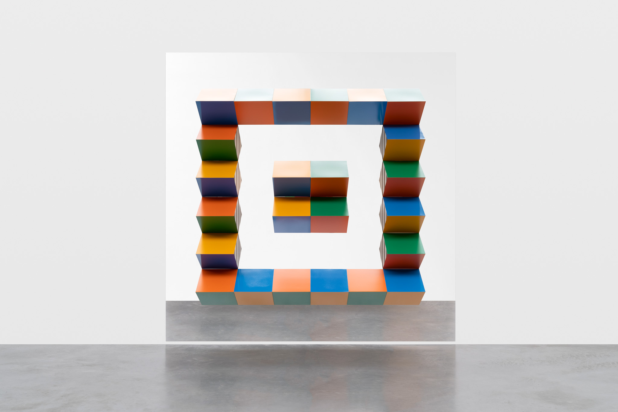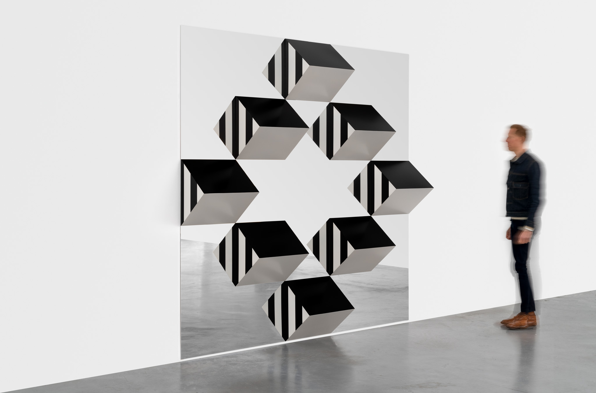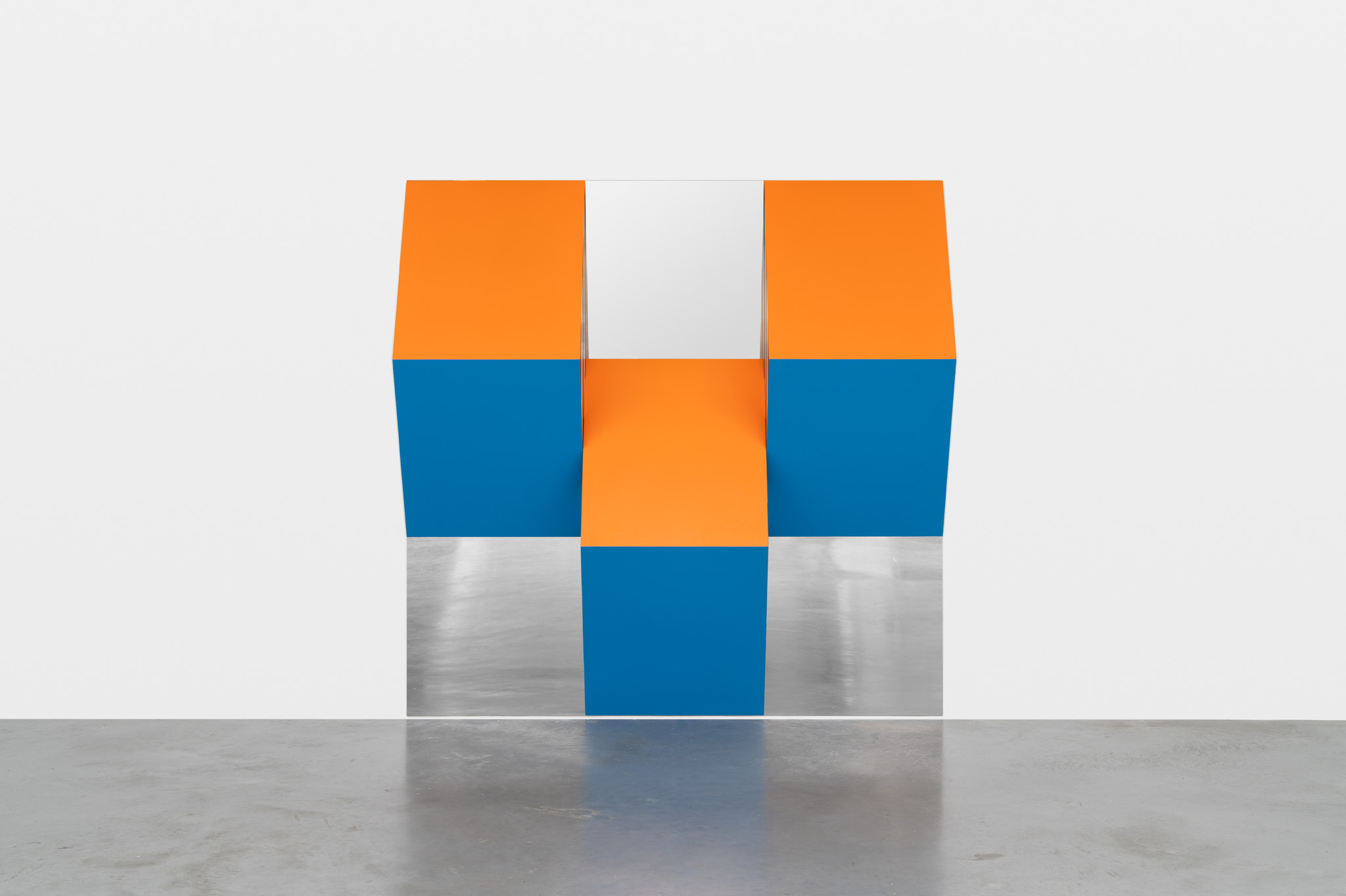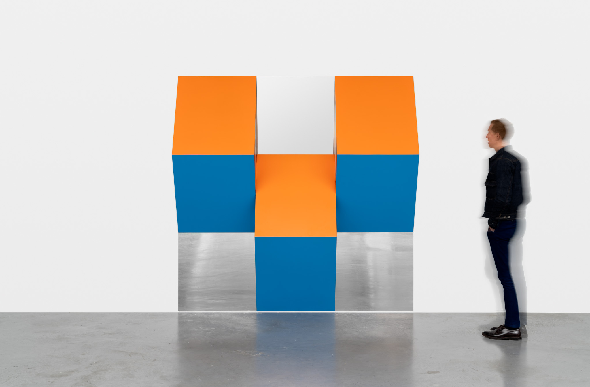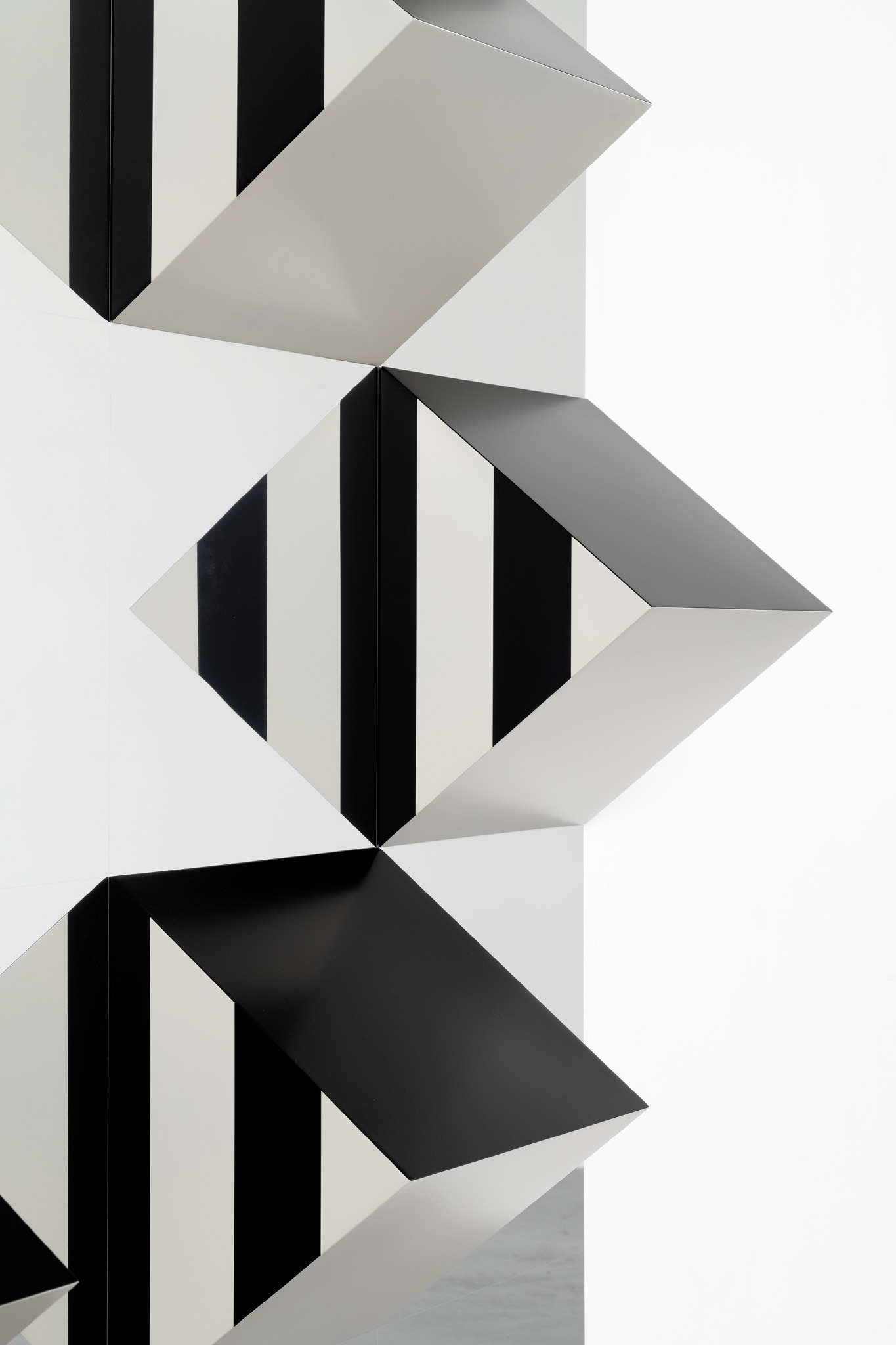 Géométries colorées is the first exhibition that Buren has conceived for the Rivoli space. This is important to note as it is not the artworks per se that are the subject of the exhibition but their relation with the space in which they are situated. And for the artist, this is both a physical reality i.e. the architecture (in this instance, the double-height void, clean contemporary lines and tight volumetrics) and a set of ever-changing conditions (light, atmosphere, people, even principles and ideologies). Buren’s high reliefs – dazzling three-dimensional assemblages of powder coated coloured aluminium, mirrors and the artist’s trademark stripes – can be seen as devices that both challenge and reveal the physical and intangible qualities of the site. The mirrored surfaces not only capture the surrounding space, which then becomes part of the artwork, but also reflect it back and forth from work to work, thus creating a doubling and redoubling effect, ad infinitum. For all their rigid geometry, systematic construction and use of ‘hard’ industrial materials, the reliefs are far from static: they are responsive, mutable and constantly changing according to the circumstances presented.