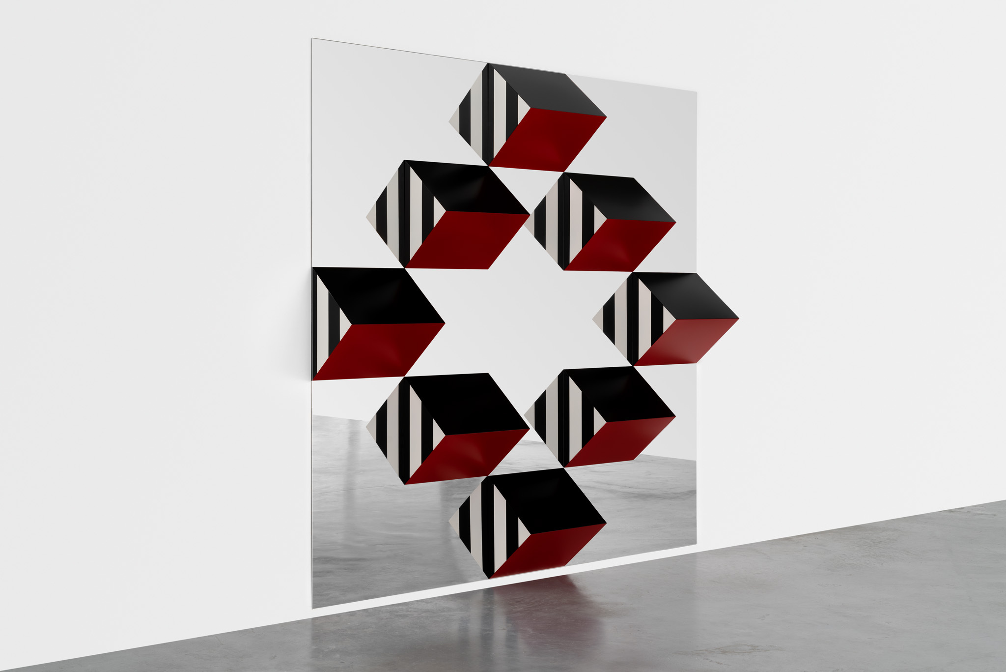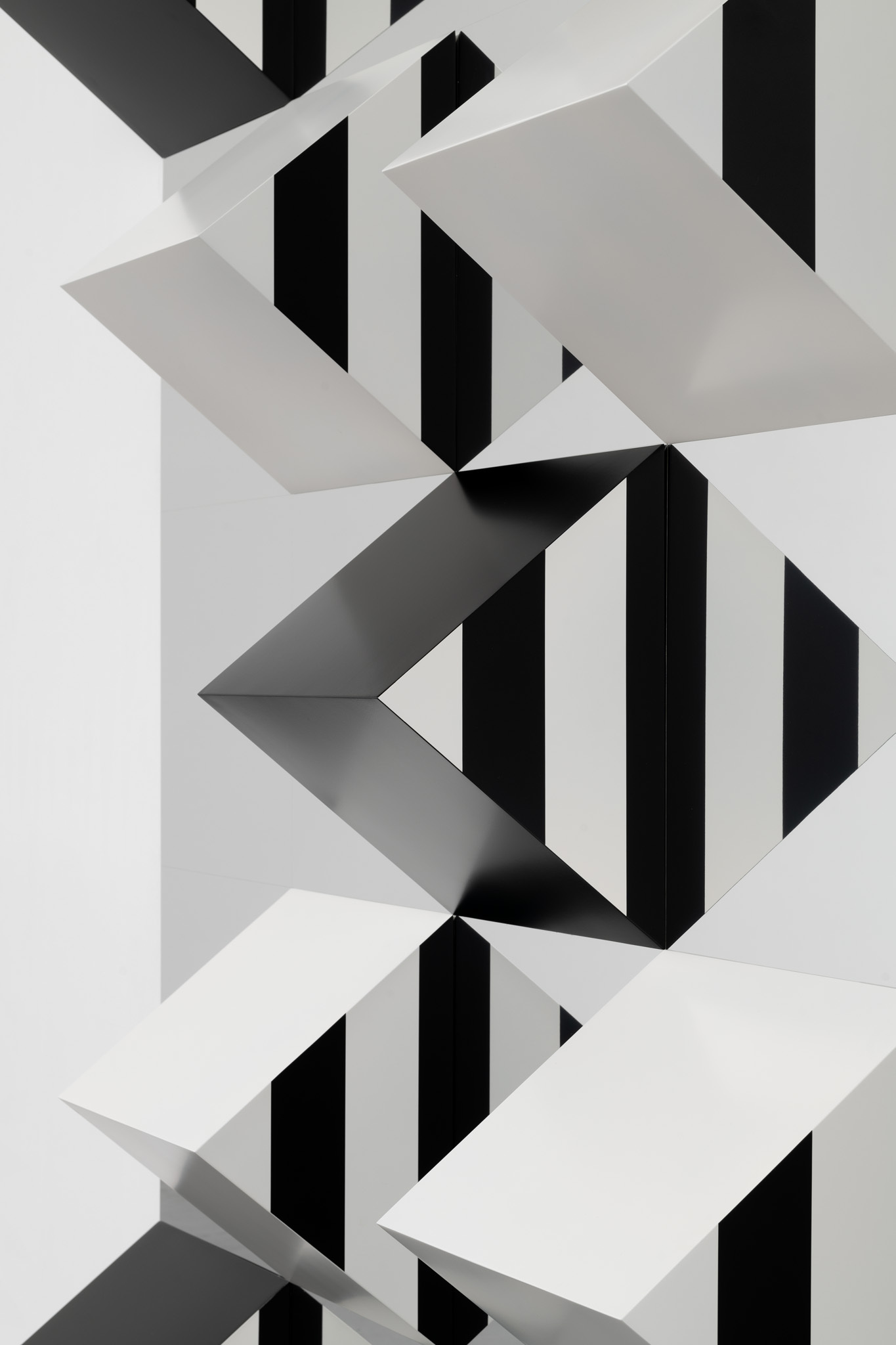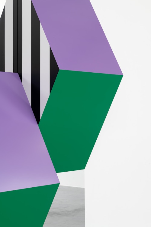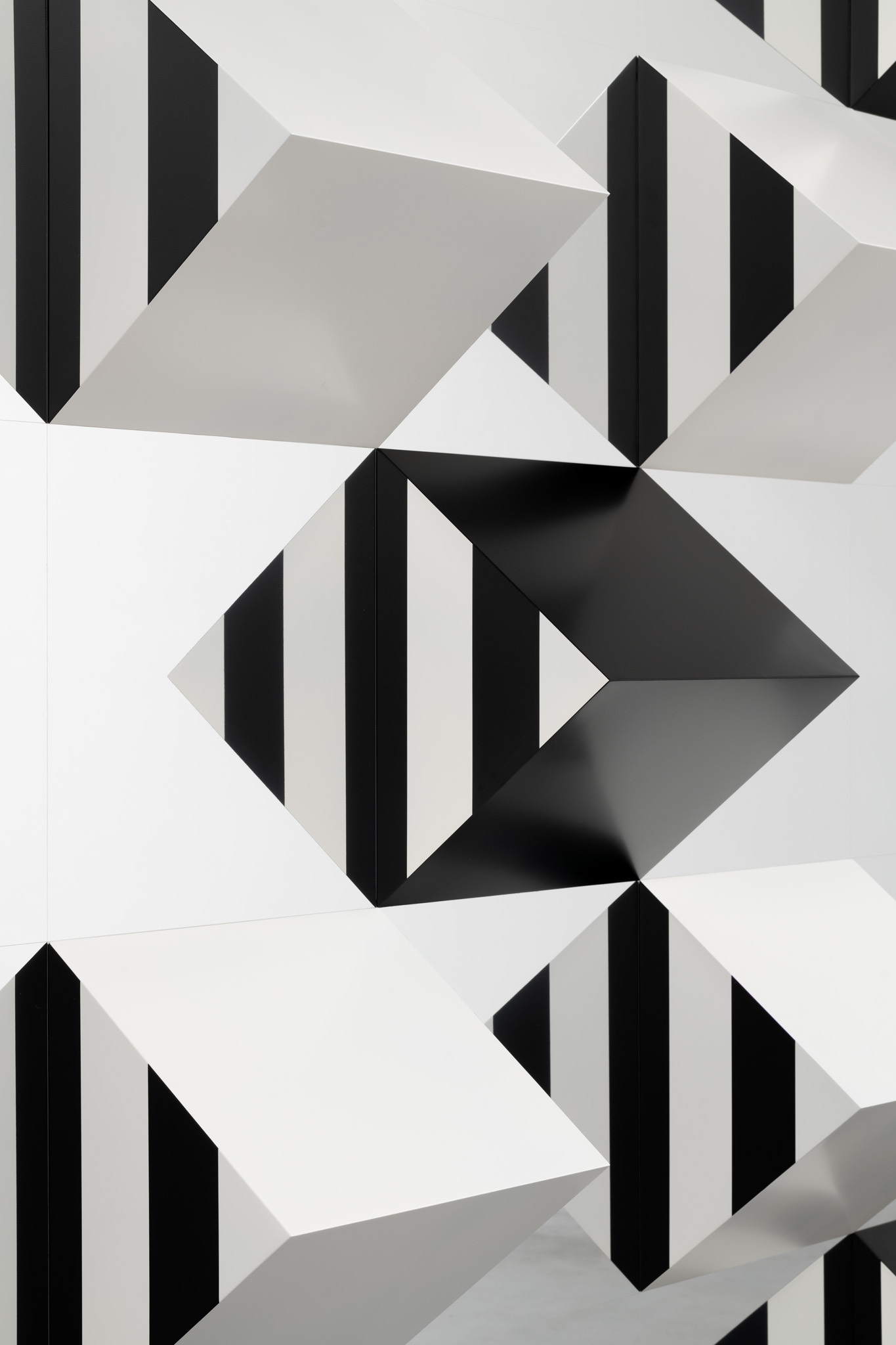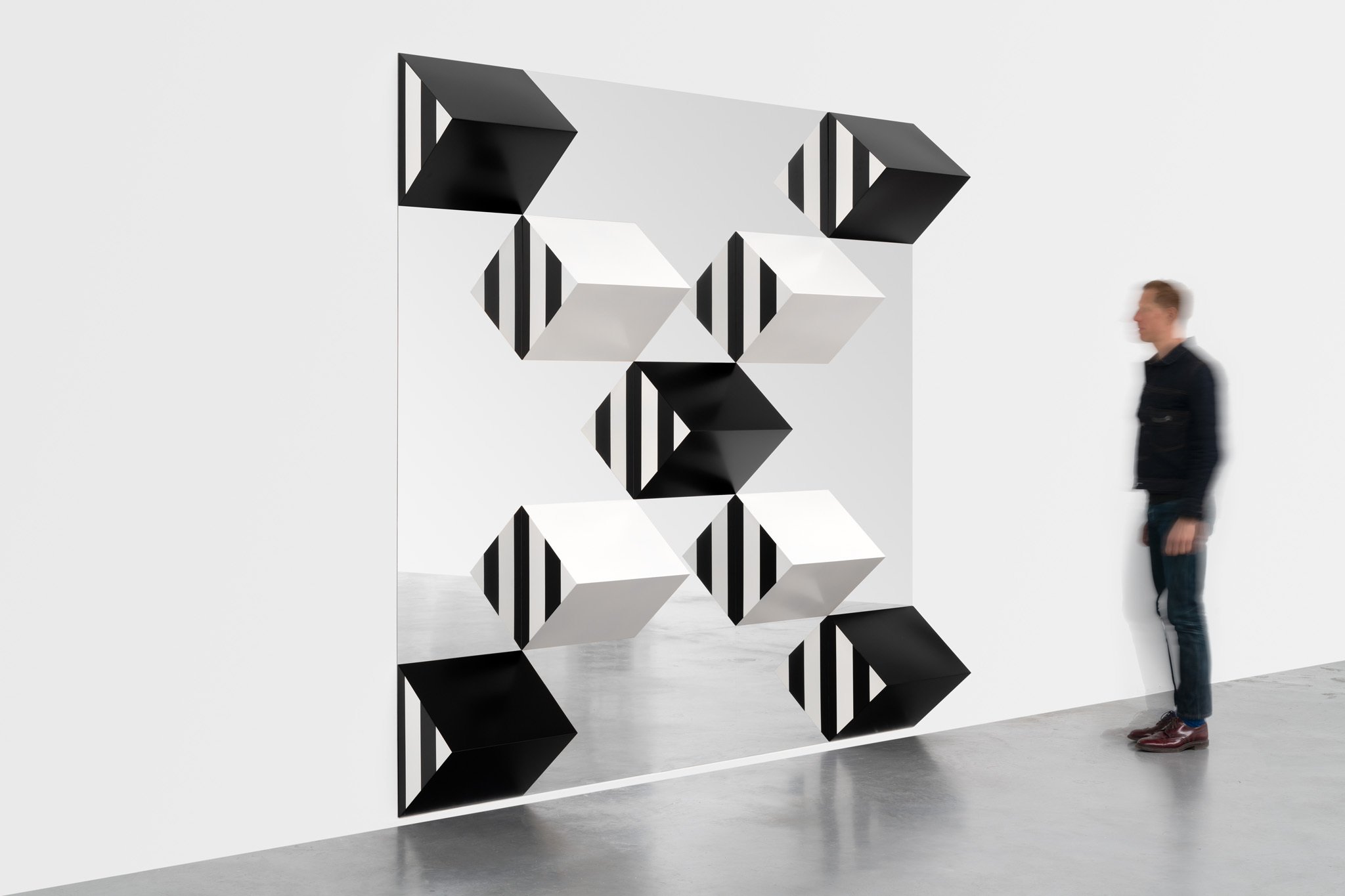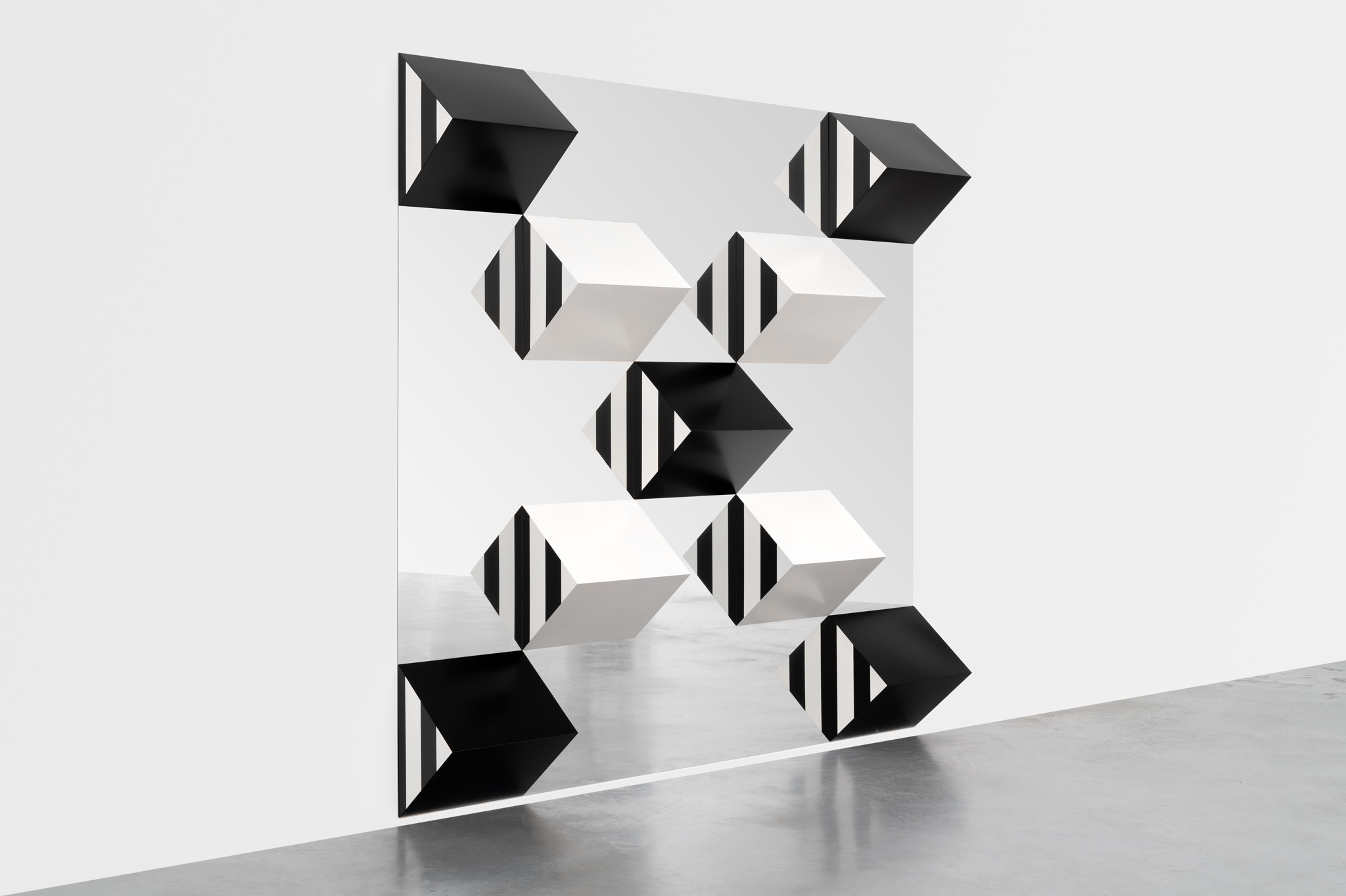 The stripes in the reliefs are the only stable element that Buren has used in his work since 1965. This pattern, which the artist describes as his ‘visual tool’ [outil visuel], consists of a series of alternating white and coloured stripes that measure precisely 8.7 cm. The scale is derived from the width of the stripes on the first linen fabric he found as a young artist in Paris. Since then, they have been used in artworks and installations all over the world, both permanent and temporary. But like the mirrors, the stripes are not the overarching raison d’être of the work. Rather, they are a visual reference point, or touchstone, that allows space to be measured, especially by the artist, purely by eye. Here too, the aim is a form of spatial disclosure. In relation to this, the artist has said: “I don’t show stripes, they allow me to show things. What happens around them? How does the work influence its environment? …If you see them as a painting, you’re on the wrong track. They are meant to challenge the idea of a frozen point of view.”