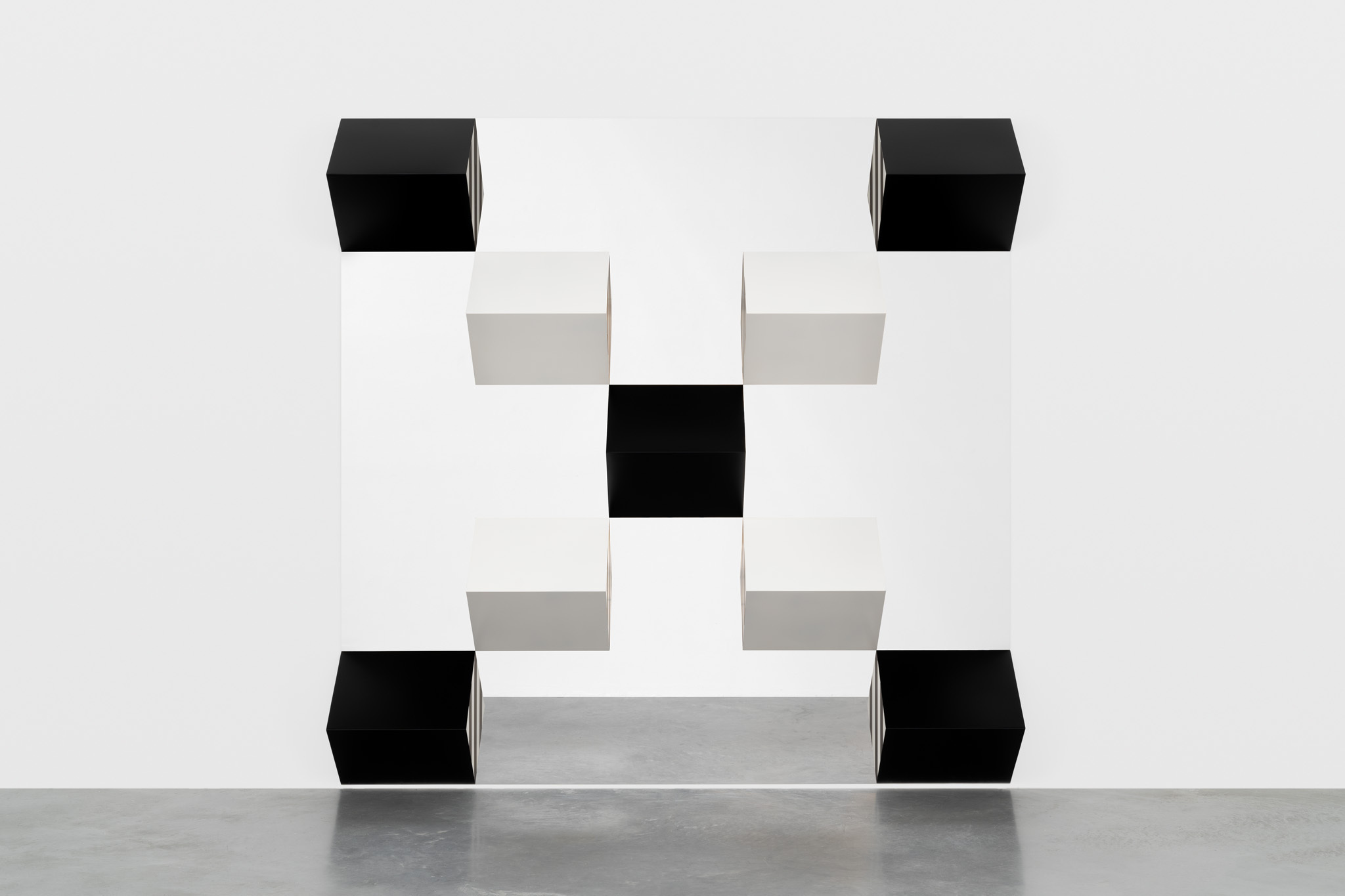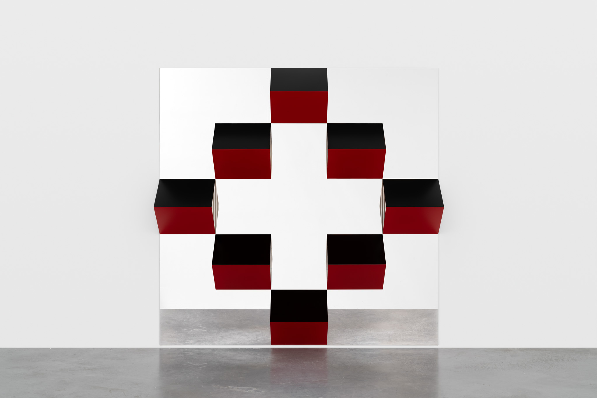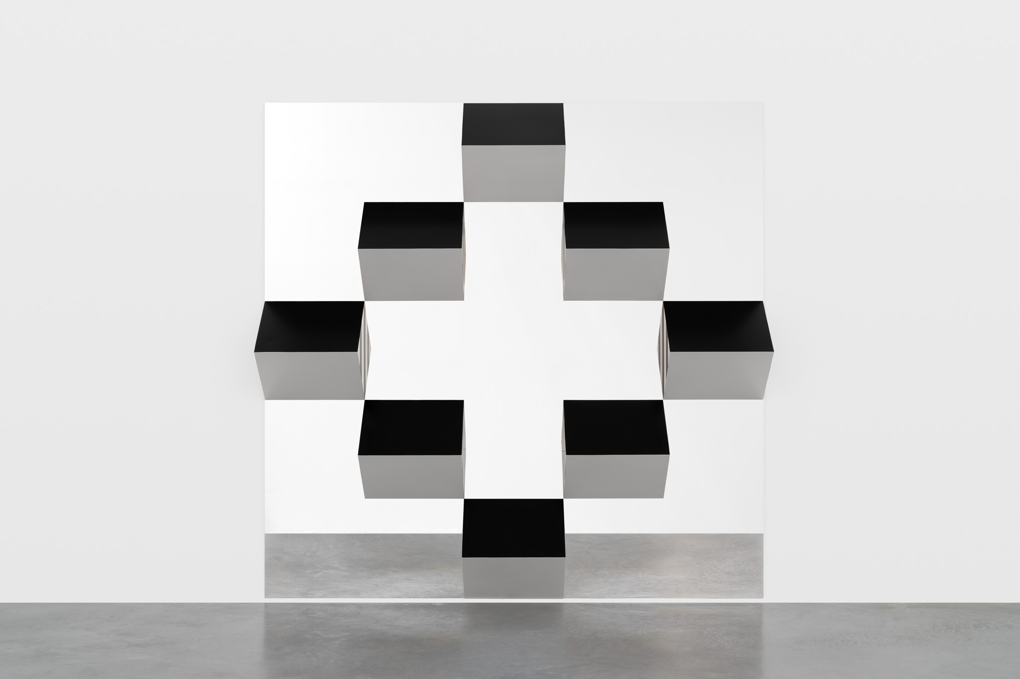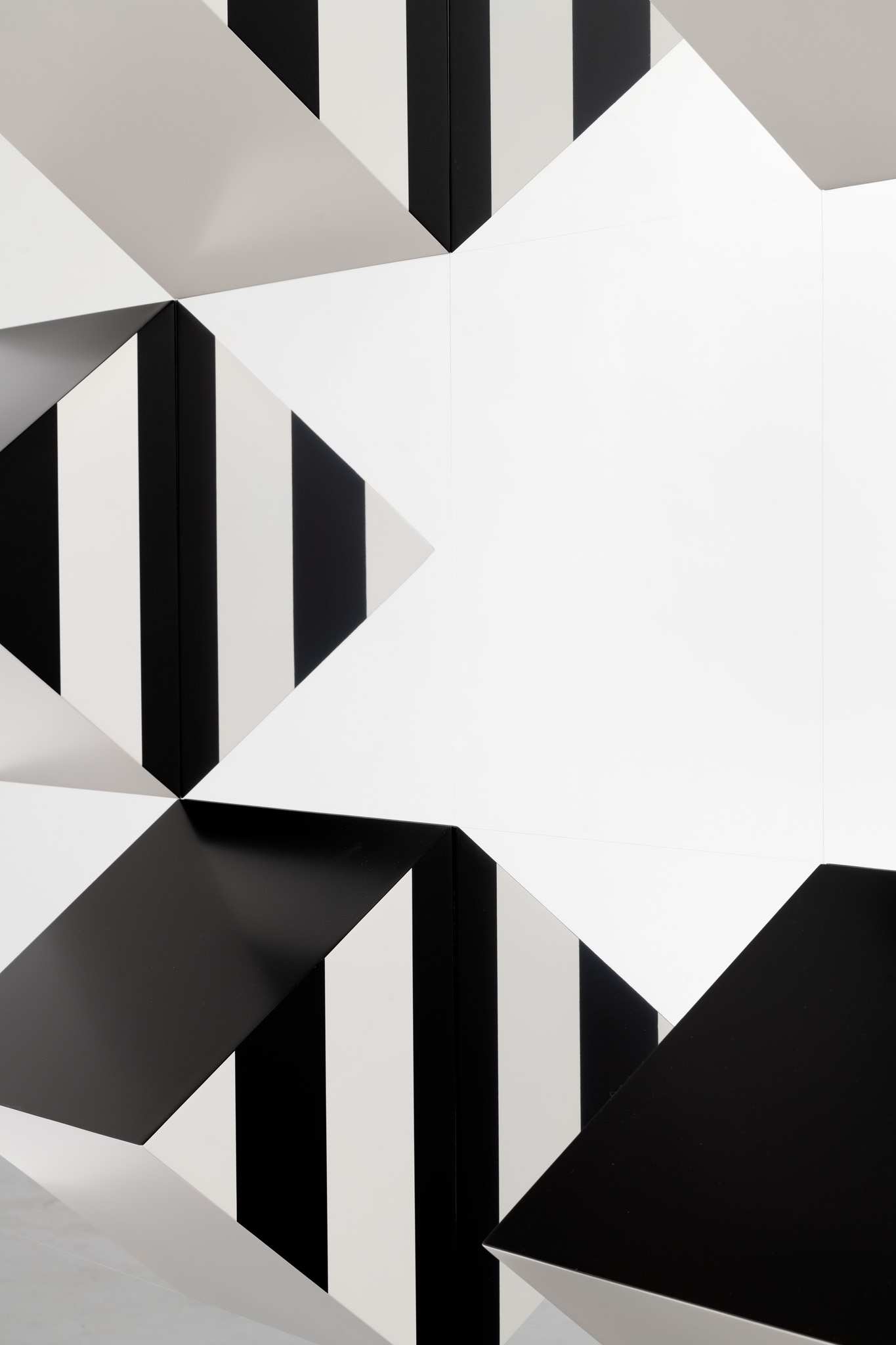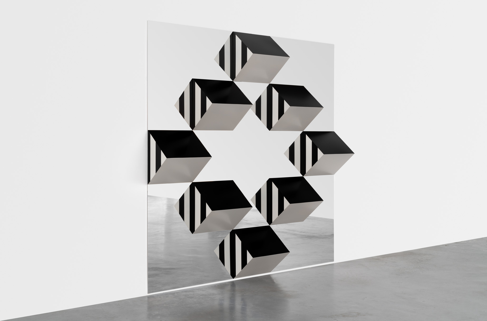 The stripes in the reliefs are the only stable element that Buren has used in his work since 1965. This pattern, which the artist describes as his ‘visual tool’ [outil visuel], consists of a series of alternating white and coloured stripes that measure precisely 8.7 cm. The scale is derived from the width of the stripes on the first linen fabric he found as a young artist in Paris. Since then, they have been used in artworks and installations all over the world, both permanent and temporary. But like the mirrors, the stripes are not the overarching raison d’être of the work. Rather, they are a visual reference point, or touchstone, that allows space to be measured, especially by the artist, purely by eye. Here too, the aim is a form of spatial disclosure. In relation to this, the artist has said: “I don’t show stripes, they allow me to show things. What happens around them? How does the work influence its environment? …If you see them as a painting, you’re on the wrong track. They are meant to challenge the idea of a frozen point of view.”