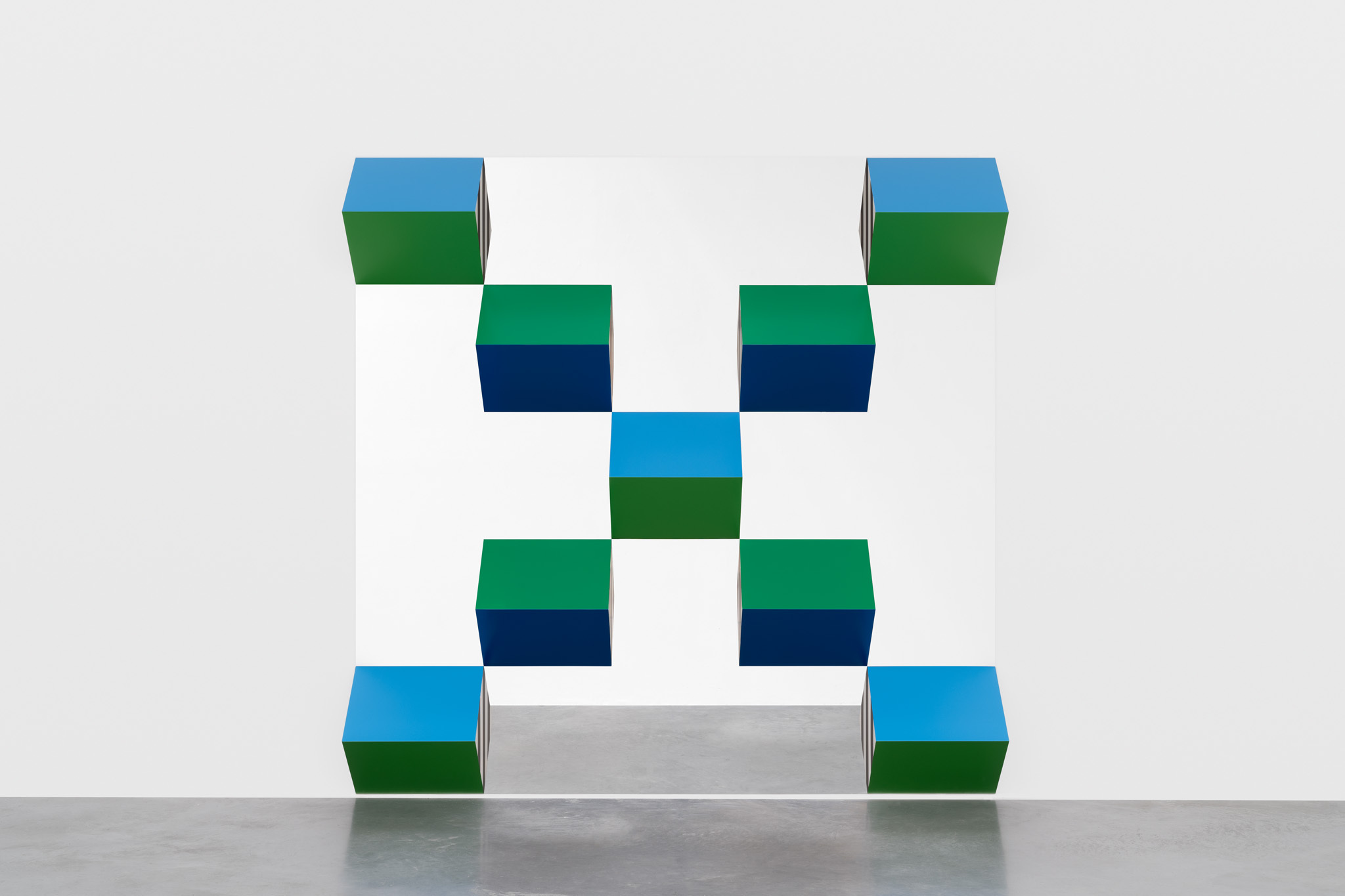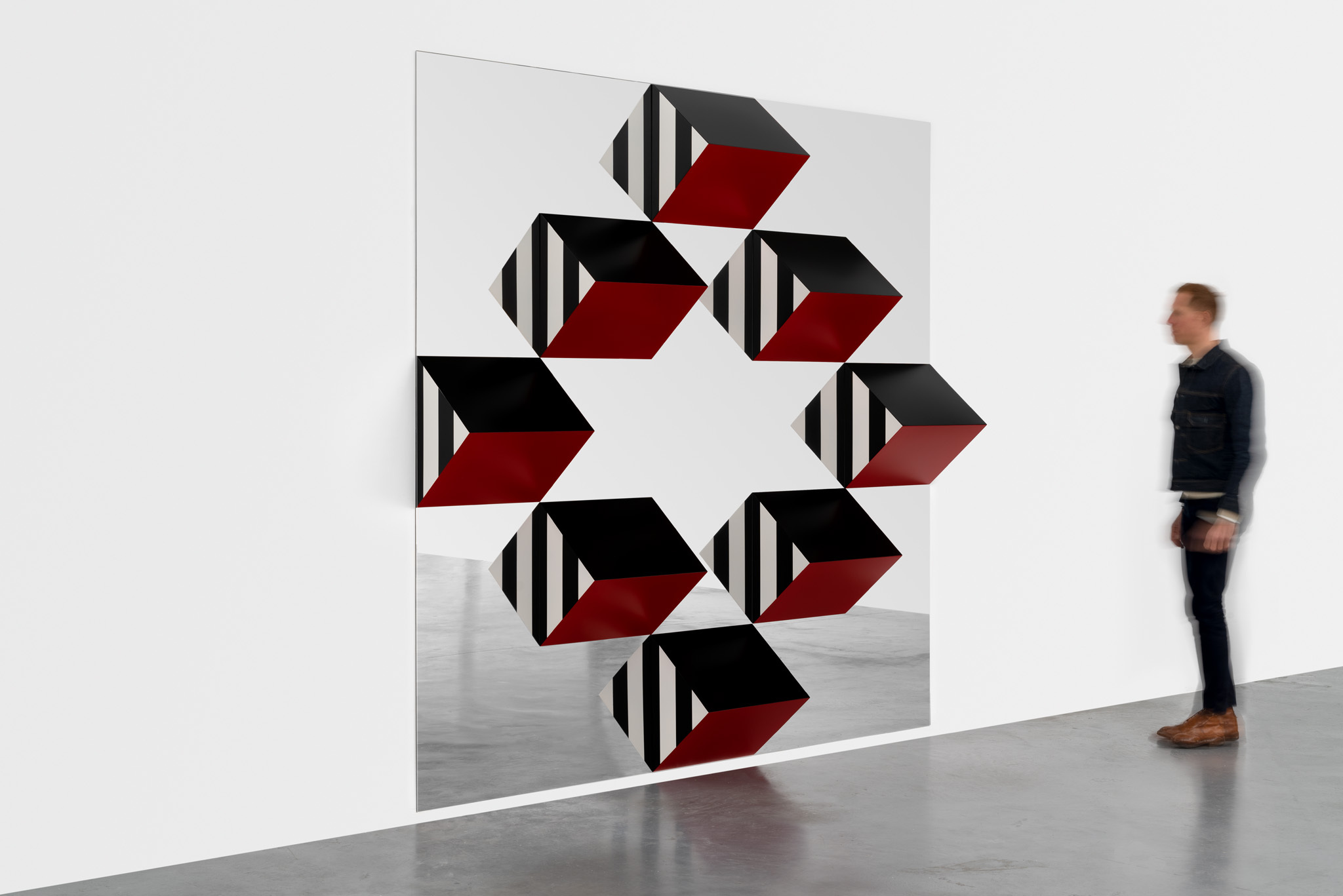 The notion of a ‘frozen point of view’ is a reference to the viewer’s physical position as well as their thought processes, both of which can be fixed or mobile. The shifting nature of the high reliefs is an encouragement to move around the space and to engage with works from various perspectives. The viewer’s reflected form also appears in the works and, in so doing, becomes a dynamic part of the visual experience. Here, colour plays a pivotal role and is used to potentially emotive effect. Colour has long fascinated Buren, who says: “Ever since I first started out, colour has been one of the things that have interested me the most and that I’ve tried to approach in a new way… colours carry thousands of implied meanings that escape the artist. If there’s one thing that’s hugely subjective, it’s colour. It affects each person in wholly different ways. I think it’s important to show that the effect of colour does not depend on an individual artist’s intention, but rather on the fact that it’s recreated by the eye of the observer.”