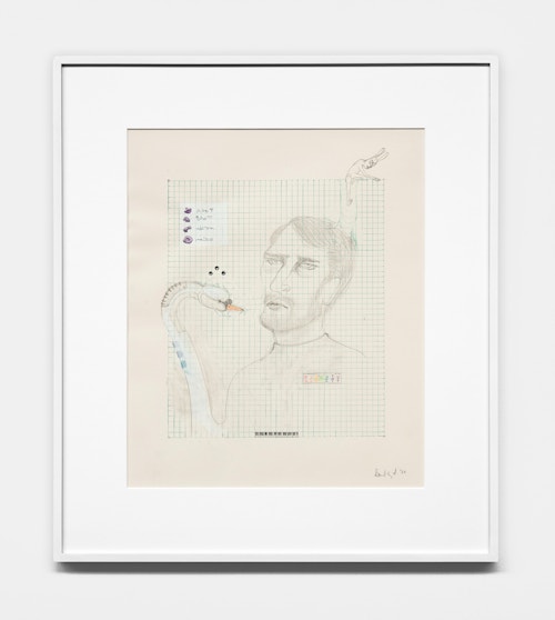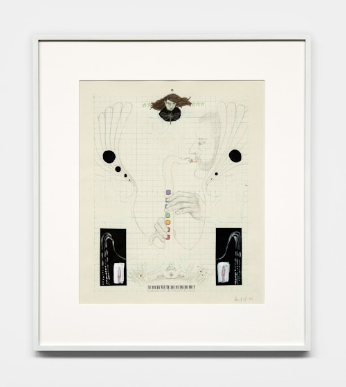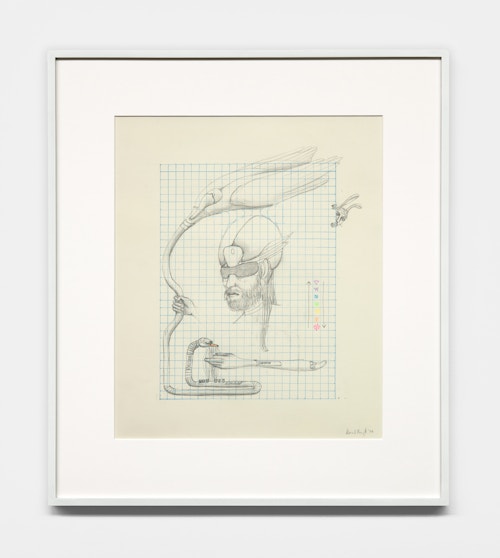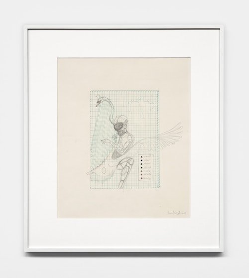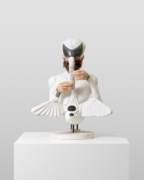 Among the variety of animals Altmejd explores, swans take centre stage in his new body of work. The swans have metamorphosised into musical instruments, through which the artist draws parallels between nature and music, highlighting their shared qualities of order and disorder. The seven colours of the instrument’s keys here are not coincidental, symbolising various references across different eras and cultures¹. In numerology, seven represents the union of the spiritual (3) and material (4) worlds, while in music, there are seven notes in a musical scale. Conversely, the figures playing swan instruments wear helmets that conceal their vision, suggesting a sense of detachment from their surroundings. The idea that they might hail from another dimension is further supported by the presence of space-time grids in the artist’s drawings. It is also worth noting that, human eyes— which Altmejd once emphasised or even replicated—have now vanished, along with any reference to the artist himself. In these new works, the focus moves from self- portraiture to visored beings.