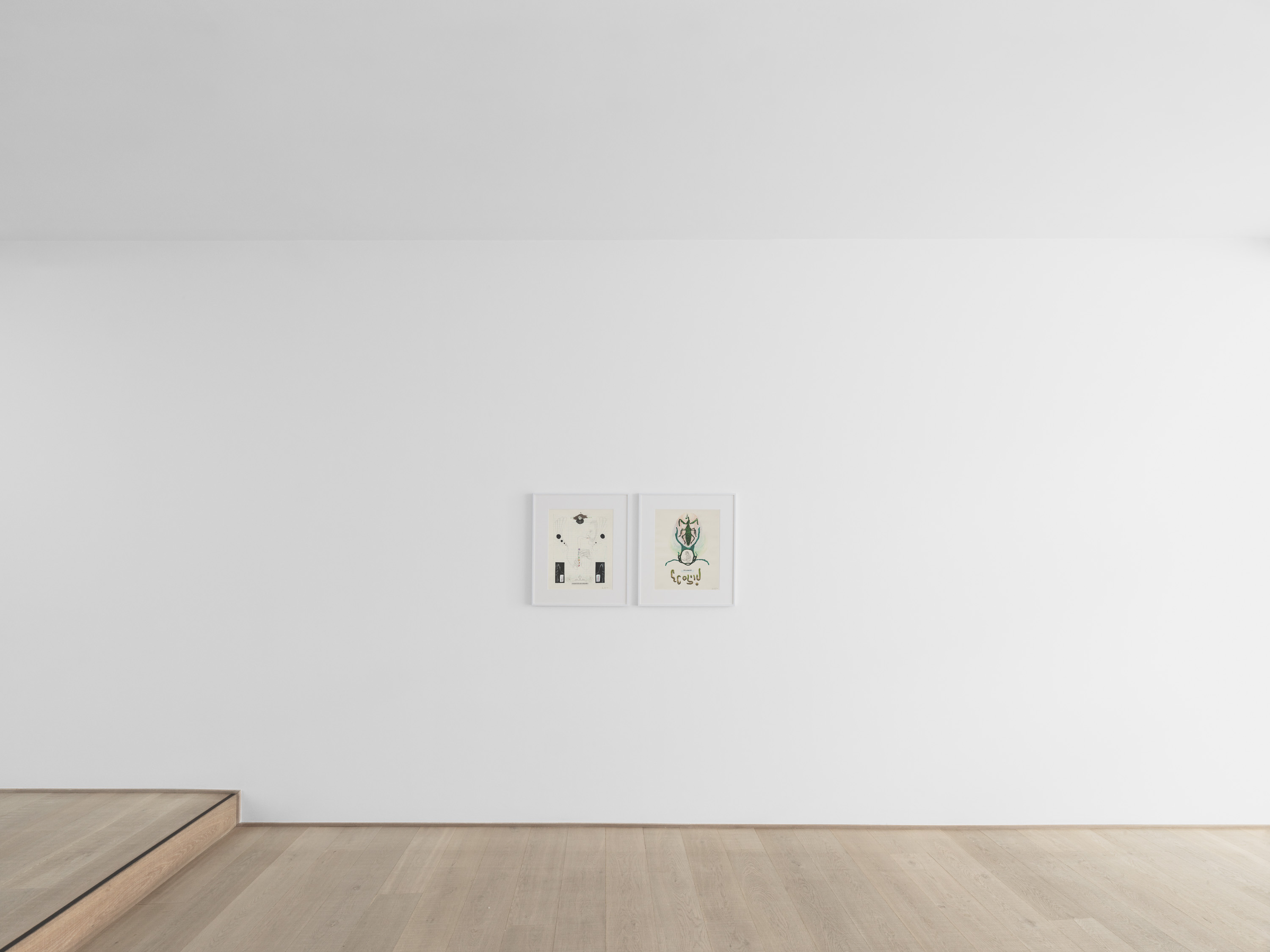These themes are reflected in the artist’s mixed-media drawings, which are neither preparatory studies nor working sketches. The matrixes reference space-time grid distortions and the theory of special relativity, while also invoking, in another sense, the transfer techniques of classical sculpture. But by virtue of being hand- drawn, the grids are imperfect. At times, they are punctured, caught in a vortex or distorted, creating glitches in the space-time continuum. The images in the drawings are fantastical and uncanny, arcane and vivid. Cryptic, undecipherable symbols represent the ‘language of the unconscious’.