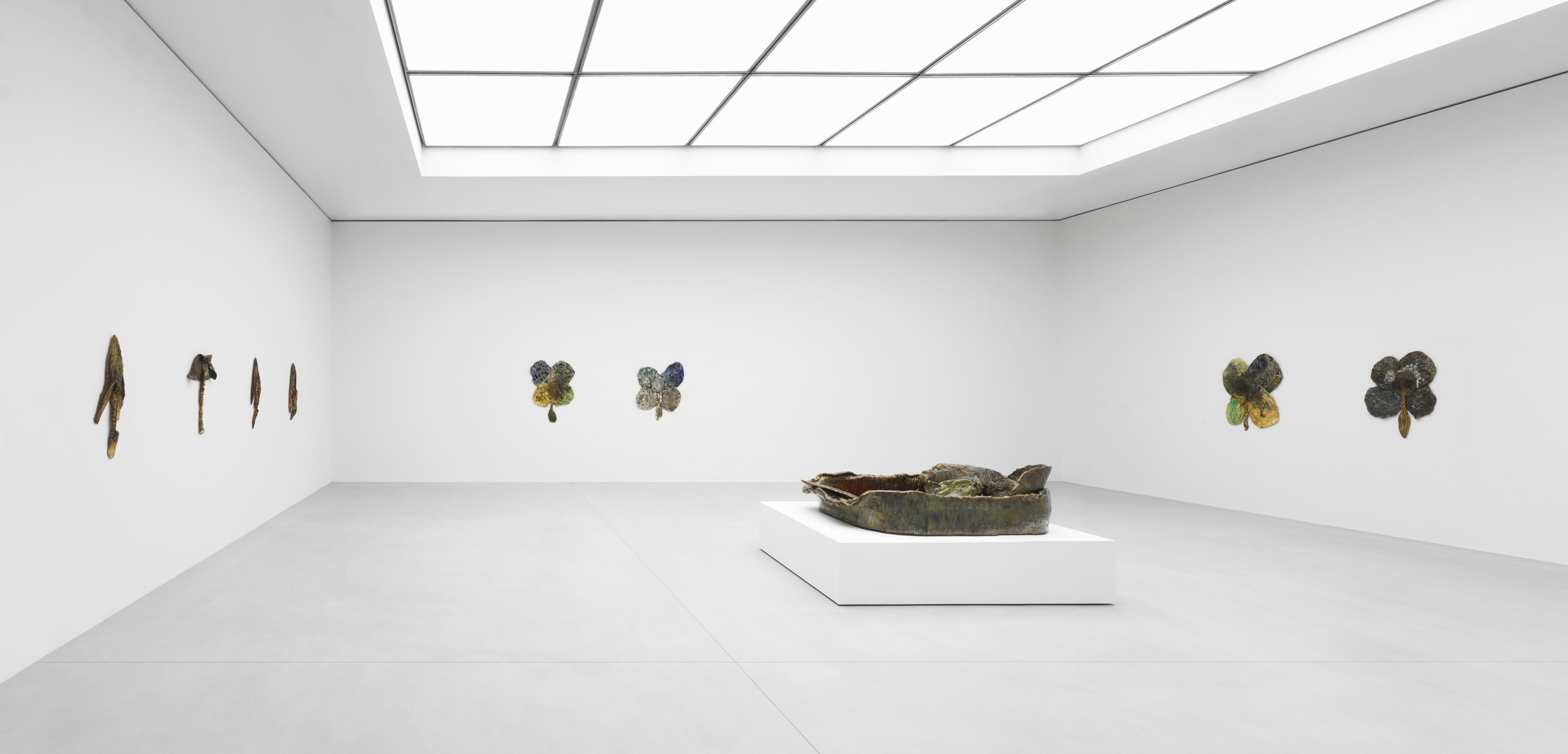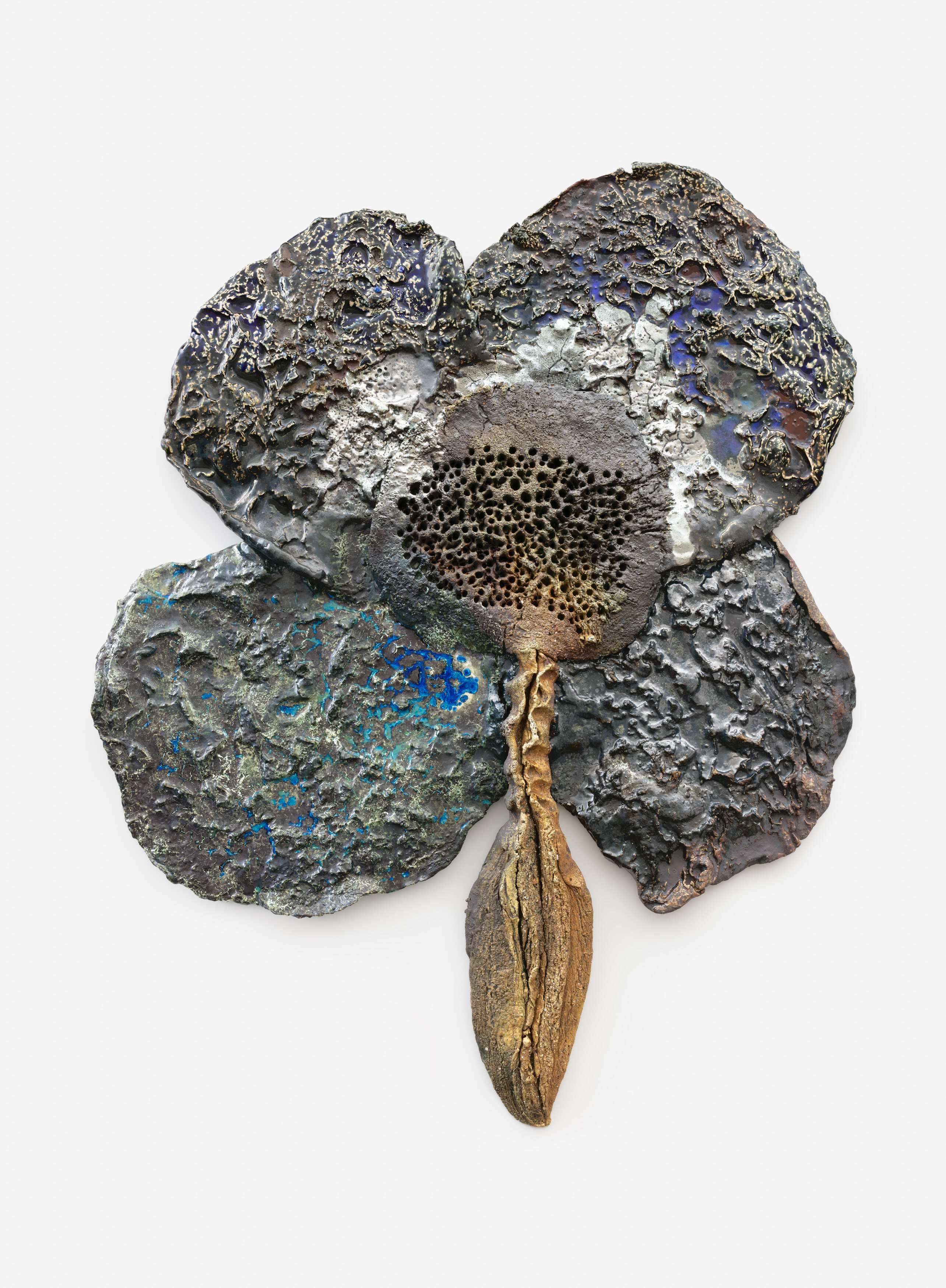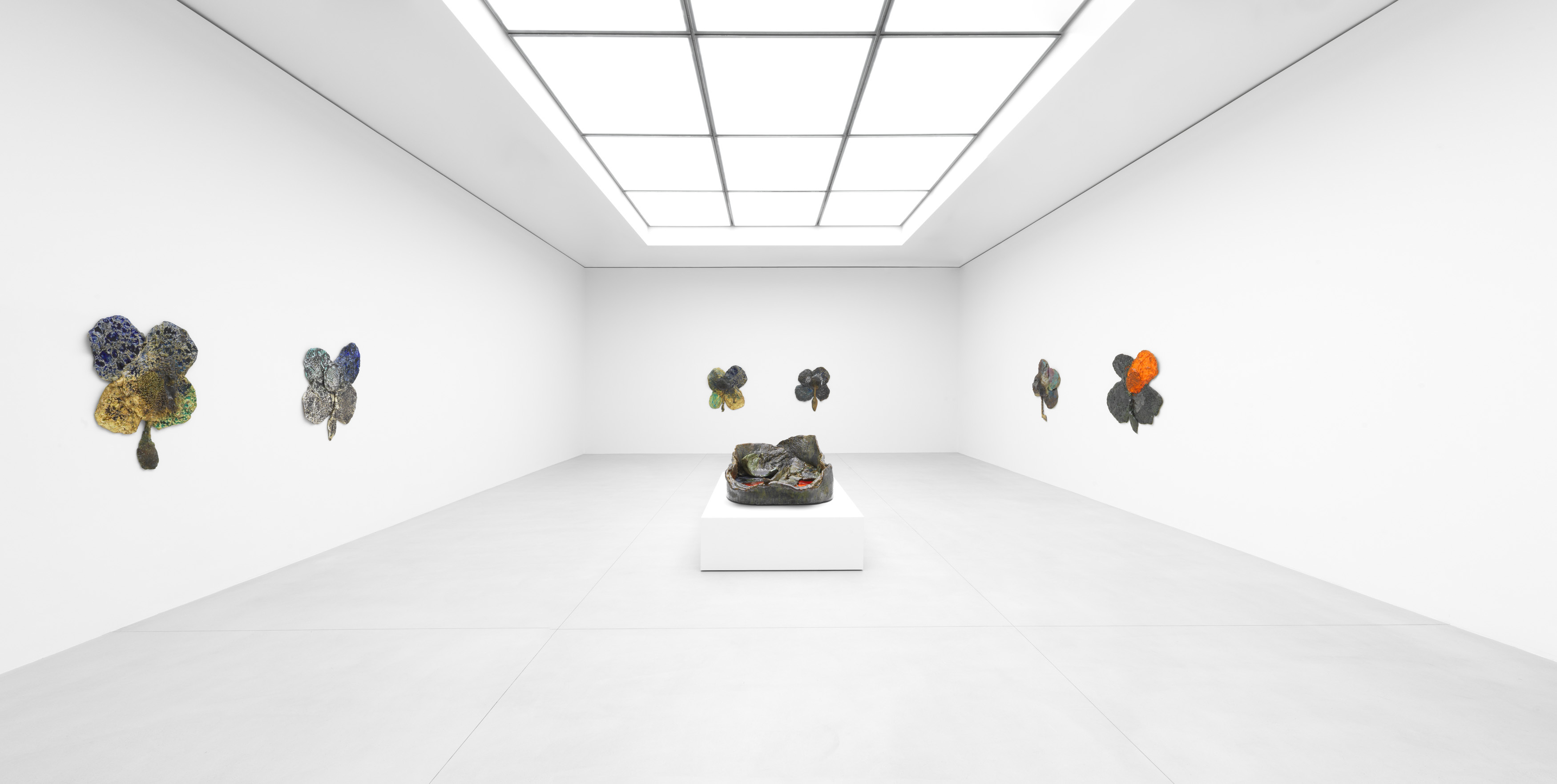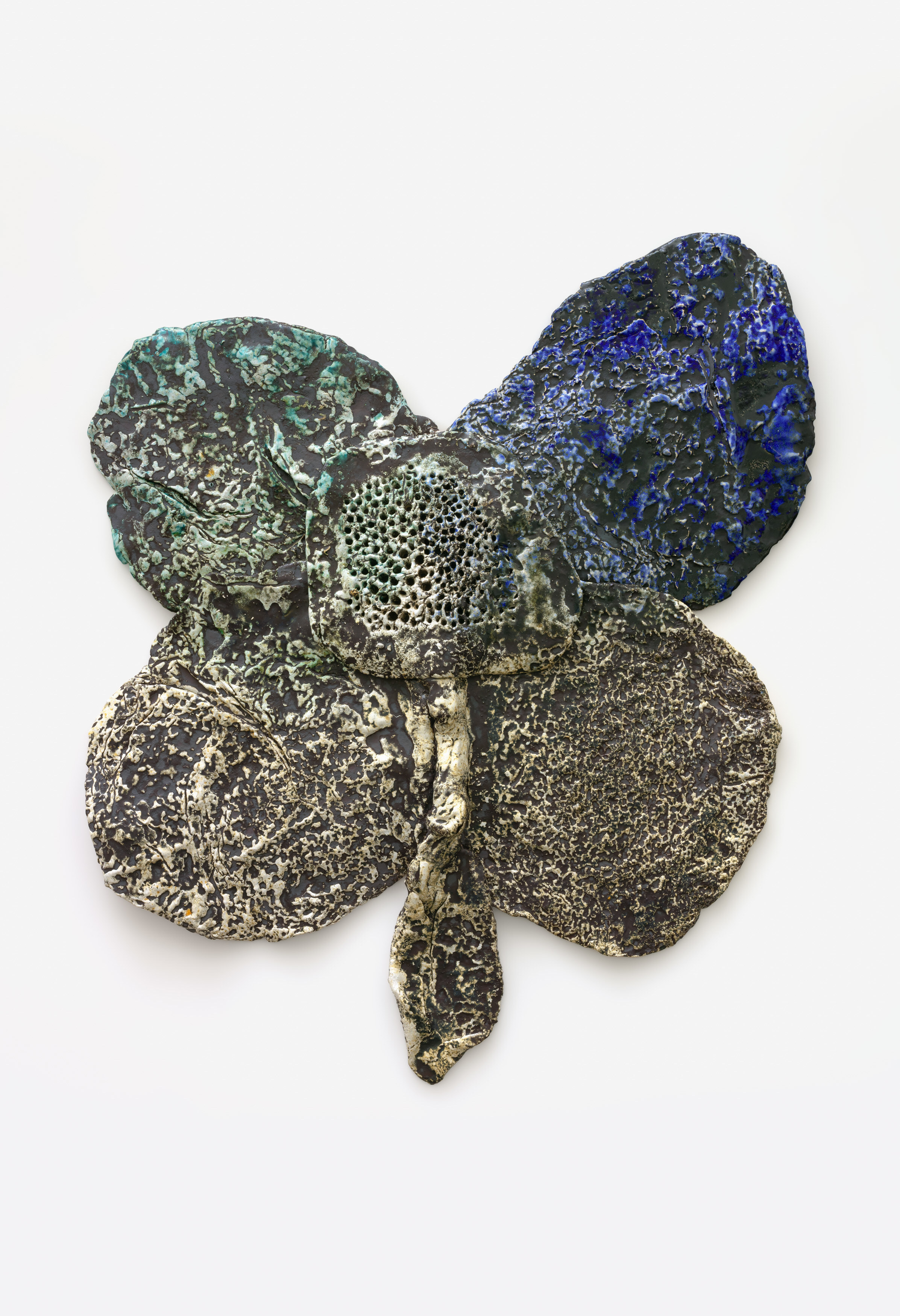 In his recent ceramics, Ruby continues his exploration of the four-petalled flower motif, or quatrefoil. This archetypal image has multiple spiritual and heraldic connotations, including an association with the four cardinal winds. Ruby has also made a visceral series of ‘flowers’ with lobe-like ‘petals’, and articulated stems that resemble vertebrae. With their gnarled and pockmarked surfaces, and their similarity to arrowheads, they resemble archaeological finds from a post-apocalyptic age. Lucio Fontana’s ceramic crucifixes, in which form and matter dissolve through the pressings and mouldings of the artist’s hands, were a reference point when making these works. Ruby has worked the clay just as intensely, pounding it in the open air so that it gathers traces, both positive and negative, of the world outside the studio. Like excavations or aerial views of ravaged landscapes, they follow on from the shattered topographies of the artist’s Basin Theology series.