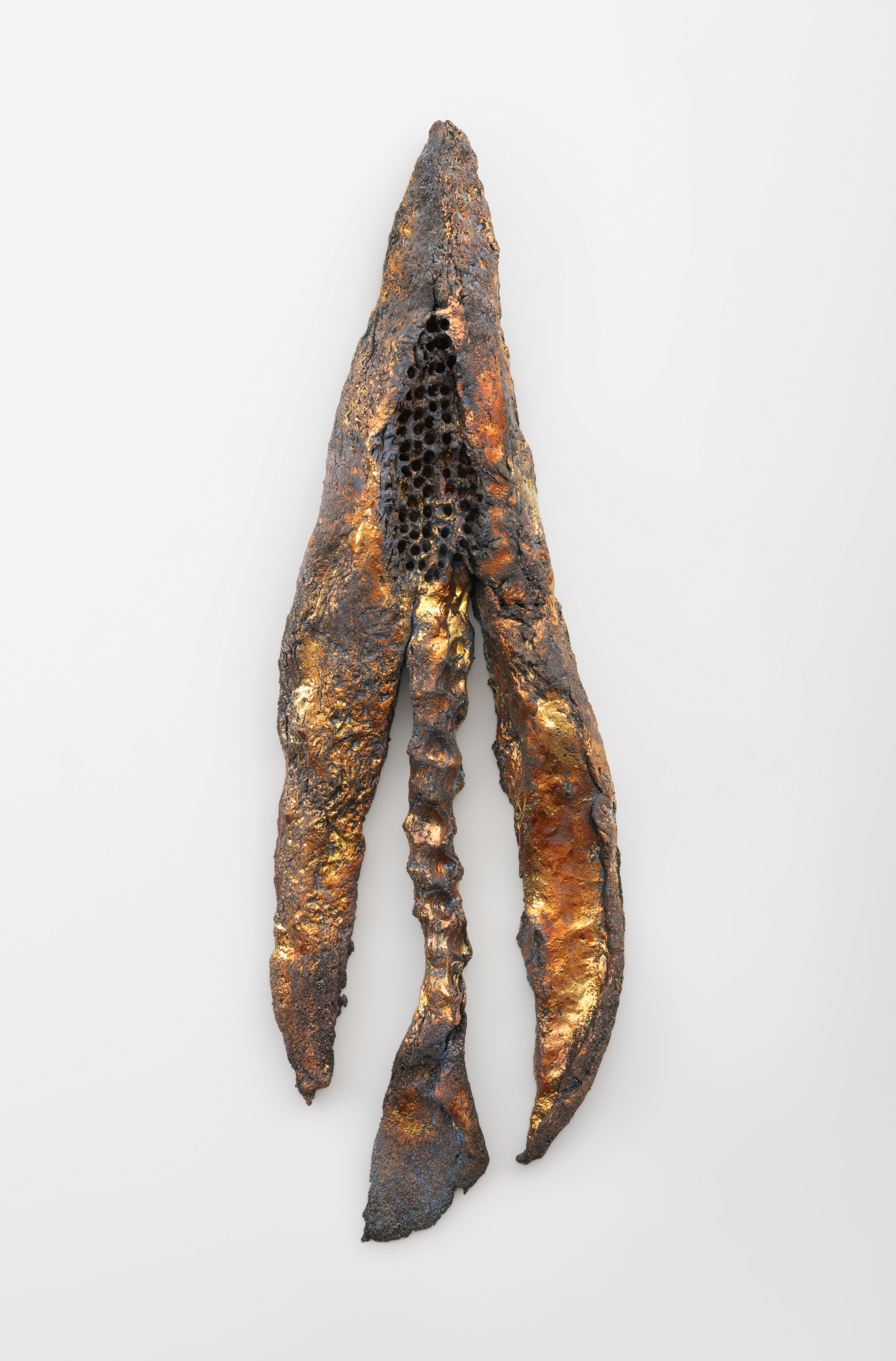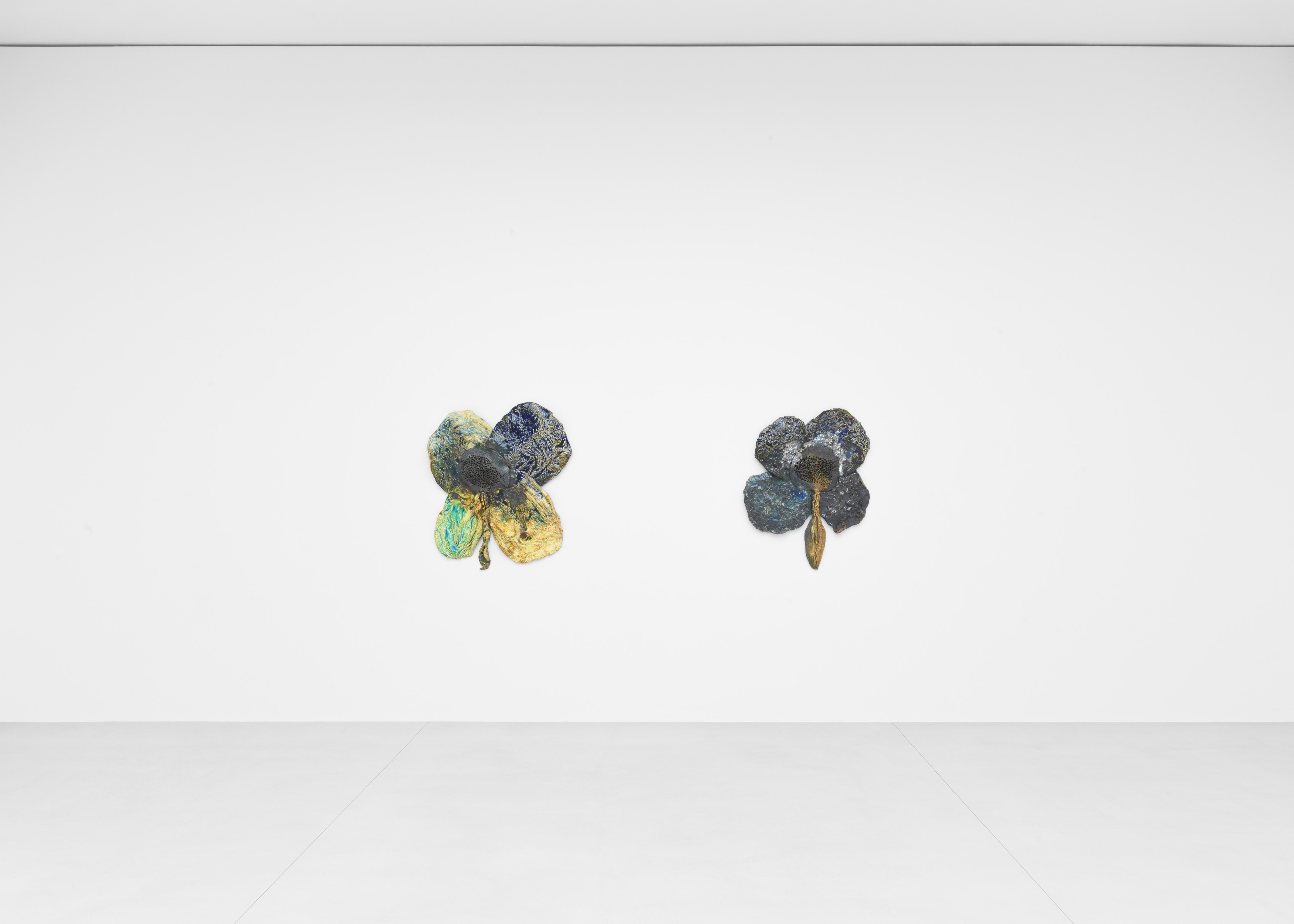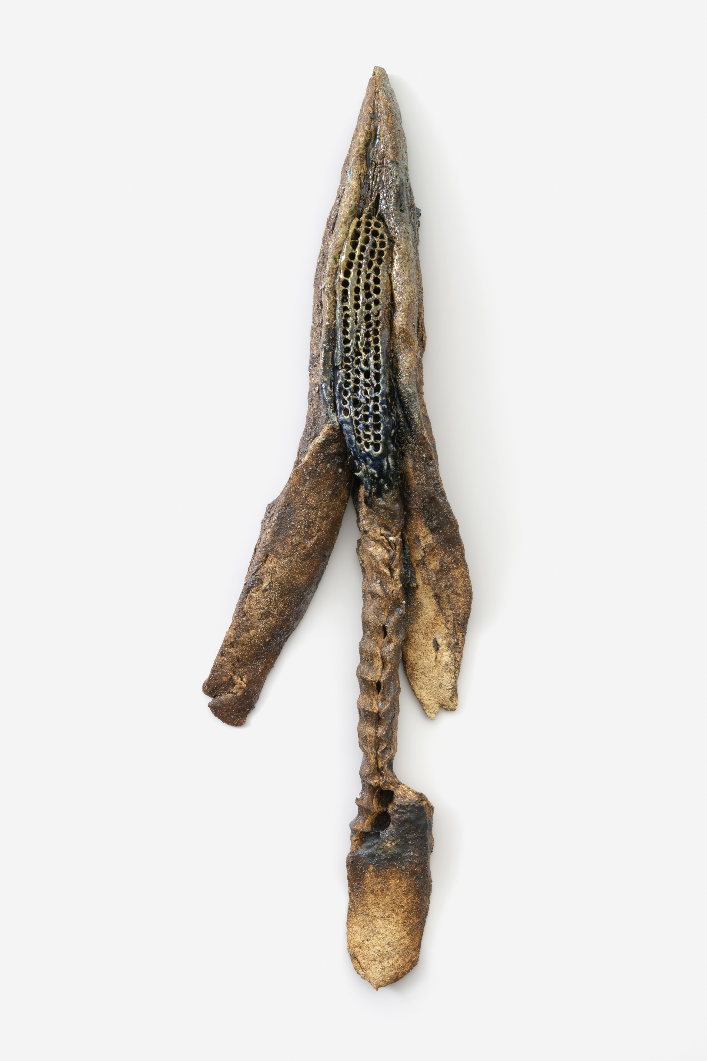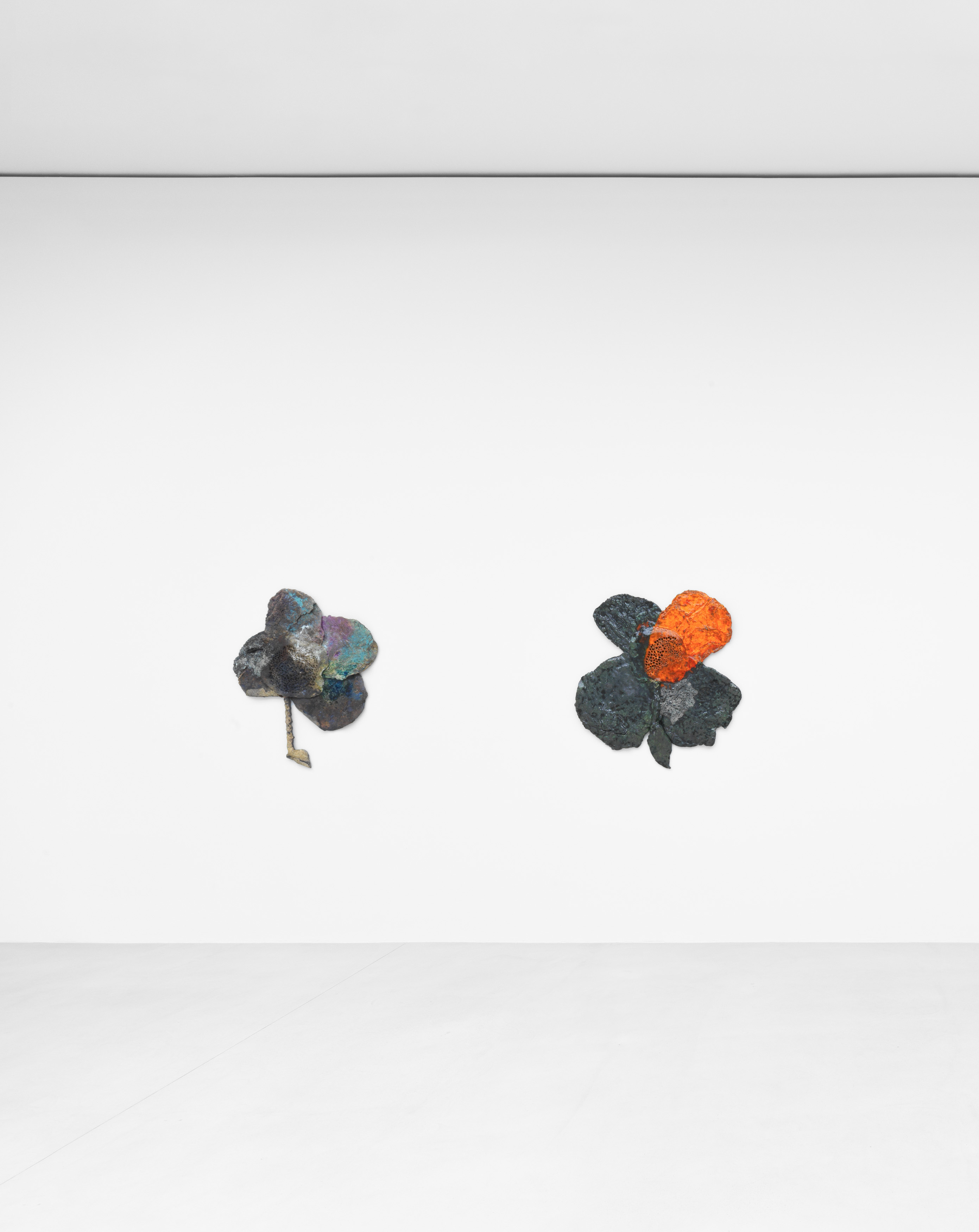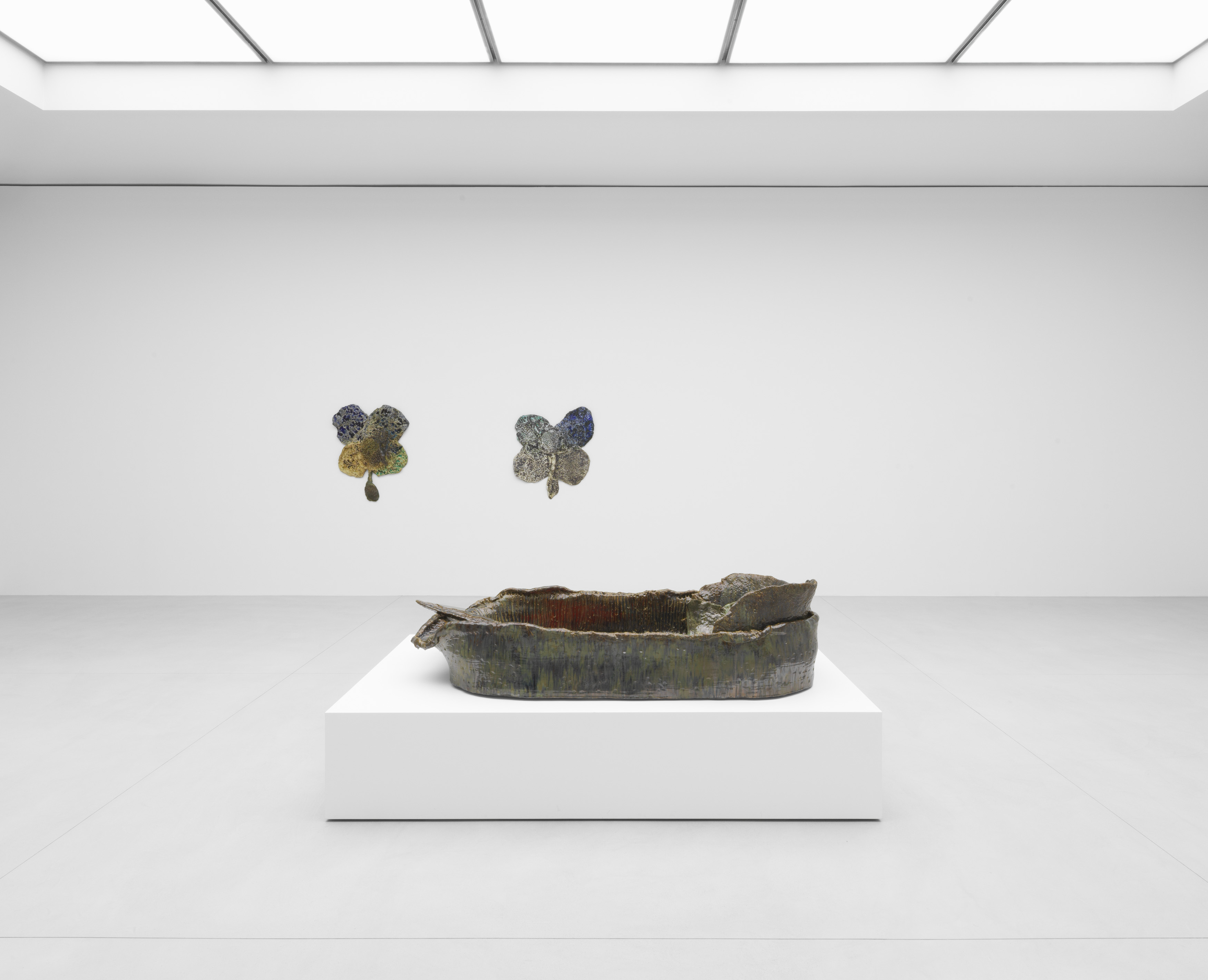 In his recent ceramics, Ruby continues his exploration of the four-petalled flower motif, or quatrefoil. This archetypal image has multiple spiritual and heraldic connotations, including an association with the four cardinal winds. Ruby has also made a visceral series of ‘flowers’ with lobe-like ‘petals’, and articulated stems that resemble vertebrae. With their gnarled and pockmarked surfaces, and their similarity to arrowheads, they resemble archaeological finds from a post-apocalyptic age. Lucio Fontana’s ceramic crucifixes, in which form and matter dissolve through the pressings and mouldings of the artist’s hands, were a reference point when making these works. Ruby has worked the clay just as intensely, pounding it in the open air so that it gathers traces, both positive and negative, of the world outside the studio. Like excavations or aerial views of ravaged landscapes, they follow on from the shattered topographies of the artist’s Basin Theology series.