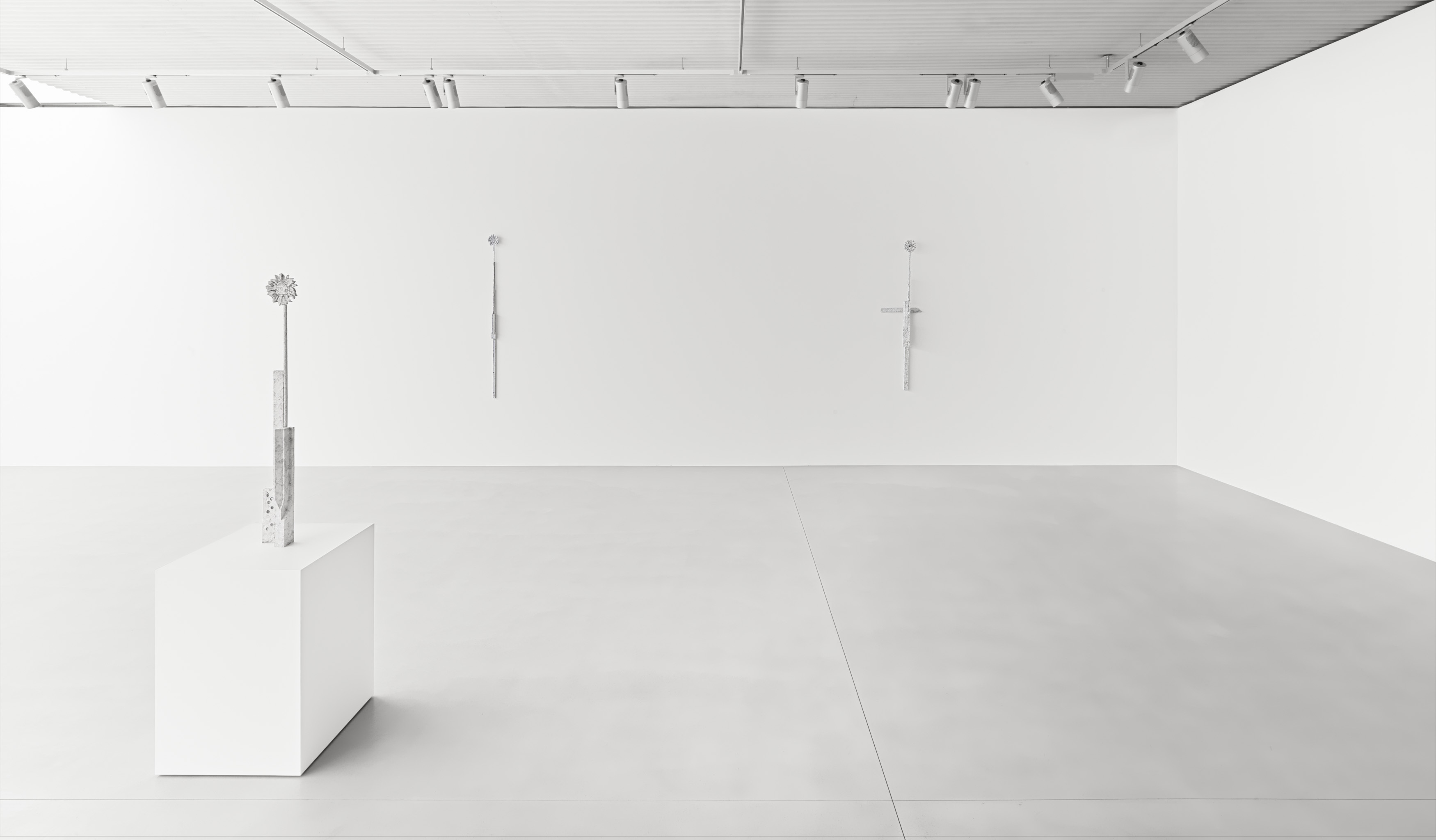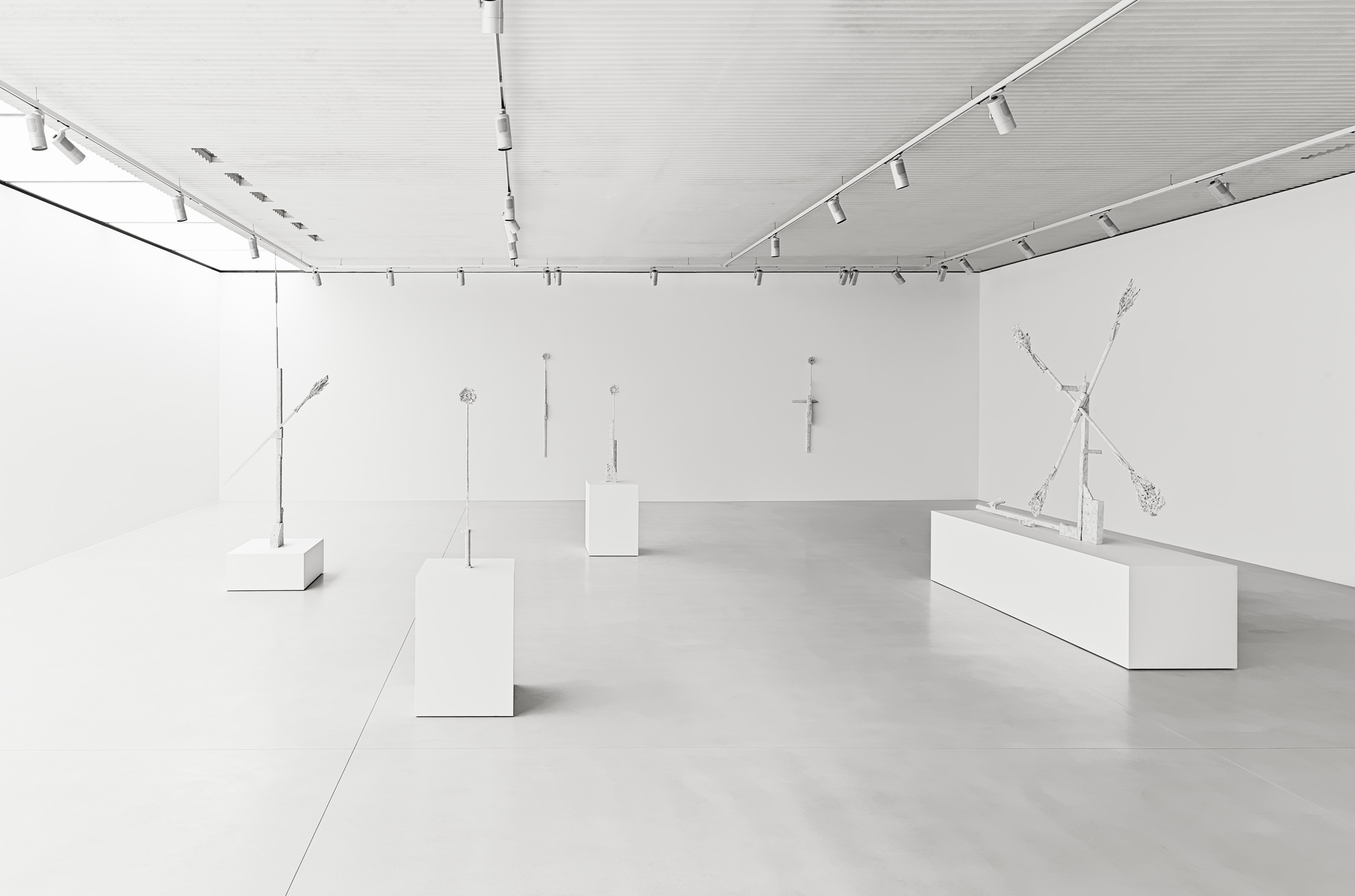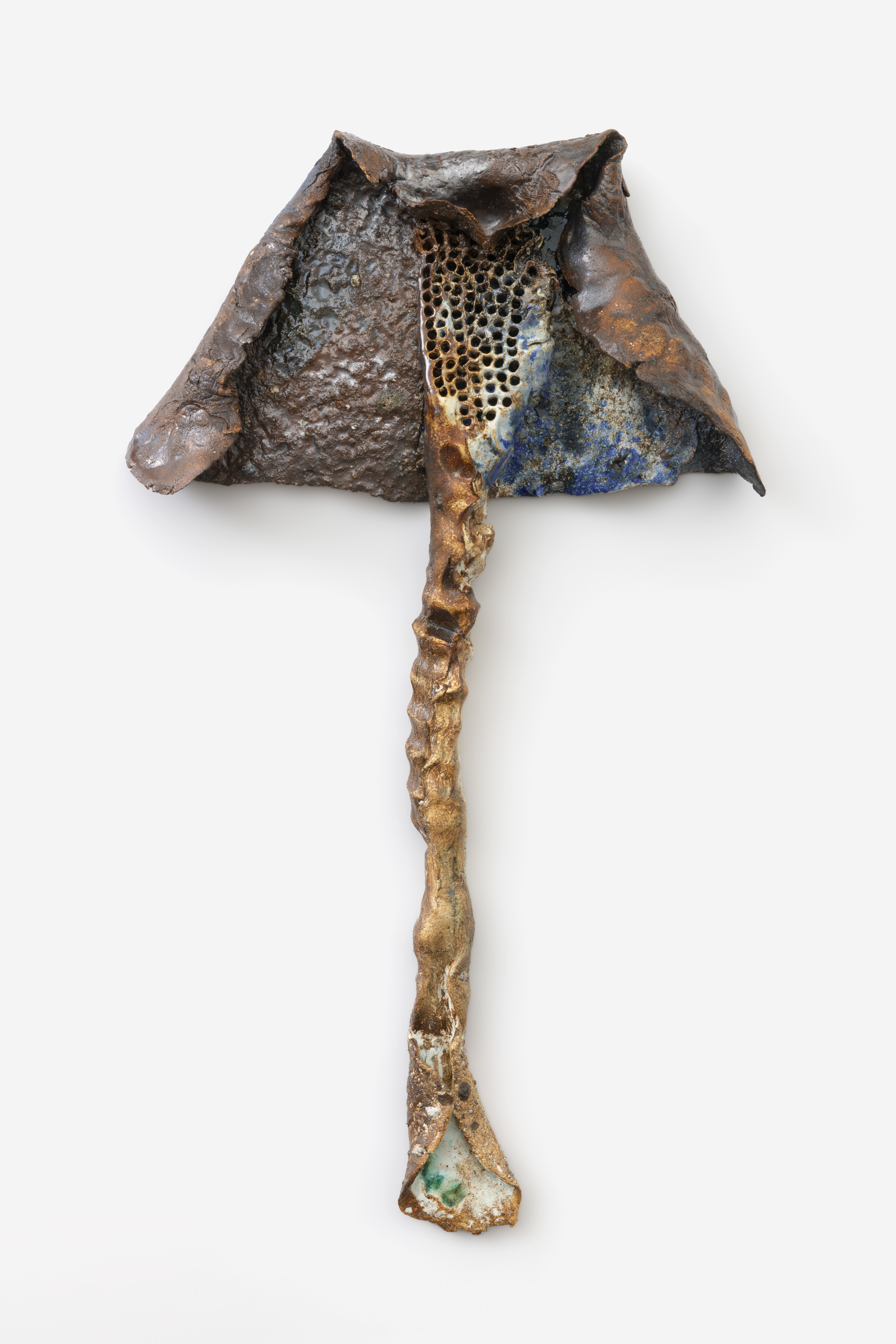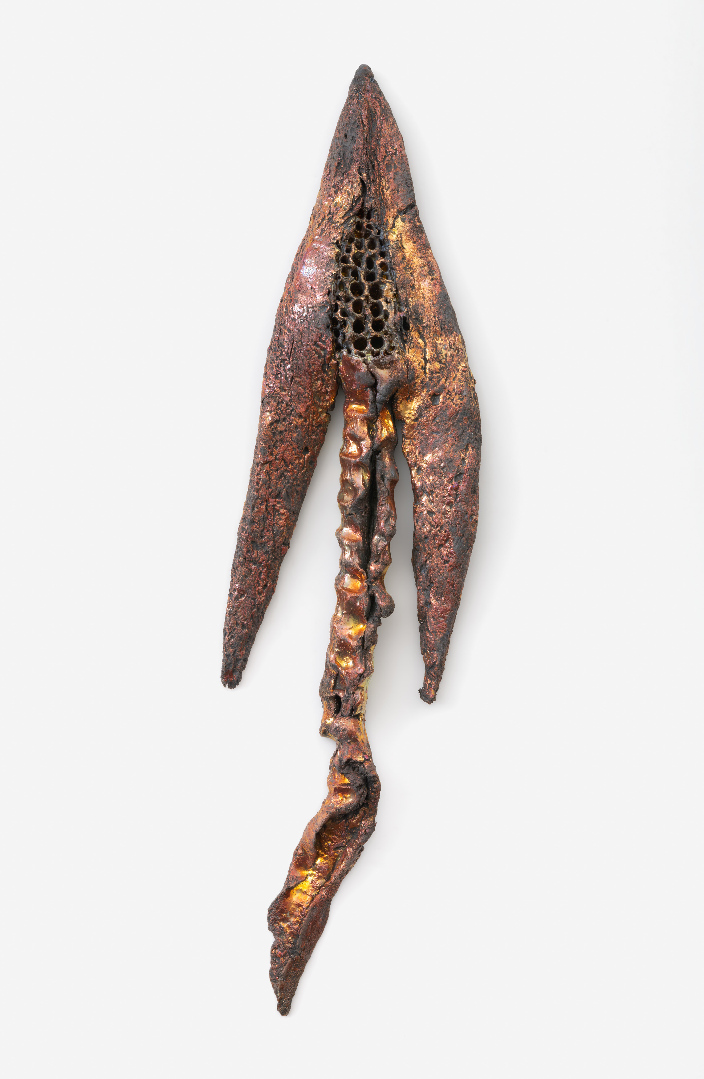 In his recent ceramics, Ruby continues his exploration of the four-petalled flower motif, or quatrefoil. This archetypal image has multiple spiritual and heraldic connotations, including an association with the four cardinal winds. Ruby has also made a visceral series of ‘flowers’ with lobe-like ‘petals’, and articulated stems that resemble vertebrae. With their gnarled and pockmarked surfaces, and their similarity to arrowheads, they resemble archaeological finds from a post-apocalyptic age. Lucio Fontana’s ceramic crucifixes, in which form and matter dissolve through the pressings and mouldings of the artist’s hands, were a reference point when making these works. Ruby has worked the clay just as intensely, pounding it in the open air so that it gathers traces, both positive and negative, of the world outside the studio. Like excavations or aerial views of ravaged landscapes, they follow on from the shattered topographies of the artist’s Basin Theology series.
