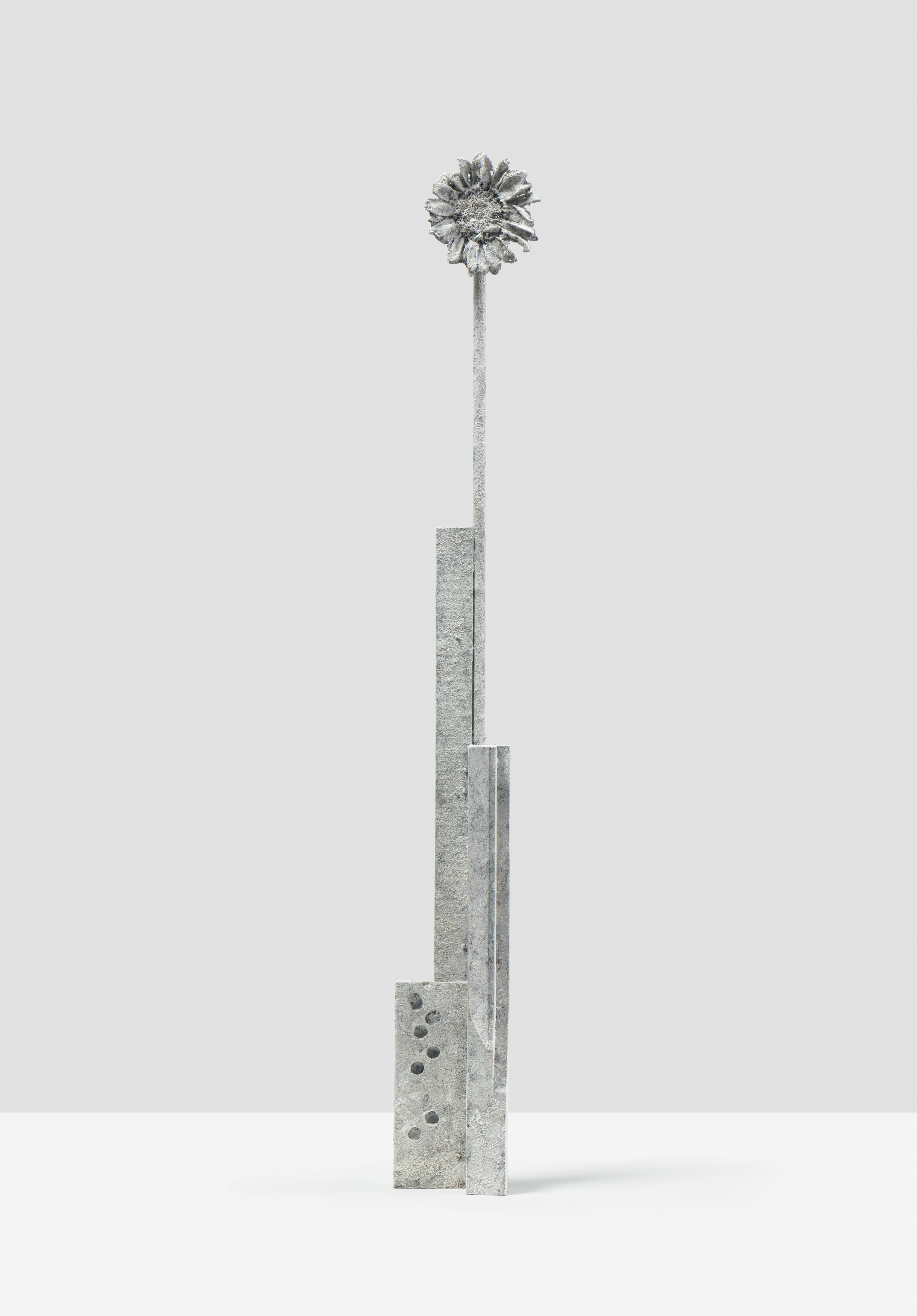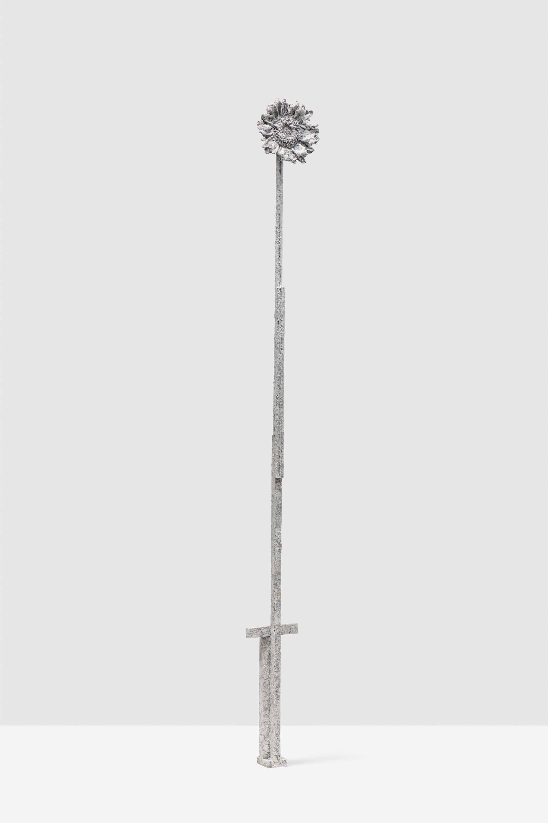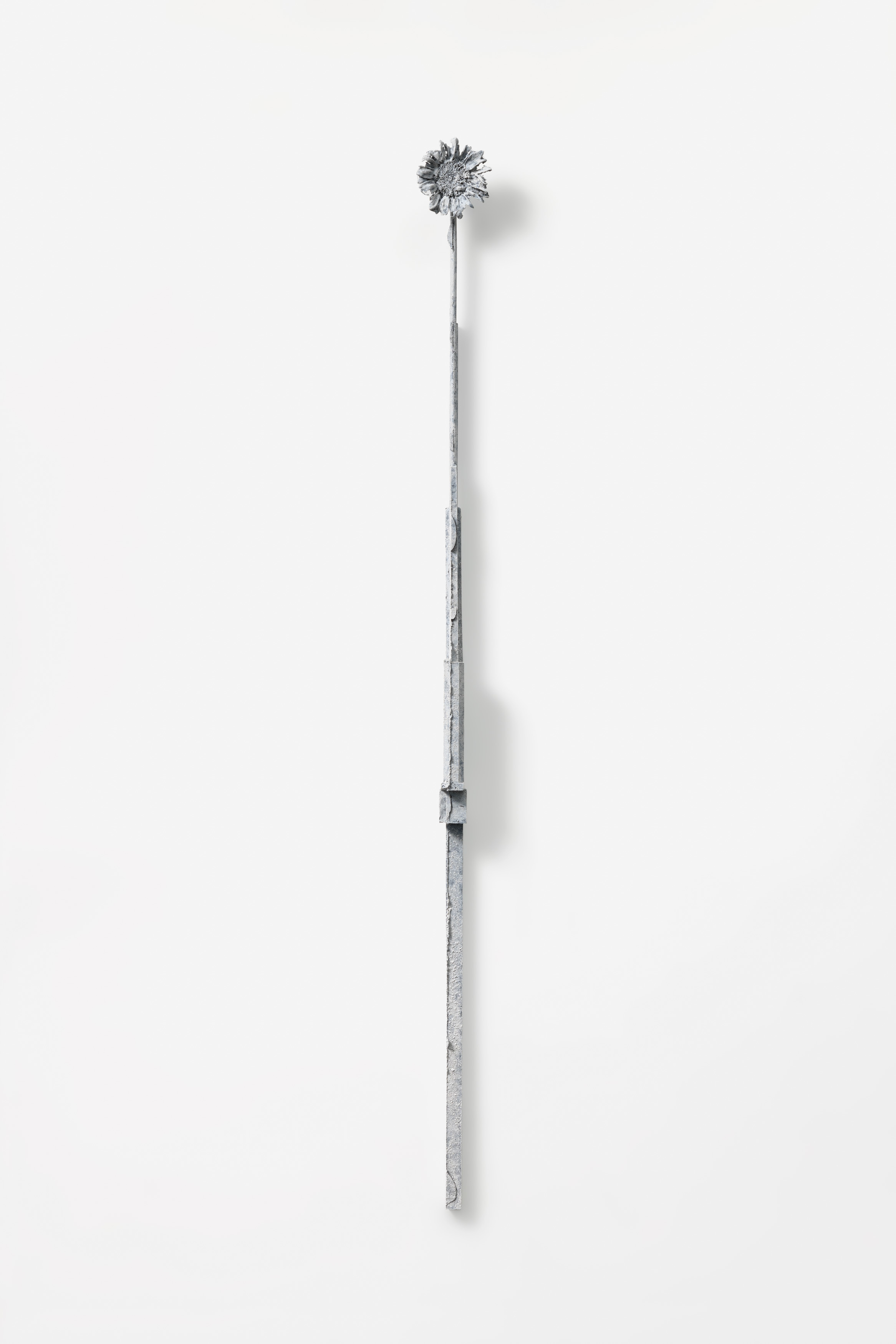 Flowers also appear in the artist’s cast aluminium sculptures. The FP in the title stands for ‘Flower Power’, a slogan used in the 1960s and 70s to denote passive resistance to the Vietnam War. Ginsberg invented the phrase in 1965, the year in which he wrote Drowse Murmurs, and it served to transform war protests into peaceful affirmative spectacles. An iconic photograph of a man placing a carnation inside the barrel of an M14 rifle, taken by Bernie Boston in 1971, captures the ethos. This image also featured on a poster in the Ruby household. Ruby’s sculptures are permeated with the same uneasy tension. Their slender forms—which reference his earlier wooden reliefs—resemble gun shafts and bayonets. They are typical examples of the artist’s regenerative practice and cast from assemblages of wood and other materials. Ruby salvages scrap from his creative projects and endlessly repurposes it, meaning that old works give rise to new. The flowers and foliage, all gathered from around the artist’s home and studio, were cast from life. Through these sculptures, Ruby also introduces a modern material into his work: aluminium. Synonymous with the space age, it is now a ubiquitous part of everyday life, thanks to its lightness and strength. But it also has extensive military applications. The metal played a significant role in the Vietnam War, for example, when it was used to manufacture people carriers and bombs. With their skeletal, almost spectral appearance, Ruby’s sculptures stand on the threshold of past and present. By establishing an analogy between militarism and activism, the works also raise questions about the conflicts that define our own epoch.