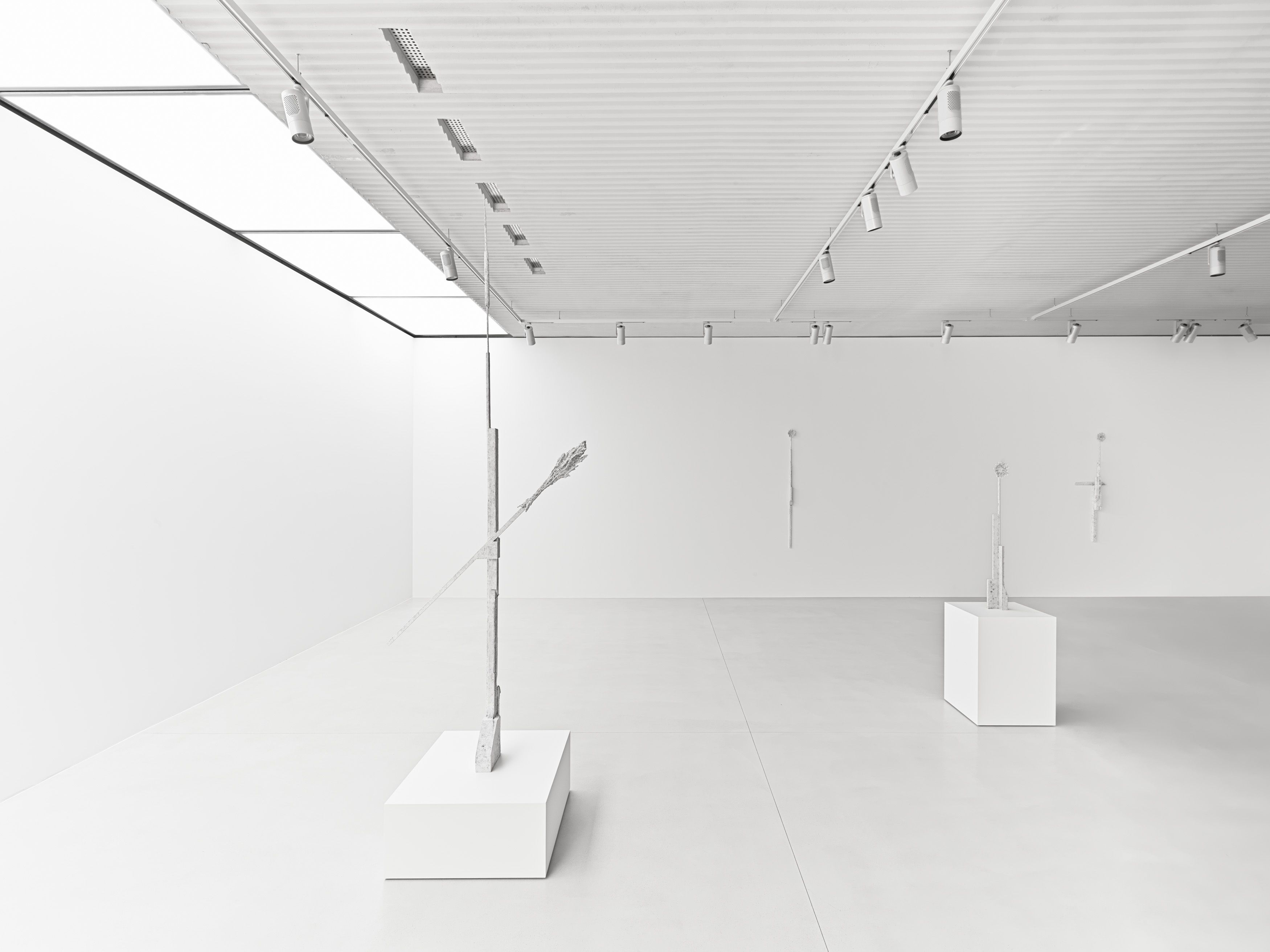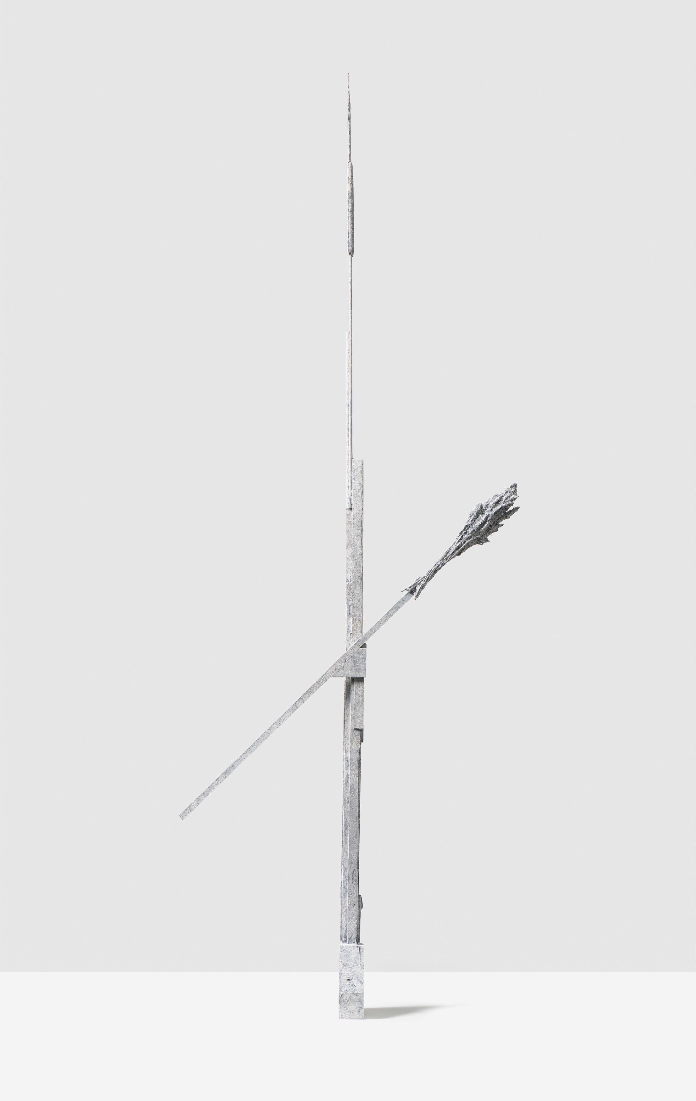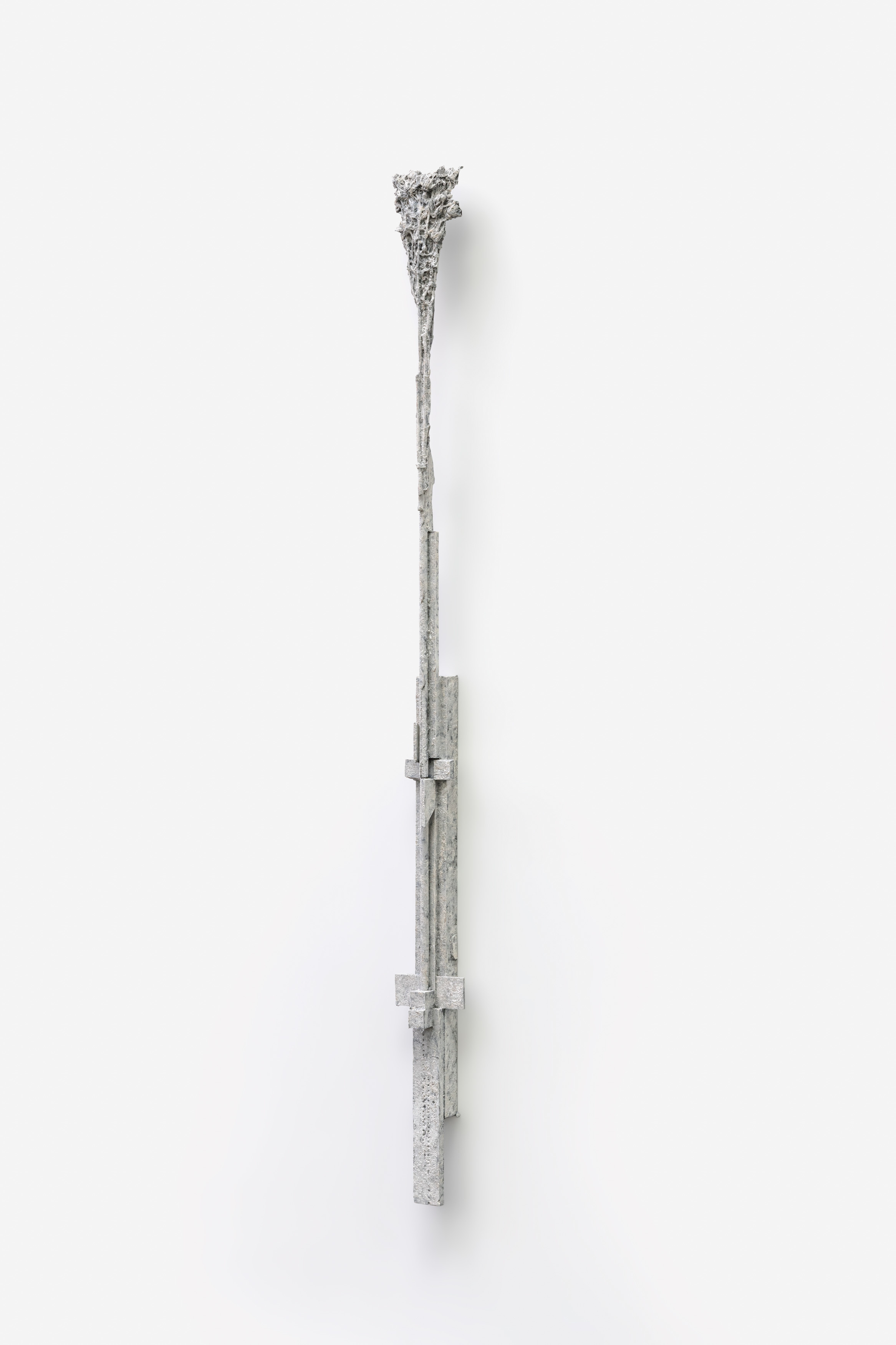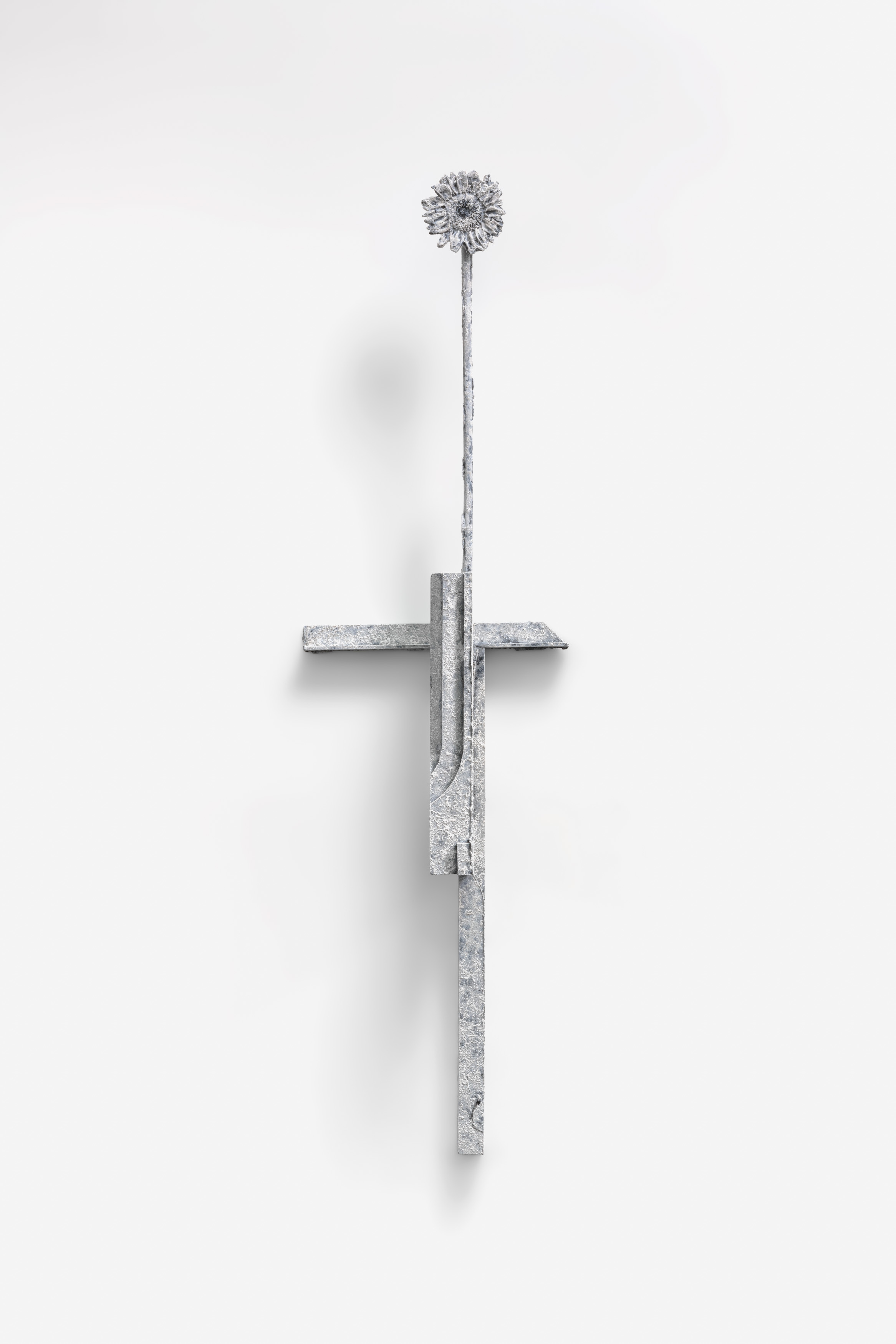Flowers also appear in the artist’s cast aluminium sculptures. The FP in the title stands for ‘Flower Power’, a slogan used in the 1960s and 70s to denote passive resistance to the Vietnam War. Ginsberg invented the phrase in 1965, the year in which he wrote Drowse Murmurs, and it served to transform war protests into peaceful affirmative spectacles. An iconic photograph of a man placing a carnation inside the barrel of an M14 rifle, taken by Bernie Boston in 1971, captures the ethos. This image also featured on a poster in the Ruby household. Ruby’s sculptures are permeated with the same uneasy tension. Their slender forms—which reference his earlier wooden reliefs—resemble gun shafts and bayonets. They are typical examples of the artist’s regenerative practice and cast from assemblages of wood and other materials. Ruby salvages scrap from his creative projects and endlessly repurposes it, meaning that old works give rise to new. The flowers and foliage, all gathered from around the artist’s home and studio, were cast from life. Through these sculptures, Ruby also introduces a modern material into his work: aluminium. Synonymous with the space age, it is now a ubiquitous part of everyday life, thanks to its lightness and strength. But it also has extensive military applications. The metal played a significant role in the Vietnam War, for example, when it was used to manufacture people carriers and bombs. With their skeletal, almost spectral appearance, Ruby’s sculptures stand on the threshold of past and present. By establishing an analogy between militarism and activism, the works also raise questions about the conflicts that define our own epoch.