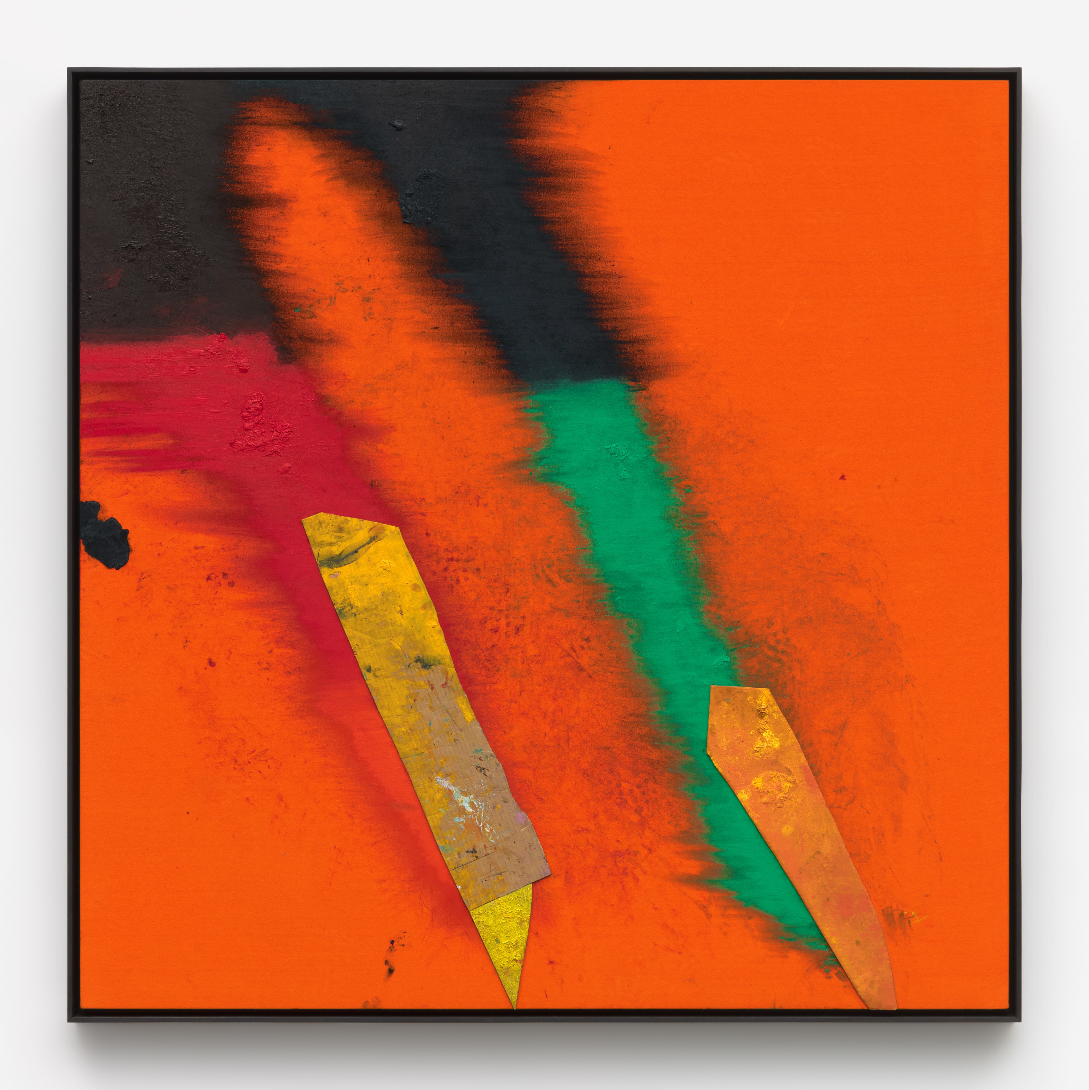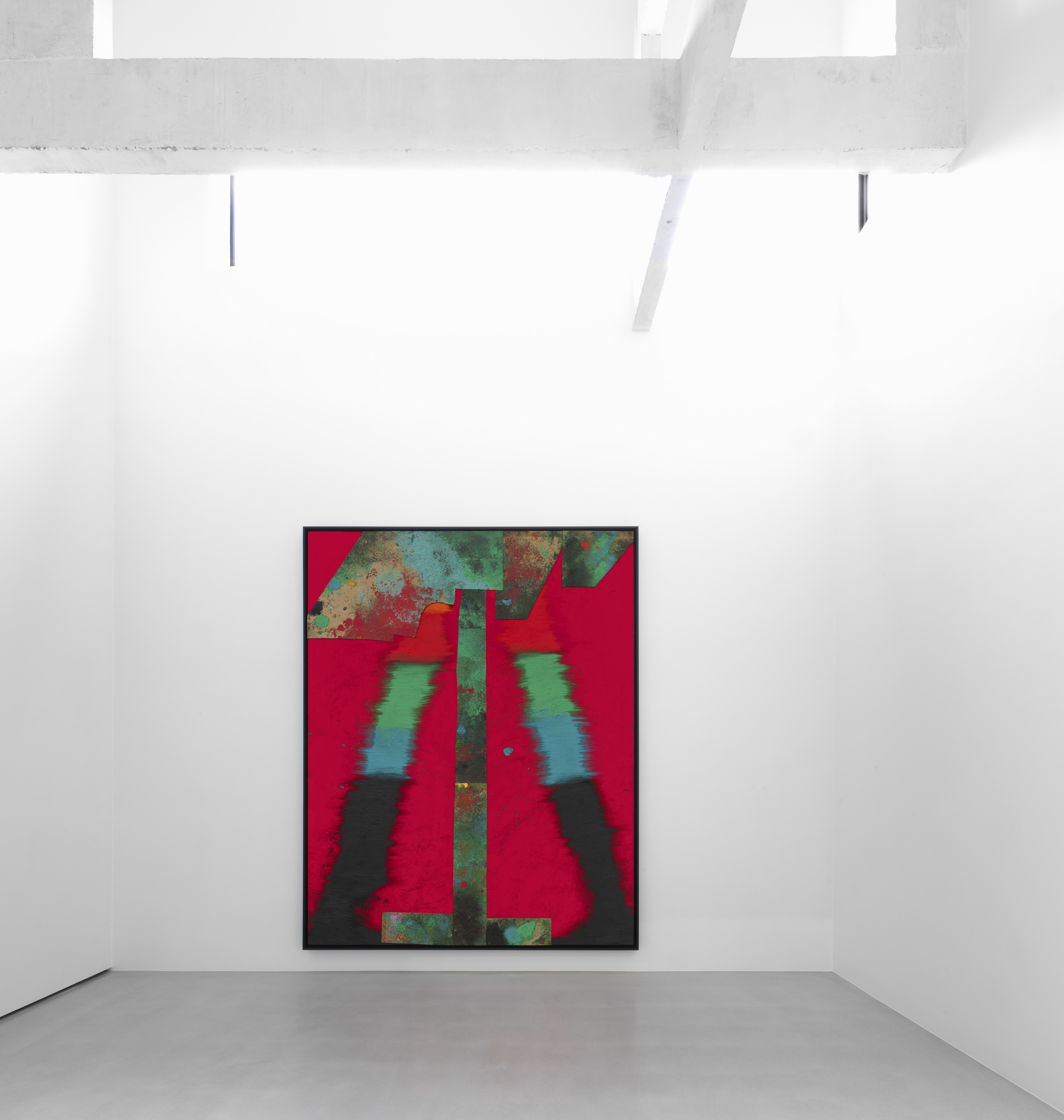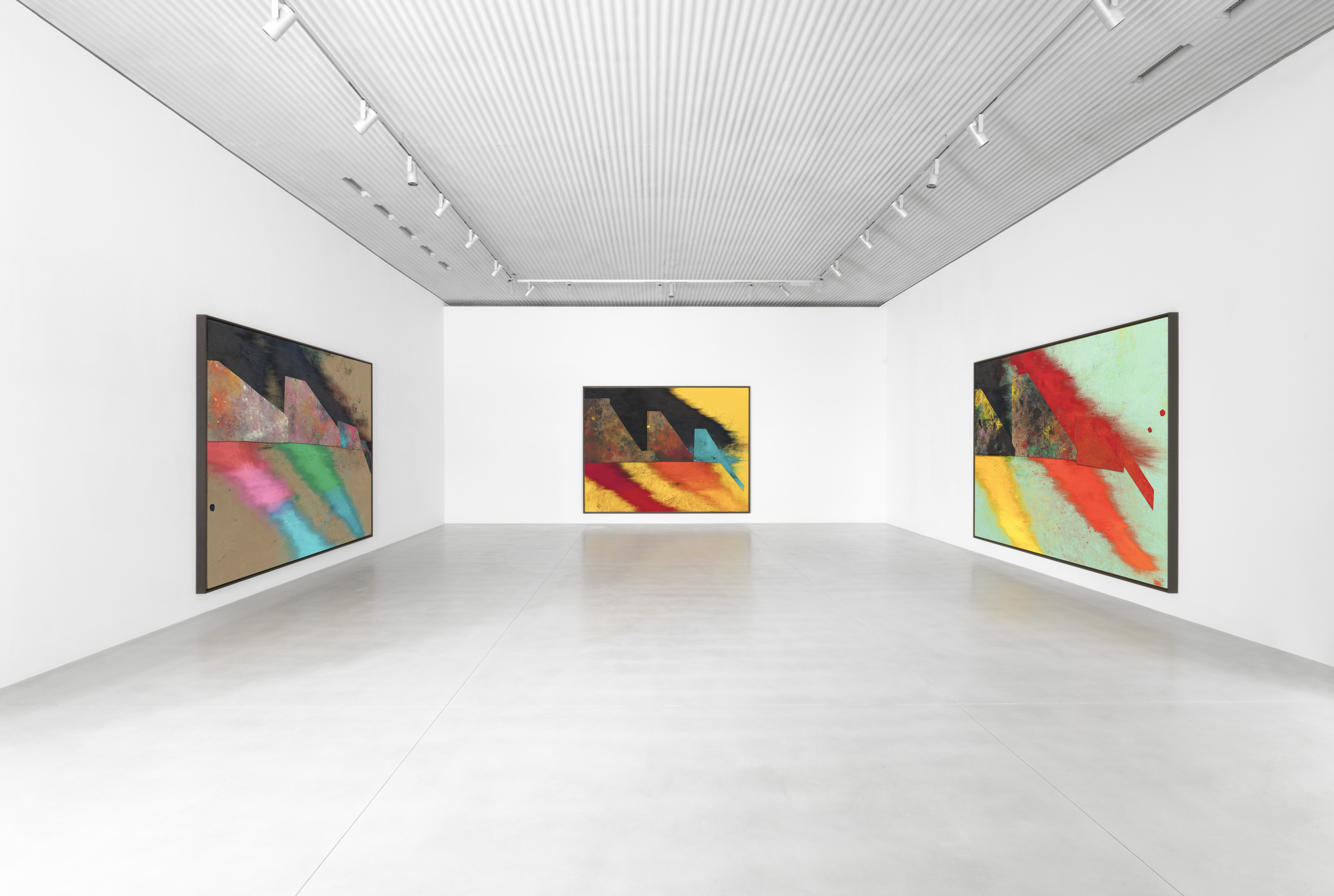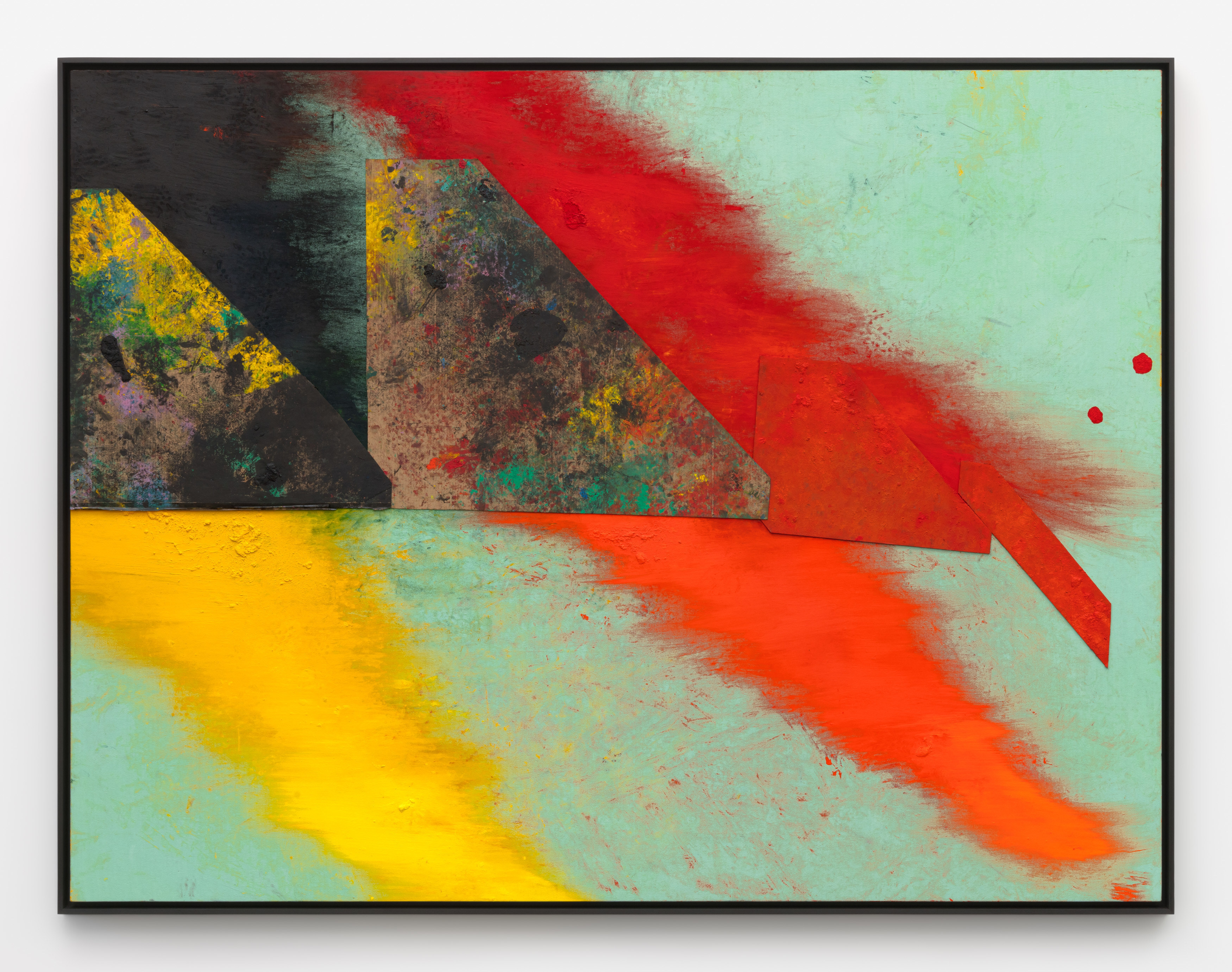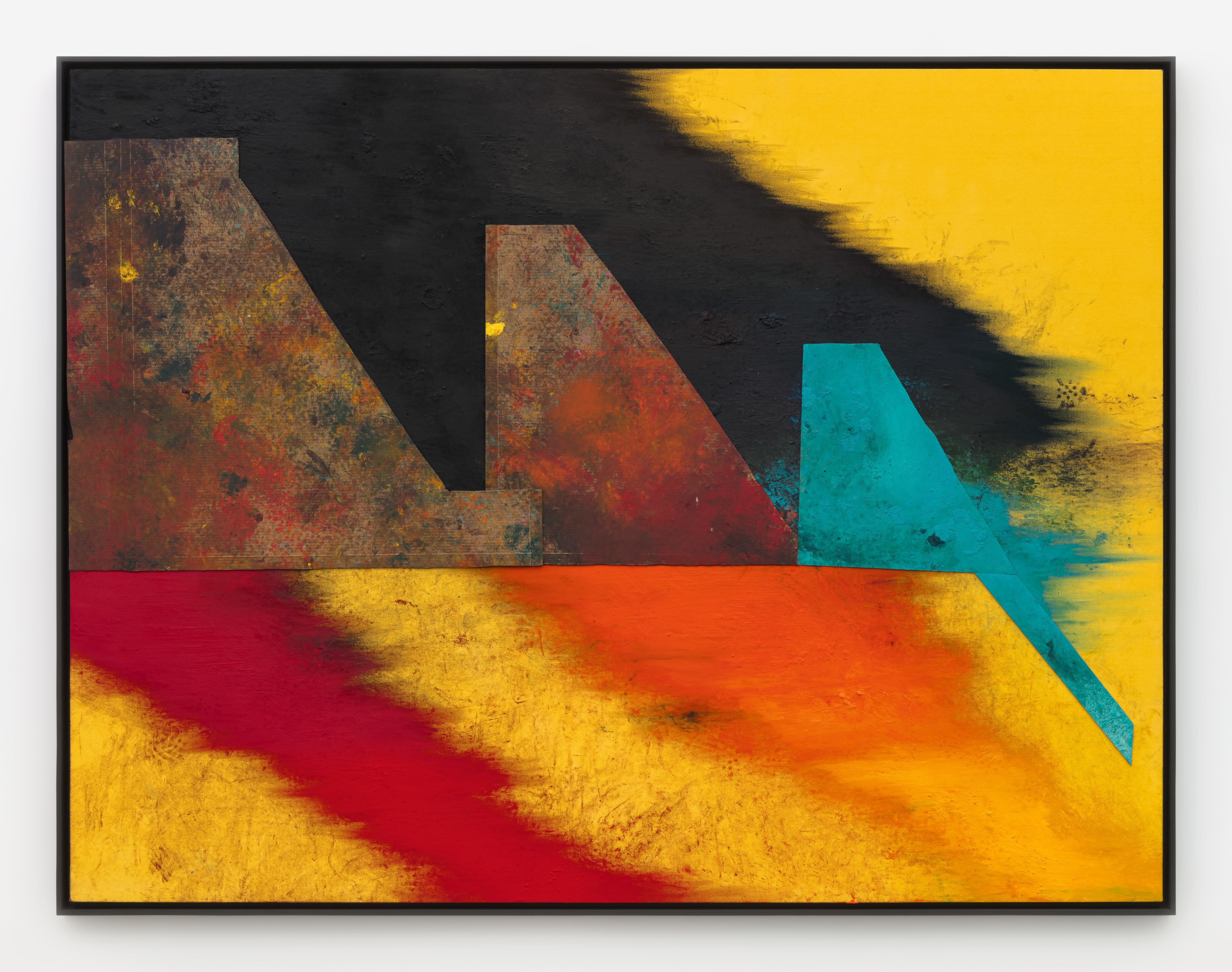 Ruby’s latest TURBINE paintings also include windmill-like forms. They relate to his earlier WIDW series, which included a motif that resembled a window. The shape has now acquired a rotational axis and been set in motion. The transformation is open-ended: are these blasted out windows, propellers or wind turbines? Devoid of references to time or place, the cruciform structures carve the pictorial plane into quadrants. Bold colours, some menacing and others more hopeful, create an indeterminate and volatile visual field. Clouds, wind, fire, smoke, smog, storms and dust all spring to mind. If these are indeed wind turbines, then they are ambiguous emblems. Whilst promising clean and sustainable energy, they also bear witness to the ecological ramifications of turbine-driven industrialisation and war. Other paintings in the series contain coruscating bands of colour, which Ruby achieves by pounding pure pigment into the canvas. It creates the impression of speed and velocity, or explosions and bombs. Here, the collaged motifs are geometric shapes that suggest airplane fuselages, border fortifications such as dragon’s teeth, or nodding donkey oil pumps.
