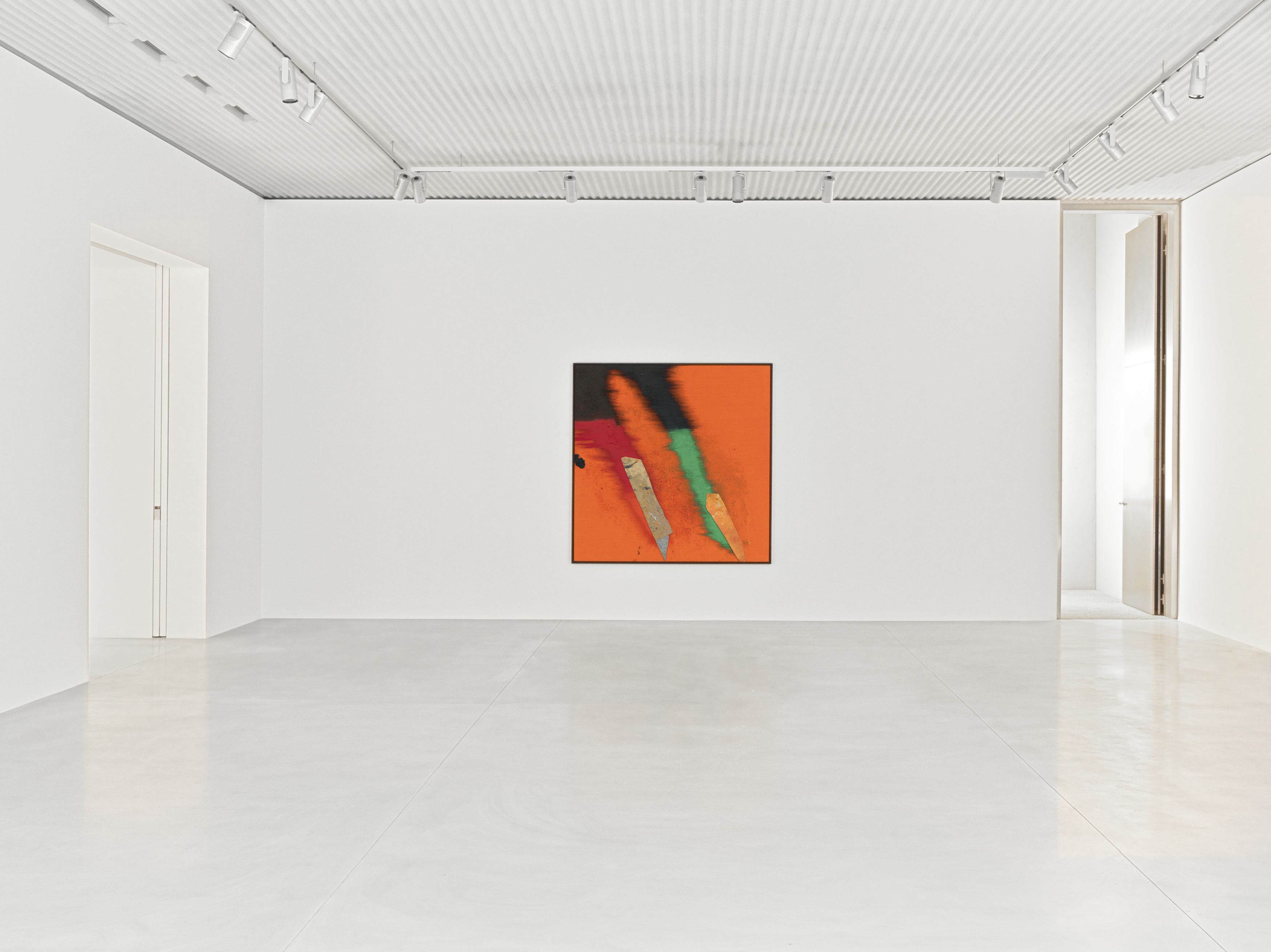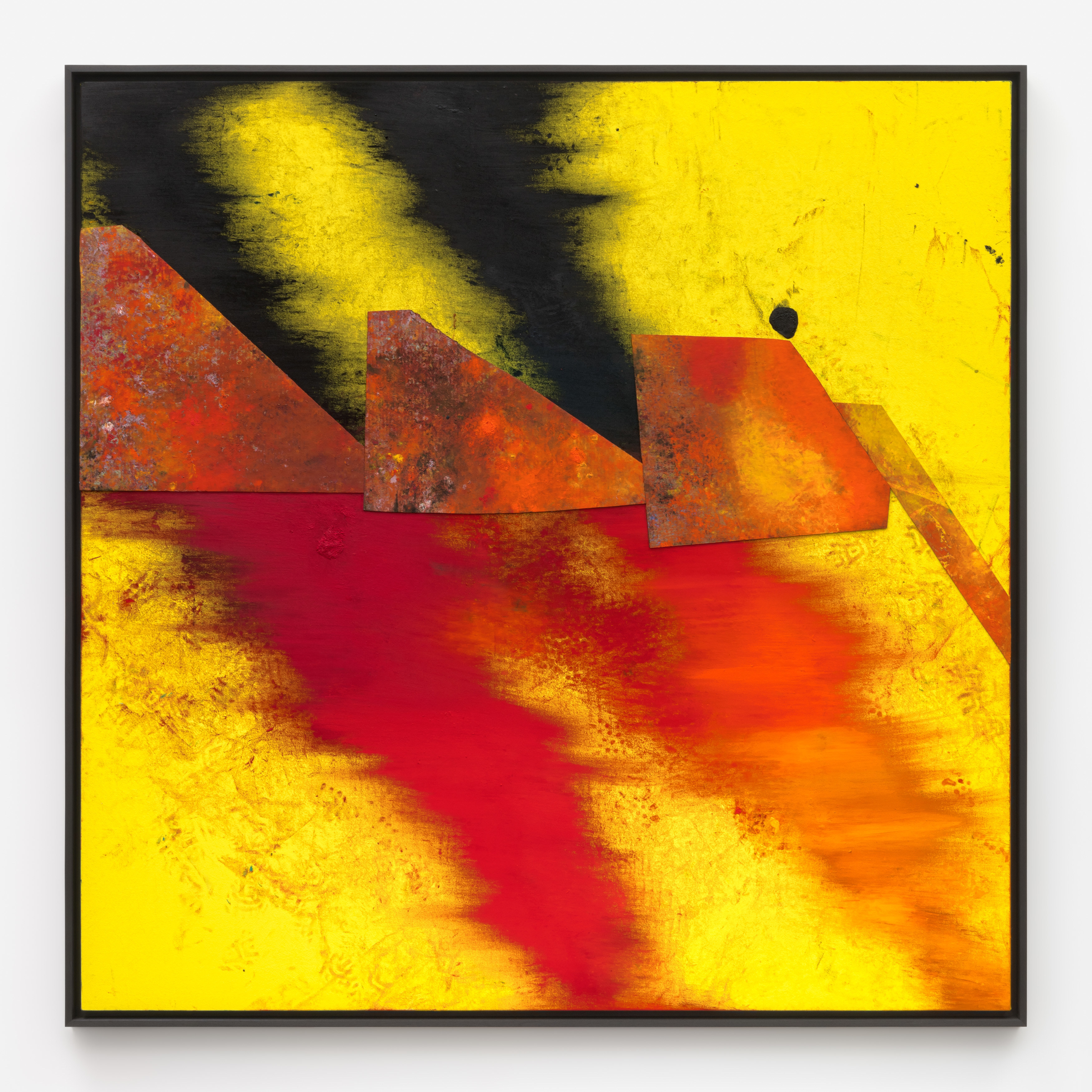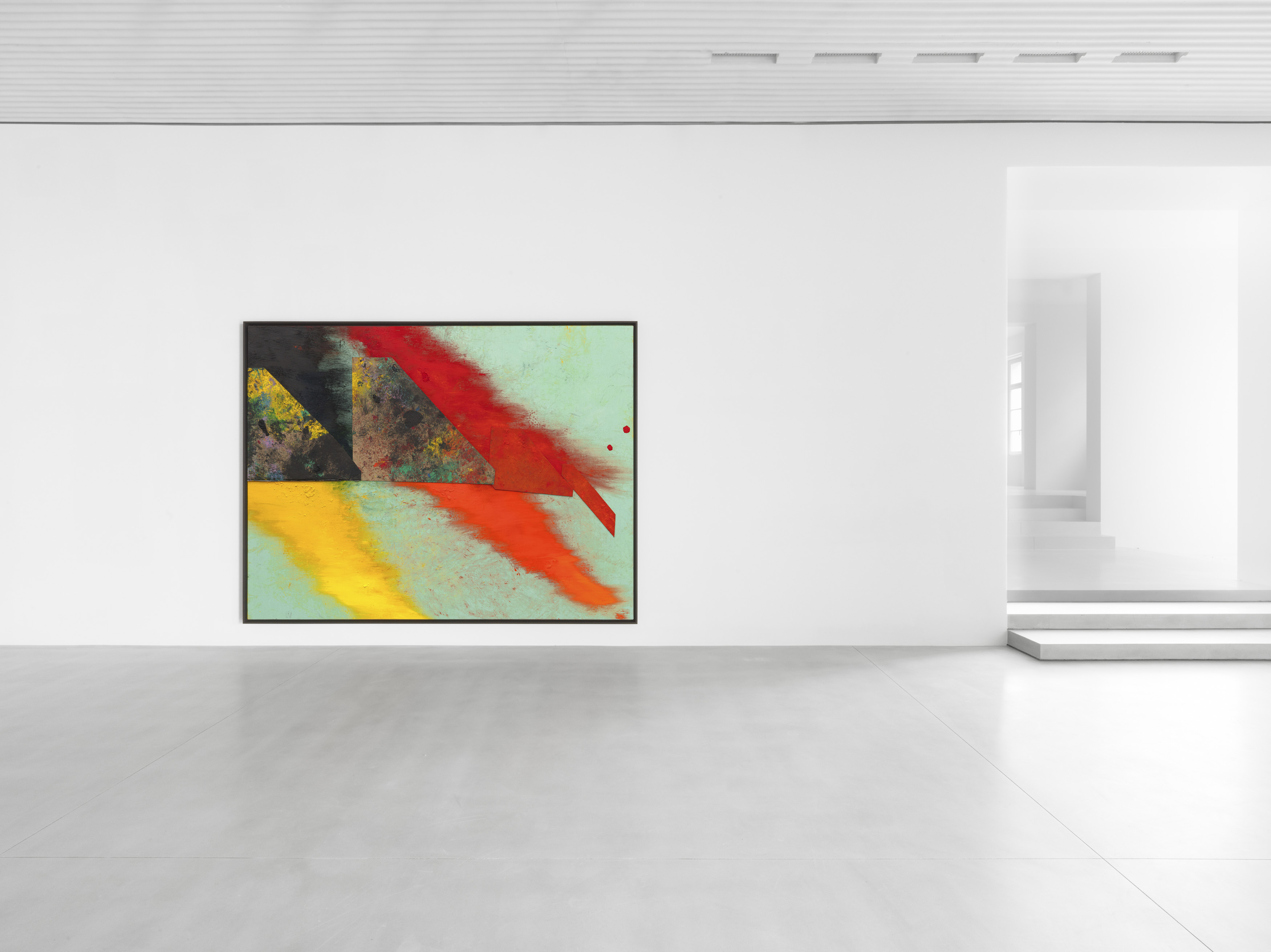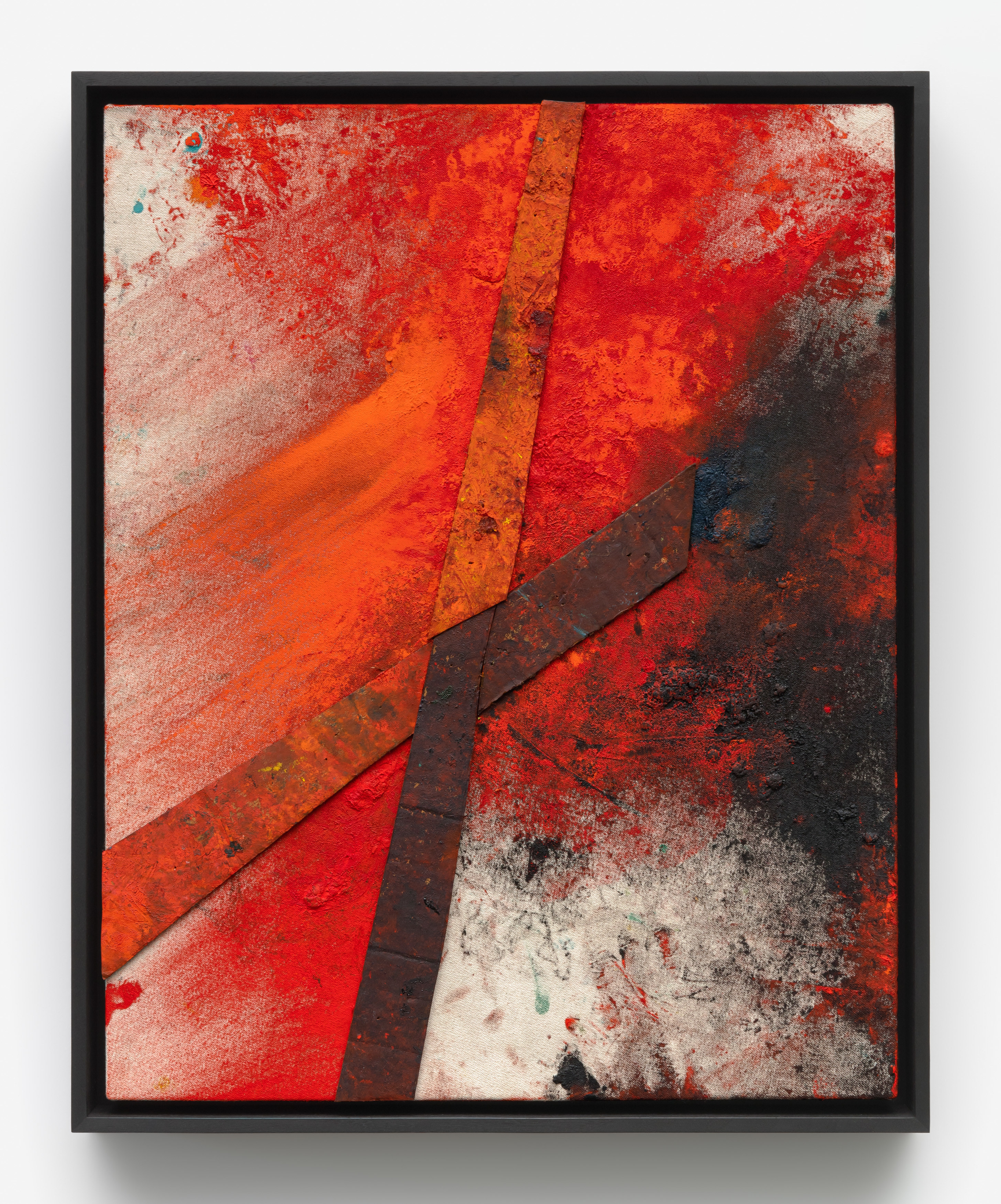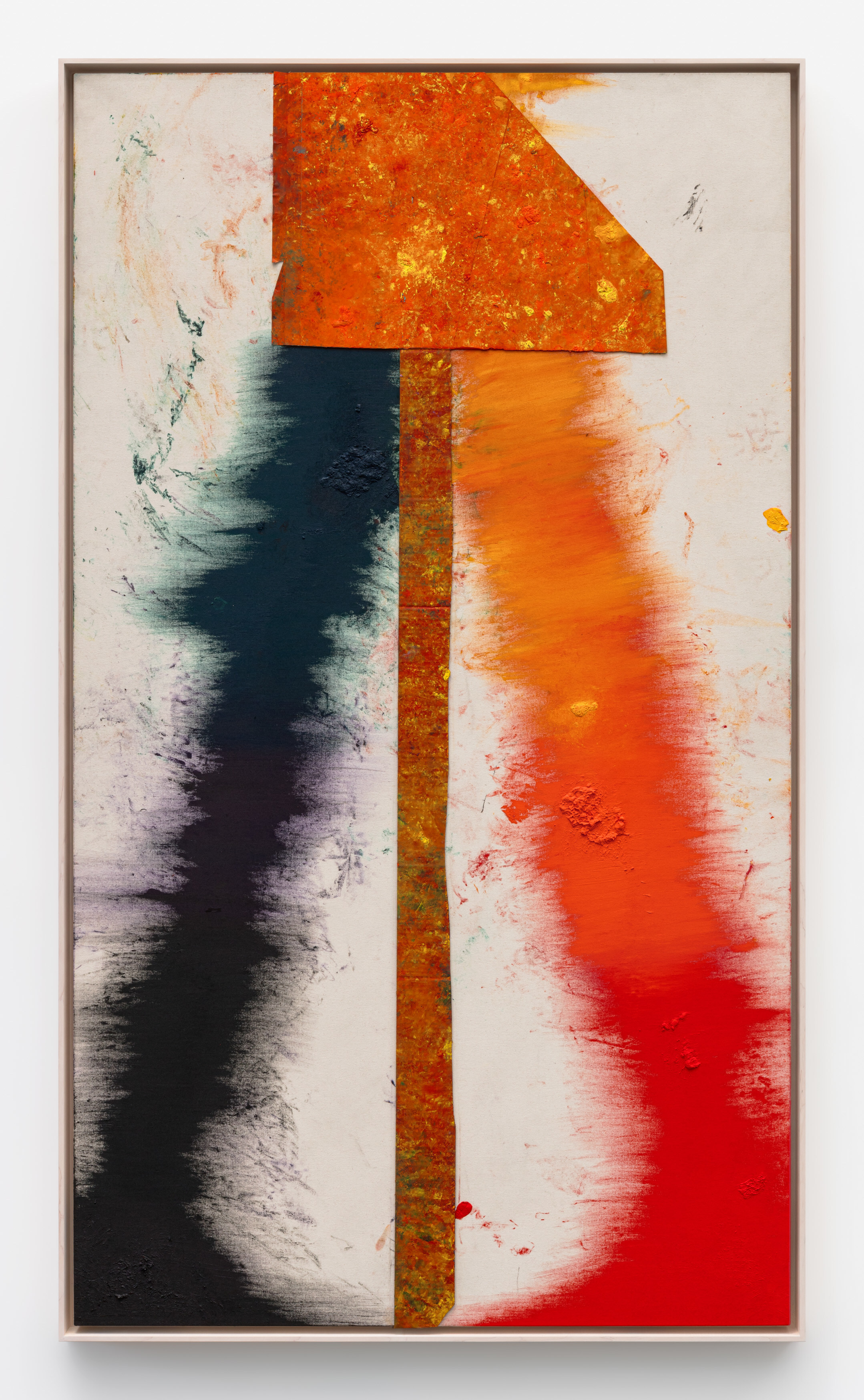 Ruby’s latest TURBINE paintings also include windmill-like forms. They relate to his earlier WIDW series, which included a motif that resembled a window. The shape has now acquired a rotational axis and been set in motion. The transformation is open-ended: are these blasted out windows, propellers or wind turbines? Devoid of references to time or place, the cruciform structures carve the pictorial plane into quadrants. Bold colours, some menacing and others more hopeful, create an indeterminate and volatile visual field. Clouds, wind, fire, smoke, smog, storms and dust all spring to mind. If these are indeed wind turbines, then they are ambiguous emblems. Whilst promising clean and sustainable energy, they also bear witness to the ecological ramifications of turbine-driven industrialisation and war. Other paintings in the series contain coruscating bands of colour, which Ruby achieves by pounding pure pigment into the canvas. It creates the impression of speed and velocity, or explosions and bombs. Here, the collaged motifs are geometric shapes that suggest airplane fuselages, border fortifications such as dragon’s teeth, or nodding donkey oil pumps.