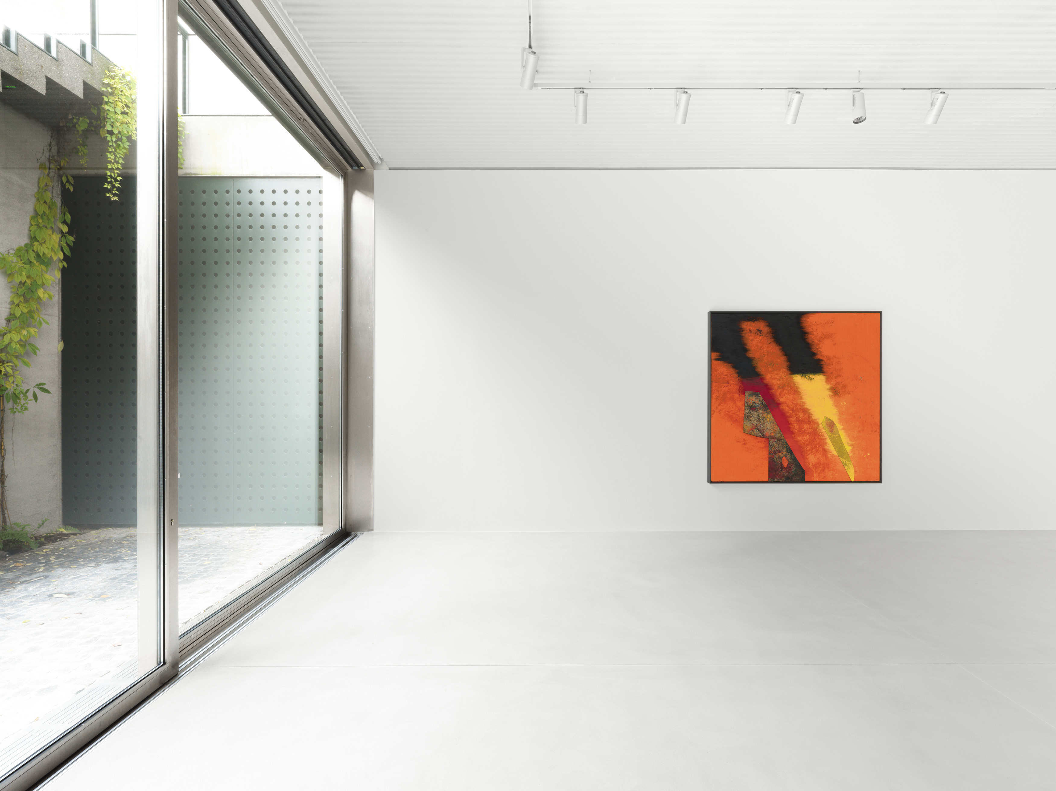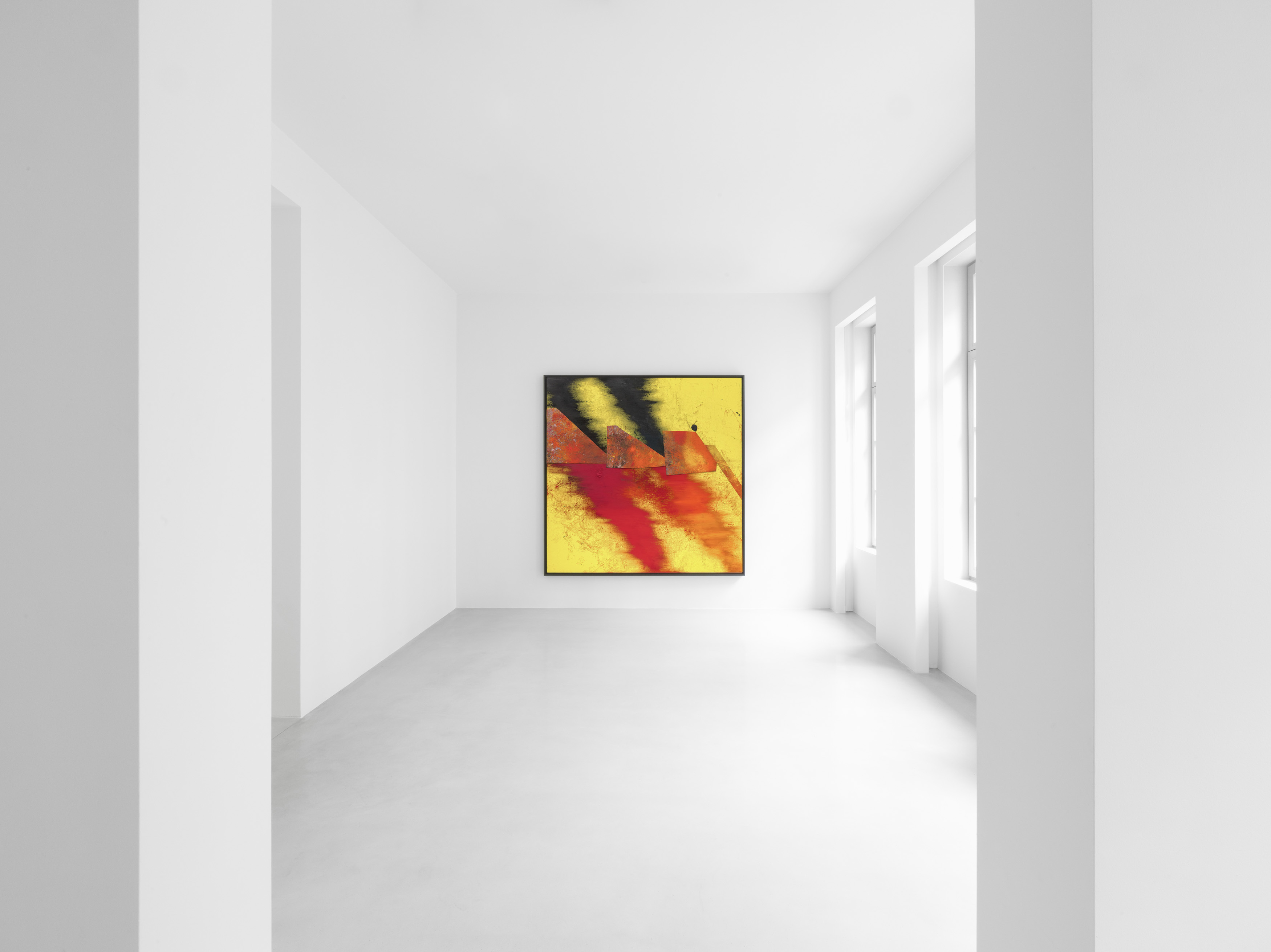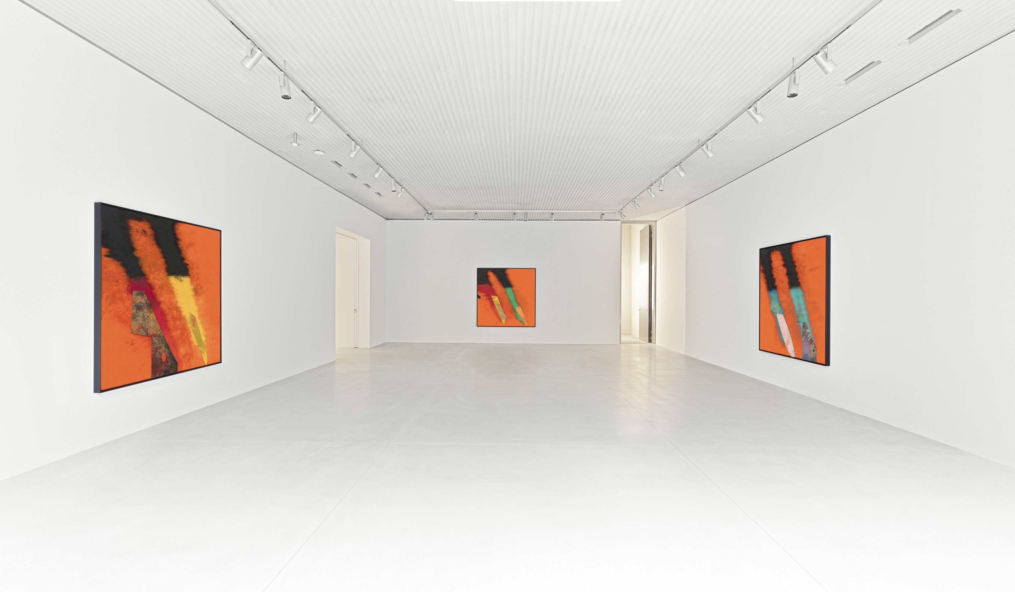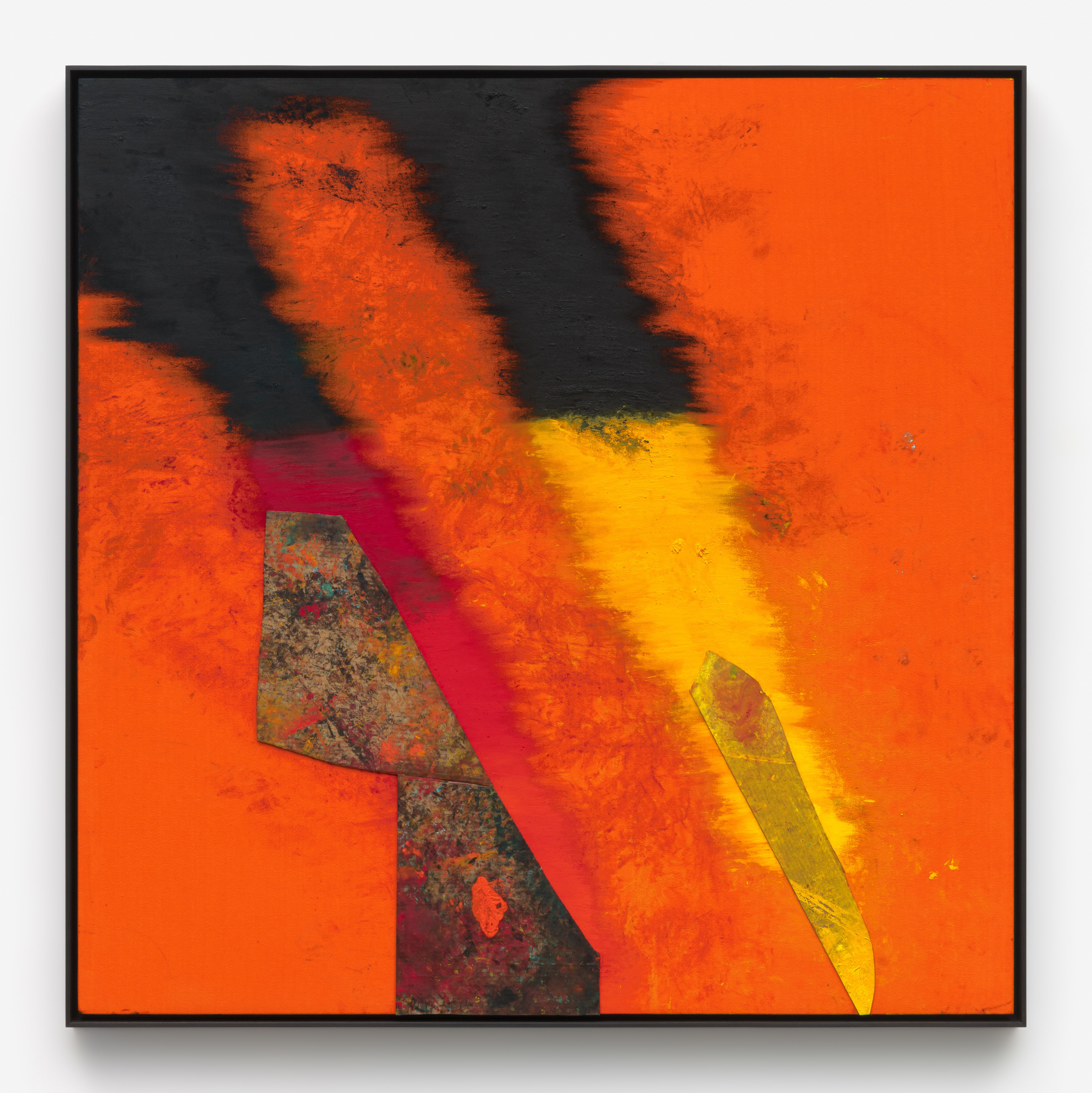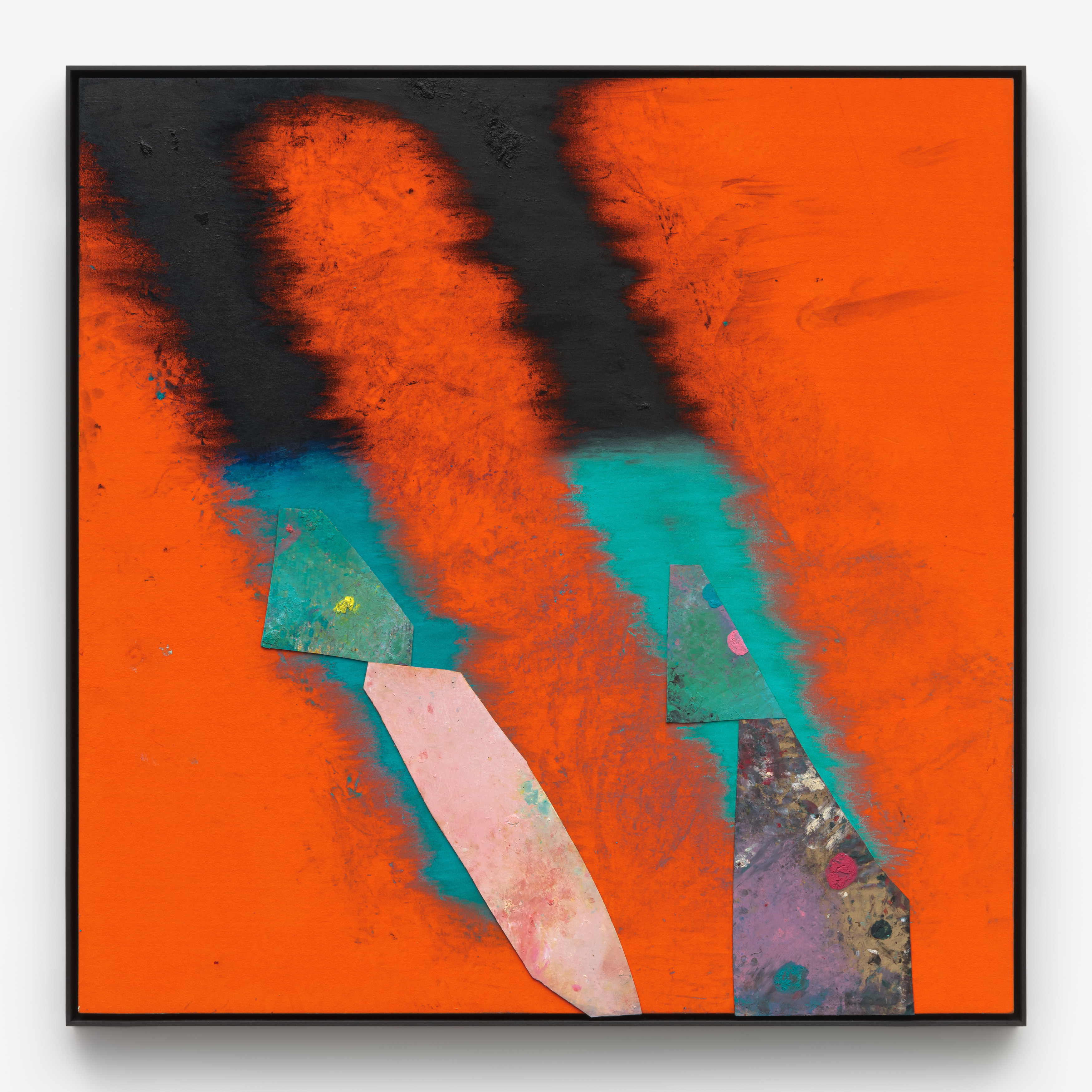 Ruby’s latest TURBINE paintings also include windmill-like forms. They relate to his earlier WIDW series, which included a motif that resembled a window. The shape has now acquired a rotational axis and been set in motion. The transformation is open-ended: are these blasted out windows, propellers or wind turbines? Devoid of references to time or place, the cruciform structures carve the pictorial plane into quadrants. Bold colours, some menacing and others more hopeful, create an indeterminate and volatile visual field. Clouds, wind, fire, smoke, smog, storms and dust all spring to mind. If these are indeed wind turbines, then they are ambiguous emblems. Whilst promising clean and sustainable energy, they also bear witness to the ecological ramifications of turbine-driven industrialisation and war. Other paintings in the series contain coruscating bands of colour, which Ruby achieves by pounding pure pigment into the canvas. It creates the impression of speed and velocity, or explosions and bombs. Here, the collaged motifs are geometric shapes that suggest airplane fuselages, border fortifications such as dragon’s teeth, or nodding donkey oil pumps.