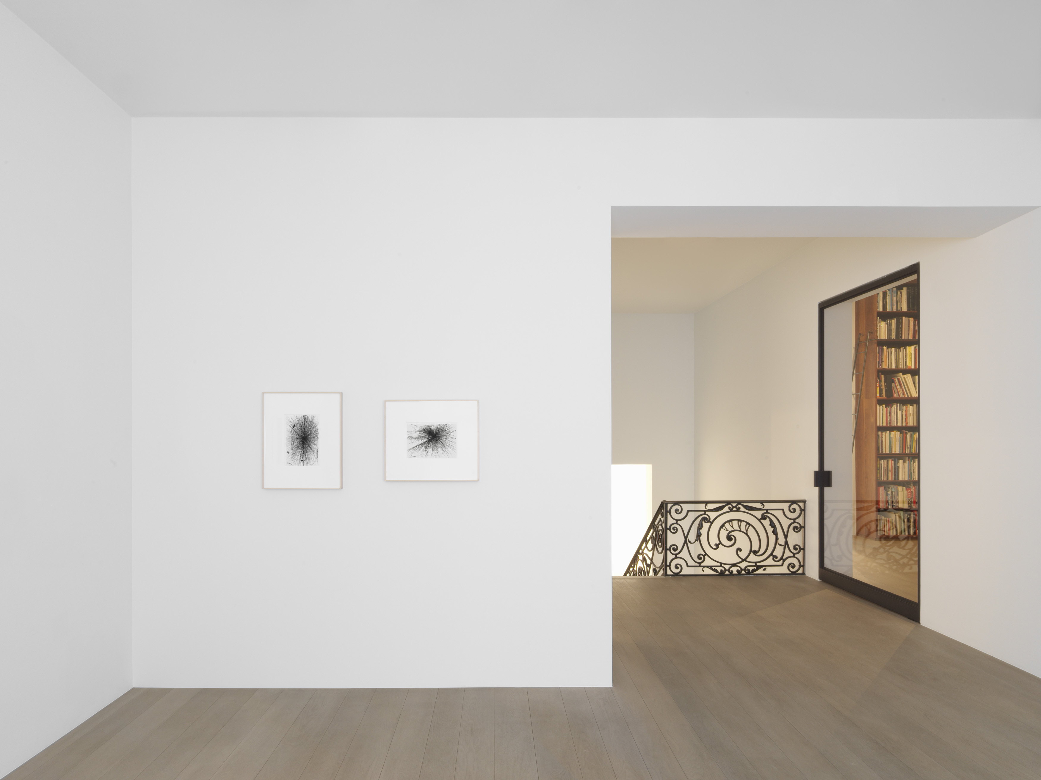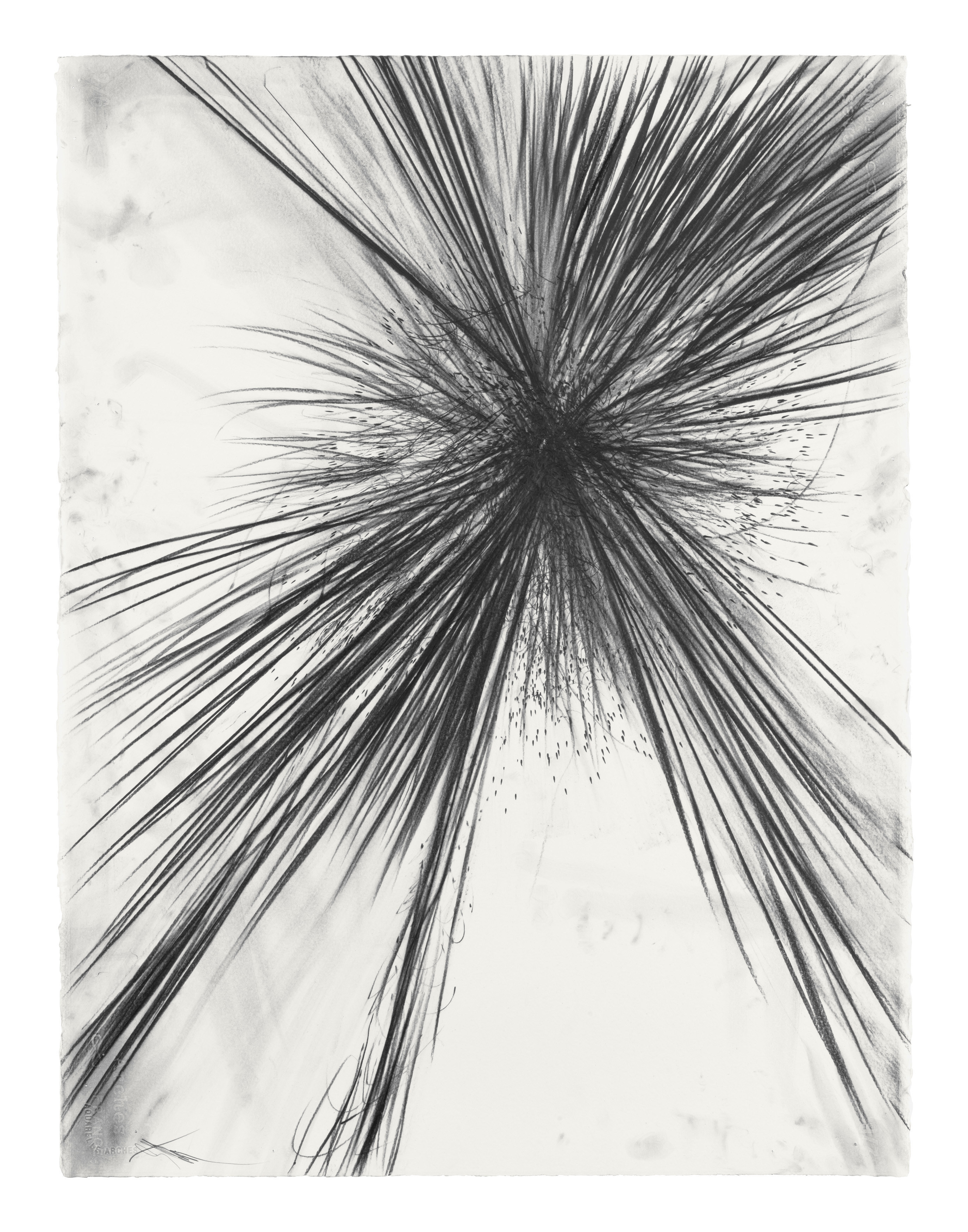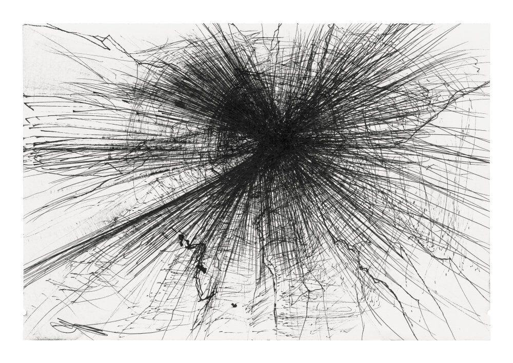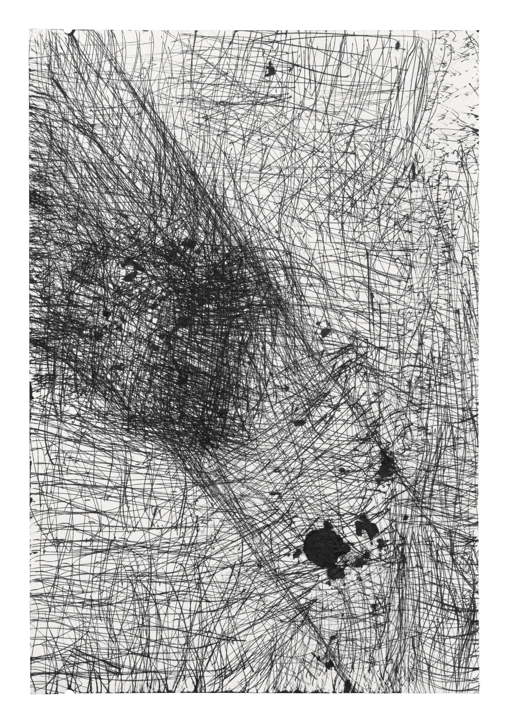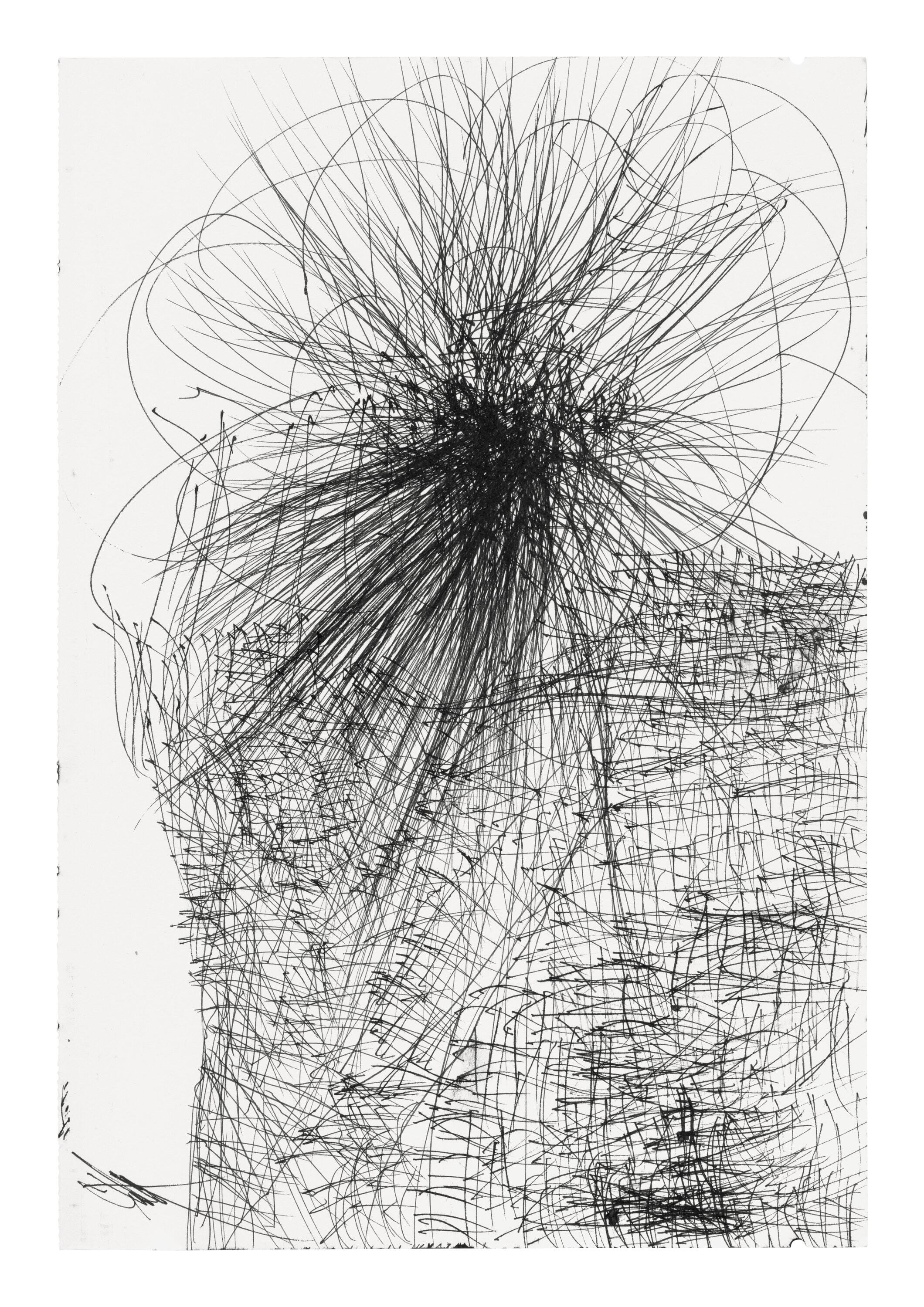Central to the exhibition are Sterling Ruby’s monochrome drawings, which he is showing for the first time. Executed in ink or graphite, they constitute an entirely new body of work. Raw and volatile energy fills each sheet in the same way Ginsberg’s excoriating words hit the page. The Beat Poet coined the phrase ‘first thought, best thought’ to describe a type of truth-telling born from naked experience. Ruby’s stream-of-consciousness images, which also eschew artistic self-censorship, evoke explosions, cyclones, and nets. Yet fragile glimpses of nature can also be detected amidst their frantic lines, such as a spider’s web or flower.