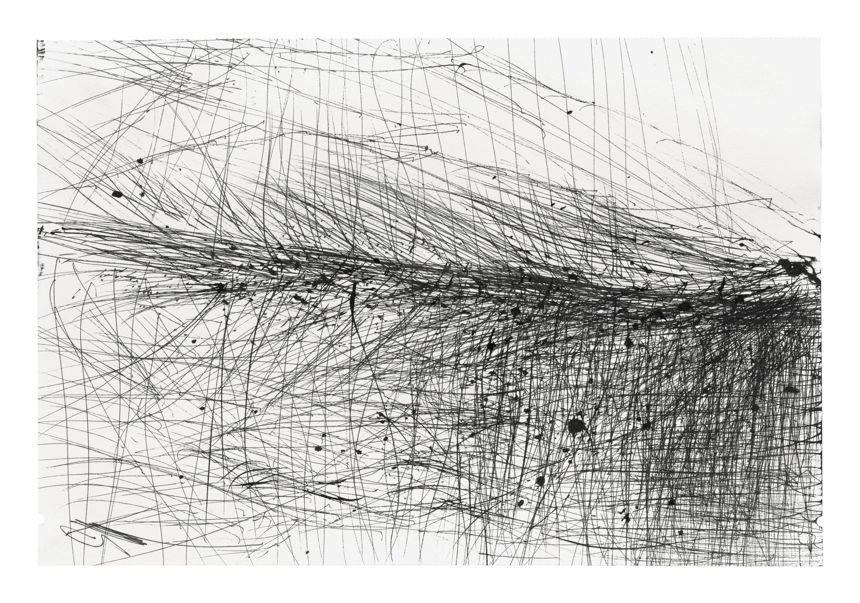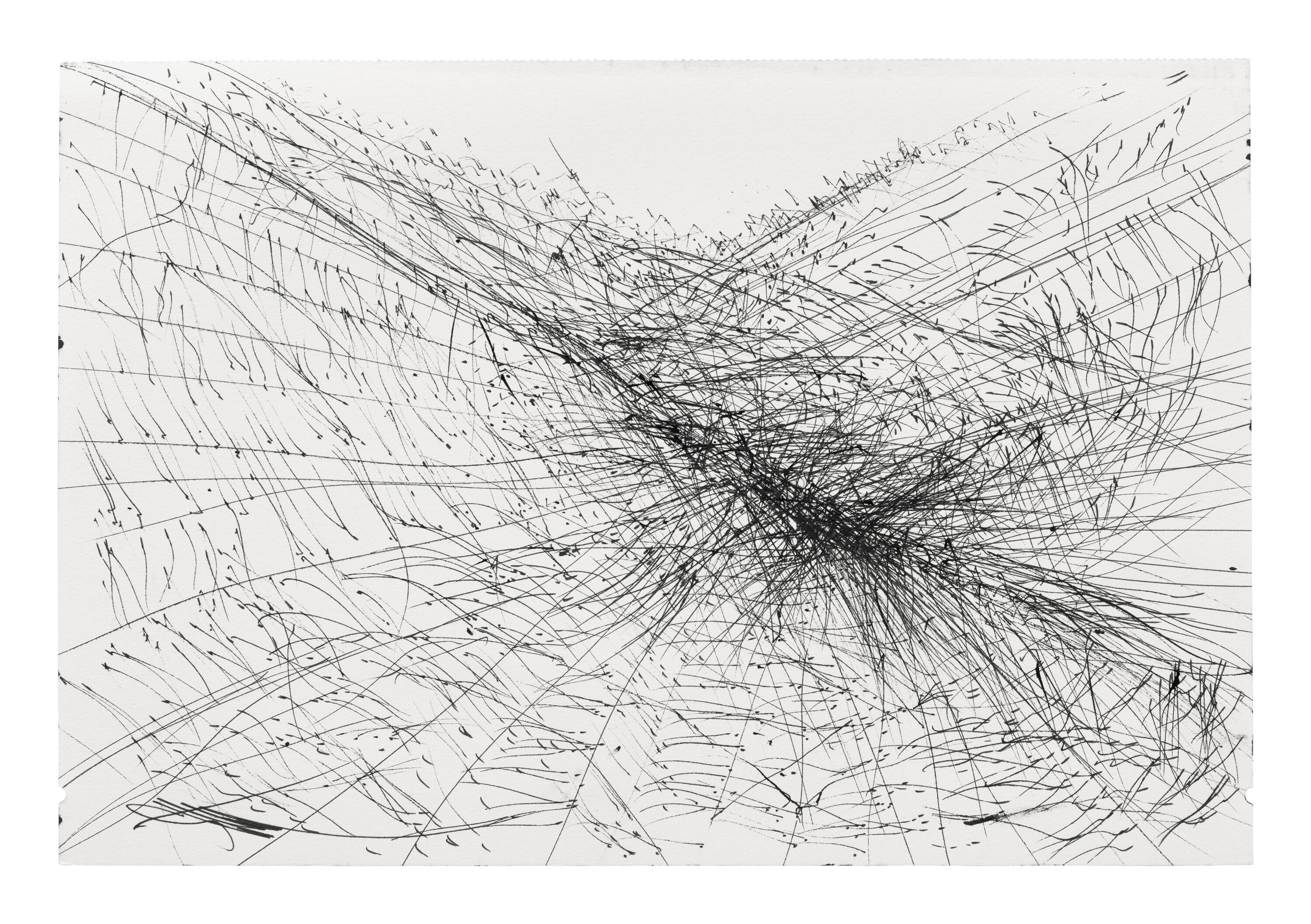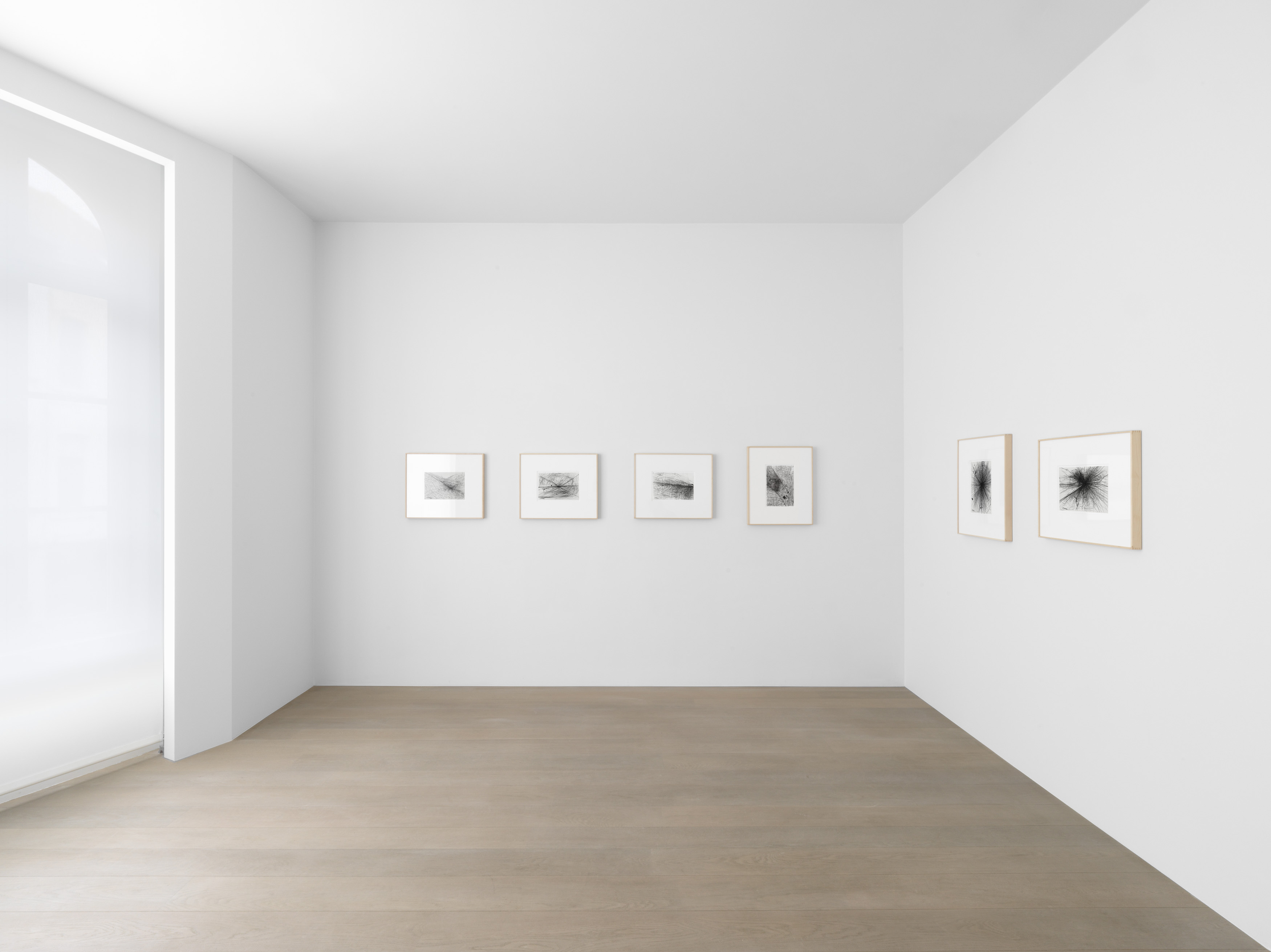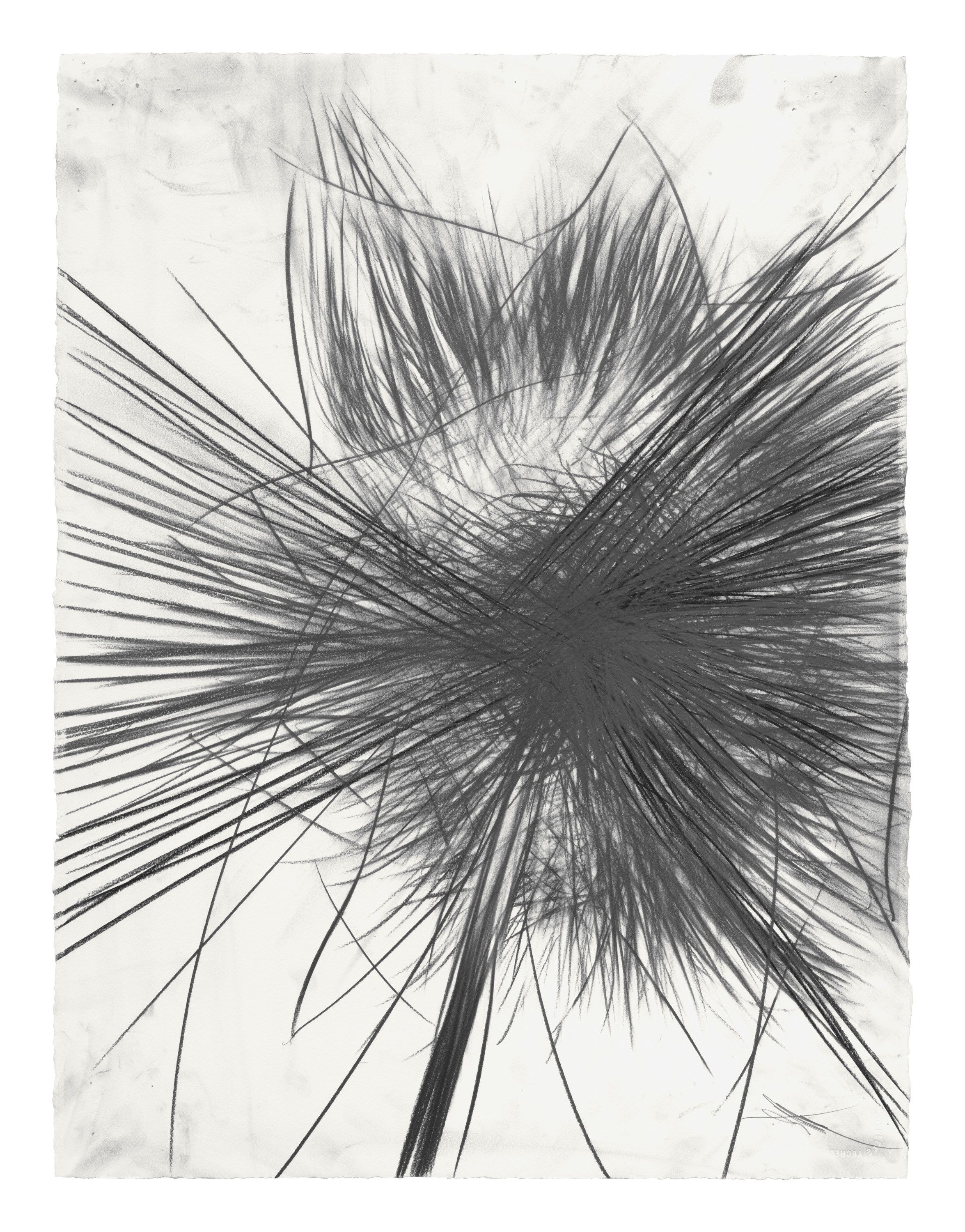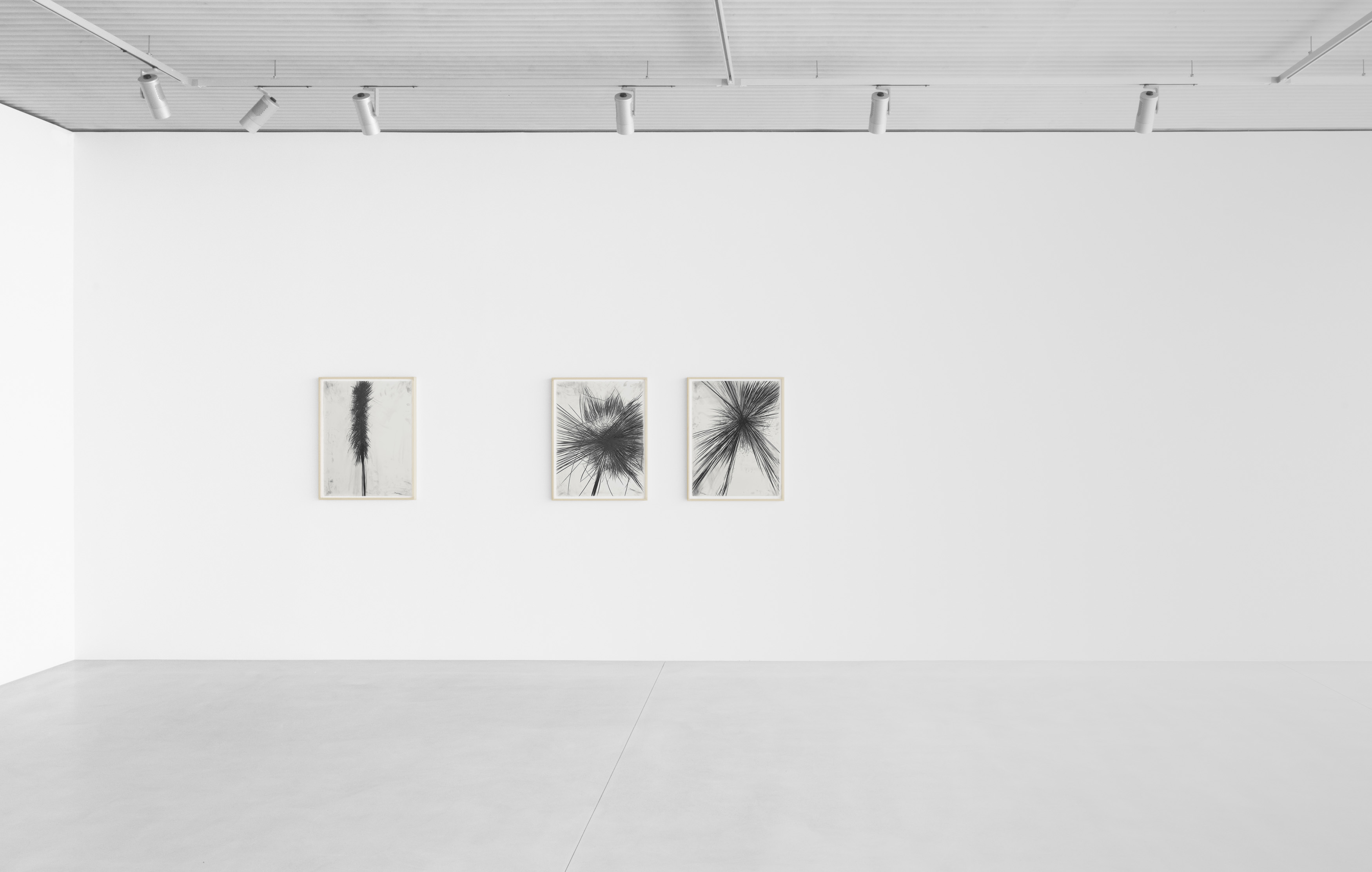 Central to the exhibition are Sterling Ruby’s monochrome drawings, which he is showing for the first time. Executed in ink or graphite, they constitute an entirely new body of work. Raw and volatile energy fills each sheet in the same way Ginsberg’s excoriating words hit the page. The Beat Poet coined the phrase ‘first thought, best thought’ to describe a type of truth-telling born from naked experience. Ruby’s stream-of-consciousness images, which also eschew artistic self-censorship, evoke explosions, cyclones, and nets. Yet fragile glimpses of nature can also be detected amidst their frantic lines, such as a spider’s web or flower.