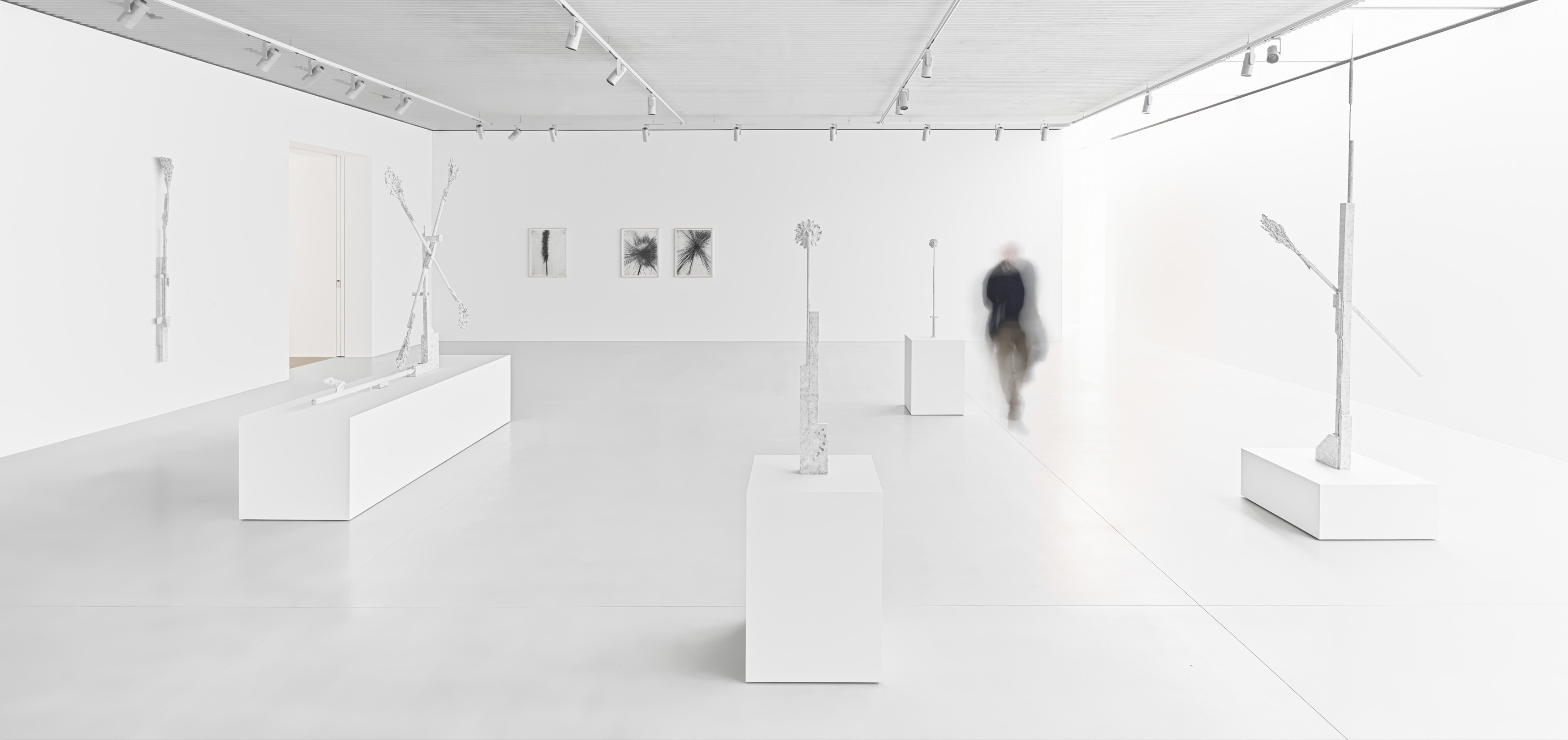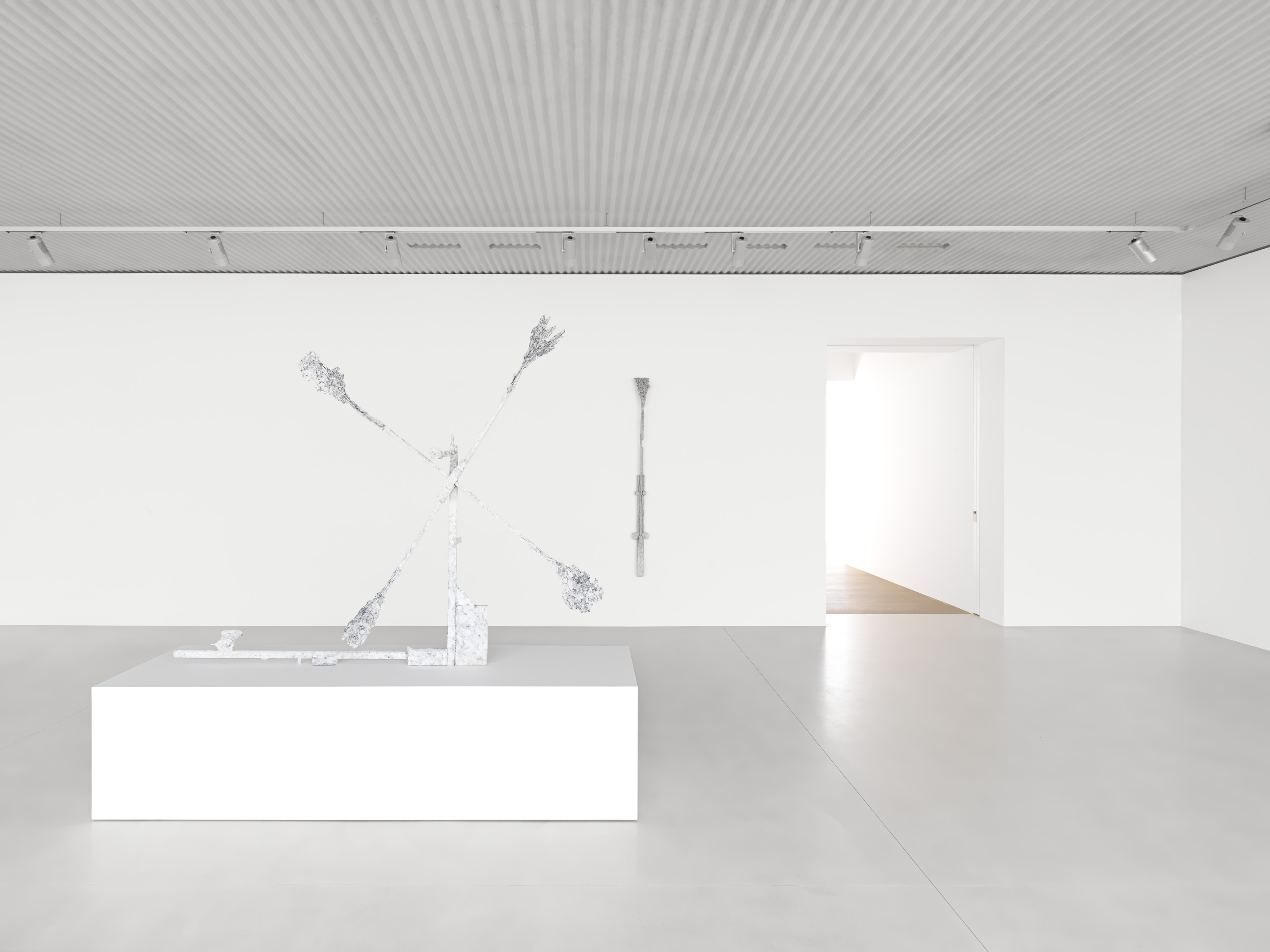 DROWSE MURMURS is Sterling Ruby’s most comprehensive exhibition with the gallery to date. Featuring four distinct bodies of new work—drawings, sculptures, paintings and ceramics—it provides a broad overview of the latest developments in his oeuvre. The presentation not only highlights the sweeping nature of his practice but also its material and thematic complexity. The contrasts that have shaped Ruby’s life—between his European roots and American upbringing, between rural Pennsylvania and urban Los Angeles, and between his father’s work for the military and his parents’ involvement with the hippie subculture—all serve as a catalyst for works in which the personal and political coincide. The title is borrowed from Allen Ginsberg’s poem Drowse Murmurs (1965) that echoes some of the most prescient themes of the exhibition, most notably the dialectic between war and peace, destruction and beauty.