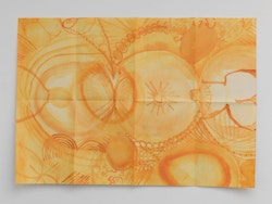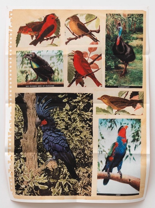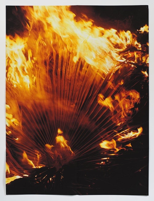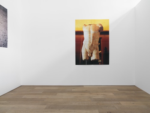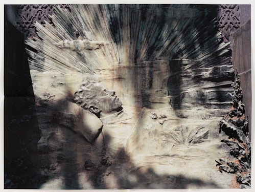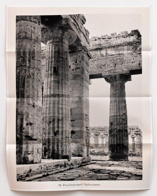 Pierson’s subjects are often relatively commonplace or travel-related – a sparkling sea, a book, a wooded path, pyramid or gravestone, for example – but, in their folded, large-scale format, and with their deeply saturated colours, the images acquire a poetic, evocative quality suffused with nostalgia, longing or, in in some of the most classically beautiful shots, a sense of euphoria. Nostalgia is a recurrent theme in Pierson’s work, and is reflected in both his found object sculptures (as seen in Jesus and Nazimova, Xavier Hufkens, 2012) and the images drawn from postcards, scrapbooks, magazines and other sorts of ephemera that appear in his recent photographs. Pierson has said that, in some senses, the subject is missing from his photographs: although taken in the present, they are not necessarily about the present, just as they are not necessarily about the image we see before us. Pierson is interested in photography as experience: in making images that allude to an unknowable past (that which has happened) or a possible future (that which might happen). In the gallery space, he arranges his images on the wall like a collage, playing with composition, colour, scale and height to create a carefully curated compendium of experiences and memories, colours and feelings.