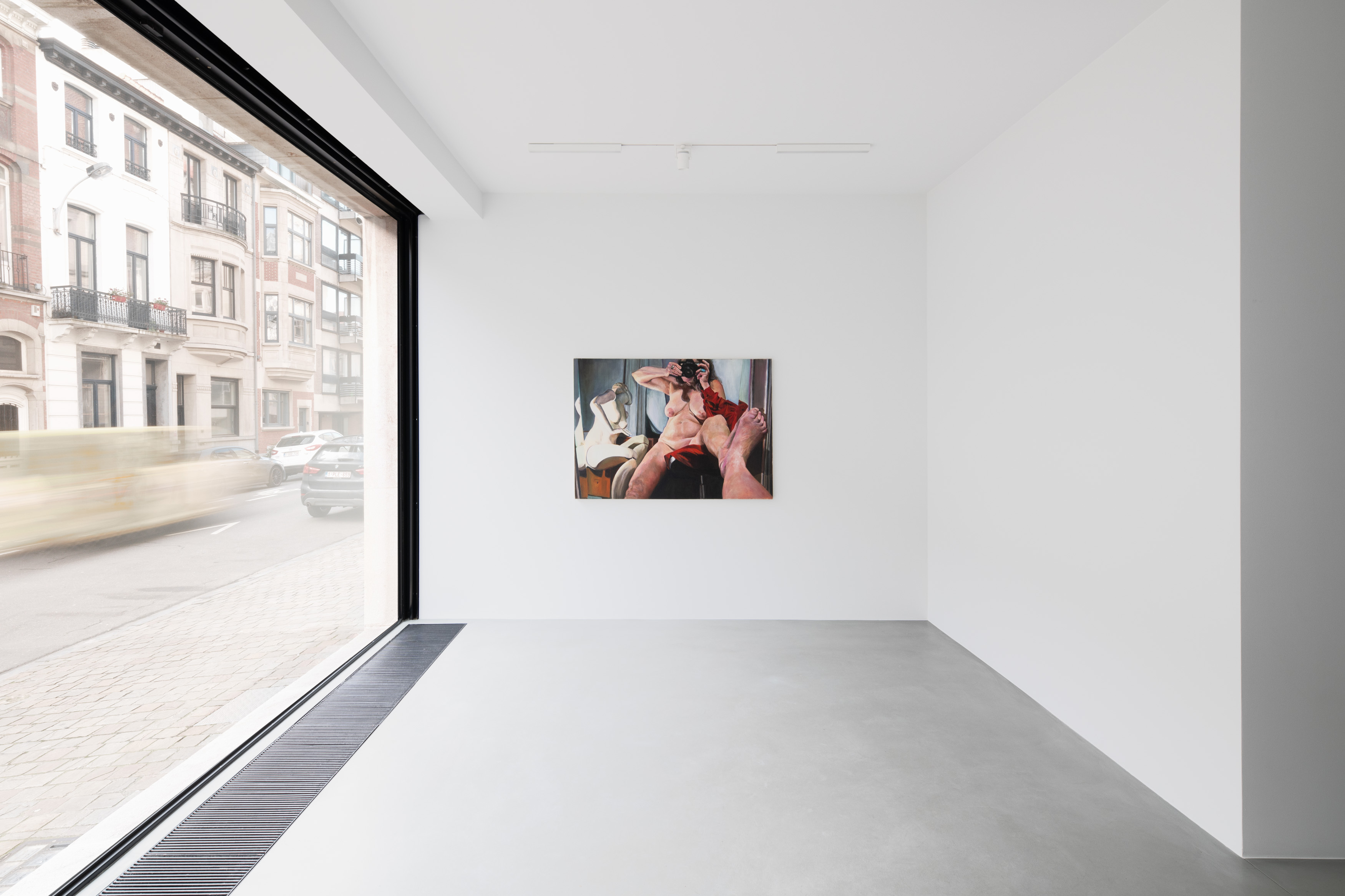 Works such as Baroque (2002) and Disappearing (2006) highlight important devices in Semmel’s work: mannequins, mirrors and cameras. Each object has a clear purpose. Baroque features a discarded mannequin, which Semmel found on the streets of New York. The painting is a dark critique on consumer culture and, in her own words “the mass production of the desirable female image”. The lifeless forms allude to the cult of youth and how women can be ‘discarded’ once they reach a certain age. On the other hand, mirrors and cameras, which are also featured in Baroque, have an empowering function. Semmel points the camera at a mirror to take a self-portrait but, via the reflection, simultaneously trains it on the viewer. A tripling of the female body — real (the foot on the glass), artificial (mannequin) and illusory (reflection) — but also a reversal of the female gaze: through the camera, the viewer also becomes a subject of the work. A painting about looking and being looked at. The mirror alludes to the artificiality of images and the construction of identity, but also to art itself: paintings and photographs are illusions, never the reality. Disappearing, which is based on a photograph, is noteworthy for replicating the blur of the original image in pigments, thereby creating a sense of movement.