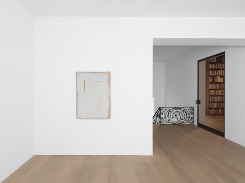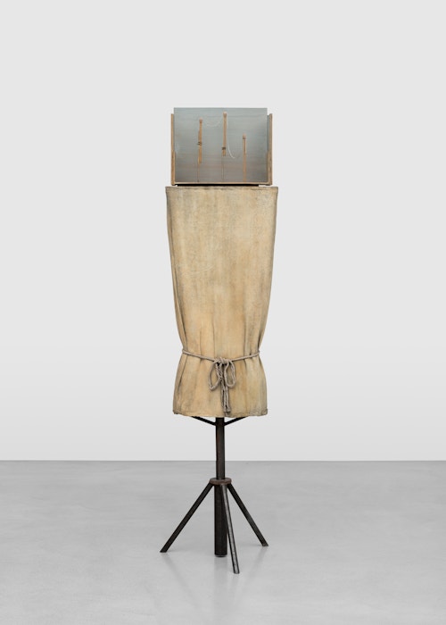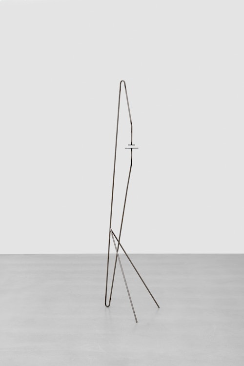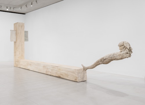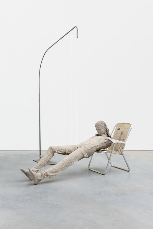 The exhibition opens in the landscape: Bonewhite Clay Head with Vertical Cloud (2024) and Figure with Two Cloud Paintings (2010-2024) both allude to the sky. The wooden structure in the latter work is familiar but unplaceable: it evokes a hangman’s frame or crucifix, possibly the beams of an architectural structure. The kouros-like figure – which references Mind Study (2010-11, Venice Biennale) – is captured in a state of suspended movement, either saved by the cord while falling or resisting its razor-sharp hold. The tension is palpable and everything is in perfect balance. The two canvases are white, like clouds. Together with the neutral hues, they lend an indeterminate status to the sculpture: a frozen moment that is both timeless and placeless. Nothing is what it seems and Manders is a master of illusion: this is neither wood nor clay. The artist models his sculptures in these materials before using the lost-wax method to cast them in bronze. They are subsequently painted by hand until the inorganic (metal) becomes indistinguishable from the organic (wood, clay).