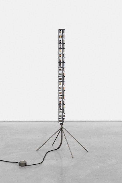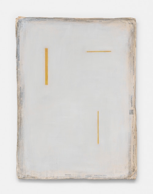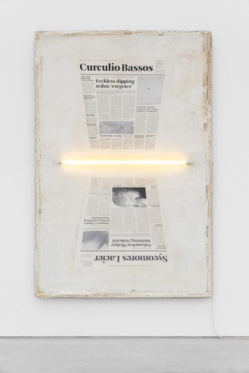 With its strip light and architectural composition, Perspective Study (2005-2024) features the newspapers that Manders devised for his Room With All Existing Words (2005-2022). For this latter project, the artist designed and printed ten newspapers that contain every word in the Oxford English Dictionary, each used once but in random order, to create columns of poetic nonsense. The papers recur throughout the exhibition in various guises, appearing in Figure with Thin White Rope