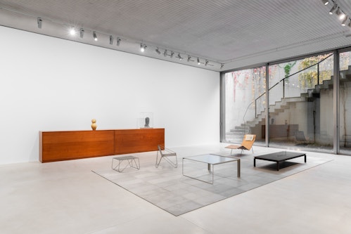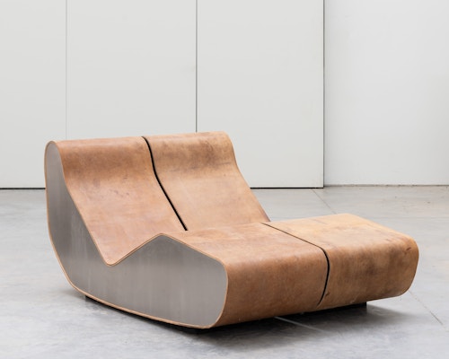 Floor with Prime Movers (2005-2024), on the lower ground floor, is an installation of Manders’ furniture pieces on steel tiles that, as with the bathroom, allude to minimalism. Every item has been designed and constructed by the artist: an array of objects with which to furnish the rooms of his ever-expanding ‘self-portrait’.