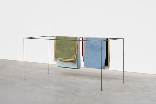 Isolated Bathroom / Composition with Four Colours (2005-2023) is situated on the first floor. The metal floor is a nod to minimalist sculpture, while the figure – devoid of limbs – is suggestive of both strength (wood) and vulnerability (clay). The juxtaposition is purely visual: this too is a painted bronze. The figure links back to the earlier Ramble Room Chair (2010), while the four colours – new to the oeuvre – were inspired by the nearby reenacted and staged photograph Colour Study (2001-2023). The hues recur in Table with Towels (1999-2023) while the original photo reappears in Studio Table (2024).