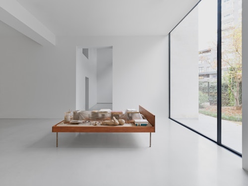 My Bed (1992-2024) occupies the garden-facing gallery. One side is filled with architectural maquettes and a collection of objects – suggestive of an identity – the other is empty. Absence is a familiar theme in the oeuvre, as Manders explains: “All the rooms seem as if they have been left behind by someone… as if the person who has created it has just left. You constantly see someone engaged in either thought processes or physical actions. It’s almost like stepping into a set that has just been vacated. Freezing time and making someone’s thought process visible. It all revolves around that single moment, but sometimes there can be twenty or thirty years in between. Yet it all appears as if it has just happened.” This work expands upon a similar installation that Manders showed at the Van Wassenhove house in 2023. Objects such as the clay figure, books and a pot with brushes make a reappearance, only the bedding has vanished. Stripped bare, so to speak, we can see that the bedframe is wood and the mattress is canvas. Combined, they suggest another plausible reading: the work as a metaphor for painting.