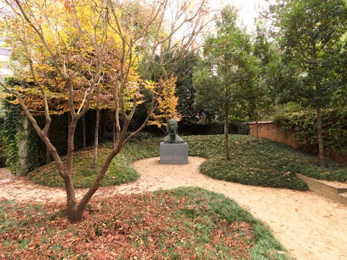 Shadow Study (2023-2024) presides over the garden. With its ancient-looking patina, it resembles a classical sculpture or archaeological relic. Manders often creates work in which wooden elements constrain or split the human figure. These allude to the nature of memory itself: how it can be legible yet fragmented, blocked and trapped, complete yet incomplete.