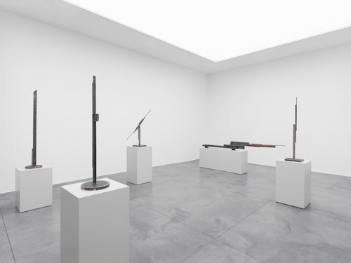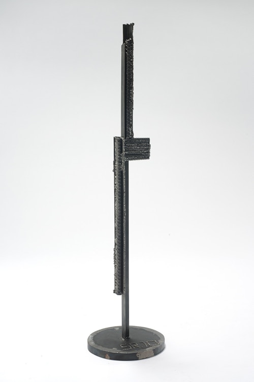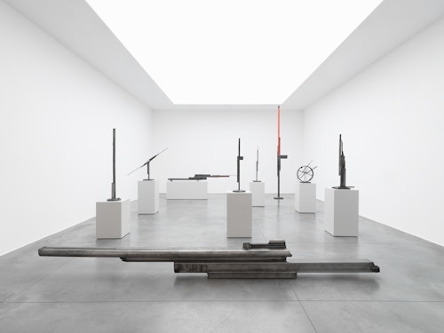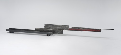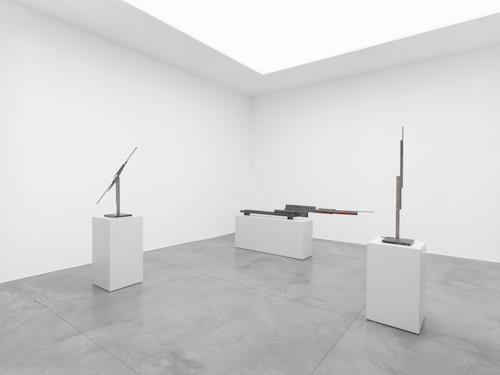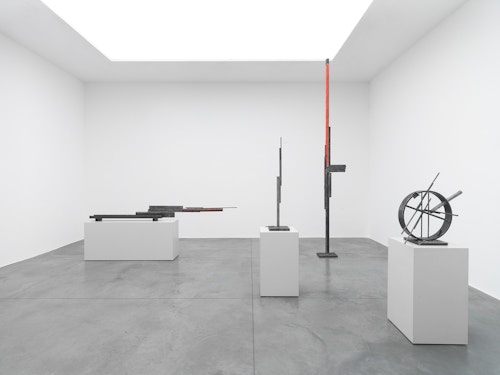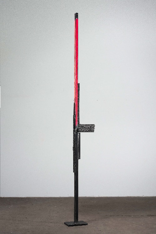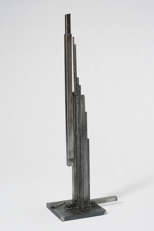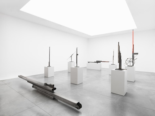 These pieces speak to the decay of the industrial heart of the American economy, and the power the country still maintains as the largest military-industrial complex in the world. Some of the pieces resemble models for sky-scrapers, while others resemble machine guns or rifles, some pieces suggest fragments of the American flag. The metal works call to mind a number of influences including Russian Constructivism, brutalist architecture, and more obscurely the weapons series by the Arte Povera artist, Pino Pascali.