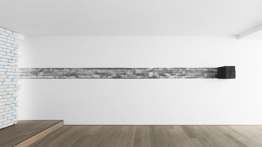 The line, as a leitmotiv, also possesses a conceptual significance. Lines divide, create borders, or establish thresholds. While this is immediately obvious when pure geometry gives way to organic form (or is it vice versa?), these junctures also call to mind other, more actual points of contact: the invisible barriers between seemingly different, contradictory and irreconcilable forces, peoples and cultures. But boundaries can also be permeable, as suggested by the sponge-like, porous textures of the bricks; soft as hinted at by the powdery charcoal; or fixed and impenetrable, like the unyielding metal.