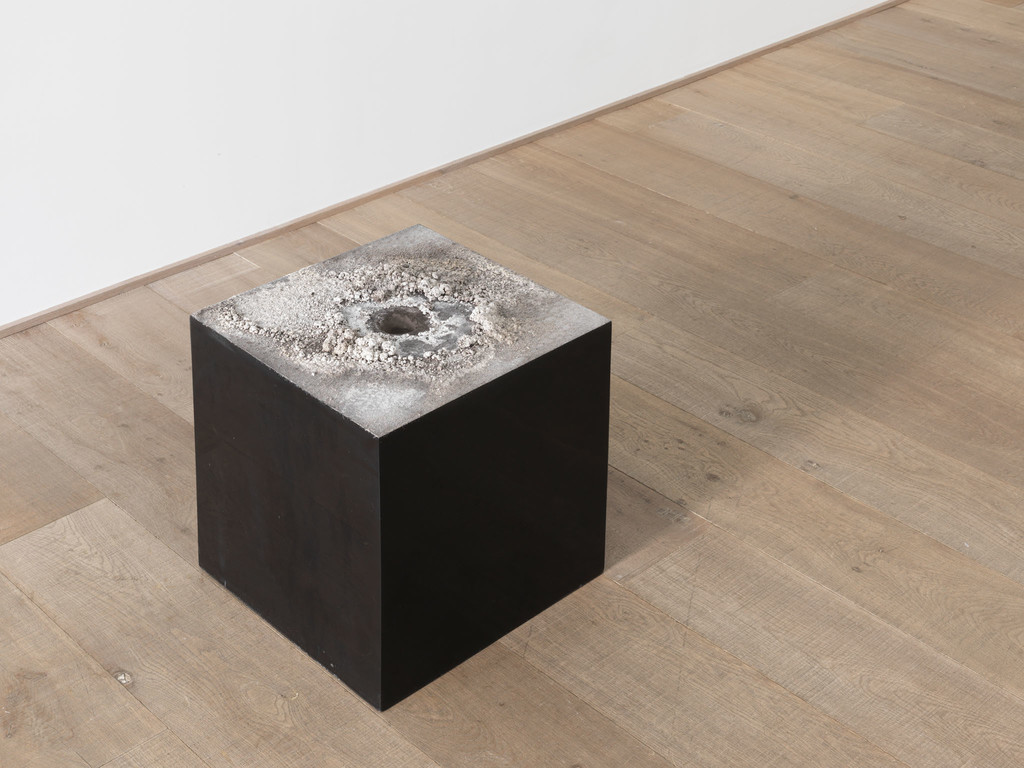 Shiny Corner materialises an equivalent transformation: to make this work, the artist hurled molten tin at the seam between his studio floor and wall. The hot metal hitting the cold surface caused it to solidify into globular rivulets, its motion and fluidity abruptly arrested. At the same time, this haphazard gesture also produced a perfect right angle that, now upended, completes the corner of the room. The same technique is used to opposite effect in the dark, matte, otherworldly sculptures made of asphalt, only here the works are dark, shadowy, light-absorbing, alien. Technical precision and chance are also evident in the artist’s Souffles perdussculptures. In the work on display, a cluster of individually mouth-blown, silvered glass balloons are tethered to a taught, vertical line. And as if to counteract the luminosity of the limpid, natural forms — filled with the breath of life, but also strangely deflated — a solid geometric cube of carbonised wood leaves its dark and dusty trail across the pristine, white-washed walls.