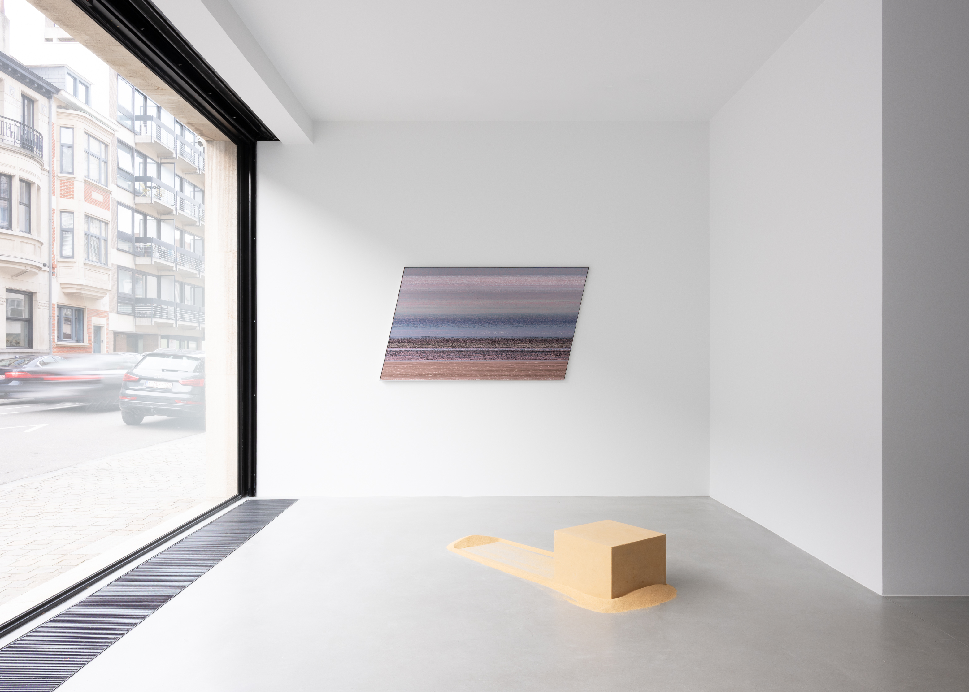 The Rotopaintings find a material counterpart in To erode (Sand) (2013-2026), the latest iteration in a series of works in which form emerges through erosion and loss. Through a minimal intervention — pushing a compacted cube of sand (itself an anomaly) across the ground — François activates erosion as an inevitable process. Edges soften, matter diminishes, and the geometric, three-dimensional block gradually disintegrates into flat, organic patterns on the floor.