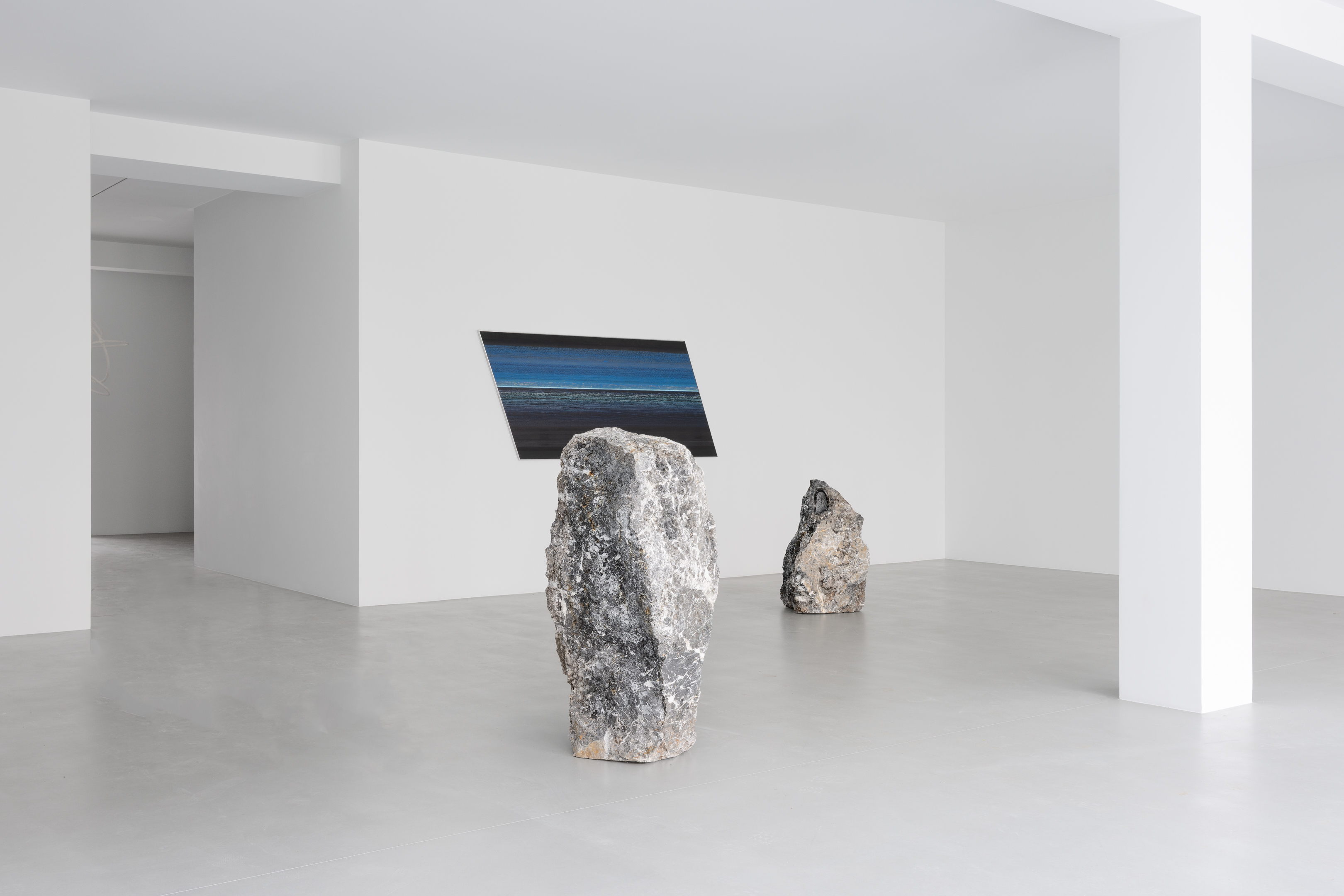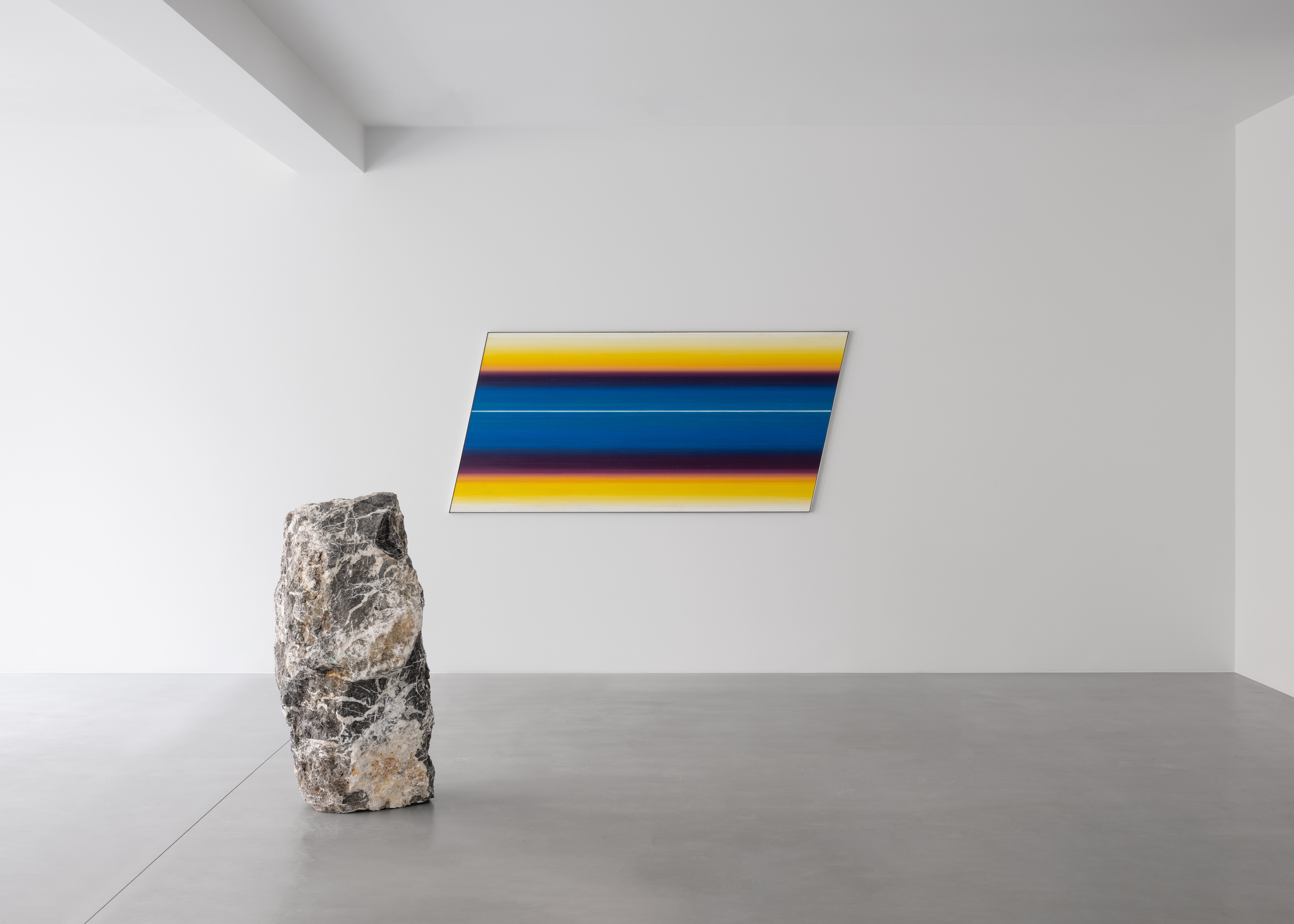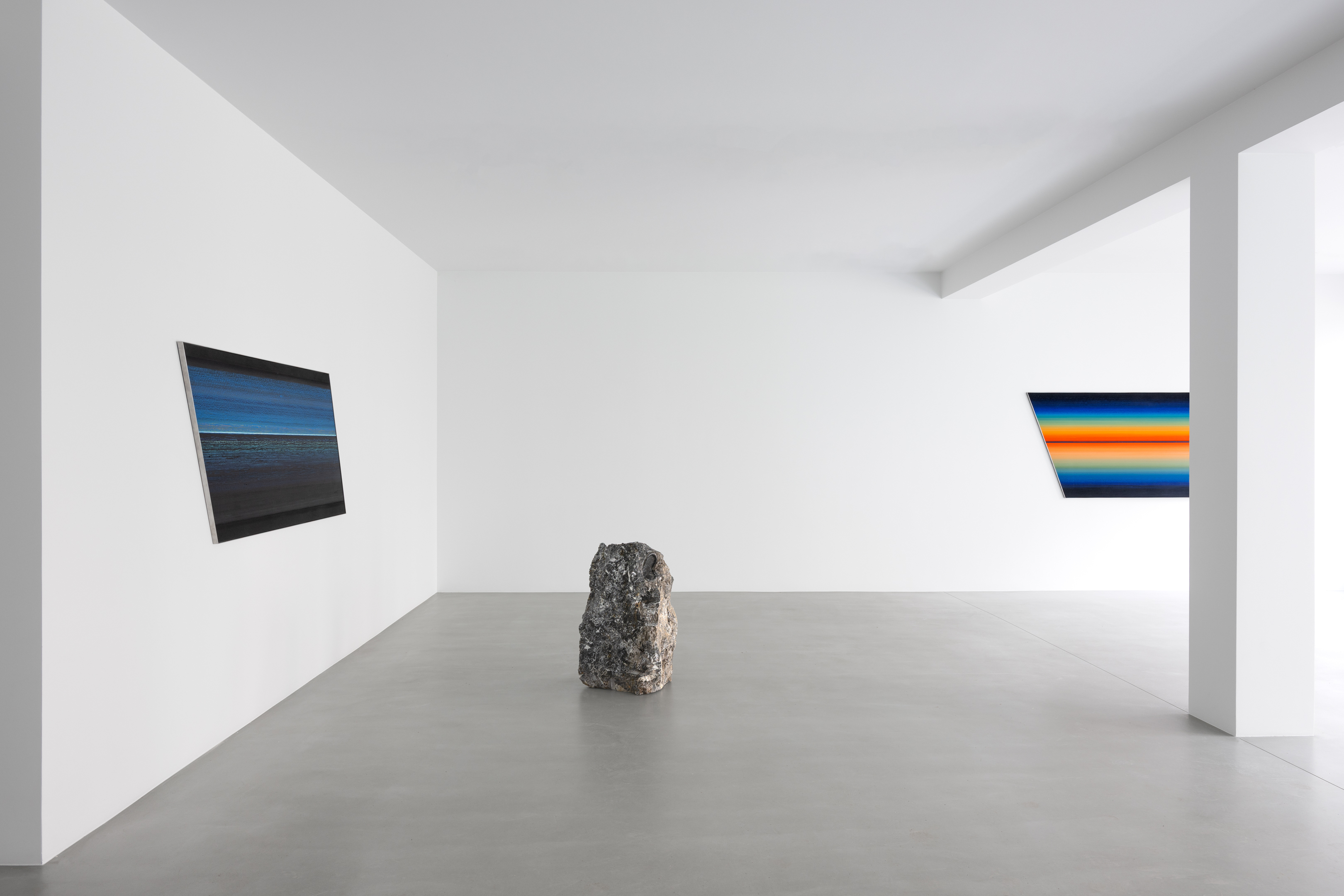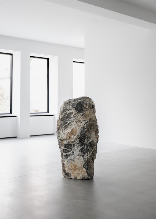 Across the exhibition, François consistently draws attention to moments where agency gives way to automatism, form emerges through loss, and images arise from contact rather than control. Movement operates as both a visible and invisible force — simultaneously method and result. It may be fast and vital, as in the Rotopaintings and the ‘scribble’ lamp, or slow, as in a yawn or a block of sand pushed across the floor. A subtle irony ripples throughout the exhibition, particularly where speed or stillness generate opposing dynamics. Stone yawns, sand erodes, pigment disappears. Through these processes, the artist invites contemplation of vitality and enervation, duration, and the transformations — both fleeting and protracted — that shape bodies and matter alike.