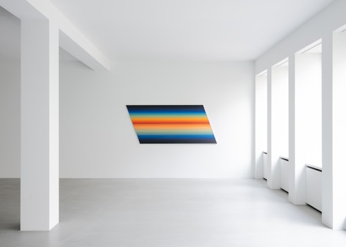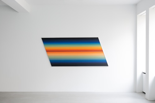 The Rotopaintings are created using a fast-moving machine of the artist’s own design, fitted with industrial sandpaper belts. Unlike conventional painting, where the canvas is static and the artist moves, here the opposite occurs: the surface rotates at high speed, while François remains largely still, briefly touching a stick of oil pigment to the moving surface. Friction produces horizontal bands of colour that accumulate in strata, evoking landscapes and distant horizons, but also bands of static interference. Classical in appearance, the works are generated through relentless motion and erosion: the sandpaper rapidly grinds down the oil stick, visibly consuming the pigment as the image comes into being. Trimmed diagonally along the cutting lines of the industrial sheets, the paintings take the form of parallelograms. Lines — both controlled and uncontrolled — recur throughout François’s oeuvre, and the title Rotopaintings subtly situates the works within a tradition of artists who have used mechanical processes to question authorship, perception and the primacy of the hand, such as Marcel Duchamp’s Rotoreliefs or Piero Manzoni’s Linee.