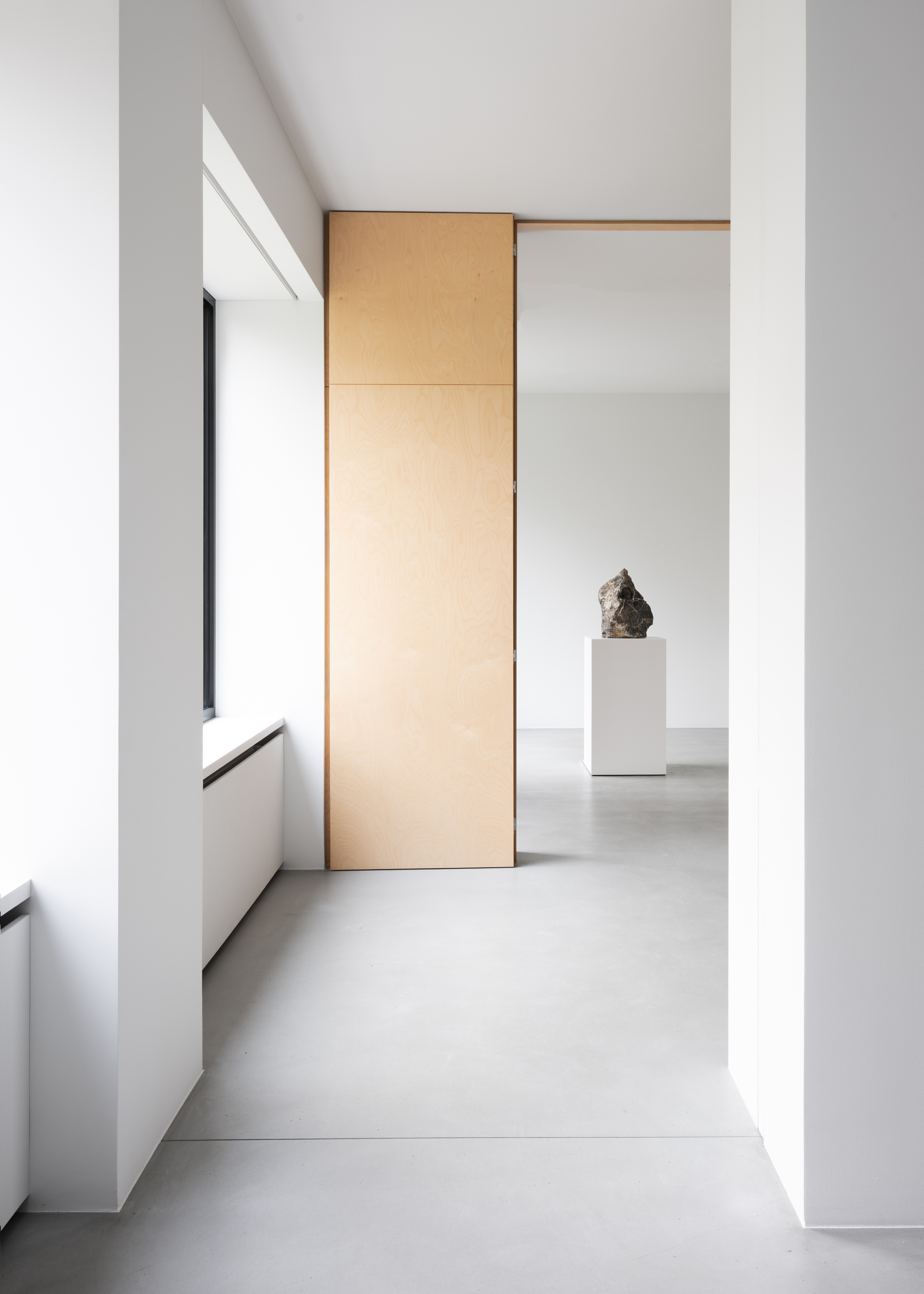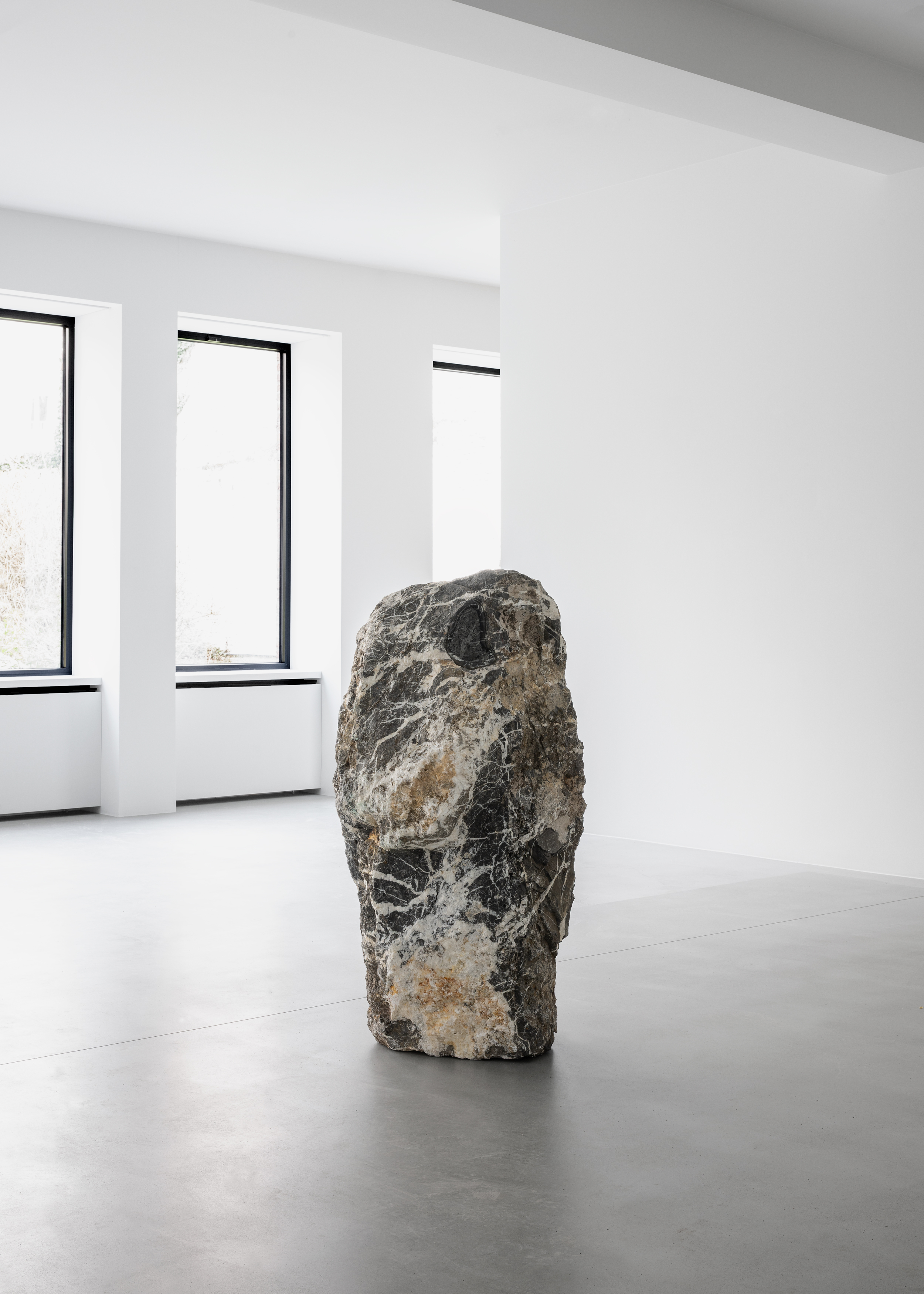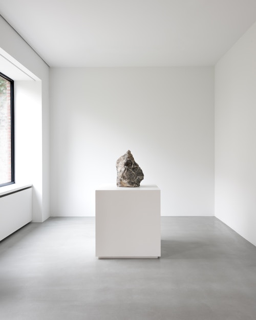 Involuntary forces are also at play in the Yawning Stones (2025), a collaboration between Michel François and the Brussels-based British artist Douglas Eynon (b. 1989). These sculptures take the form of boulders with gaping, mouth-like openings. Partly inspired by Yawning Man (c. 1563), a painting attributed to Pieter Bruegel the Elder in the collection of the Royal Museums of Fine Arts of Belgium (KMSKB), the works also resonate with a long art-historical lineage of yawners, from Messerschmidt and Joseph Ducreux’s Self-Portrait, Yawning (1783) to Degas’s Women Ironing (1884-86). Here, a physiological automatism — the yawn — is translated into an enduring mineral form. Typically lasting only a few seconds, the involuntary gesture is petrified, quite literally, as if arrested mid-motion. Stripped of expression, the yawn becomes a void: an opening that suggests fatigue, boredom and a momentary collapse of agency. The motif has long preoccupied François, who also explored it in the early 1990s in a black-and-white photographic wallpaper. Still not fully understood scientifically, yawning is also cloaked in superstition, largely because it is reflexive, contagious and momentarily unsettling — a brief loss of control that cultures have sought to explain, ward off or ritualise.