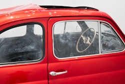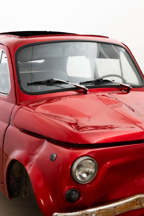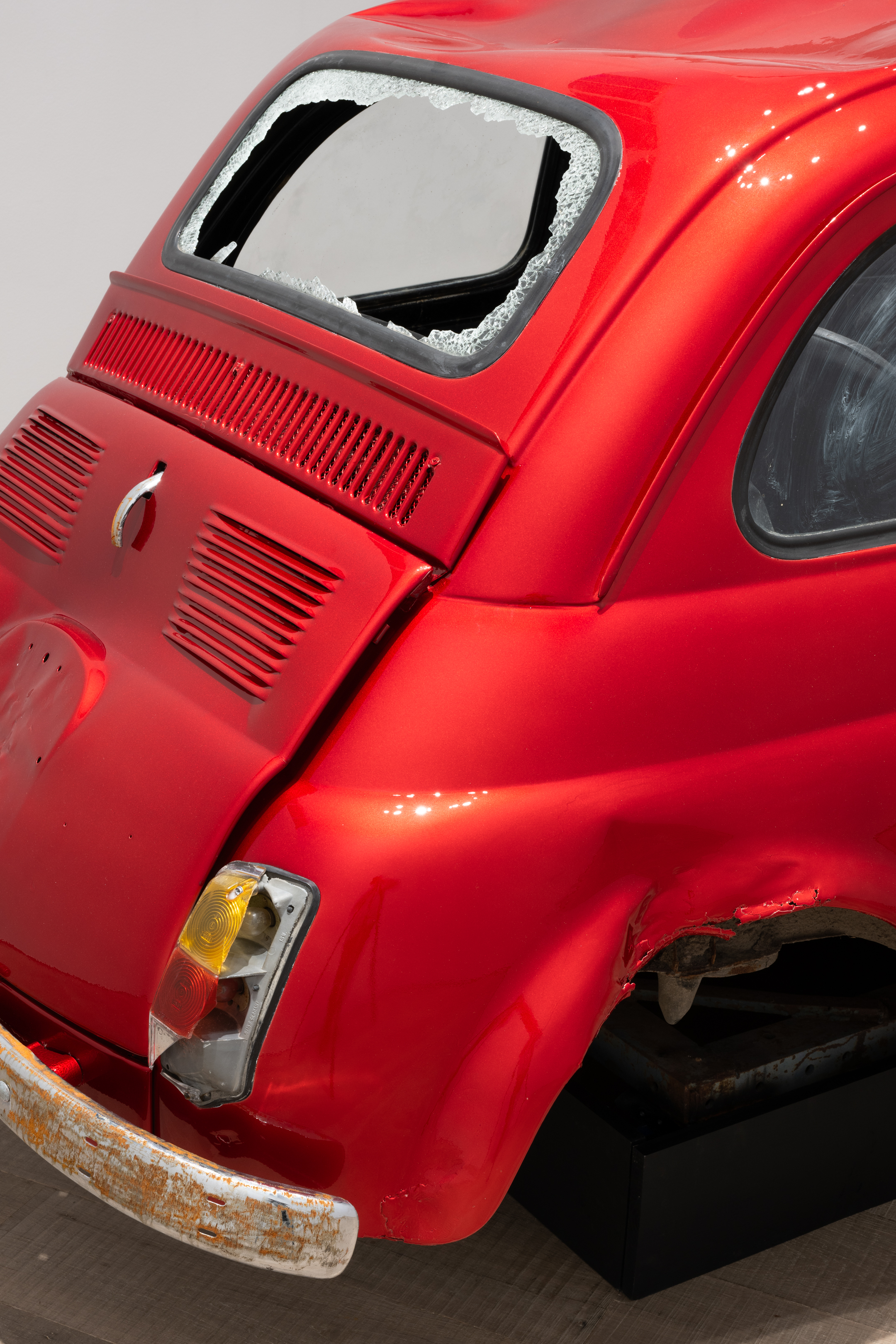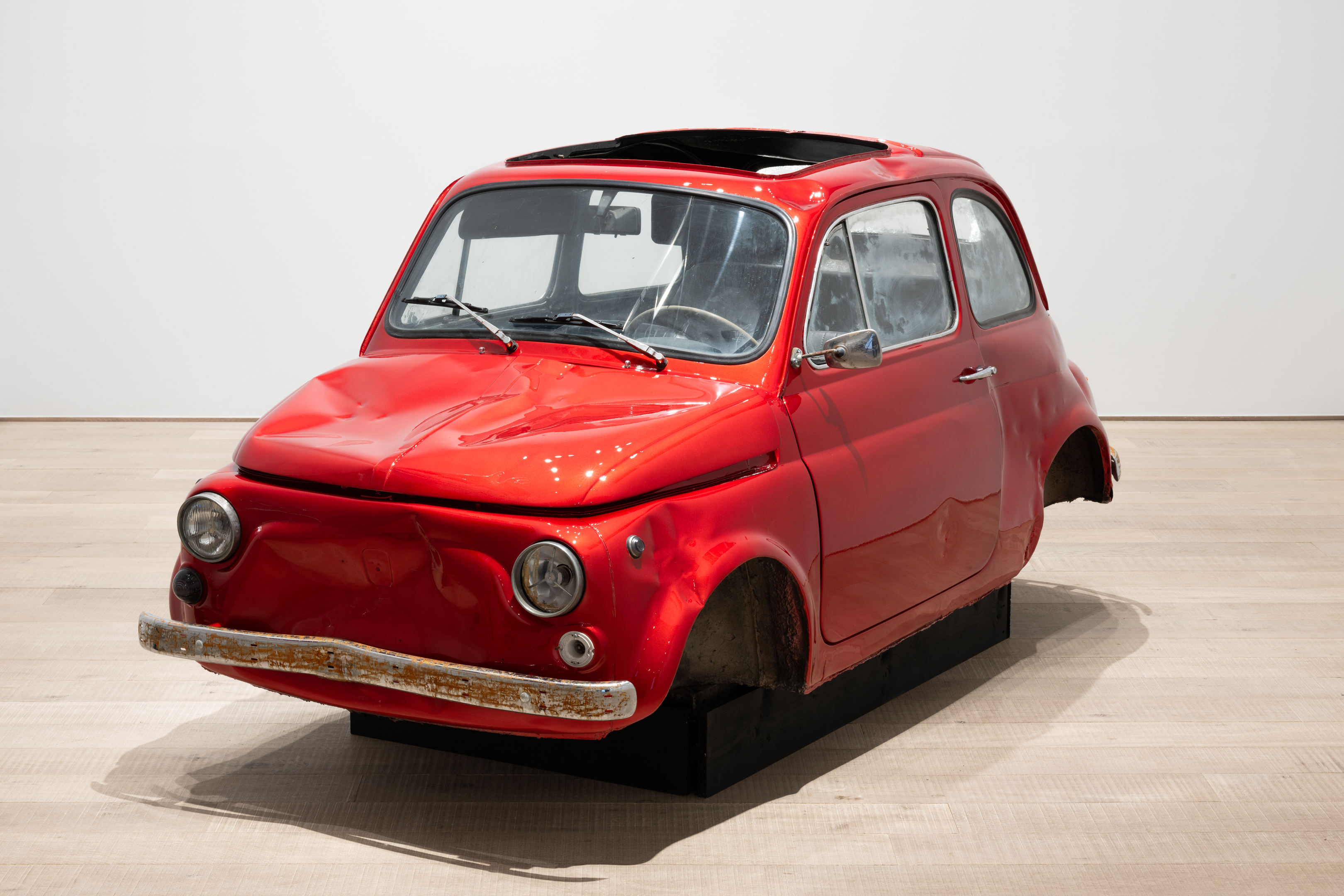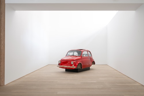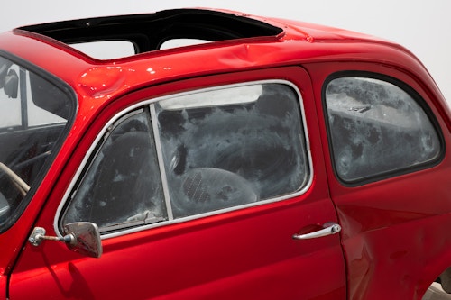 Unlike the American artists associated with cars, such as Warhol or Charles Ray, Lavier neither aestheticises disaster nor fabricates it. He selects a wrecked vehicle and presents it as a fait accompli: the damage is not produced but ‘found’. Its destruction generates a new form, showing how a sculpture can exist without being ‘made’ in any conventional sense. Part Duchampian ready-made, part painted object, Fiat 500 becomes a hybrid artefact that short-circuits perception: is it sculpture, painting, or both? The dissonance between model and paint colour further sharpens the work’s conceptual edge: this is not simply red, but Lamborghini red — a reminder that naming itself produces meaning. Stripped of function and steeped in design and brand mythology, the car is reborn as a singular ruin — seductive and disturbing, pristine and damaged, an object of both desire and disquiet.
