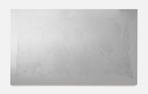 a painted mirror, a painted Fujichrome, and a juxtaposed colour painting. In the vitrine, Lavier transforms a utilitarian surface into an ambiguous pictorial field. Starting from a photograph of a blanked-out shop window (in this case, from Rue Elzevir, which is named after the seventeenth-century Dutch publishing dynasty), he digitally transfers it onto canvas, collapsing distinctions between transparency and surface, display and depiction. A site of commerce becomes a stage for painterly gesture, raising questions about what separates images from objects and art from display. Two layers of anonymity coexist: the unknown painter who obscured the vitrine and the technician who printed the image. Lavier himself is both absent (his hand is not visible) and present (the work exists through his orchestration).