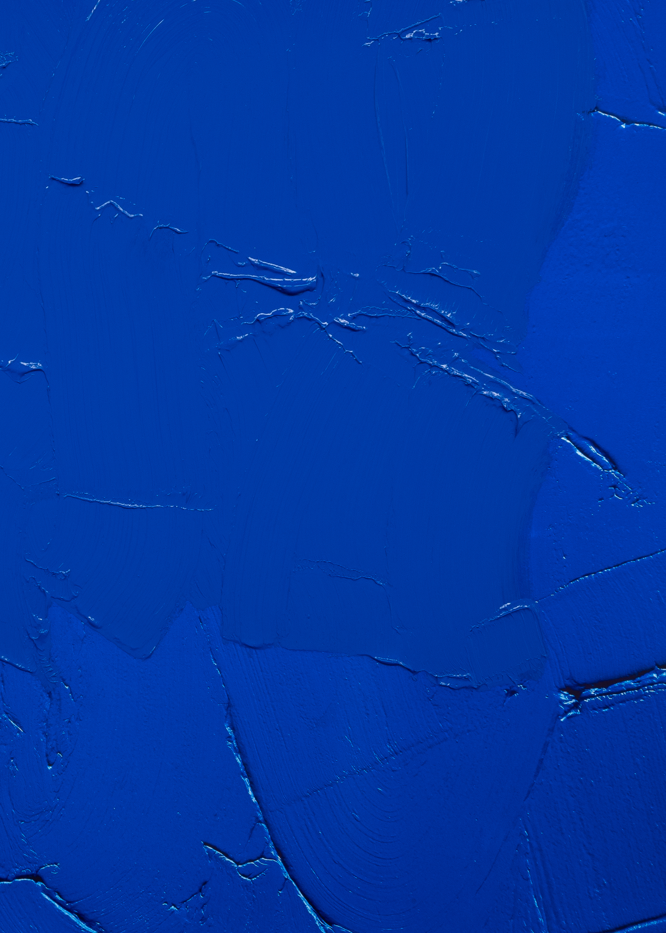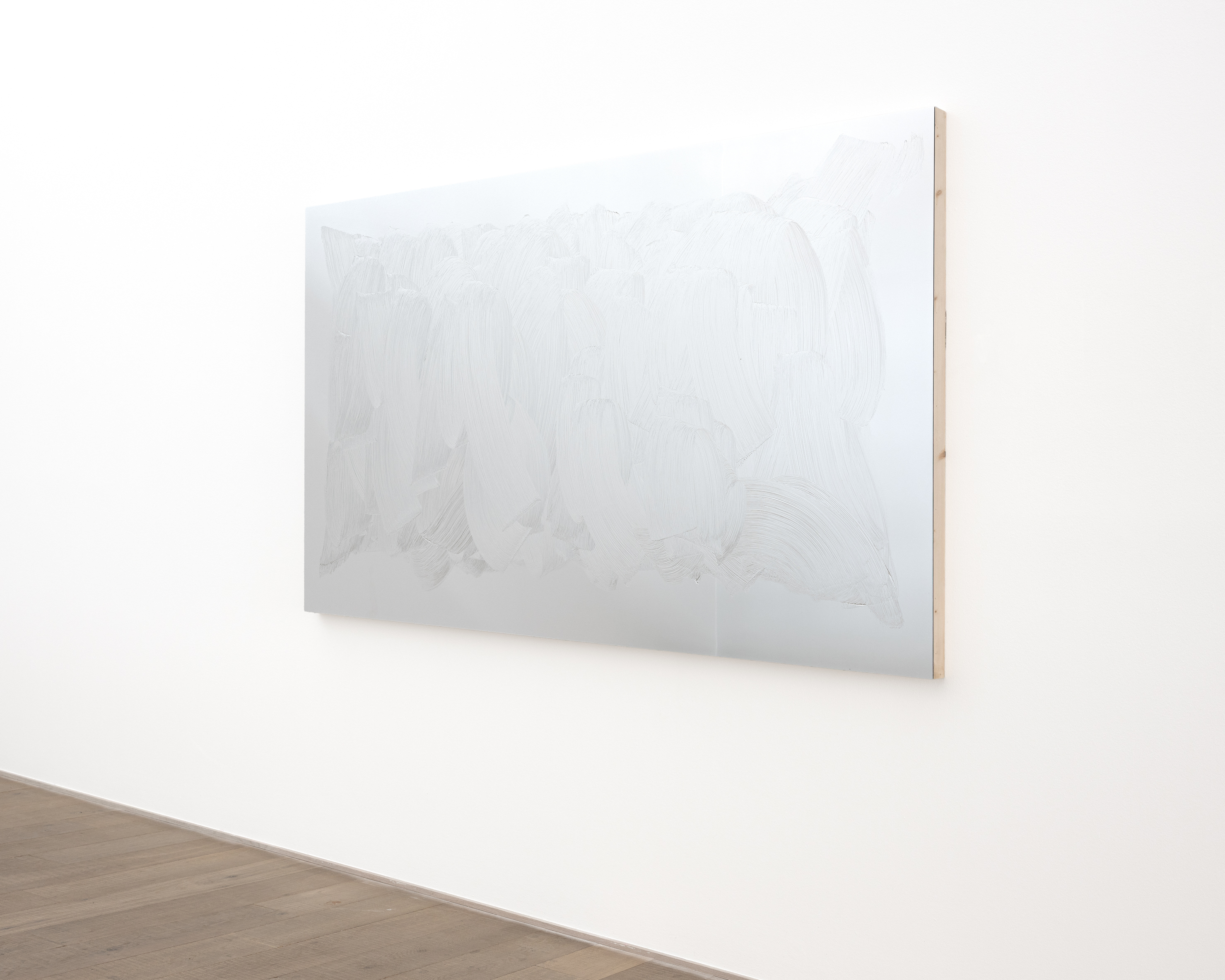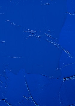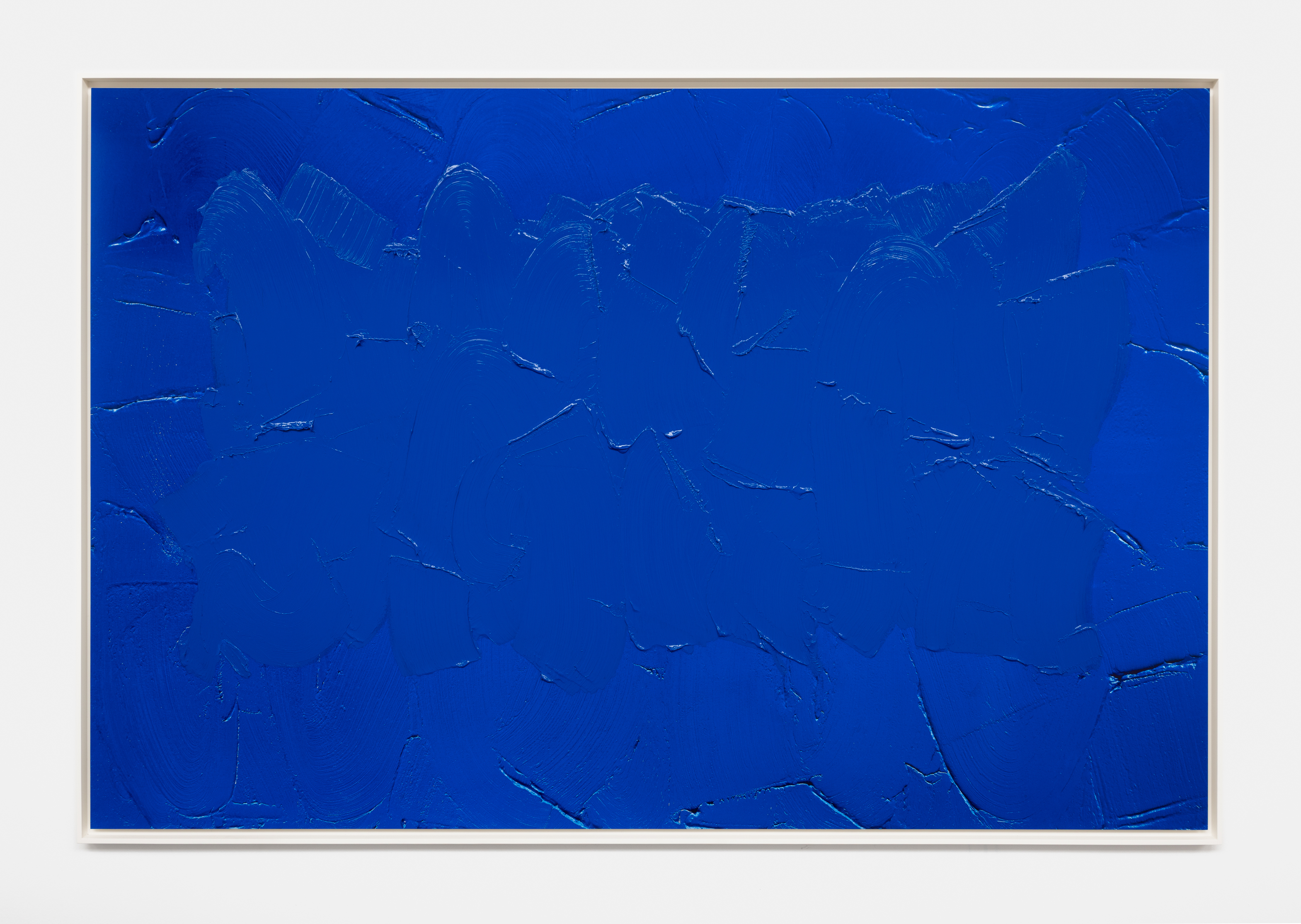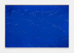 The painted mirror operates on a similar threshold. Here, painting disrupts reflection, preventing the viewer from accessing their own image. The mirror ceases to function as a tool of self-recognition and becomes a paradoxical object — one that reflects painting rather than the viewer. In Bleu de Cobalt (2025), the painted Fujichrome, Lavier again intervenes in the logic of photographic reproduction: painting tone-on-tone onto a print of a blue surface, he introduces the hand into a medium associated with mechanical precision. The result is a hybrid surface in which photography’s promise of objectivity is destabilised by painterly subjectivity, blurring the divide between lens-based image and painted gesture.