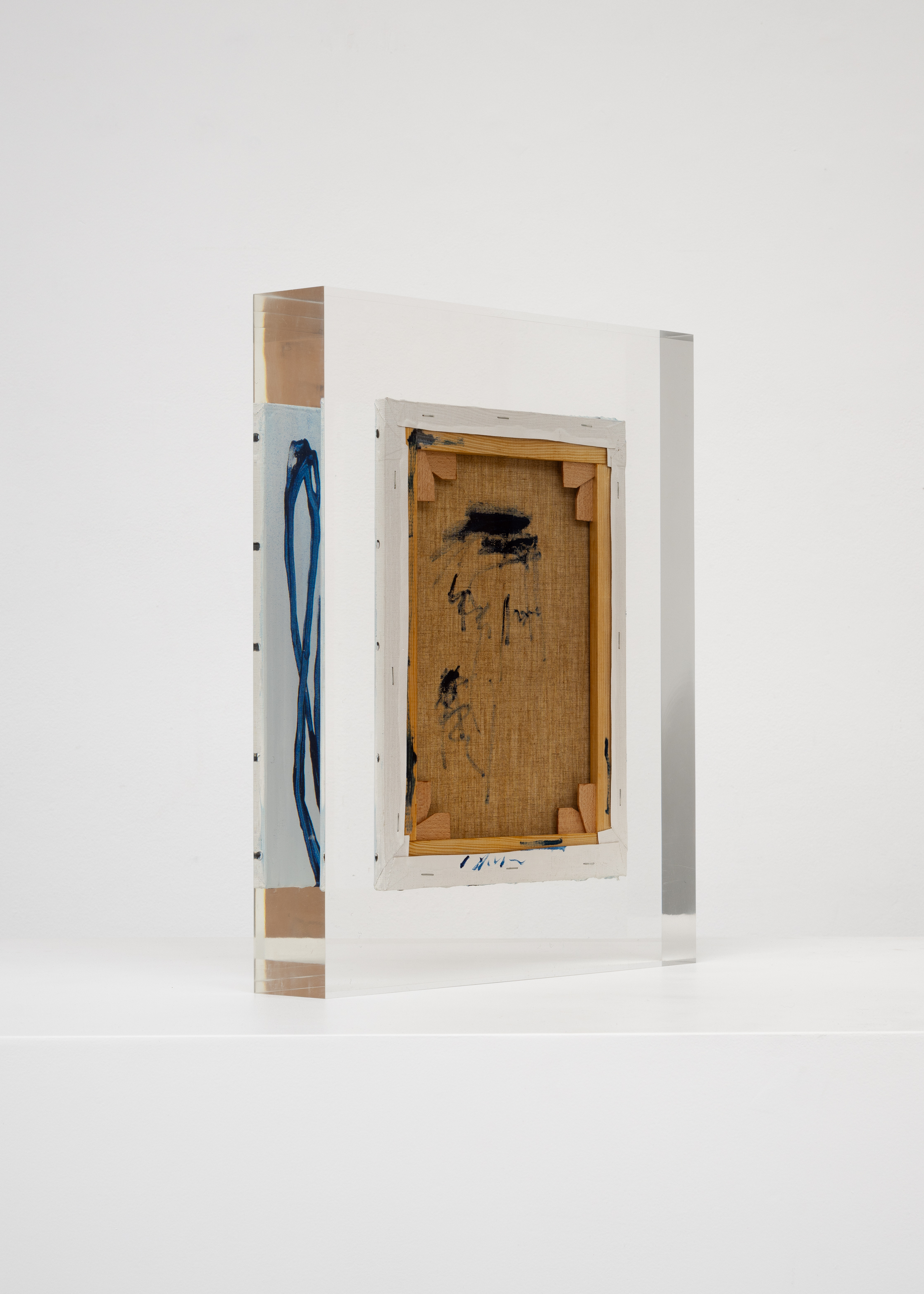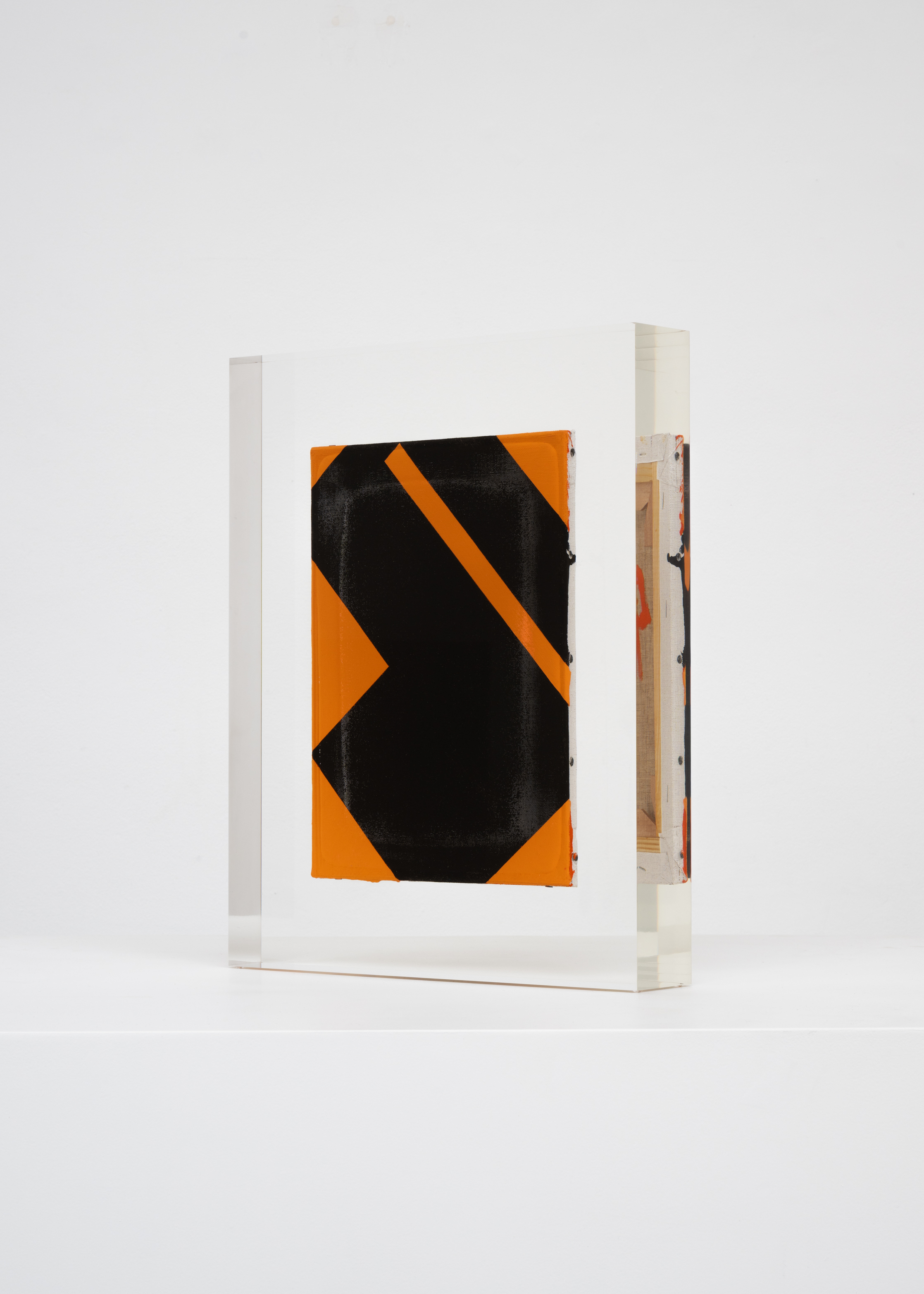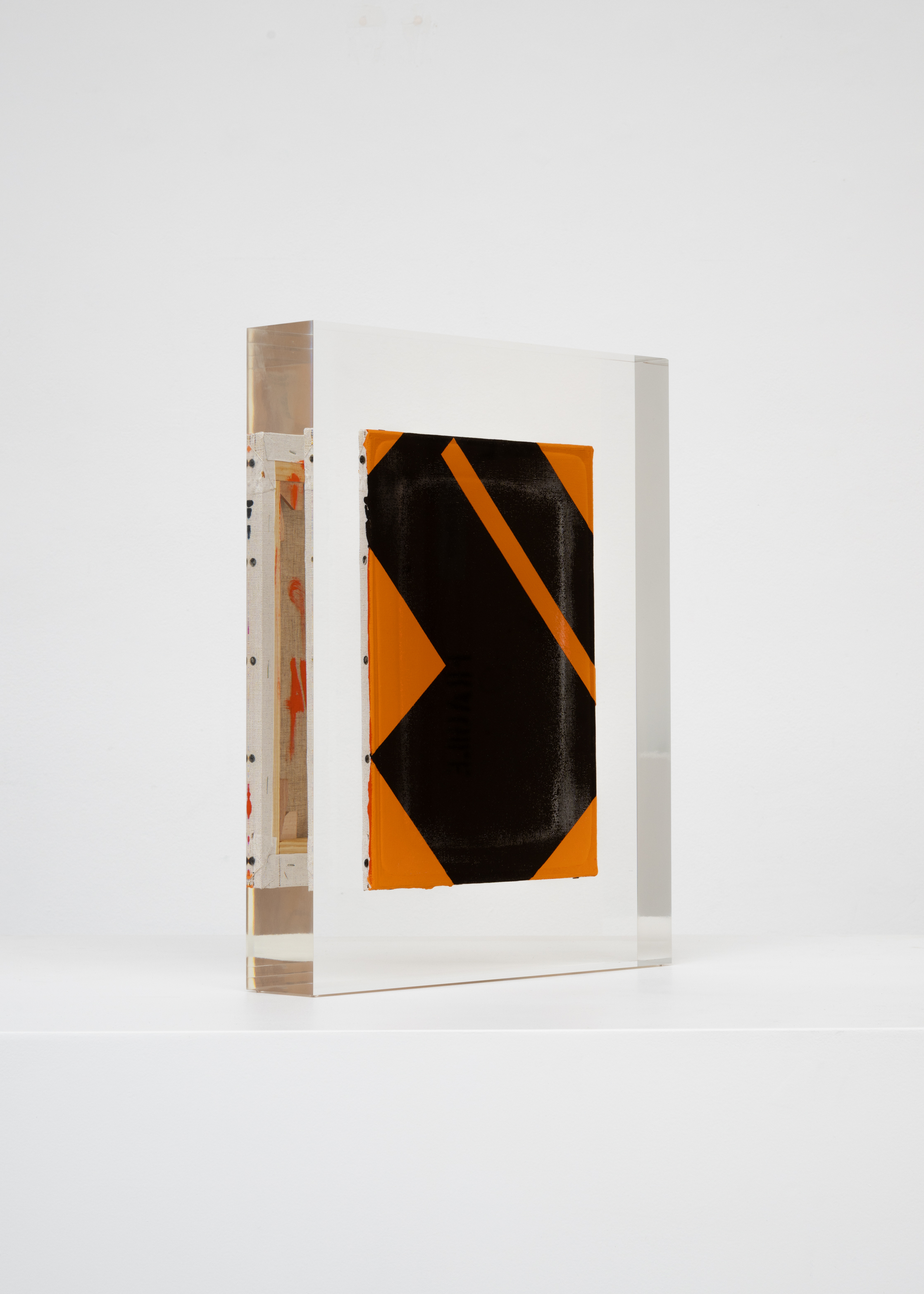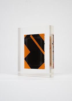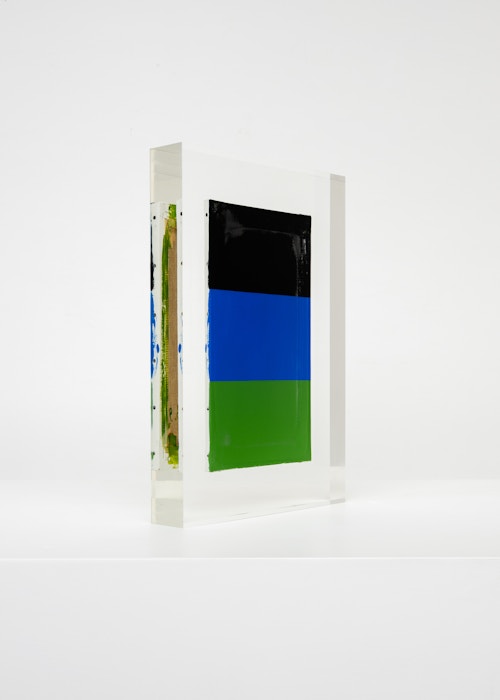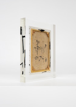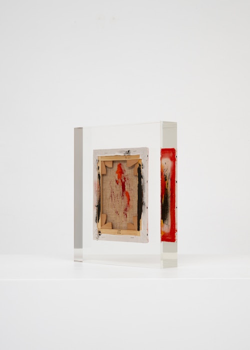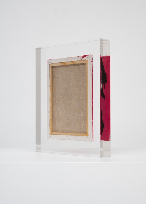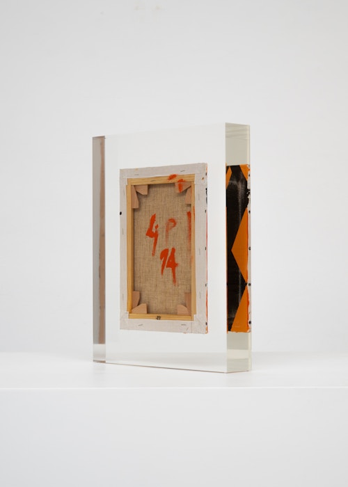 Upstairs, Lavier introduces a new body of work: Inclusions. These abstract canvases — found in flea markets and junk shops — are encased in blocks of acrylic resin. As with the wrecked Fiat 500, these works are ‘found’ rather than made: Lavier’s intervention is conceptual, grounded in selection and display rather than painterly authorship. Encapsulation produces another kind of perceptual short circuit. While the gesture recalls the New Realists, especially Arman, here it probes a modernist taboo: the separation of painting from sculpture. With both the front and back of each canvas visible, traditional viewing hierarchies dissolve. These once-anonymous paintings are suspended between states: object and sculpture, discarded and elevated, protected and entombed. Arranged as what Lavier calls an ‘abstract bouquet’, the seven works playfully challenge orientation and display, to quote Lavier, ‘the reverse side becoming more interesting than the front’. At the same time, the paintings selected for the Inclusions are diverse enough that they resemble a group show — an idea that harks back to, and expands upon, Lavier’s previous exhibition at the gallery, Walt Disney Productions (2016), where he explored abstract painting and its representation in popular culture.