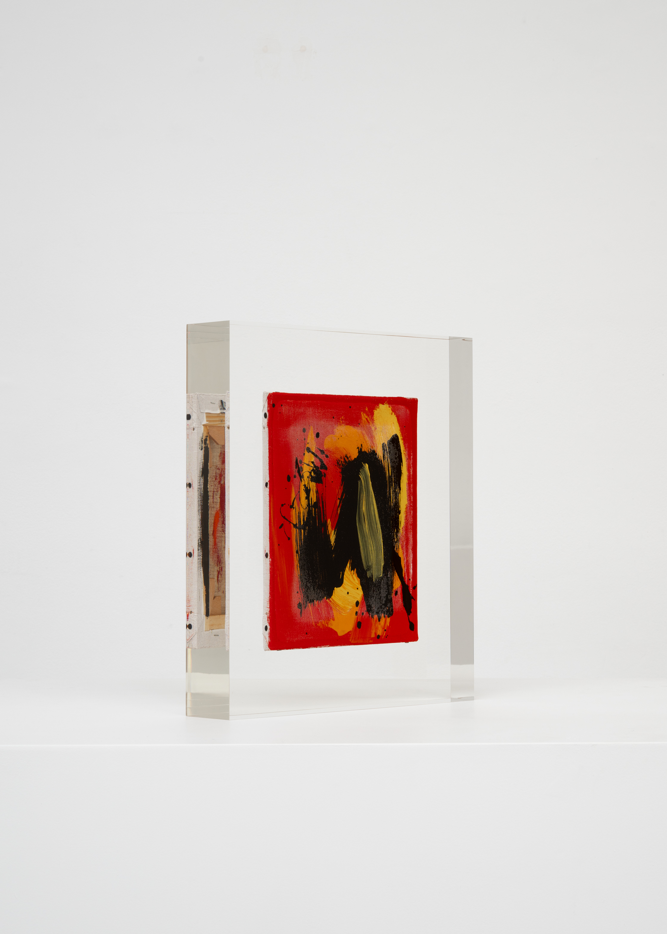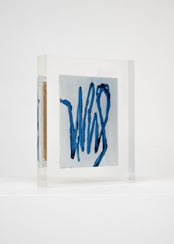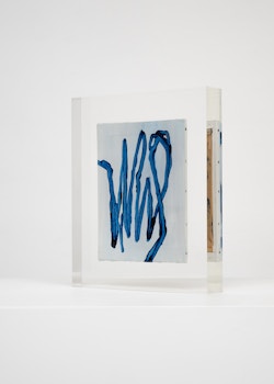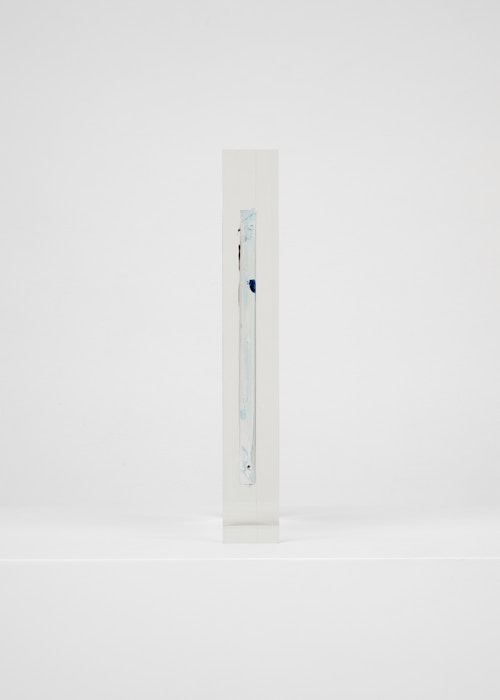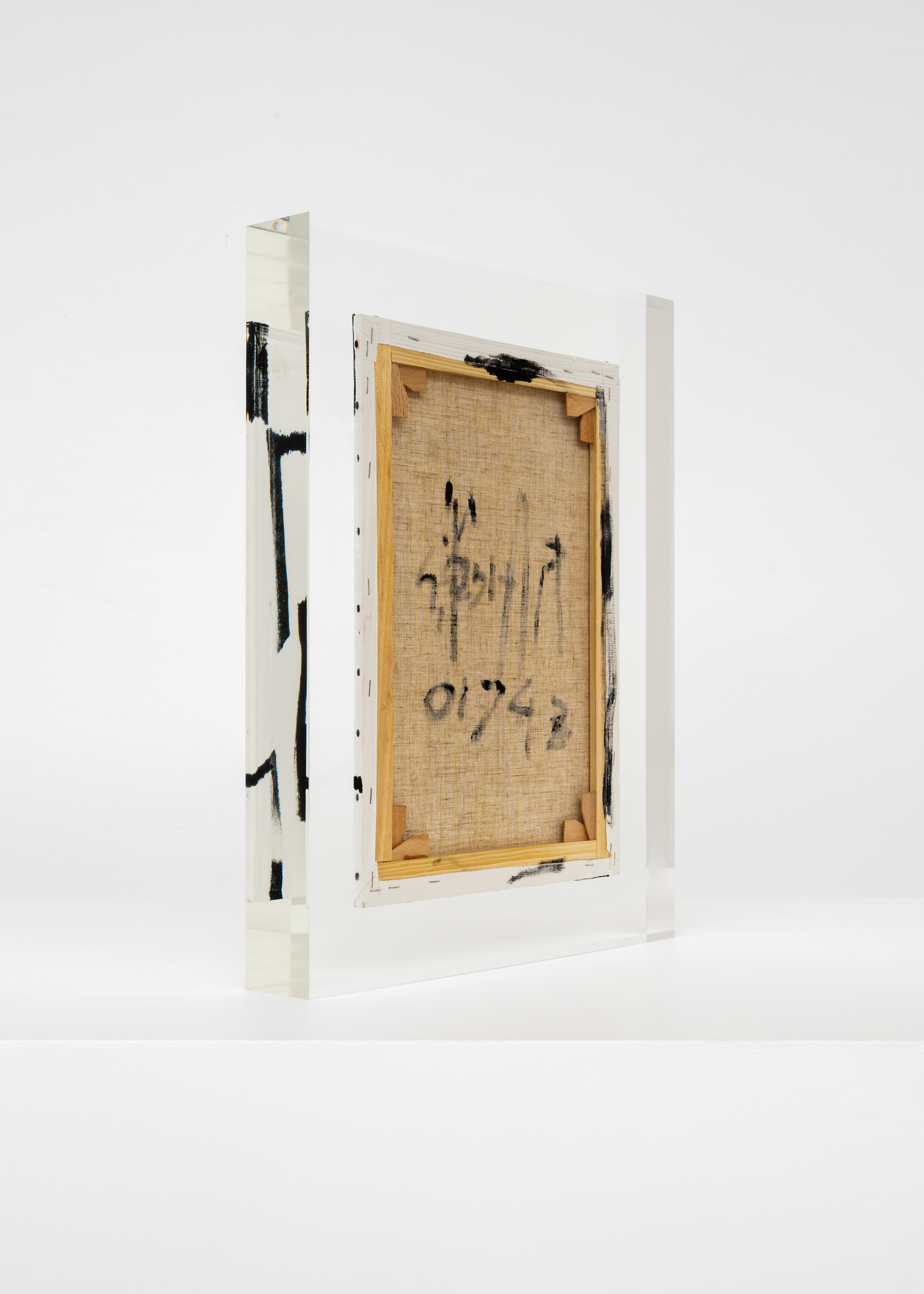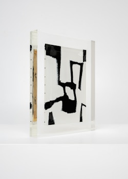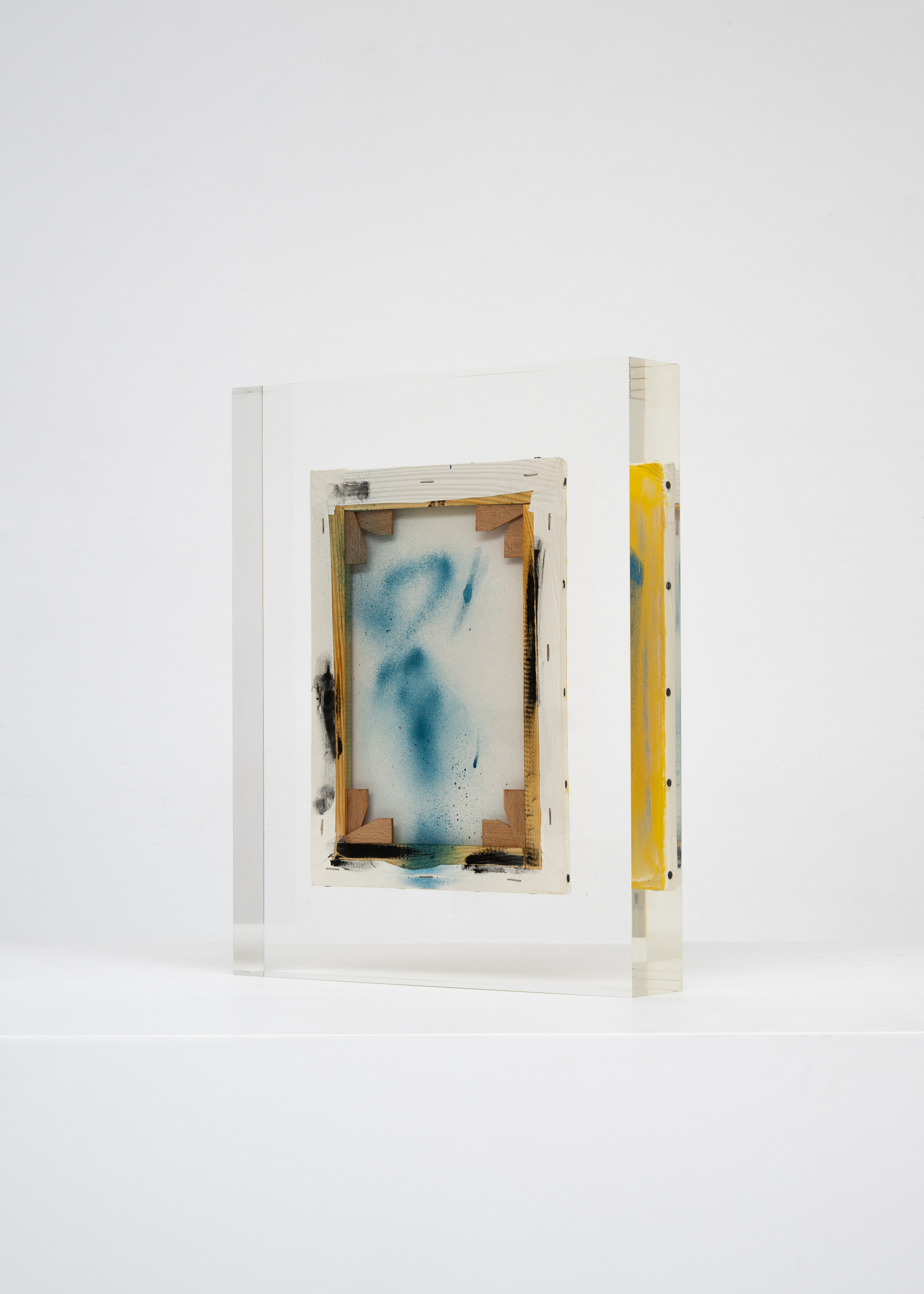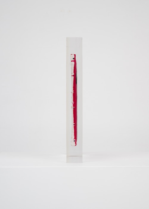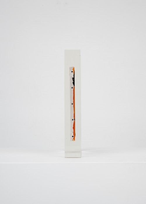 Upstairs, Lavier introduces a new body of work: Inclusions. These abstract canvases — found in flea markets and junk shops — are encased in blocks of acrylic resin. As with the wrecked Fiat 500, these works are ‘found’ rather than made: Lavier’s intervention is conceptual, grounded in selection and display rather than painterly authorship. Encapsulation produces another kind of perceptual short circuit. While the gesture recalls the New Realists, especially Arman, here it probes a modernist taboo: the separation of painting from sculpture. With both the front and back of each canvas visible, traditional viewing hierarchies dissolve. These once-anonymous paintings are suspended between states: object and sculpture, discarded and elevated, protected and entombed. Arranged as what Lavier calls an ‘abstract bouquet’, the seven works playfully challenge orientation and display, to quote Lavier, ‘the reverse side becoming more interesting than the front’. At the same time, the paintings selected for the Inclusions are diverse enough that they resemble a group show — an idea that harks back to, and expands upon, Lavier’s previous exhibition at the gallery, Walt Disney Productions (2016), where he explored abstract painting and its representation in popular culture.