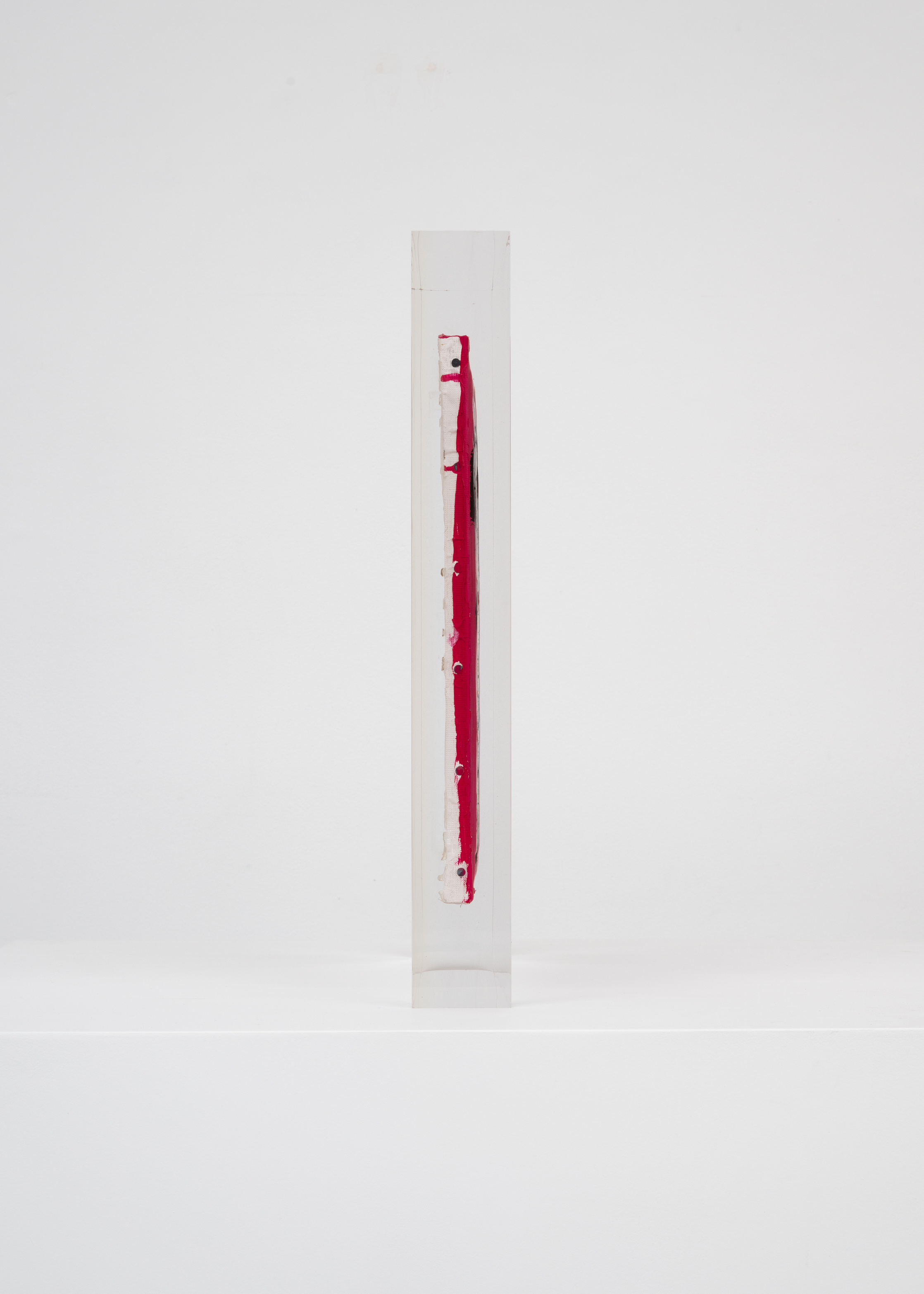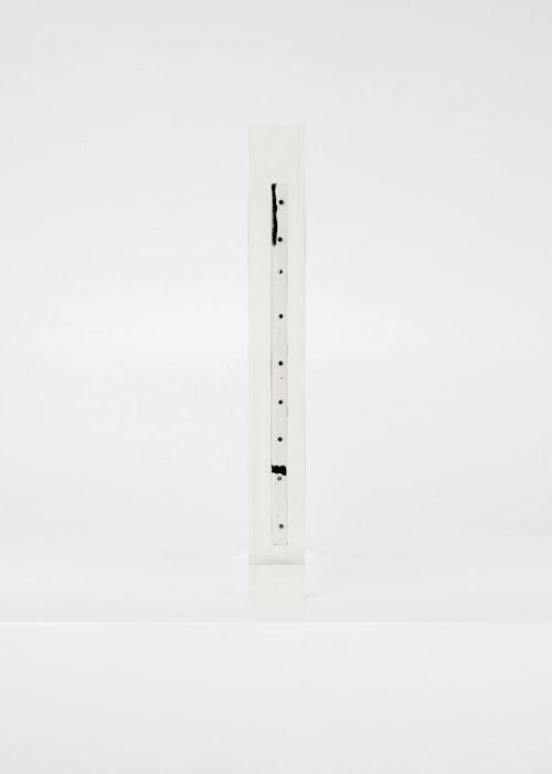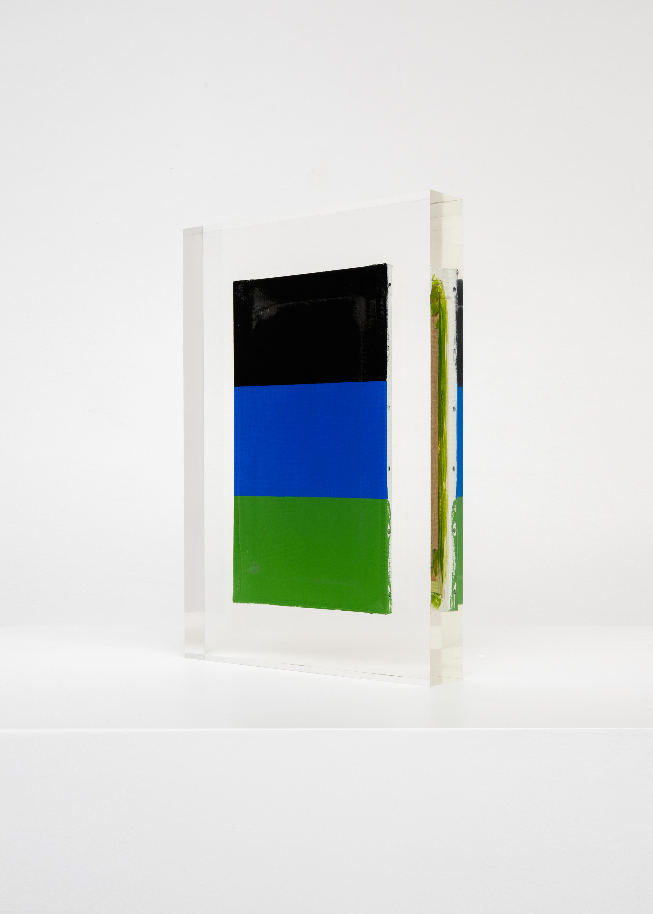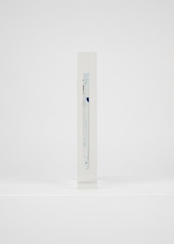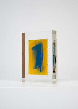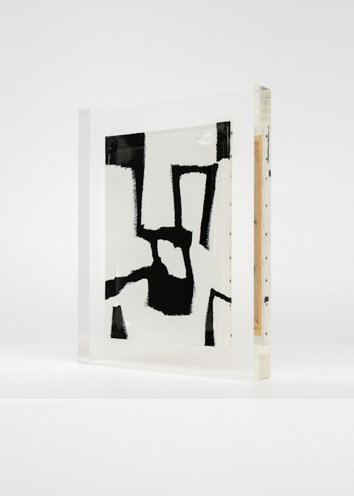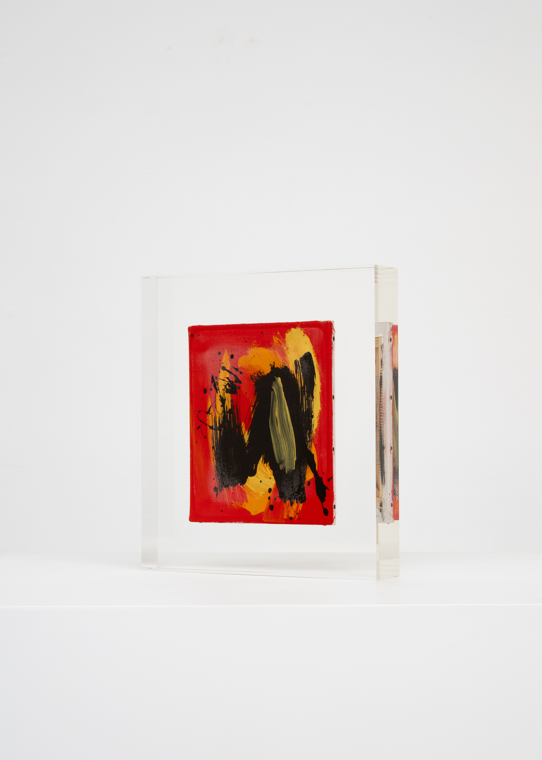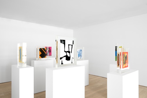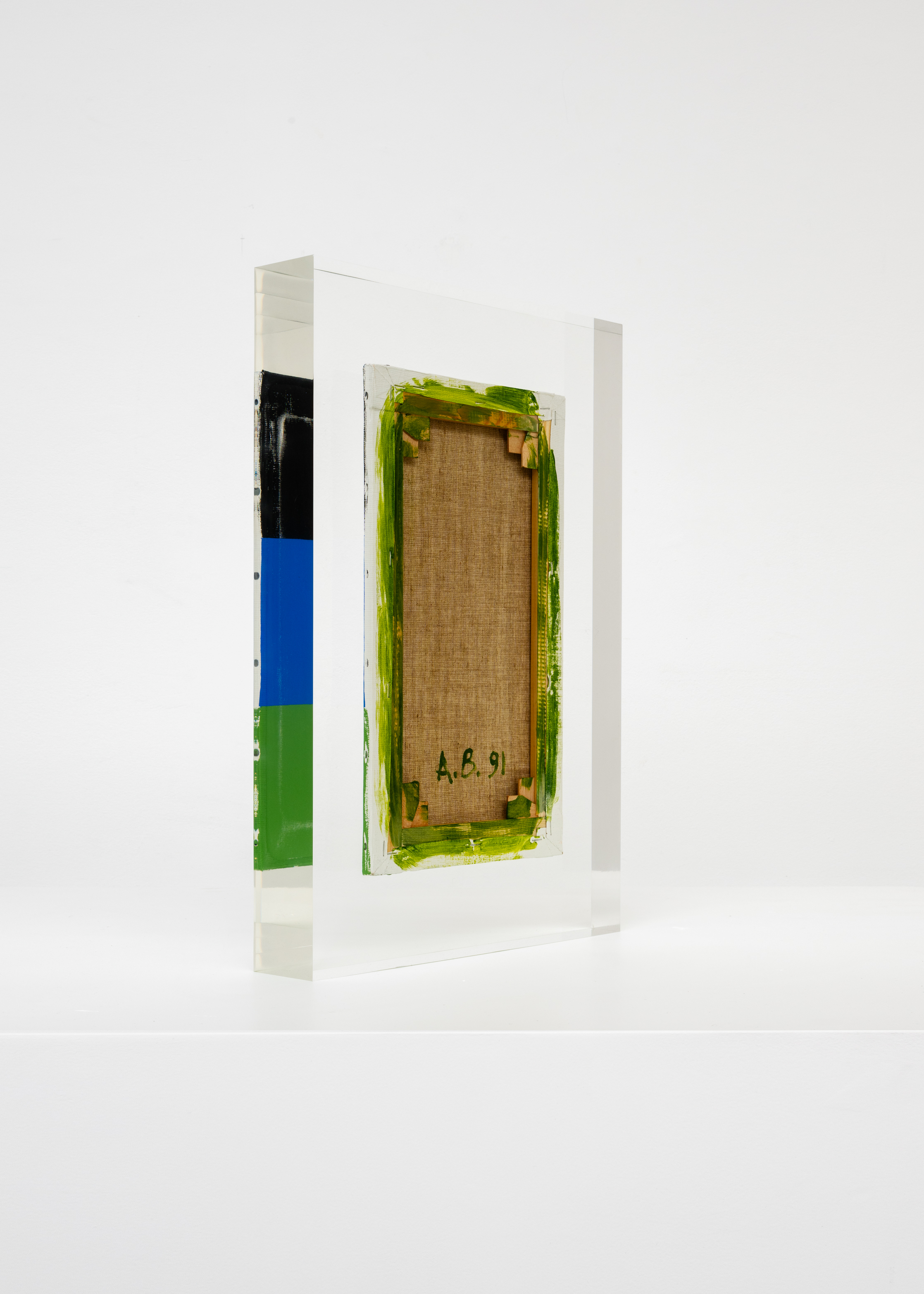 Upstairs, Lavier introduces a new body of work: Inclusions. These abstract canvases — found in flea markets and junk shops — are encased in blocks of acrylic resin. As with the wrecked Fiat 500, these works are ‘found’ rather than made: Lavier’s intervention is conceptual, grounded in selection and display rather than painterly authorship. Encapsulation produces another kind of perceptual short circuit. While the gesture recalls the New Realists, especially Arman, here it probes a modernist taboo: the separation of painting from sculpture. With both the front and back of each canvas visible, traditional viewing hierarchies dissolve. These once-anonymous paintings are suspended between states: object and sculpture, discarded and elevated, protected and entombed. Arranged as what Lavier calls an ‘abstract bouquet’, the seven works playfully challenge orientation and display, to quote Lavier, ‘the reverse side becoming more interesting than the front’. At the same time, the paintings selected for the Inclusions are diverse enough that they resemble a group show — an idea that harks back to, and expands upon, Lavier’s previous exhibition at the gallery, Walt Disney Productions (2016), where he explored abstract painting and its representation in popular culture.