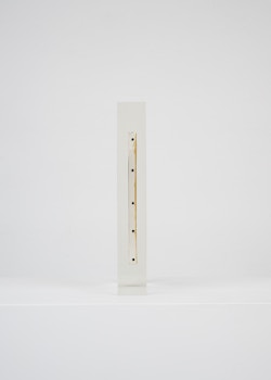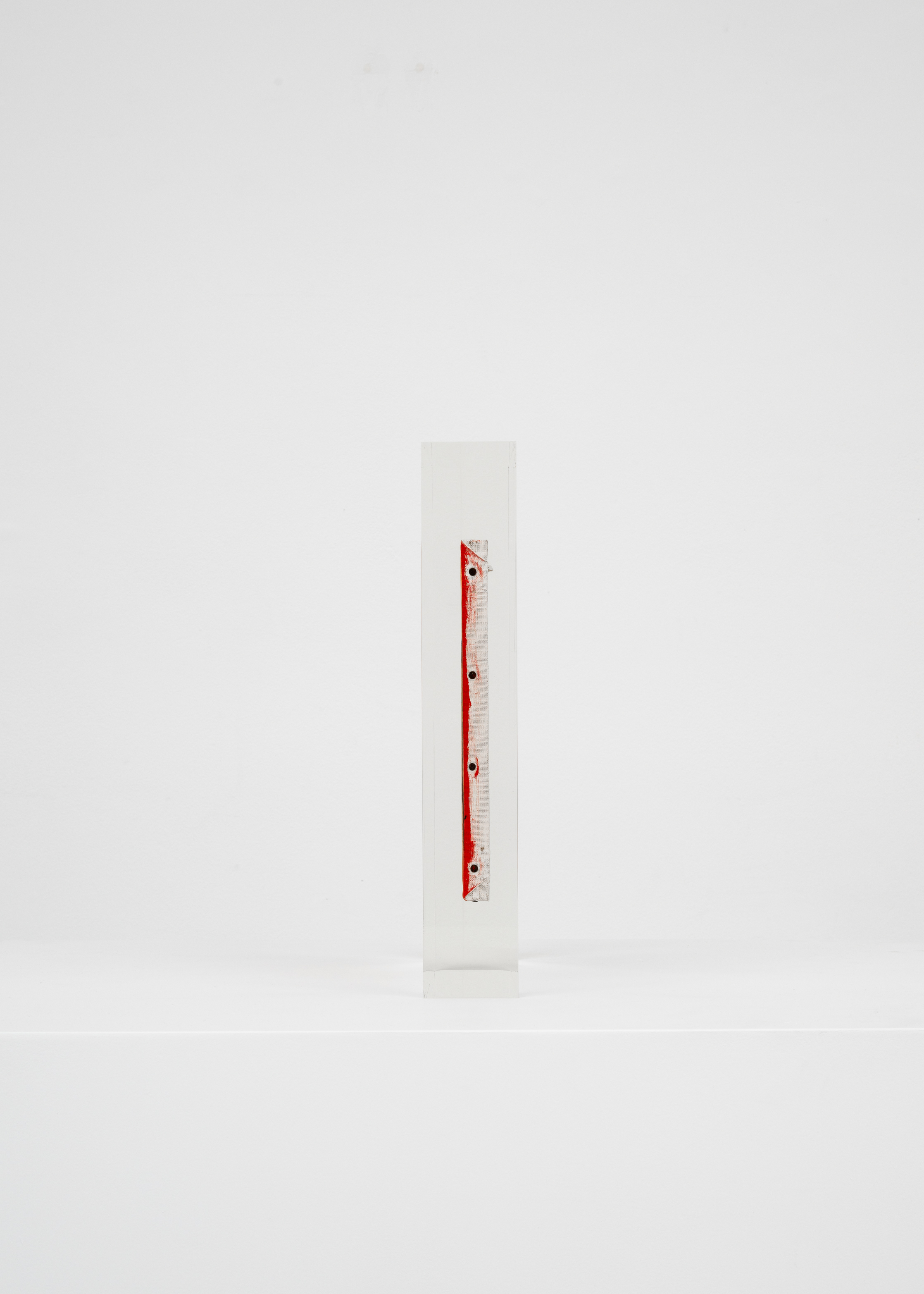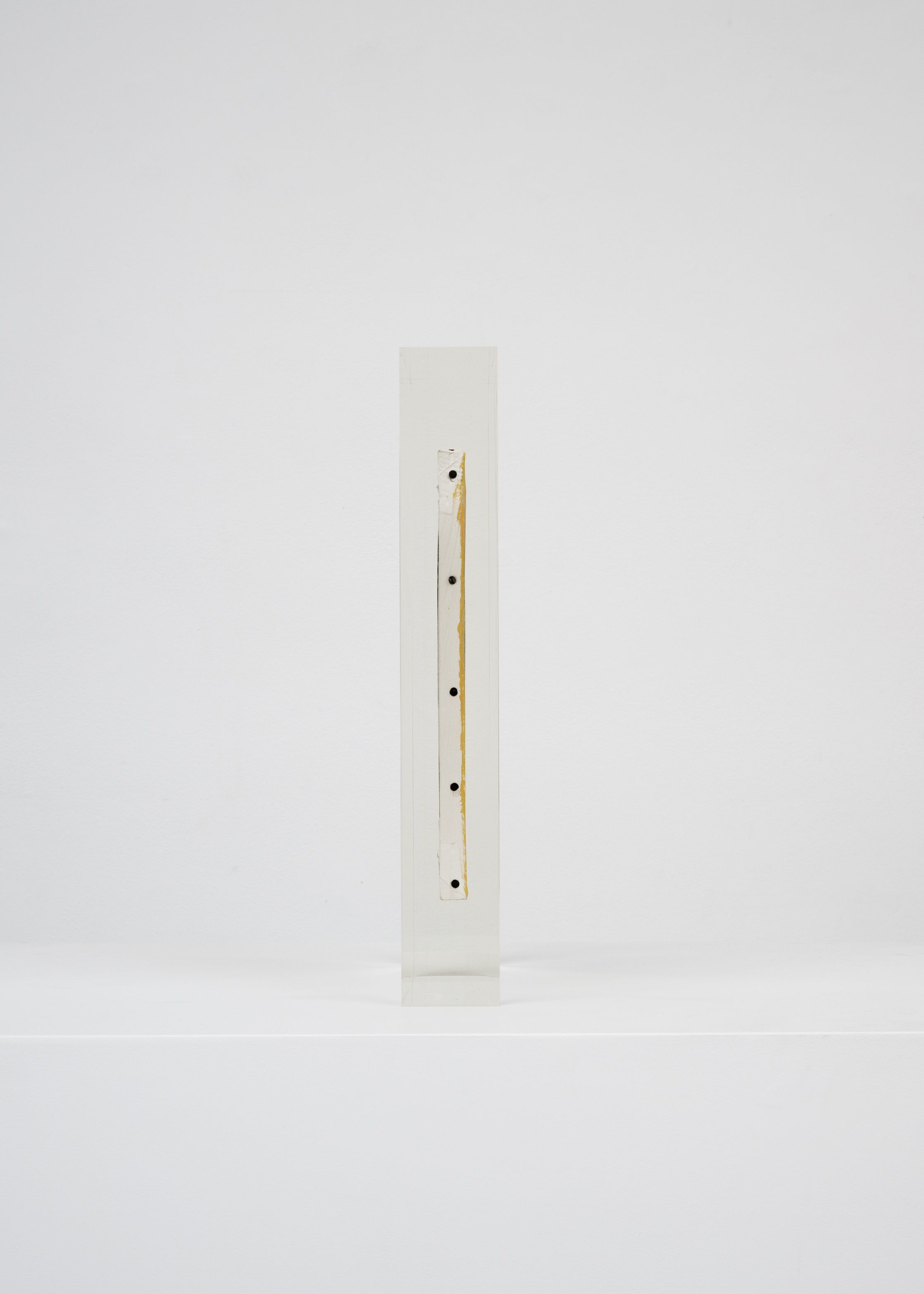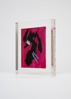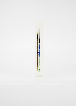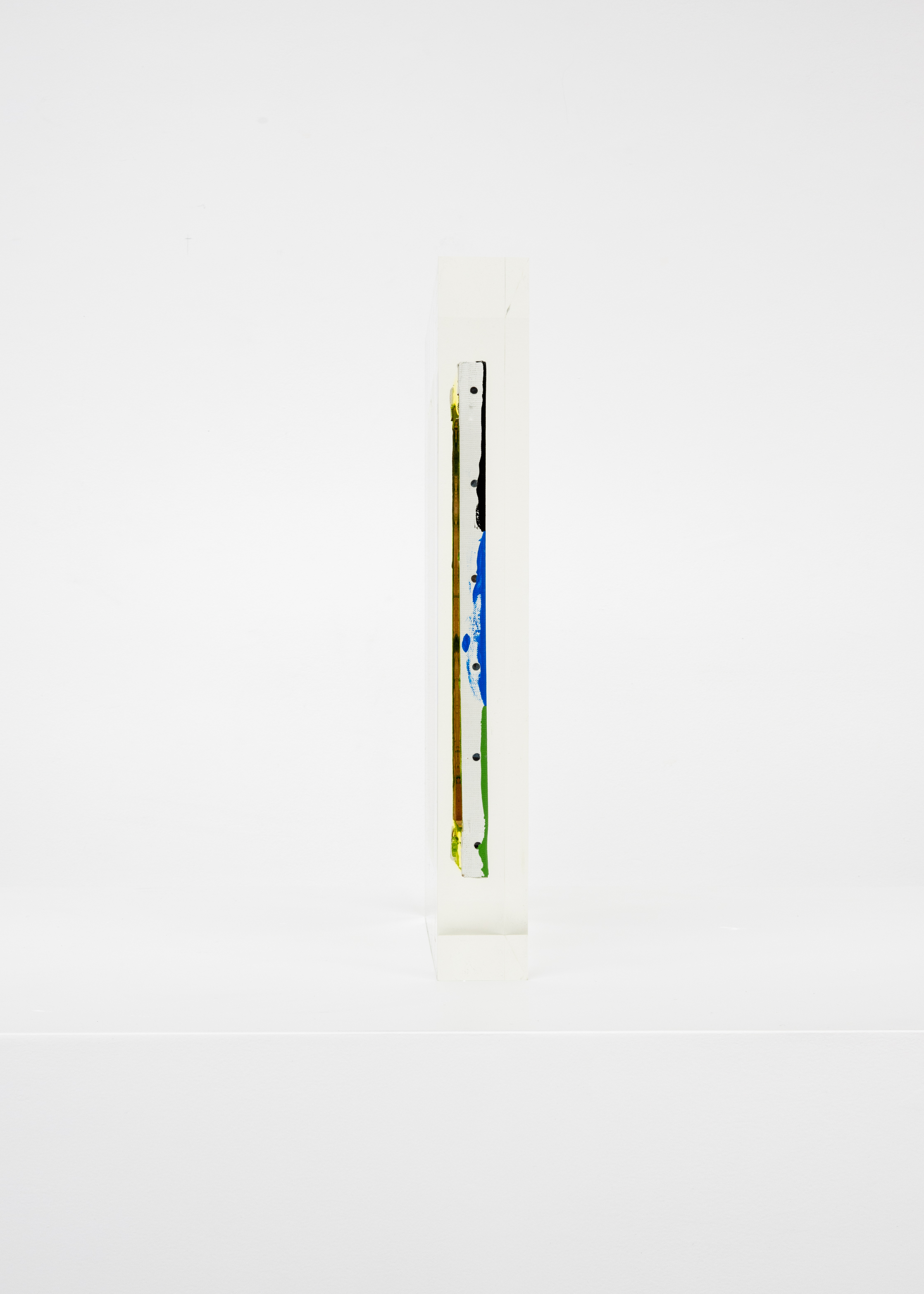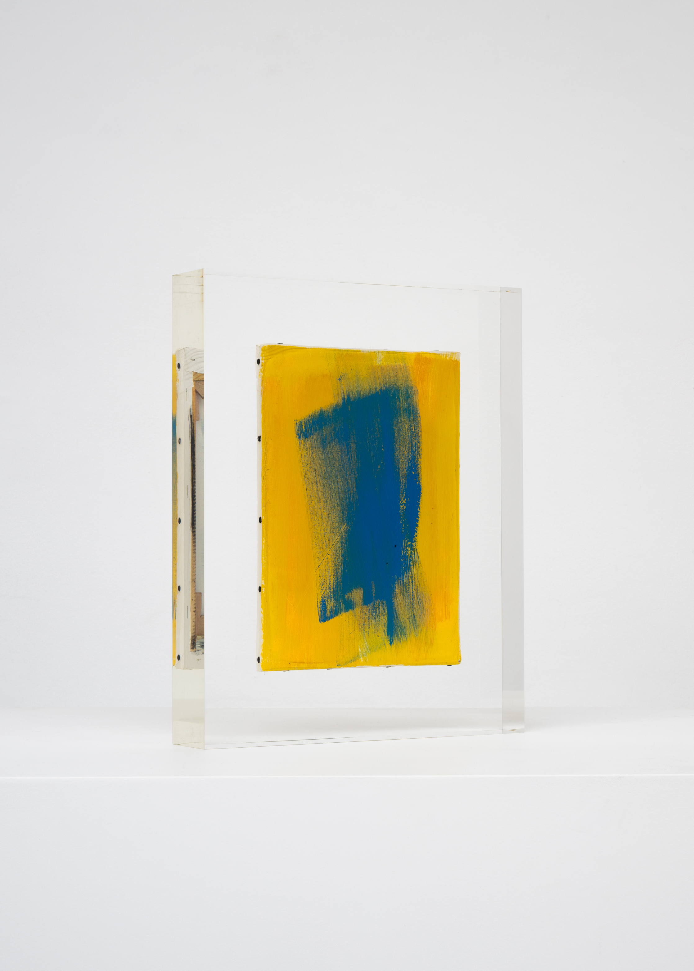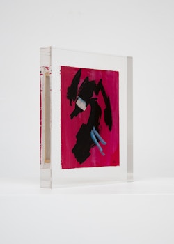 Upstairs, Lavier introduces a new body of work: Inclusions. These abstract canvases — found in flea markets and junk shops — are encased in blocks of acrylic resin. As with the wrecked Fiat 500, these works are ‘found’ rather than made: Lavier’s intervention is conceptual, grounded in selection and display rather than painterly authorship. Encapsulation produces another kind of perceptual short circuit. While the gesture recalls the New Realists, especially Arman, here it probes a modernist taboo: the separation of painting from sculpture. With both the front and back of each canvas visible, traditional viewing hierarchies dissolve. These once-anonymous paintings are suspended between states: object and sculpture, discarded and elevated, protected and entombed. Arranged as what Lavier calls an ‘abstract bouquet’, the seven works playfully challenge orientation and display, to quote Lavier, ‘the reverse side becoming more interesting than the front’. At the same time, the paintings selected for the Inclusions are diverse enough that they resemble a group show — an idea that harks back to, and expands upon, Lavier’s previous exhibition at the gallery, Walt Disney Productions (2016), where he explored abstract painting and its representation in popular culture.