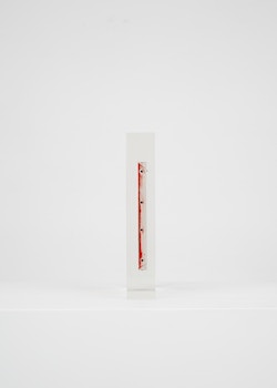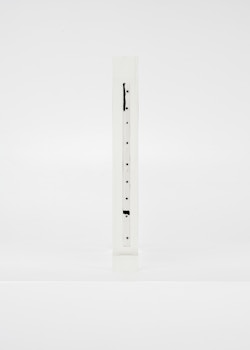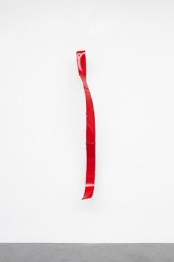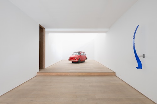 The exhibition opens with a metaphorical bang: the wreckage of a Fiat 500, one of the icons of the last century’s golden era of the automobile, its crushed body painted in a glossy, enticing red. Standing in isolation at the end of the gallery, on a platform that functions more like a stage than a plinth, Fiat 500 is the latest of Lavier’s damaged car works, the origins of which can be traced back to his seminal Giulietta (1993). Emblematic of the irony, humour and semantic play that characterise Lavier’s practice, Fiat 500 introduces some of the exhibition’s central concerns: the boundary between art and the everyday; between representation and reality; between language and meaning; and the status of the object in relation to authorship.