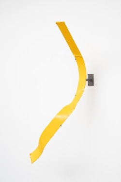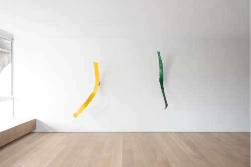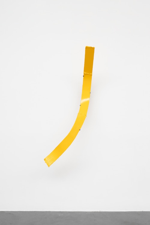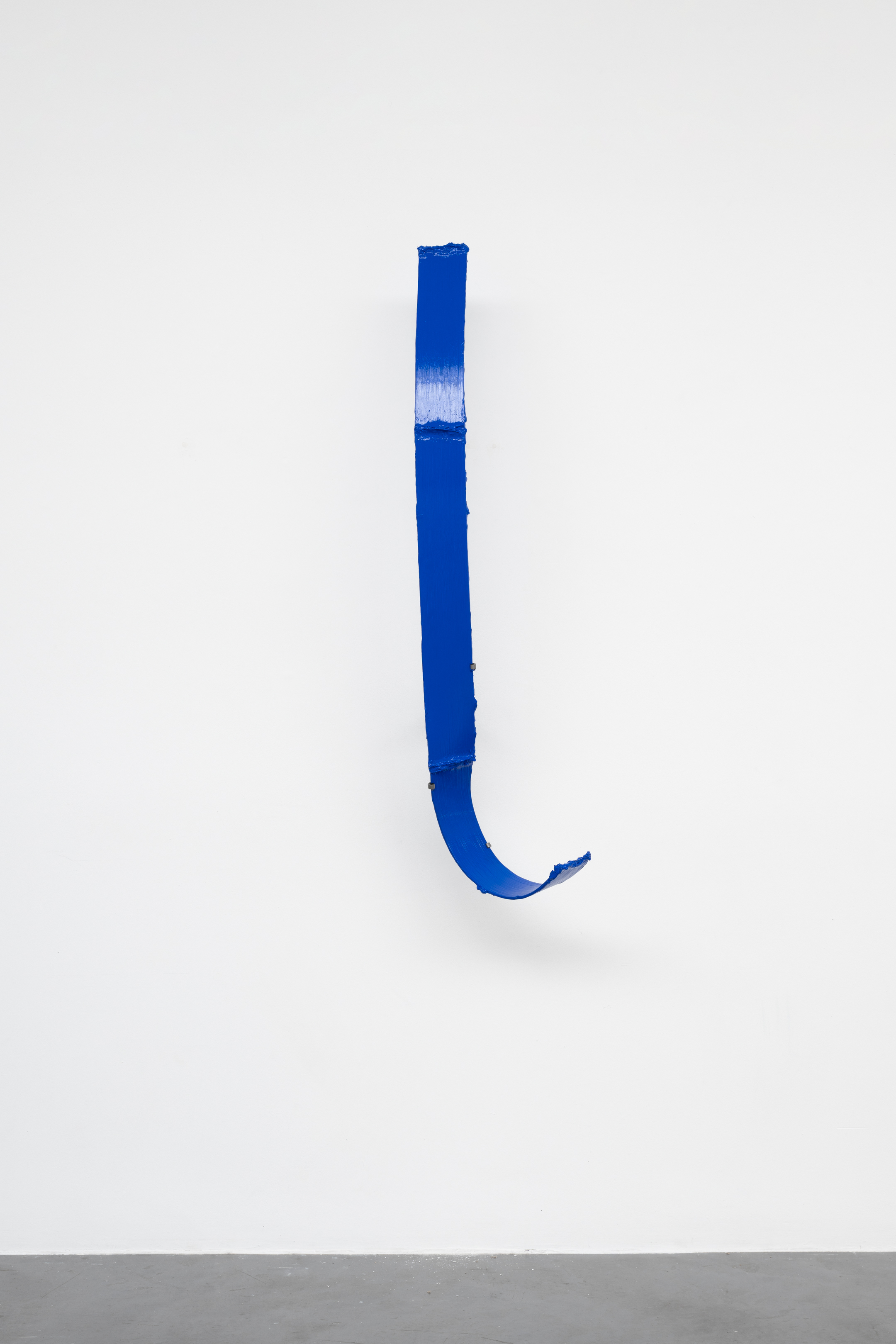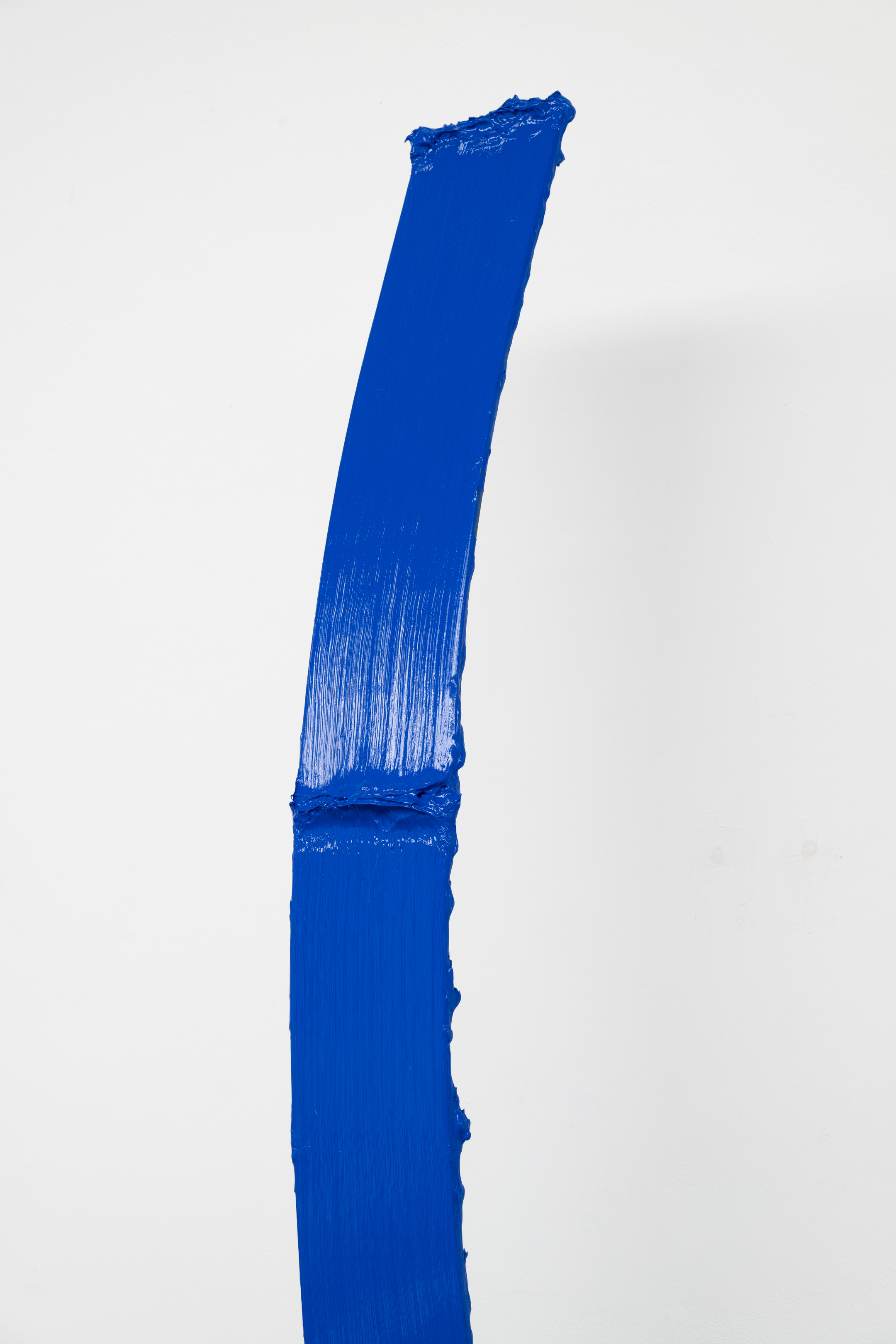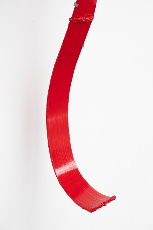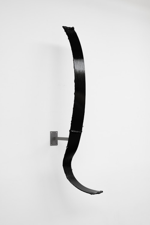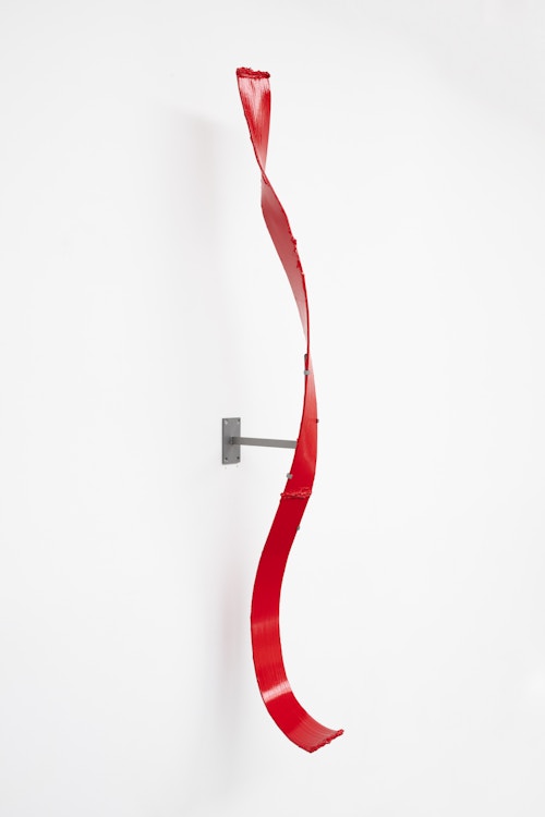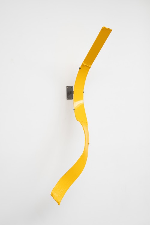 Shown in the same gallery, Brushstrokes forms the exhibition’s second new body of work. Fabricated from painted steel, these literal brushstrokes translate gesture into three-dimensional form, occupying a similarly ambiguous territory between painting and sculpture. Unlike the Inclusions, which rest on plinths and invite the viewer to move around them, the Brushstrokes are wall-mounted, like paintings — yet they do not lie flat. In contrast to figures such as Roy Lichtenstein, who depicted brushstrokes, Lavier gives them physical presence. The difference signals a broader divergence between American Pop Art’s interest in representation and the European tradition of New Realists’ commitment to presenting reality itself.